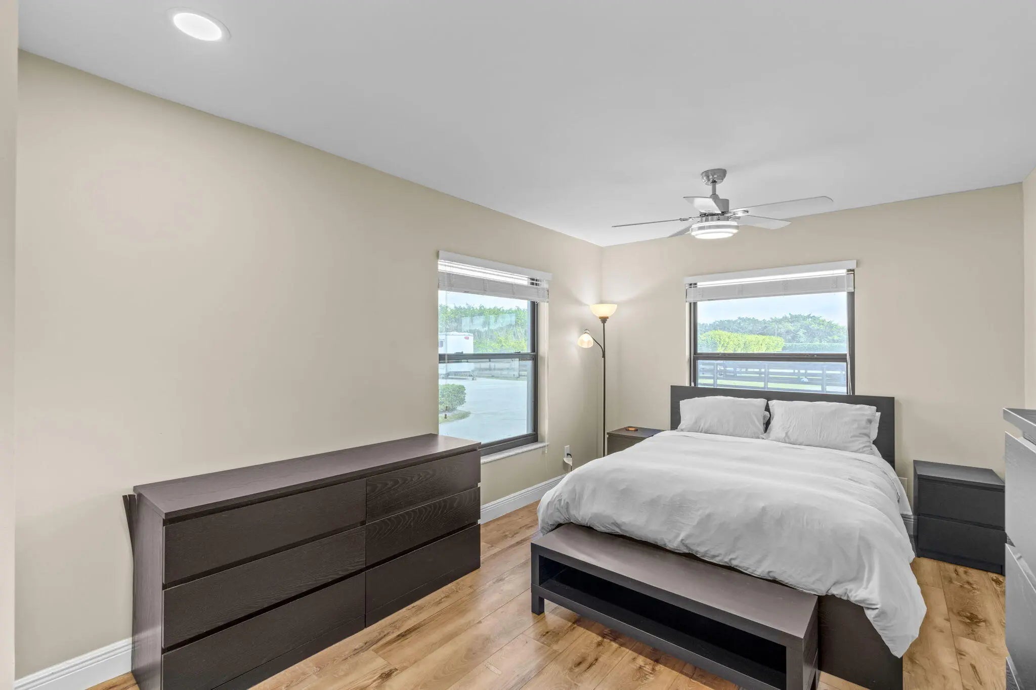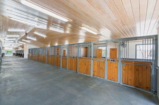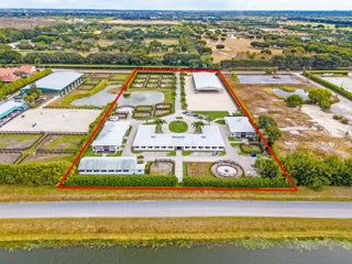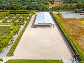 Tucked away in a quiet, secluded setting yet optimally positioned near the horse show, this exceptional farm offers the rare combination of privacy and convenience. From the moment you pass through the gates, it is clear this is a special property, framed by lush bougainvillea and beautifully curated landscaping that feels both welcoming and picturesque. Spanning just over 5 acres, the farm is thoughtfully designed and impeccably maintained. A standout feature is the oversized mirror arena, mostly covered and equipped with all-weather fiber footing, making it ideal for year-round training. The property includes 38 total stalls, with a 24-stall main barn featuring a center aisle and 14 additional stalls in a separate rear center-aisle barn. Abacus cushion stall flooring Abacus cushion stall flooring provides exceptional comfort, and the stalls feature Dutch doors that allow horses to look out. Tongue-and-groove finishes, generous storage throughout, and well-planned workspaces elevate both function and aesthetics. The layout is unlike most barns and offers a highly functional, flexible design. One side is fully owner-oriented and equipped with all amenities, while the opposite side offers a flexible configuration that can accommodate private facilities with separate workstations and tack rooms, alongside shared amenities including grooming and work areas, a feed room, and laundry, well-suited for multiple training operations. Additional amenities include a hot walker, round pen, 16 paddocks, and a fully fenced perimeter with mature clusia hedging. A shared pond provides irrigation, enhancing both sustainability and the striking façade of the property. The farm is set up for easy truck and feed delivery with a proper turnaround area and includes a hurricane-rated roll-down outbuilding. The property is supported by a full-property generator and offers four apartments, including two newly updated one-bedroom units and two studios, providing flexibility for staff or guests. With ample parking, thoughtfully separated work areas, and a picturesque setting, this farm blends beauty, efficiency, and top-tier equestrian functionality, all just a short hack to the horse showgrounds.
