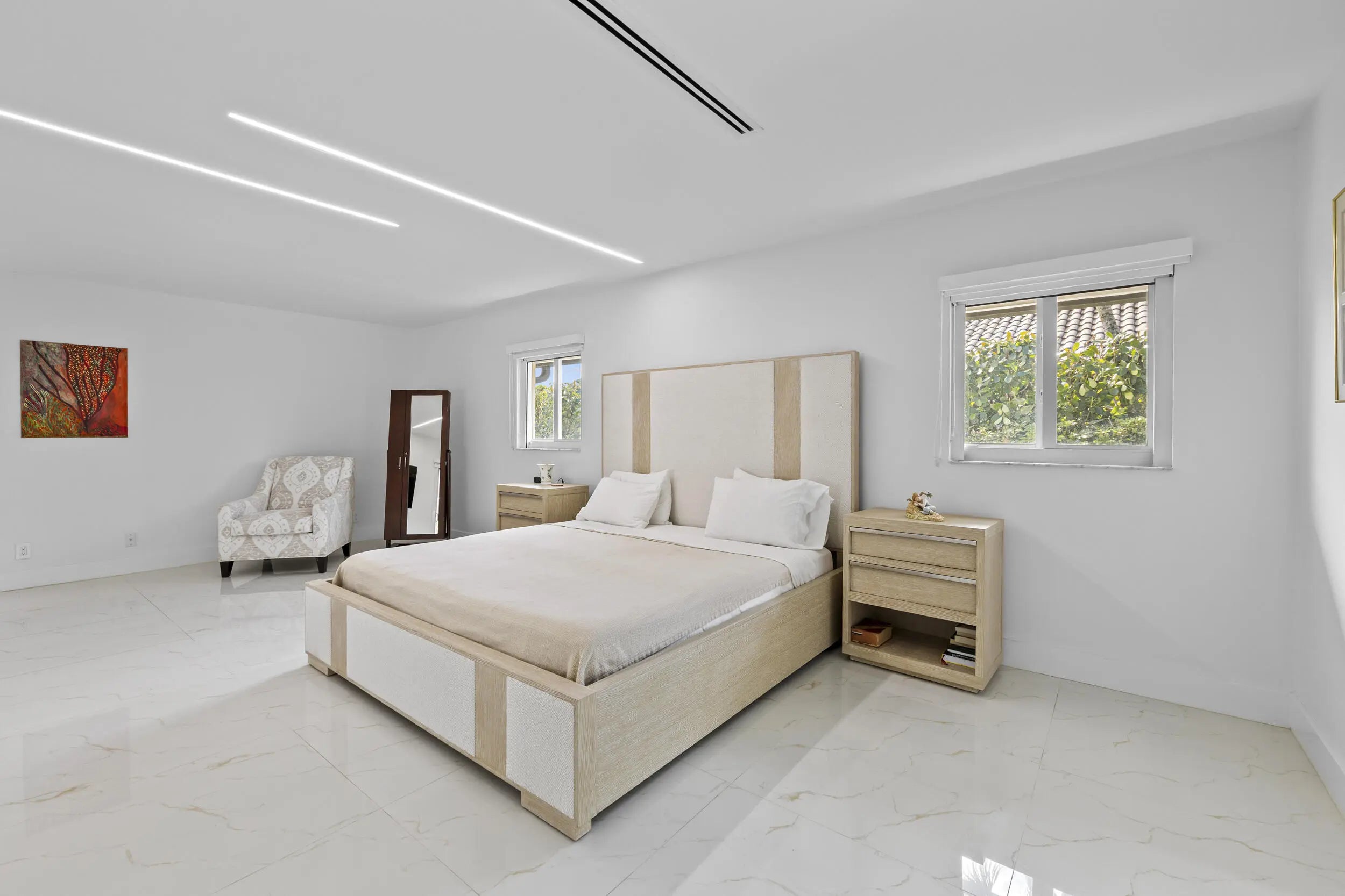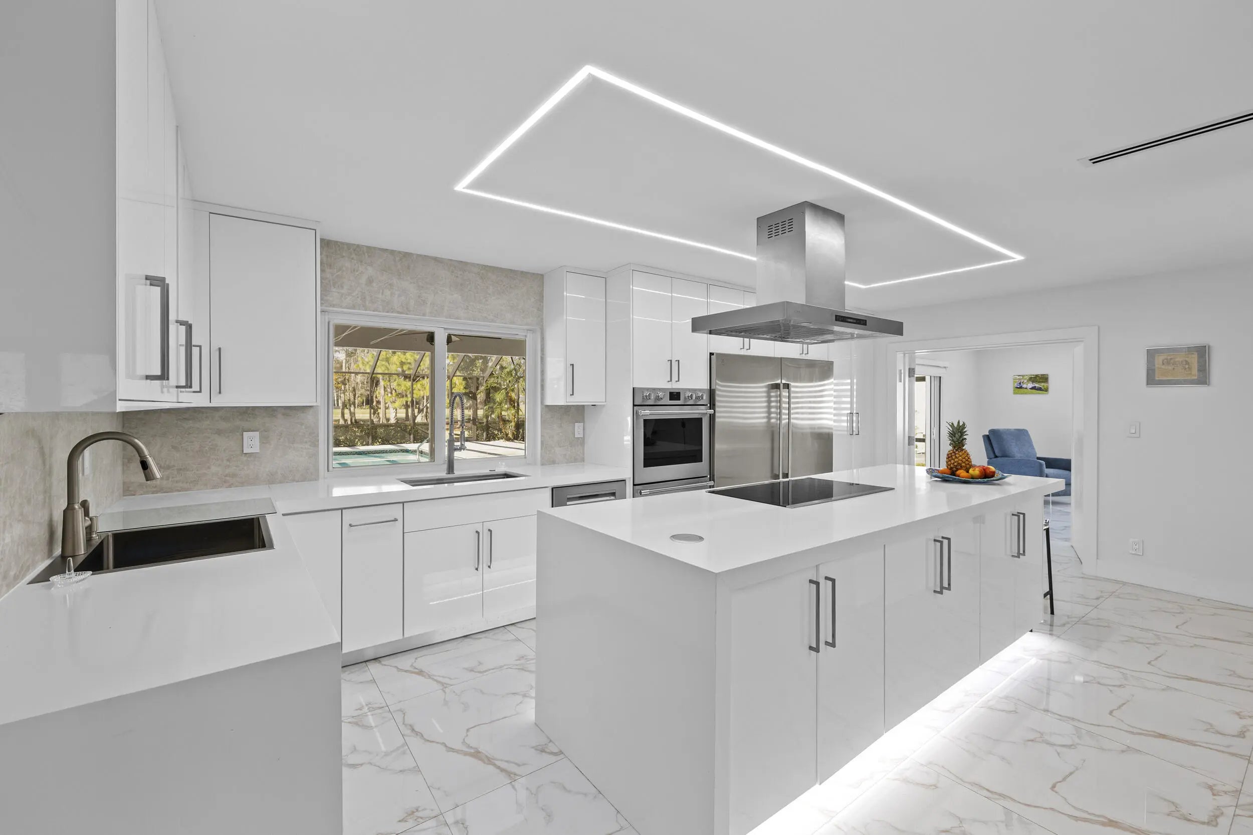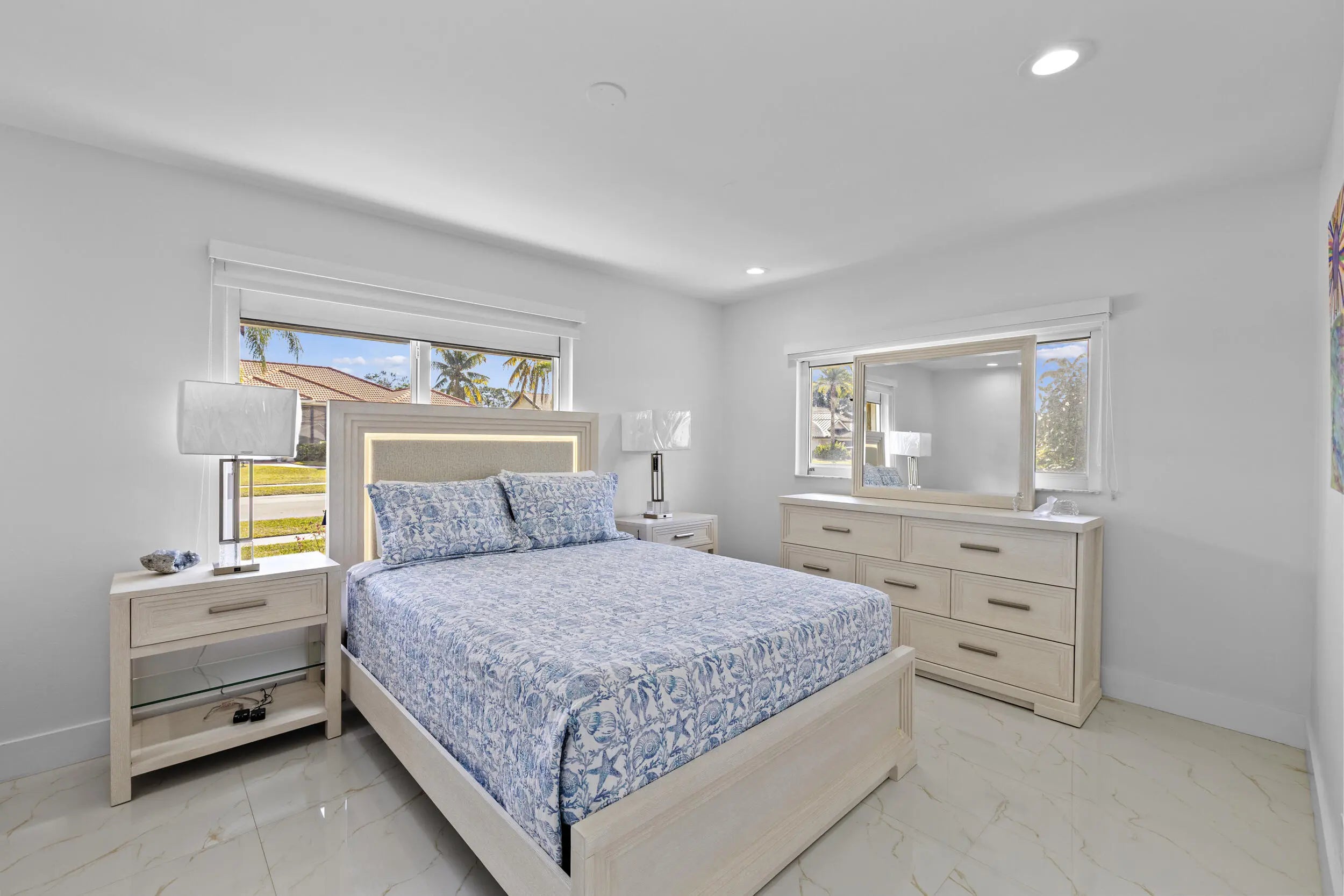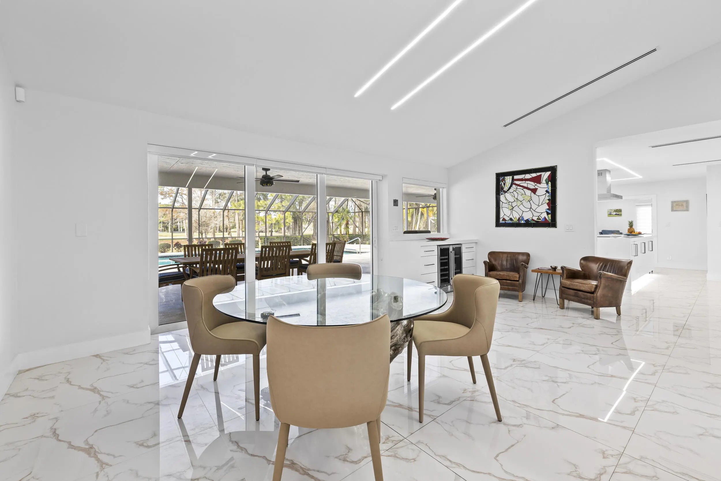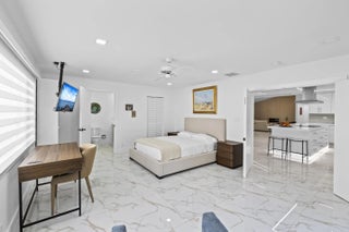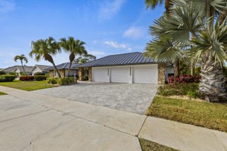 Completely renovated home in Boca Woods Country Club, offering a bright, spacious open layout with stunning private golf views. Features include a metal roof, impact windows and doors, porcelain tile throughout, and a sleek modern kitchen with two sinks and new high-end appliances. The home offers two large primary suites, two additional guest bedrooms, and three and a half beautifully redesigned modern bathrooms. Enjoy one of the largest screened patios in the community with a huge pool, screen enclosure, and marble pavers throughout. Three-car garage with epoxy floors and A/C. Modern lighting and new ductwork. Truly move-in ready.