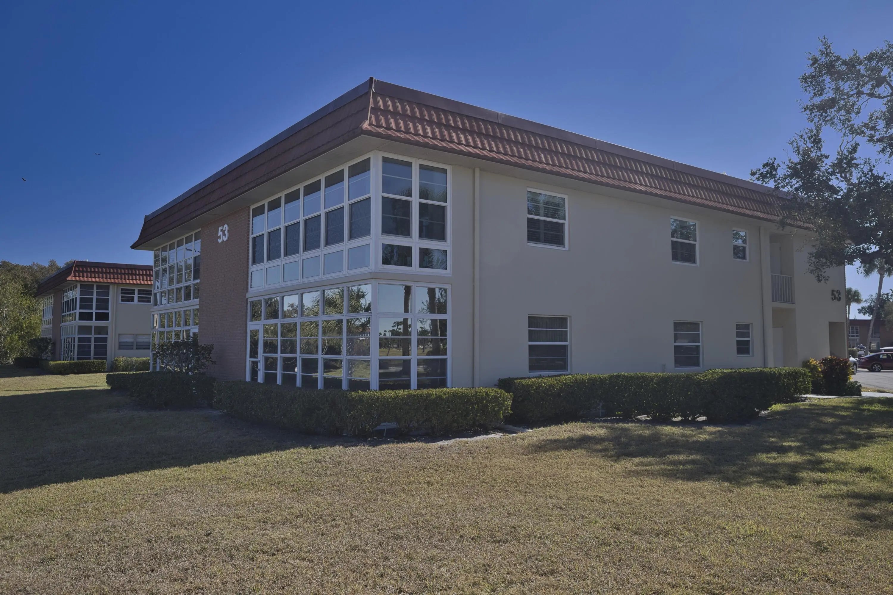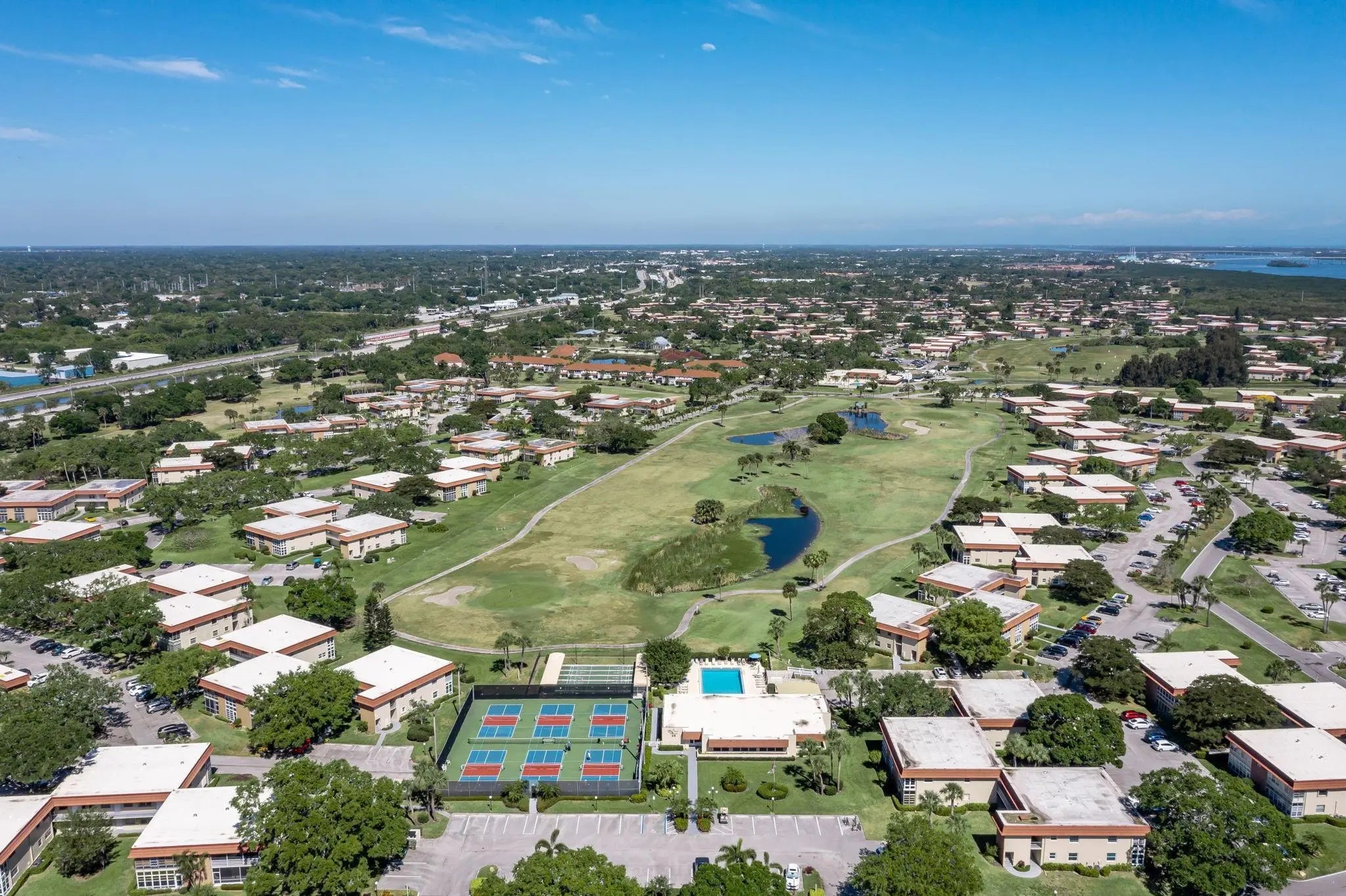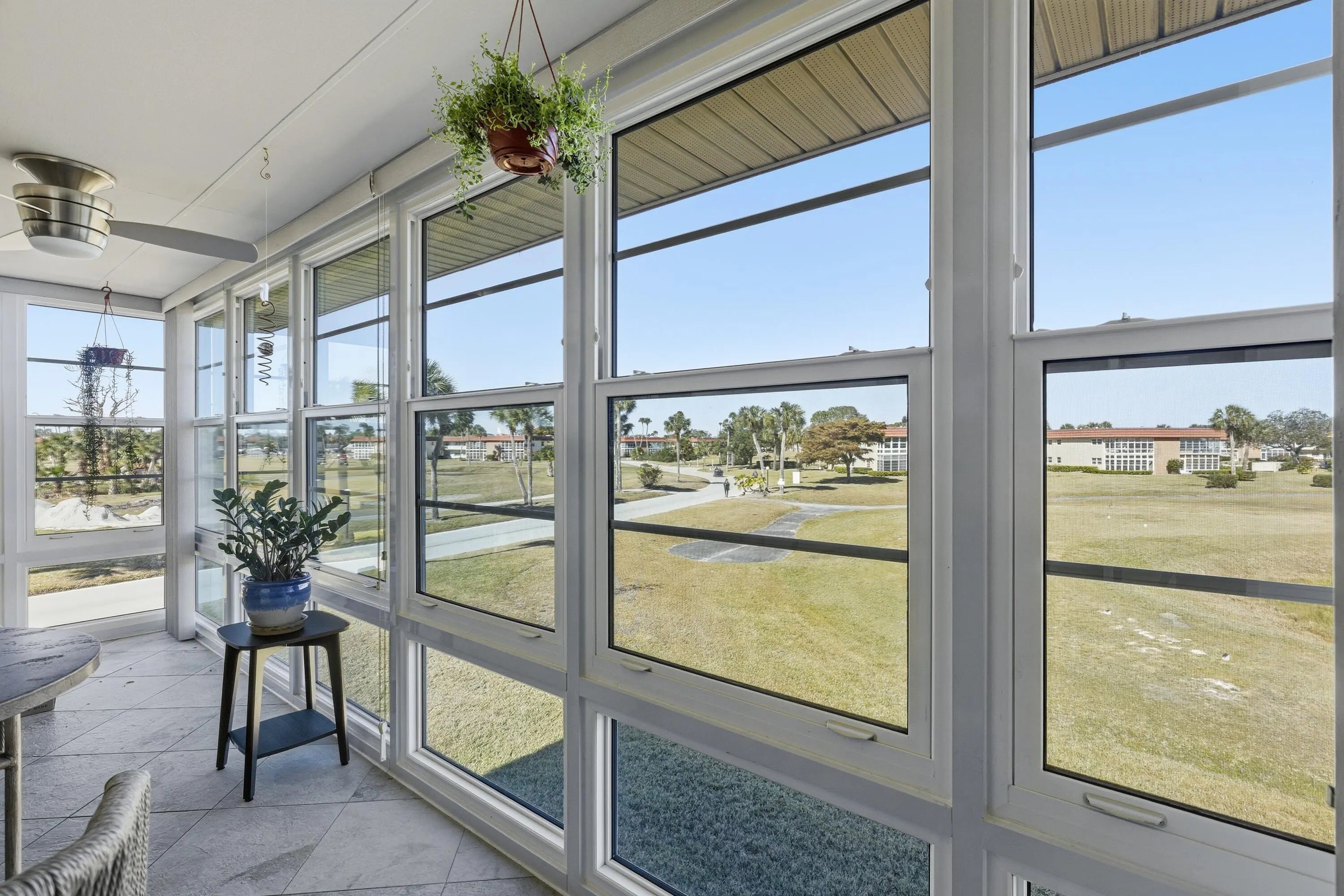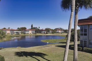 Desirable corner 'B' unit with split bedrooms and sweeping lake and golf course views. Completely remodeled ''no popcorn ceilings'' and truly move-in ready. This bright and airy home features impact windows throughout, including the enclosed porch, filling the space with natural sunlight while showcasing stunning panoramic views. Oak hardwood floors run throughout, complemented by custom kitchen cabinetry, top-of-the-line appliances, extended granite countertops, and a tile backsplash. Plantation shutters enhance the living area, all ceiling fans and light fixtures are brand new. Additional upgrades include a new HVAC system, water heater and a new impact glass front door.Meticulously maintained with an extra storage closet and conveniently located across the hall from the laundry room. Resort-style amenities include multiple pools, clubhouse, fitness room, pickleball, tennis courts, and close proximity to beaches, shopping, and McKee Botanical Gardens. A vibrant 55+ community with an abundance of amenities. Water, cable, and internet included. A must-see property!
