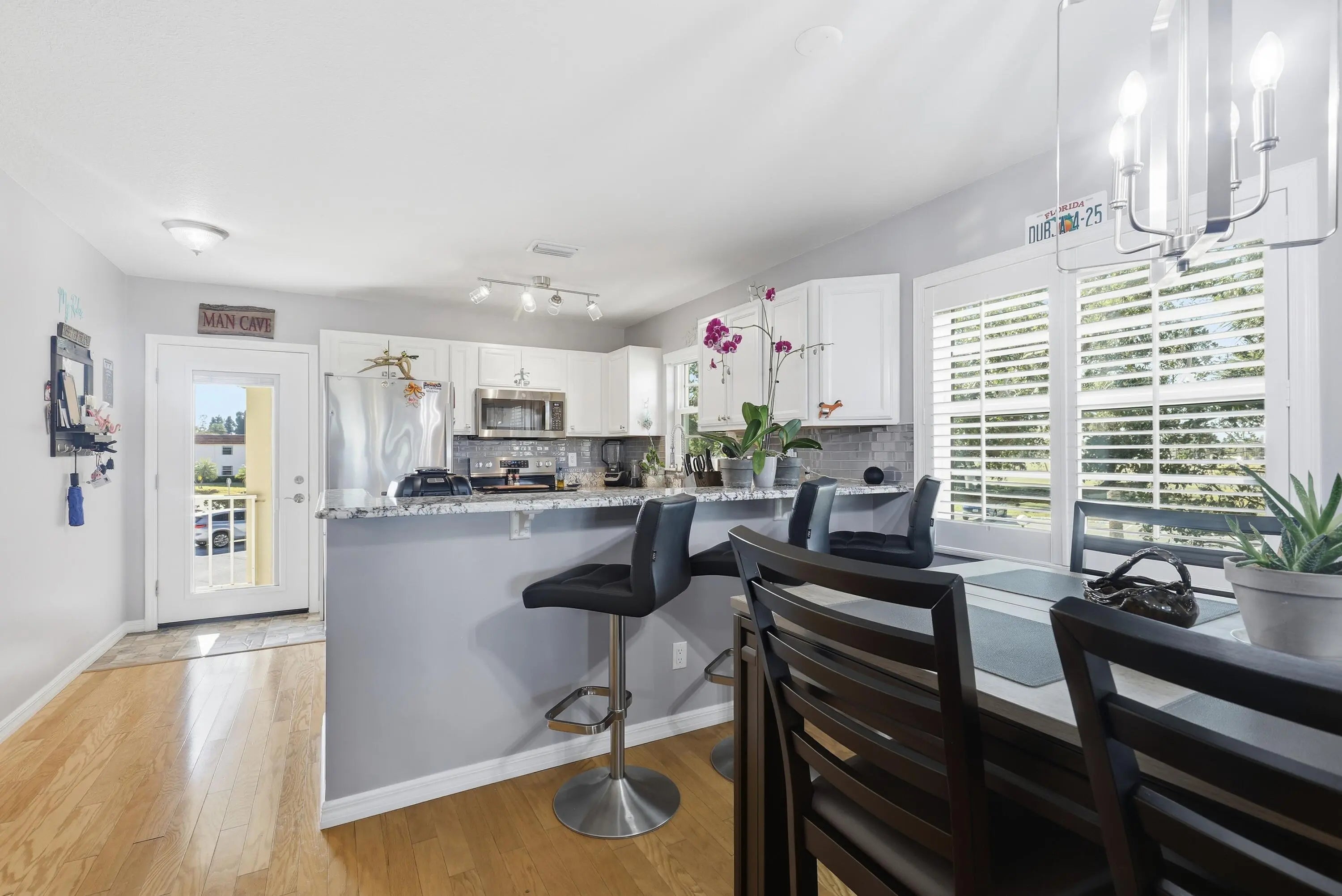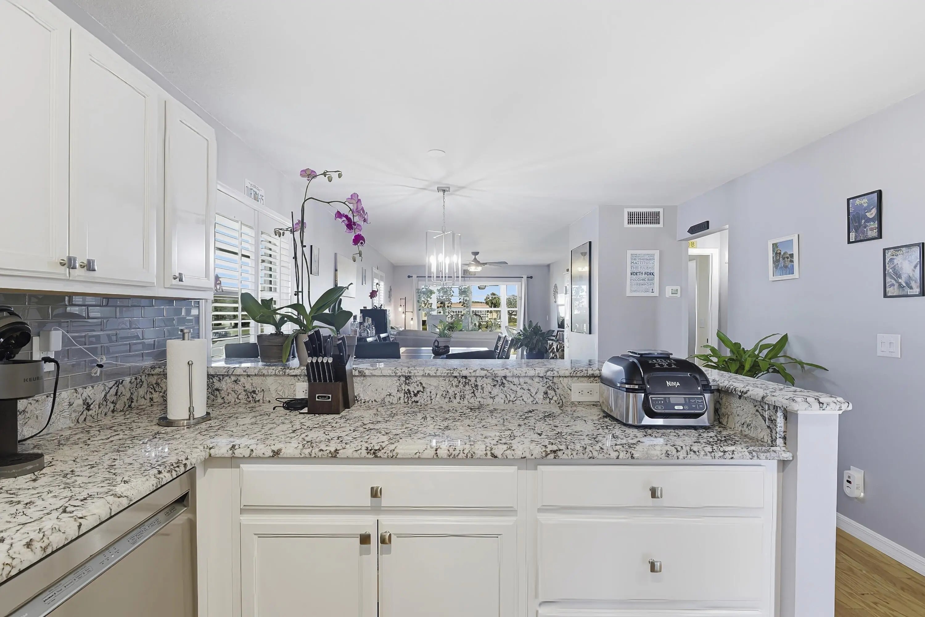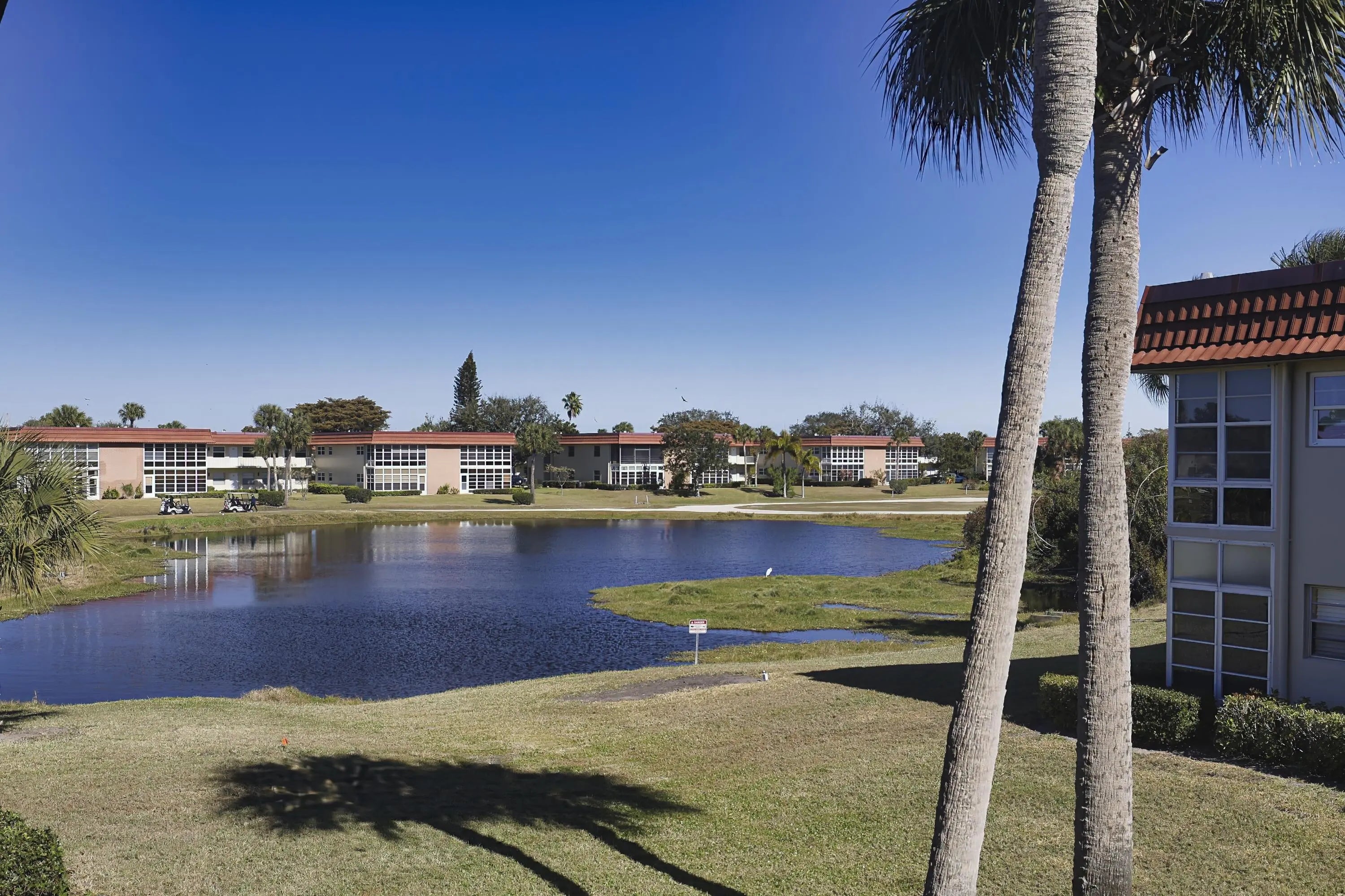 Desirable corner 'B' unit with split bedrooms and sweeping lake and golf course views. Completely remodeled ''no popcorn ceilings'' and truly move-in ready. This bright and airy home features impact windows throughout, including the enclosed porch, filling the space with natural sunlight while showcasing stunning panoramic views. Oak hardwood floors run throughout, complemented by custom kitchen cabinetry, top-of-the-line appliances, extended granite countertops, and a tile backsplash. Plantation shutters enhance the living area, all ceiling fans and light fixtures are brand new. Additional upgrades include a new HVAC system, water heater and a new impact glass front door.Meticulously maintained with an extra storage closet and conveniently located across the hall from the laundry room. Resort-style amenities include multiple pools, clubhouse, fitness room, pickleball, tennis courts, and close proximity to beaches, shopping, and McKee Botanical Gardens. A vibrant 55+ community with an abundance of amenities. Water, cable, and internet included. A must-see property!