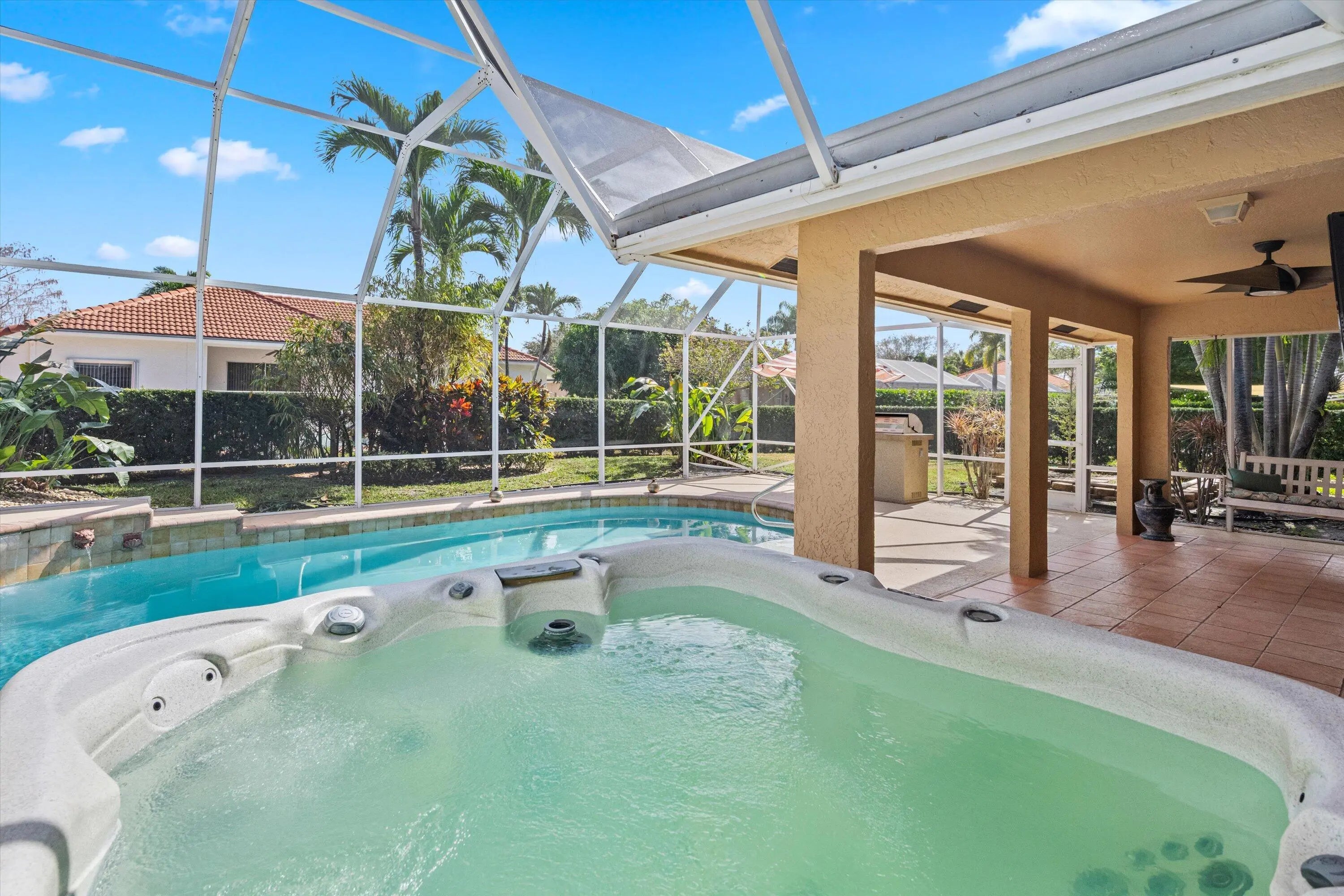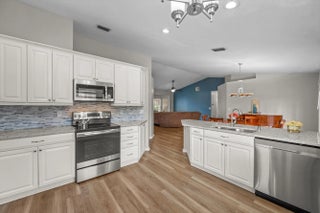 Move in ready! Located in The Estates Of Royal Palm Beach, this remodeled home features a Brand New Metal Roof, a beautiful eat in kitchen with quartz countertops and backsplash and newer stainless steel appliances. The wonderful open layout offers 4 bedroom 2 bathrooms and a 2 car garage. Primary bathroom was also remodeled and includes dual sinks, wood vanity as well as a Jacuzzi tub,separate shower and walk in closet. French doors lead to a covered patio and screened in heated saltwater pool from dining area. Wonderful private entertaining space outside with fully fenced rear yard includes screened in patio with grill, large heated pool and hot tub. Located in this sought after gated community, grocery stores & restaurants are within walking distance. Wellingtons equestrian activities are just a few minutes away! Dont wait!