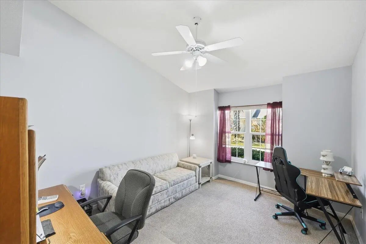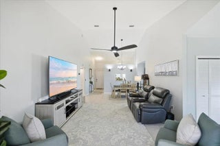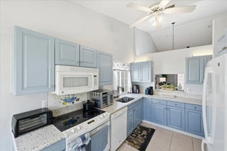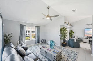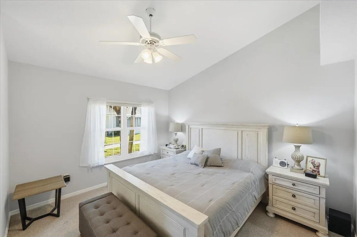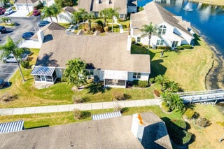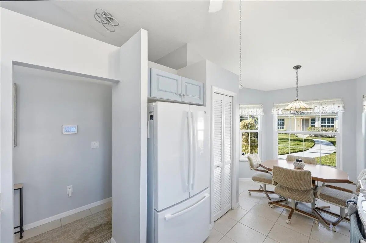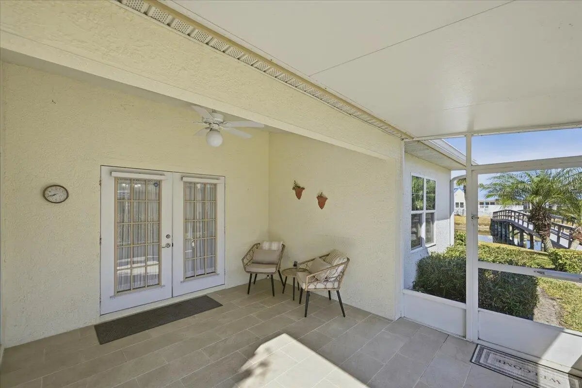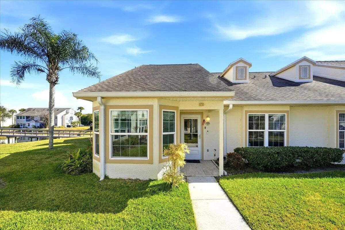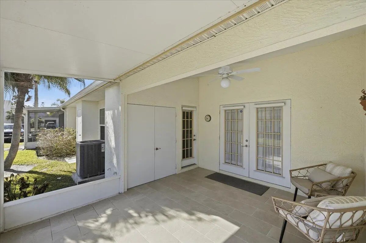 Welcome to this beautifully maintained 2-bedroom, 2-bath lakeside villa with a private garage and versatile den, offering a light-filled, open layout. High vaulted ceilings enhance the sense of space, while the inviting eat-in kitchen overlooks the lake and garden courtyard and features pull-out cabinetry, pantry storage, and ample workspace. Recent updates include a newly tiled lanai and fresh interior paint throughout, adding to the home's bright, move-in-ready appeal. Enjoy peace of mind with major improvements including A/C (2019), roof (2017), water re-pipe (2023), impact PGT windows (2022), and storm panels for doors. Additional highlights include pull-down attic access under air, top-down/bottom-up blinds, and a spacious den/family room with serene lake and clubhouse views. The large screened porch offers a full-size laundry closet and comfortable outdoor living space. The low HOA covers the roof and exterior maintenance, helping keep insurance costs affordable. Residents enjoy resort-style amenities including a heated pool and spa, tennis and pickleball courts, and a fitness center. Conveniently located near shopping, I-95, and golf, and just 8 miles to the beach, this exceptional villa offers comfort, value, and the best of Florida living.