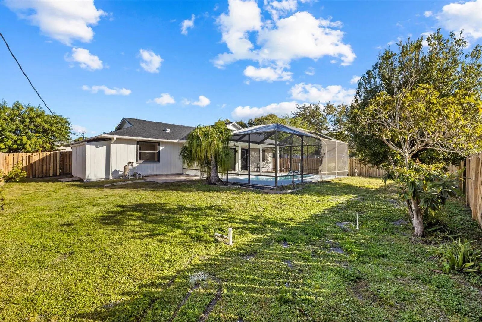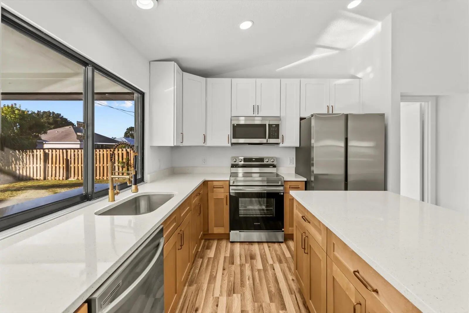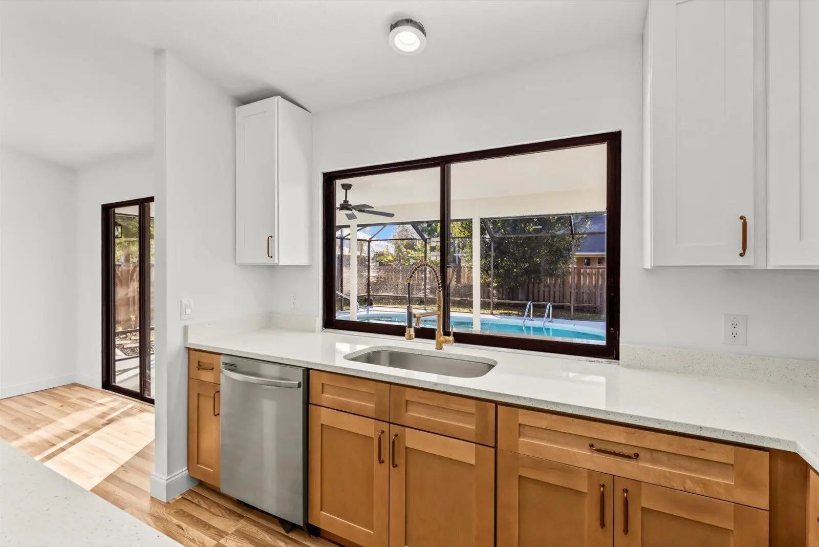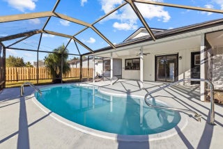 Showings must be scheduled with Showingtime. Exquisite 3-bedroom, 2-bathroom pool home, fully renovated in 2025. The gourmet kitchen boasts luminous Calacatta quartz countertops, bespoke soft-close shaker cabinetry, and premium high-end finishes, designed to inspire culinary excellence. Luxurious spa-inspired bathrooms feature sophisticated tile work, free standing tub, gorgeous vanities, and contemporary fixtures, elevating daily rituals to a serene escape. Impeccable waterproof laminate flooring, freshly painted interiors and exteriors, and brand-new, top-tier appliances blend style with functionality. No HOA restrictions. 2025 Roof, 2018 AC, 2025 Water heater. Pool refinished 2026