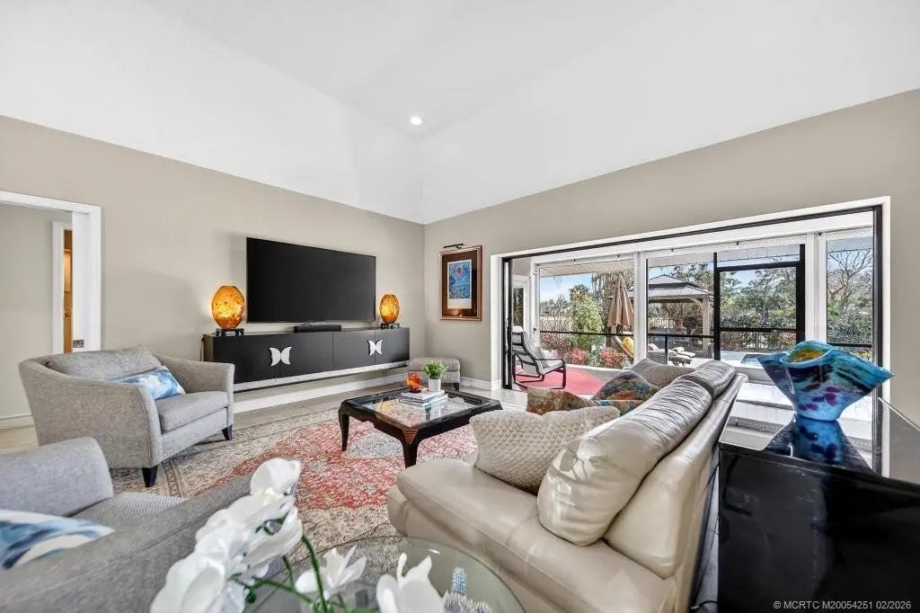 Located within the 24-hour manned, gated Evergreen Club, this beautifully updated 3BR/3.1BA CBS pool home offers comfort, privacy, and effortless Florida living surrounded by lush tropical landscaping. The home has been recently painted in a fresh, neutral palette and features high ceilings, iMPACT windows, porcelain flooring, crown molding, & an open great room layout designed for both everyday living and entertaining. The kitchen is thoughtfully designed with granite countertops, modern cabinetry, premium appliances, and island seating. The primary suite is privately situated in its own wing, offering dual baths, walk-in closets, and direct access to the outdoor living area. Pocket IMPACT sliding doors open to a screened travertine patio and a tropical saltwater pool and spa, recently resurfaced and framed by mature palms. Evergreen Club offers 24-hour security with optional golf membership, all in a prime Palm City location close to dining, beaches, I-95, and downtown Stuart.