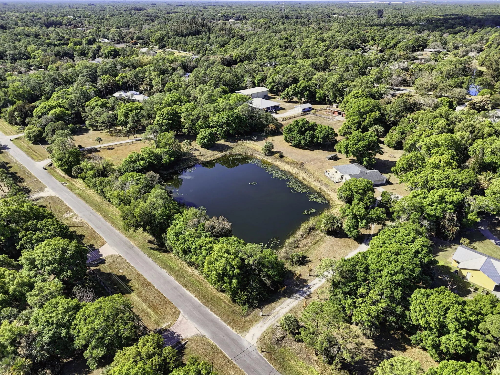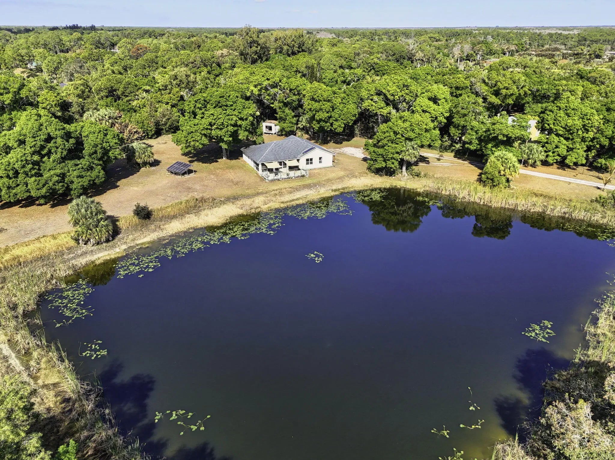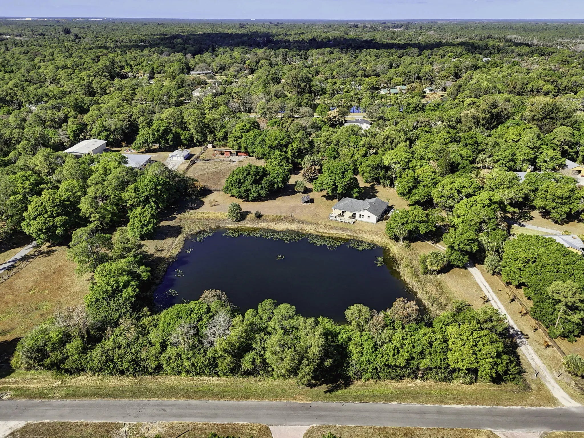 Your opportunity awaits! 4.56 beautiful acres with a gorgeous 1-acre spring fed pond on one of the best streets in Jupiter Farms! Rare old granddaddy oaks, privacy from the street and PLENTY of space for a custom estate home, barn, workshop or just about anything else you may want. Renovate and live in the existing 3/2/2 home while you build your dream home! This CBS home was positioned for a peaceful view of the pond...watch the wood ducks swimming as the sun goes down each night. Roof was updated in 2020, along with solar panels. Excellent location on a paved road, one minute to Indiantown Road, three minutes to I-95 and the Florida Turnpike and less than 15 minutes to the best beaches in Palm Beach County. Don't miss out on this amazing property!