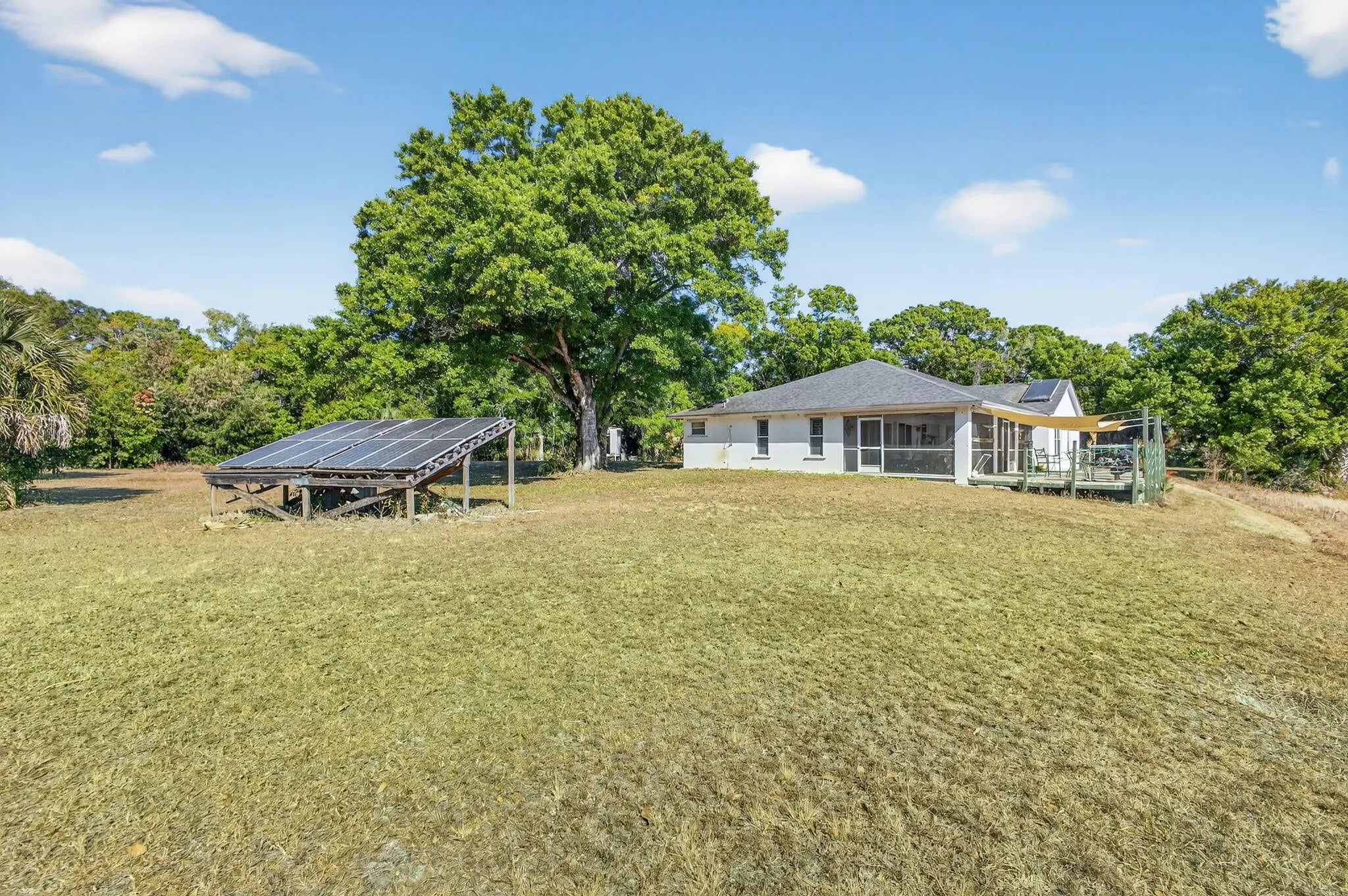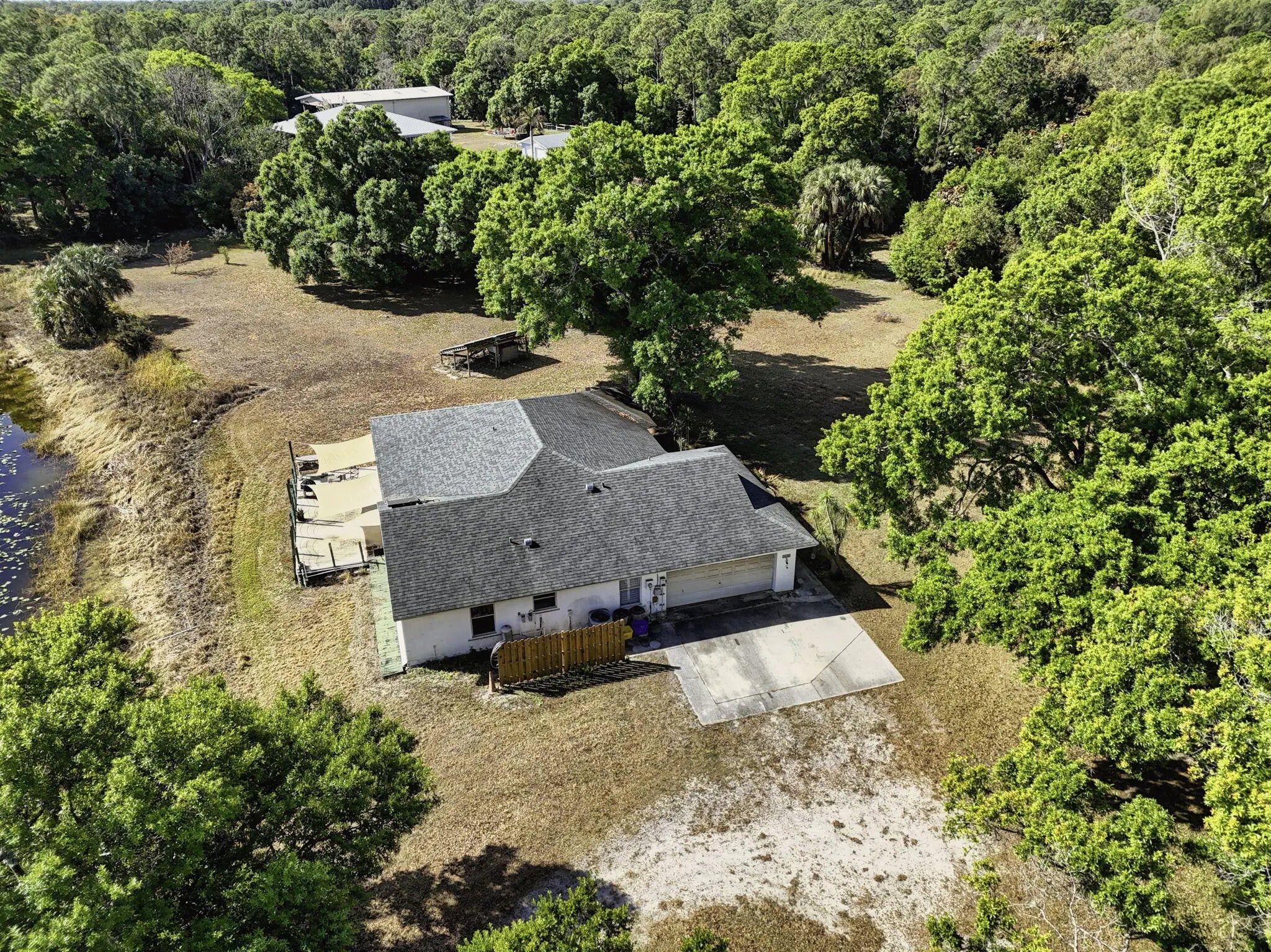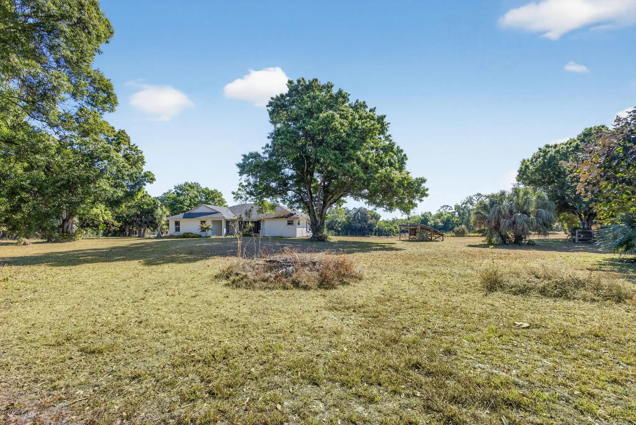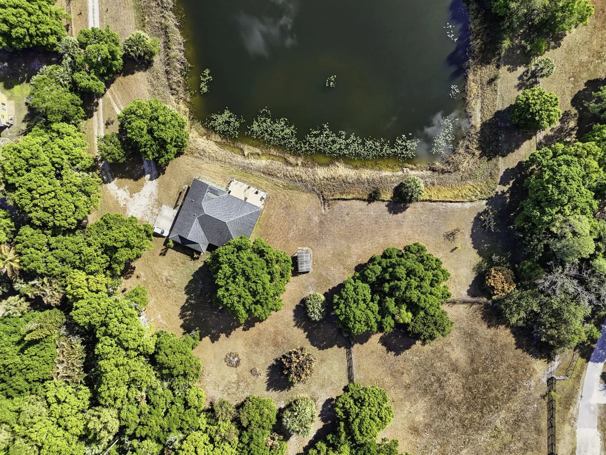Your opportunity awaits! 4.56 beautiful acres with a gorgeous 1-acre spring fed pond on one of the best streets in Jupiter Farms! Rare old granddaddy oaks, privacy from the street and PLENTY of space for a custom estate home, barn, workshop or just about anything else you may want. Renovate and live in the existing 3/2/2 home while you build your dream home! This CBS home was positioned for a peaceful view of the pond...watch the wood ducks swimming as the sun goes down each night. Roof was updated in 2020, along with solar panels. Excellent location on a paved road, one minute to Indiantown Road, three minutes to I-95 and the Florida Turnpike and less than 15 minutes to the best beaches in Palm Beach County. Don't miss out on this amazing property!