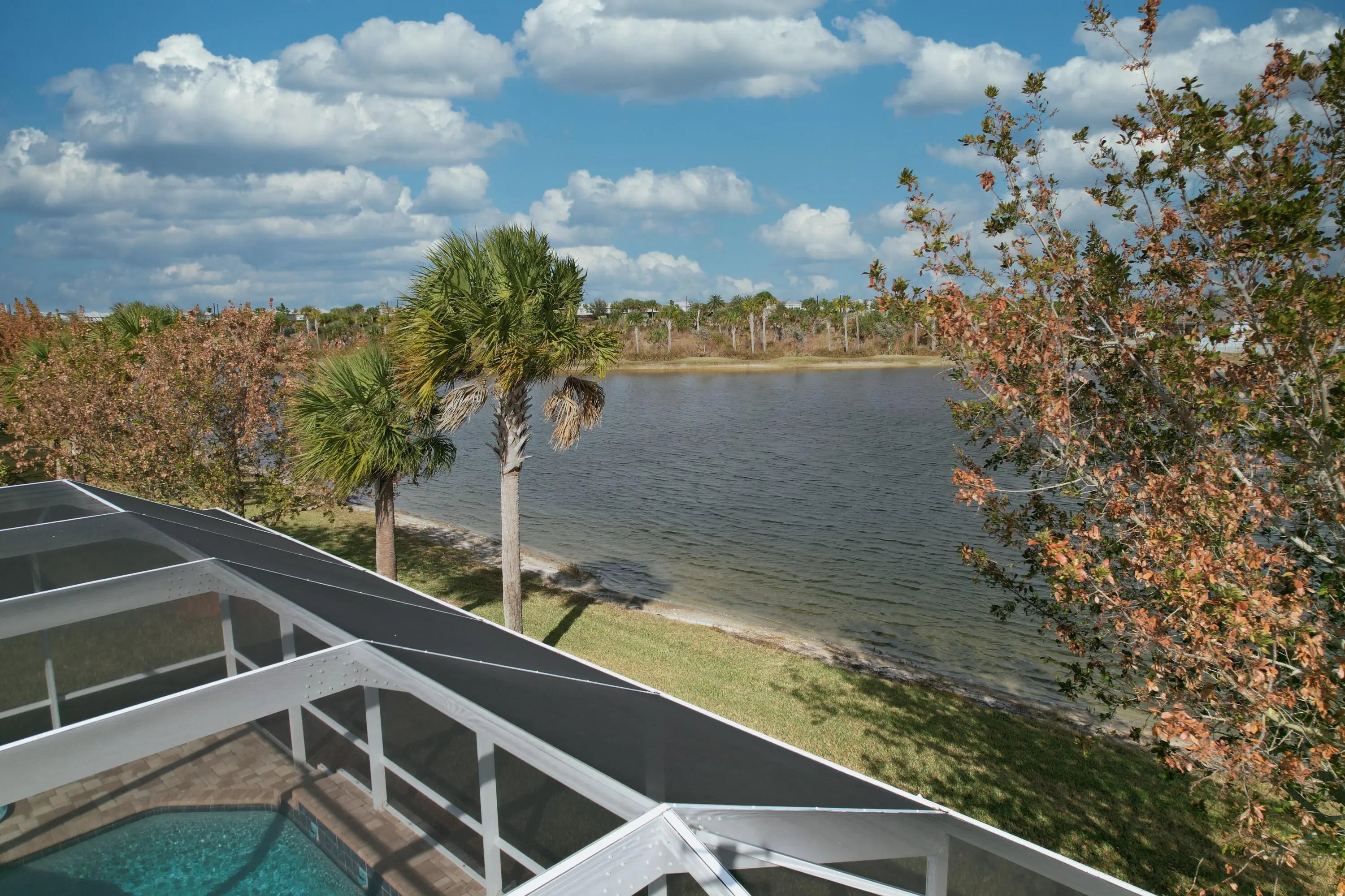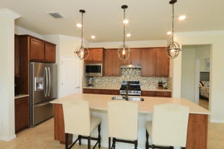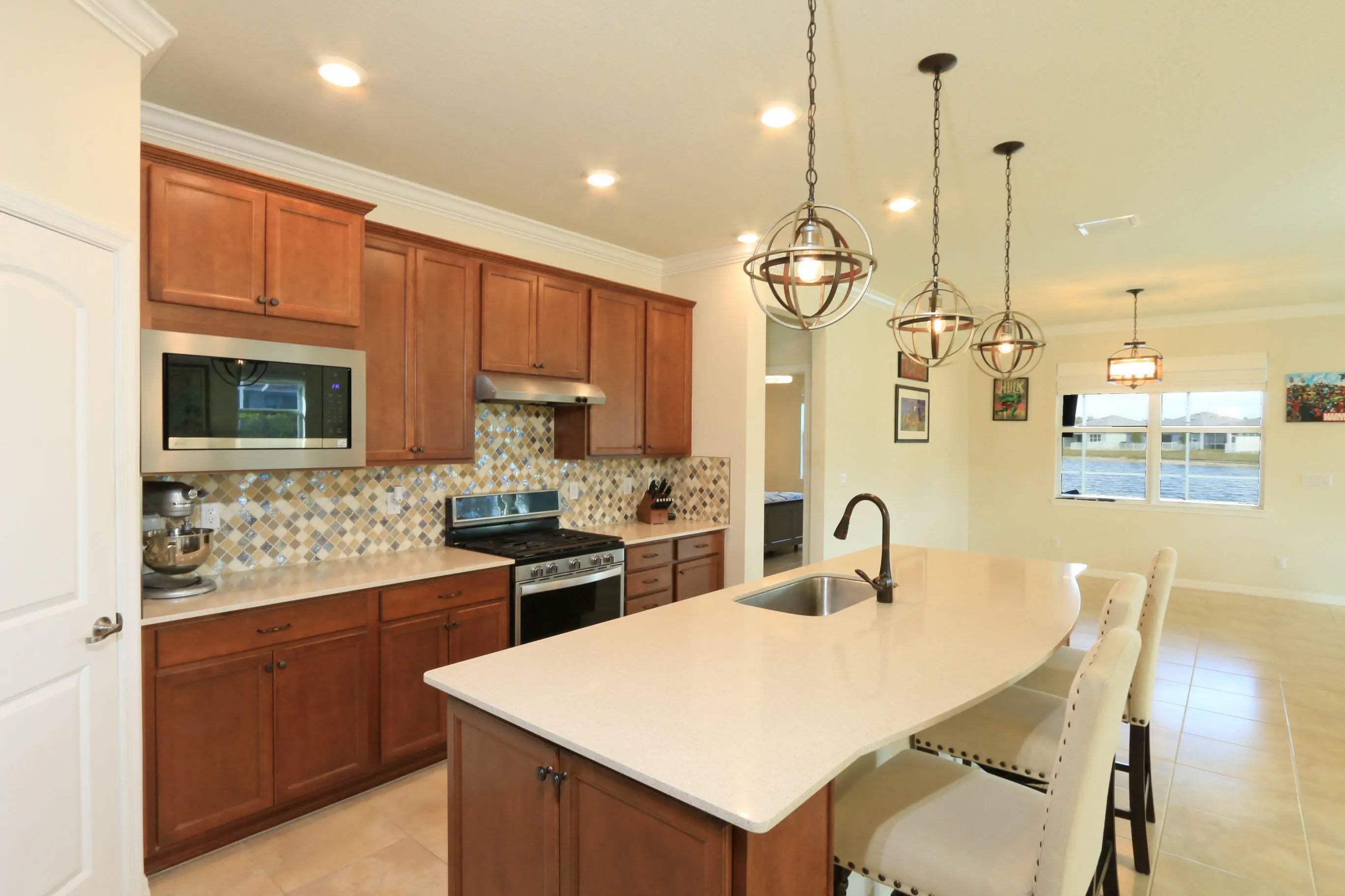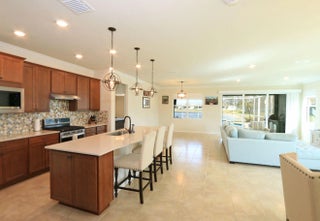 Gorgeous wide lakefront views highlight this extended Summerwood model. This spacious three-bedroom, two-bath home features full impact windows and doors, tile flooring throughout, and an open-concept design ideal for comfortable living and entertaining. The chef's kitchen offers a large island, quartz countertops, and ample workspace for gatherings. The owner's suite includes a generously sized bedroom, a custom-organized walk-in closet, and a luxurious bath with an oversized walk-in shower. Step outside to your screened pool lanai, complete with a summer kitchen, and relax while enjoying peaceful lakefront sunrises and serene water views. Active 55+ lifestyle with 2 clubhouses and pools, pickleball, tennis, putting green and bocce.