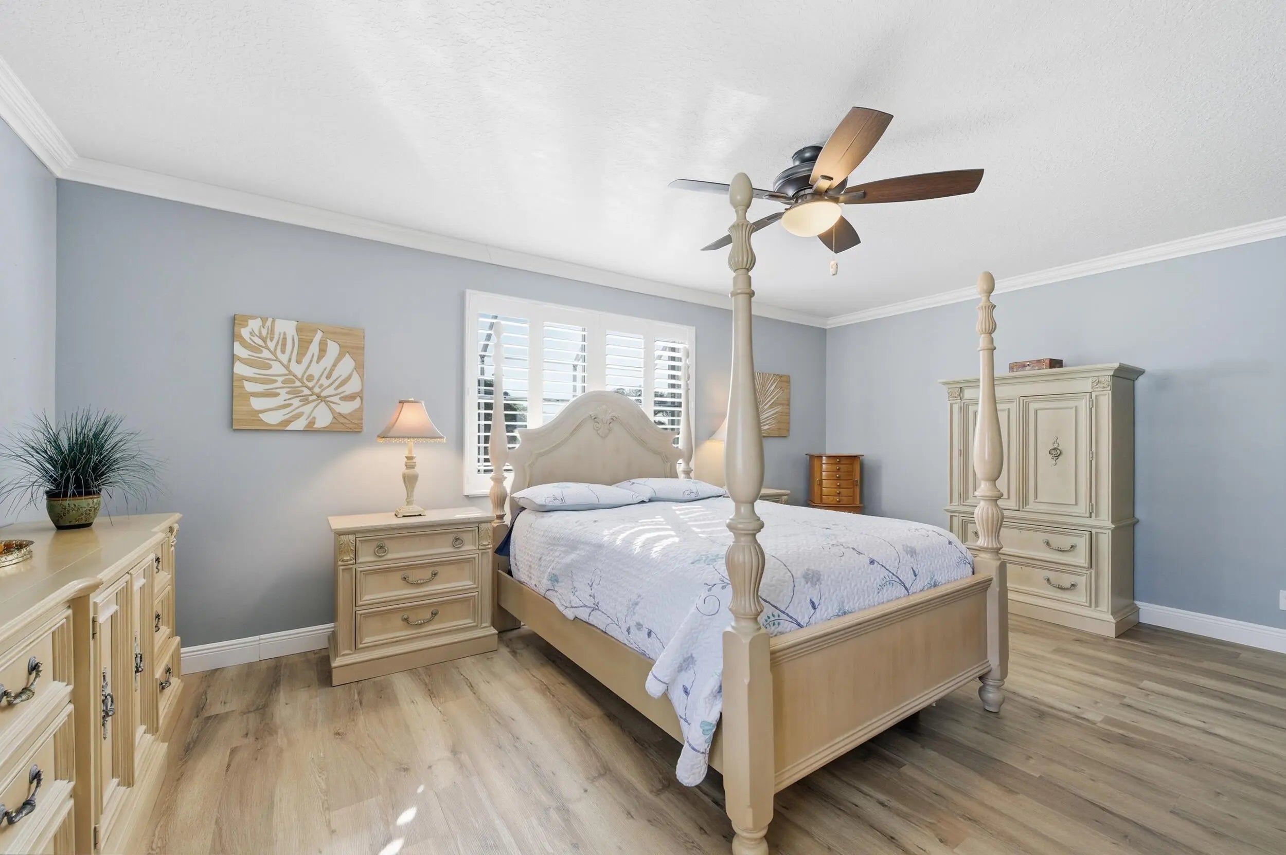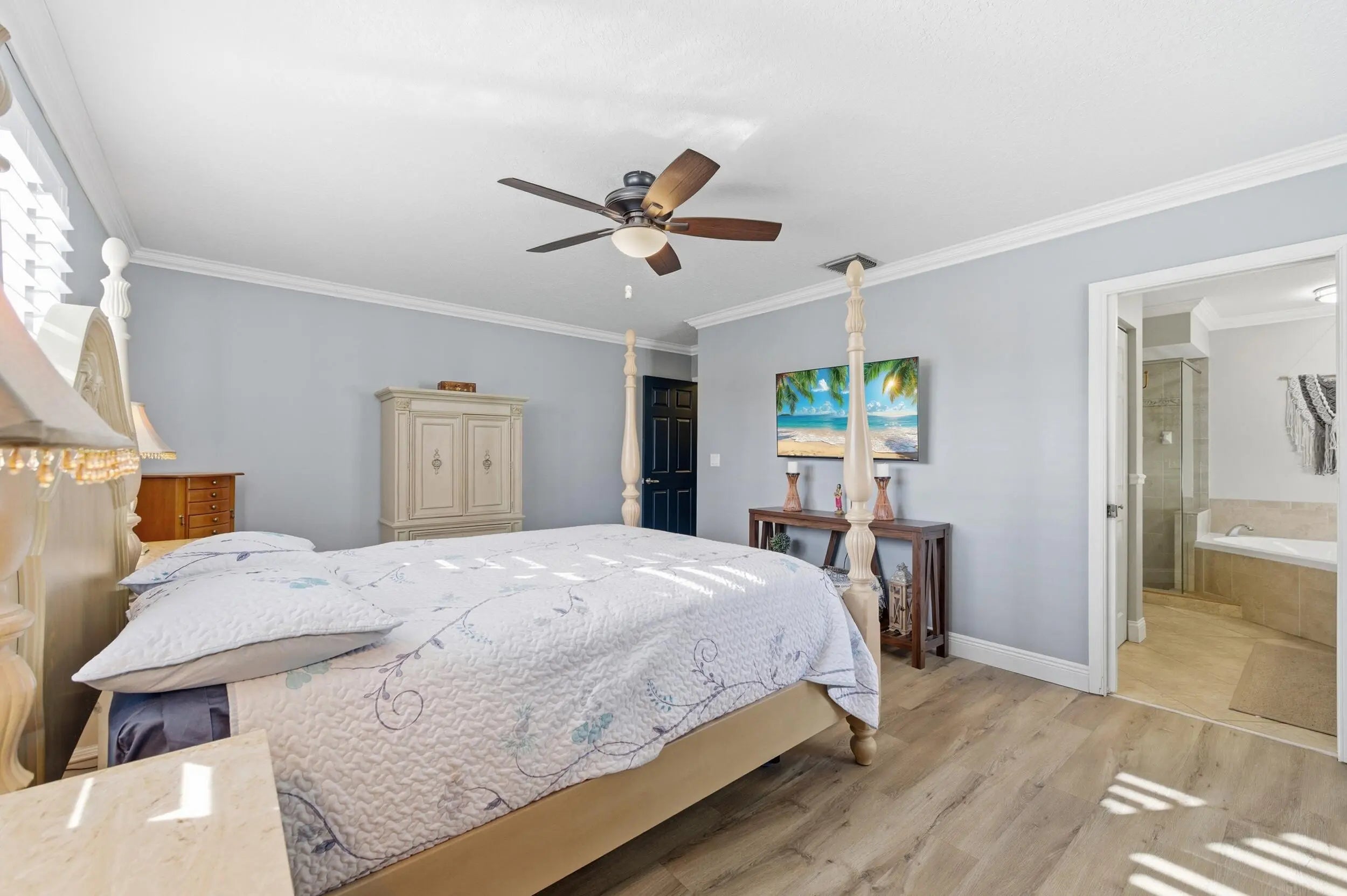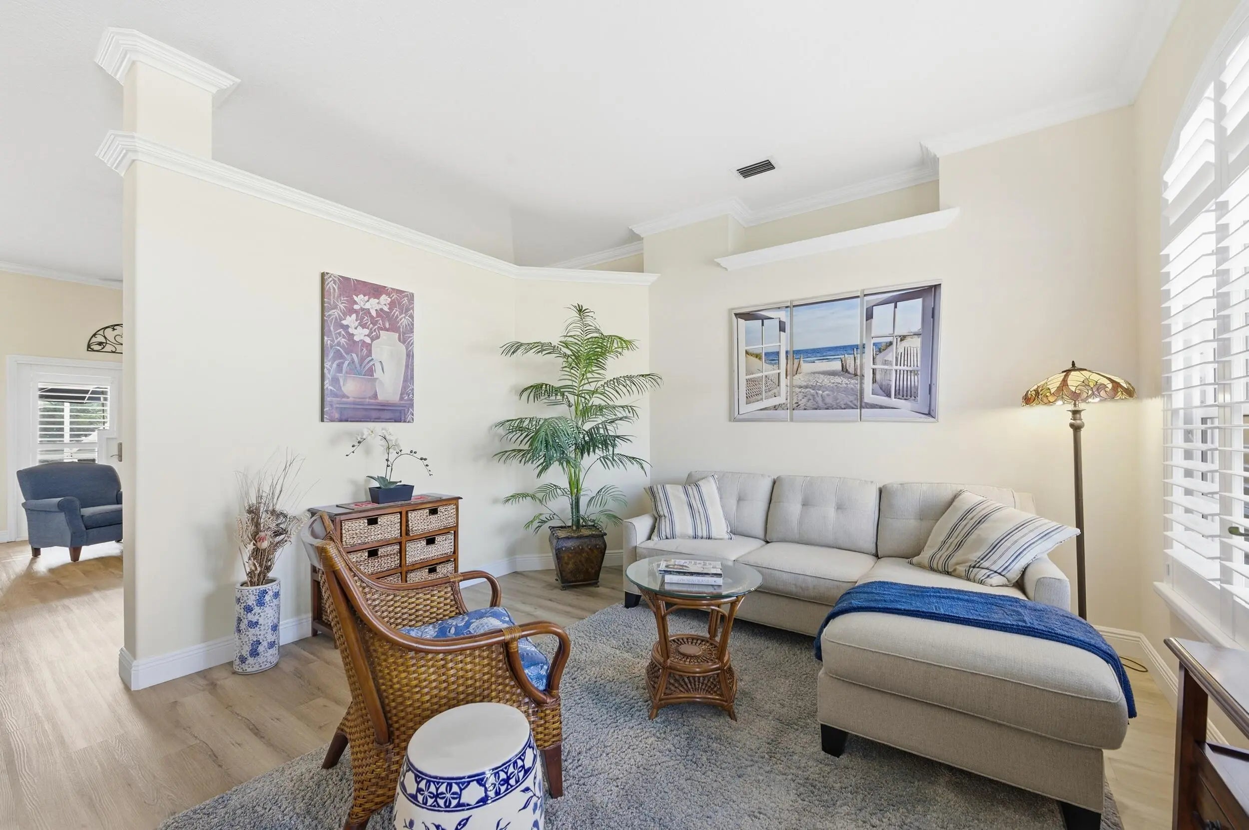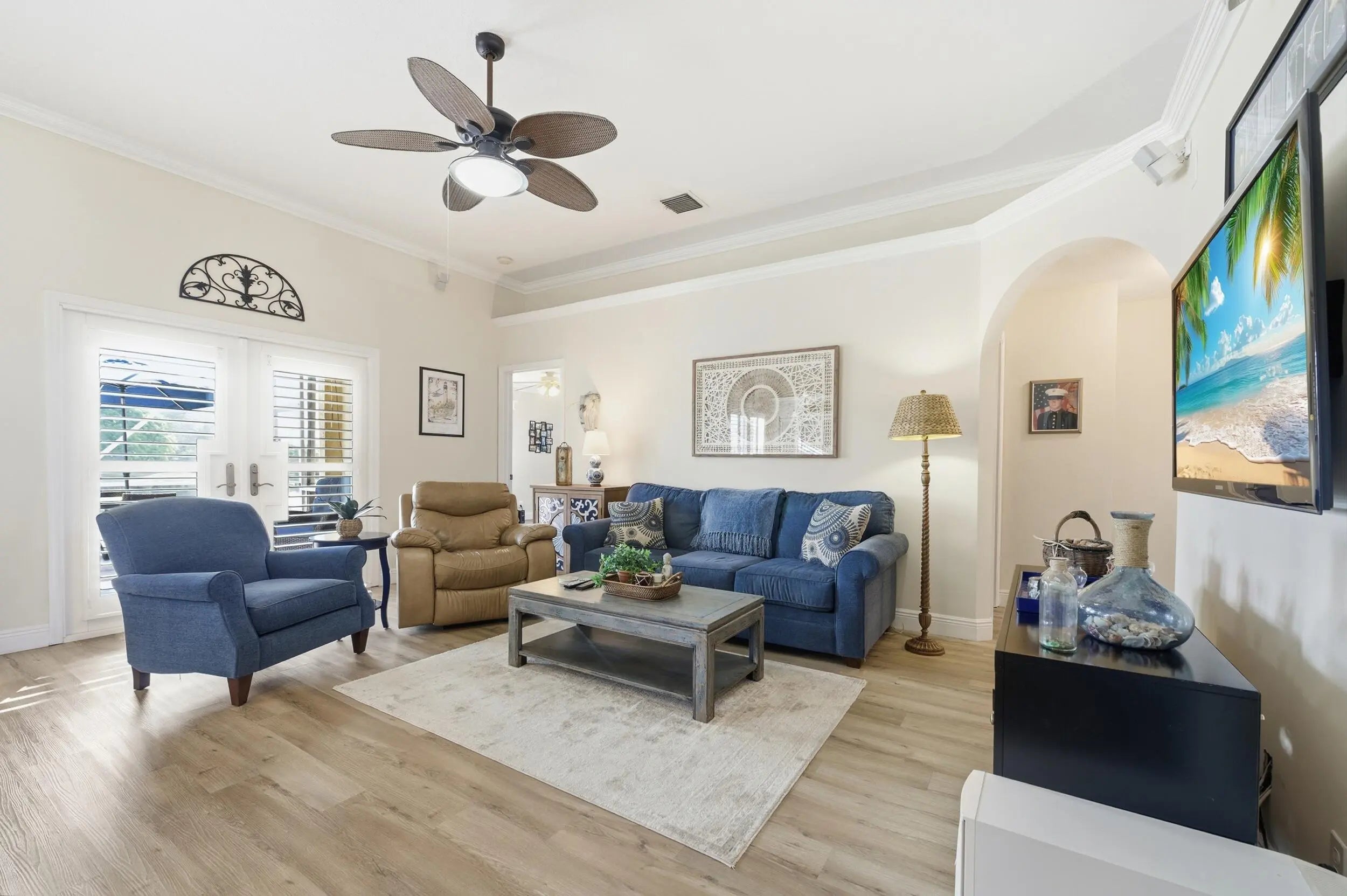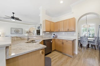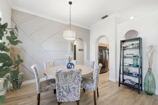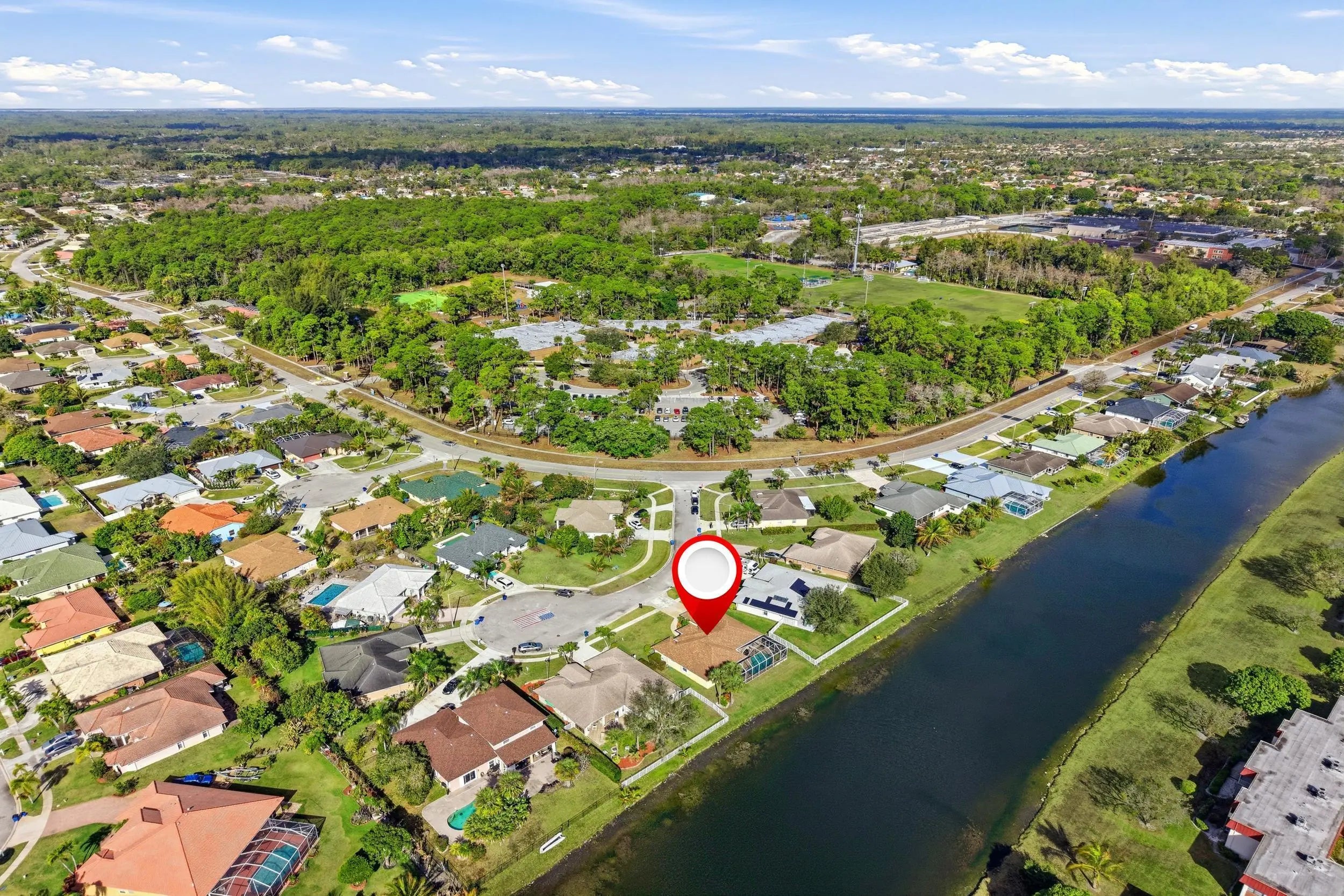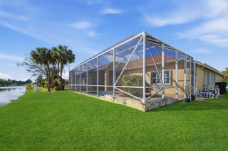 Welcome home to this beautifully updated 4-bedroom, 2-bathroom, 2-car garage waterfront pool home offering the perfect blend of modern upgrades and relaxed Florida living all within an A-rated school district. From the moment you step inside, you'll appreciate the thoughtful improvements throughout. Wood-look luxury vinyl flooring runs through the main living areas, complemented by updated trim work, plantation shutters, impact windows, and stylish upgraded fixtures and lighting. The home has been tastefully refreshed with an updated kitchen and bathrooms designed for both comfort and function. The kitchen is a true centerpiece, featuring stunning quartzite countertops with ample prep space and bar-top seating, a classic subway tile backsplash, solid wood shaker cabinetry, newer appliances, a dual sink with updated hardware and disposal, and a dedicated pantry. Best of all, it offers beautiful views of your private pool and the tranquil waters beyond, making it ideal for entertaining or simply enjoying your morning coffee. The generous primary suite is a true retreat, featuring wood-look flooring, updated trim and fixtures, plantation shutters, and plenty of natural light. The ensuite bath offers a walk-in closet with built-ins, a solid wood vanity with granite countertops, dual sinks, updated mirrors and lighting, a fully tiled walk-in shower with a frameless glass enclosure, and a Roman Jacuzzi soaking tub for ultimate relaxation. All three secondary bedrooms are generously sized, two with tile flooring and one with wood-look laminate, each offering ample closet space and natural light. The secondary bathroom mirrors the primary's quality finishes, featuring granite countertops, a solid wood vanity, updated fixtures, and a fully tiled shower/tub combination with upgraded hardware. At the front of the home, the formal living and dining areas flow seamlessly together and are highlighted by a charming wood accent wall, plantation shutters, elegant trim work, and an abundance of natural light streaming through impact glass. Just off the kitchen, the spacious family room is perfect for hosting gatherings, complete with impact French doors leading outside and a cozy breakfast nook overlooking the water. Step outside to a private backyard retreat with a screened enclosure, covered patio, and a freeform pool with a waterfall feature, perfectly positioned along serene water views. The expansive canal system stretches throughout the surrounding areas, offering a peaceful setting and excellent fishing opportunities right from your backyard. Whether casting a line, entertaining guests, or simply unwinding at the end of the day, this outdoor space embodies the laid-back South Florida lifestyle. Located just minutes from Commons Park with its walking trails, lakes, sports fields, and community events, this home offers easy access to outdoor recreation and neighborhood gatherings. You're within walking distance of Cypress Trails Elementary School and close to shopping centers, grocery stores, dining options, and everyday conveniences, all while enjoying the quiet charm and desirable setting of Royal Palm Beach.