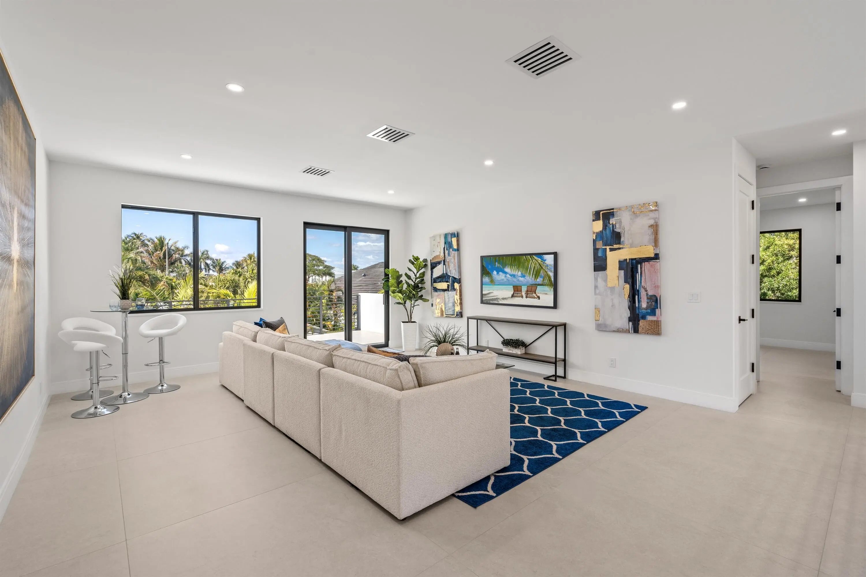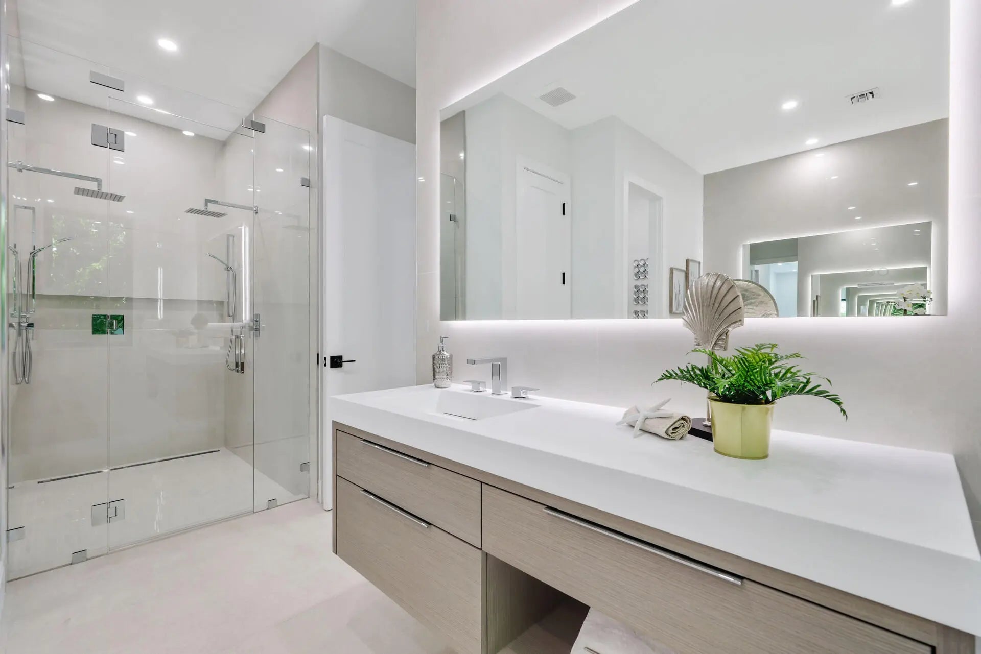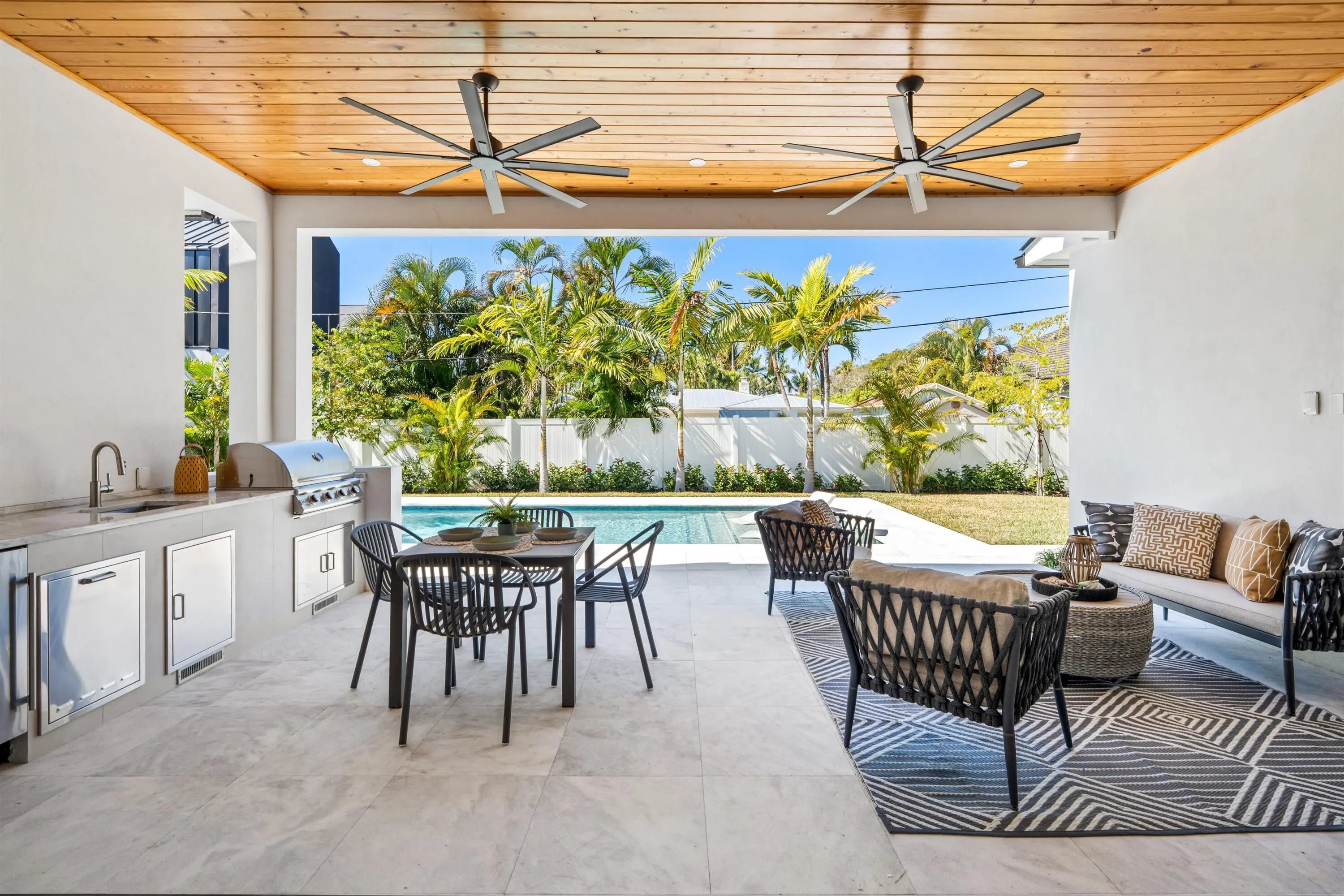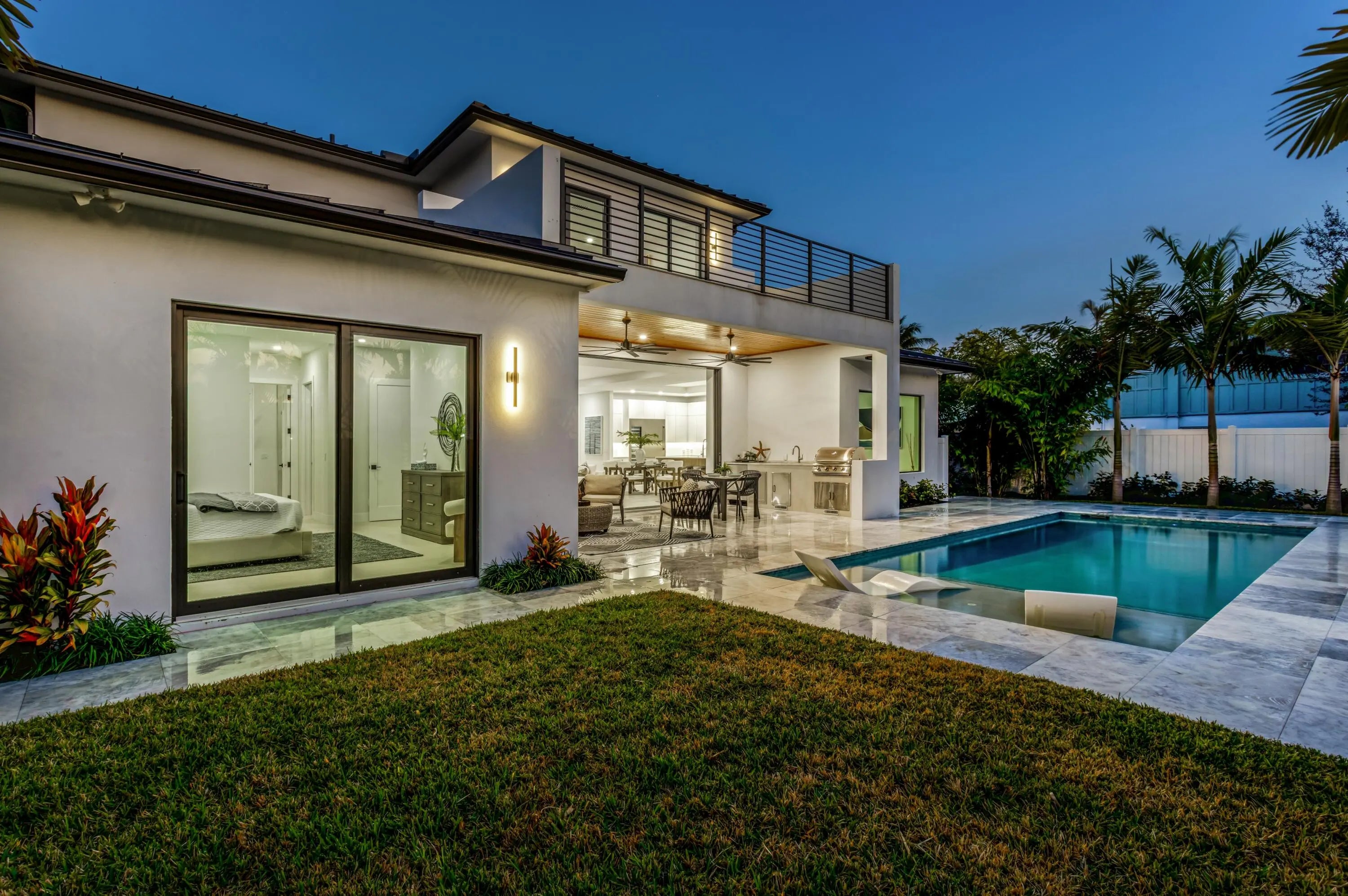 This brand-new coastal-contemporary is designed for ease of living and highlighted by luxury finishes and move in ready! The feel is light, bright and breezy with a fresh, modern 'Now' vibe. Topped by a soaring 21-foot-high ceiling, the grand foyer, with a dramatic floating staircase, sets a sophisticated tone. Radiating effortless elegance, the adjoining principal rooms are organized in an open-concept layout with 10-foot ceilings, a neutral white color palette and 48'' x48'' large-format tile flooring. Open to the living and dining areas, the kitchen is centered on a cook's island and fitted with warm wood cabinets contrasted by clean, white uppers, quartz countertops, and premium Thermadore appliances including a wine cooler. Sliding glass doors in the living room to the loggia fully pocket away, visually and functionally amplifying the sense of space. With 5,053± total square feet and five bedrooms in a split-bedroom plan, the primary suite, a serene retreat, is situated on the first floor. The suite, topped by a coved, backlit ceiling and featuring sliding doors to the pool area, comprises two custom-fitted walk-in closets and a spa-like bathroom with custom double vanities topped by solid-surface integrated sinks, backlit mirrors, expansive double-sized glass-enclosed shower with two shower heads, a freestanding soaking tub and a separate toilet room. Also on this level are a laundry room, a flexible guest-bedroom suite/office and two-car garage. Upstairs, serving three guest bedrooms, all with their own private en-suite baths, is the loft living area with sliding glass doors to the pool-view balcony. For added convenience is an additional laundry on the 2nd floor. Amenities include remote-controlled, fog-out/privacy film for the front-entry glass, impact windows and doors and metal roof. This luxe newly built residence is ready for immediate occupancy. Welcome to your dream home in the coveted Lake Ida neighborhood! LOCATION: 1408 Pine Lane, Delray Beach, Florida: Lush green parklands and scenic picnic areas are only part of Lake Ida's appeal. This coveted neighborhood also enjoys easy access to canoeing, kayaking, freshwater fishing; the highly acclaimed Delray Beach Playhouse; Delray Beach's historic downtown district, with an array of boutiques and bistros along vibrant Atlantic Avenue; and pristine Atlantic Ocean beaches just minutes away. PROPERTY: In the fenced backyard, the loggia, topped by a tongue-and-groove wood ceiling and featuring a fully equipped summer kitchen, flows out to the saltwater pool with a sun shelf inviting outdoor entertaining and relaxed leisure time. Additionally, the outdoor shower is convenient when returning from the beach.