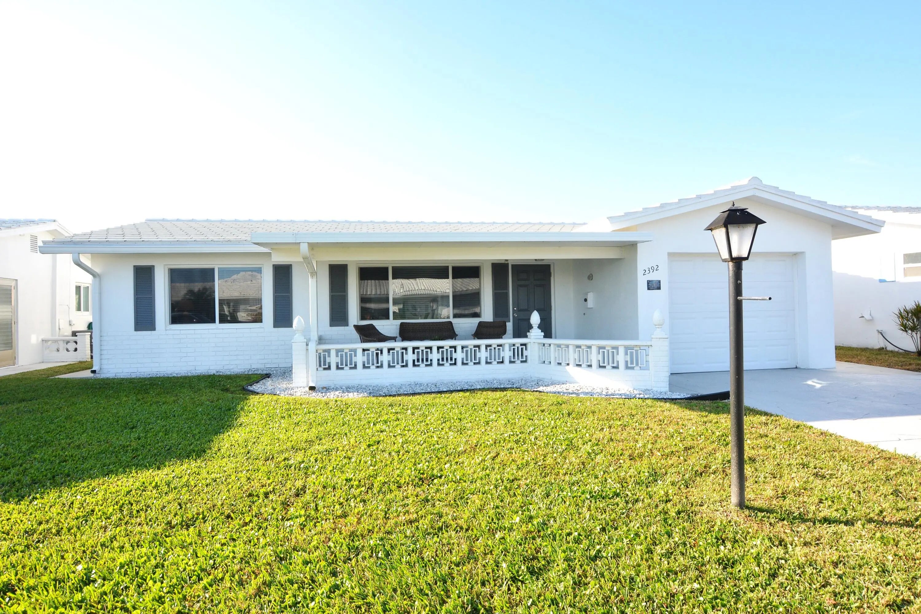 Totally updated Edgewood Model with full Florida room. Paid up recreation lease in full. Thousands in upgrades including HURRICANE IMPACT WINDOWS, ROOF REPLACEMENT 2019, ELECTRICAL PANEL CHANGE-OUT 2015, HURRICANE RATED GARAGE DOOR 2015, AC 2016. Double concrete drive plus front porch with insulated roof. Kitchen cabinetry all replaced plus updated appliances. Quartz countertops. Both baths redone. Neutral tile on the diagonal throughout. Popcorn ceiling removed and knockdown texture added plus crown molding. Custom window treatments. Disappearing screen door at entry way. Owner will consider selling furnishings separate. A MUST SEE. FREE GOLF, 3 CLUBHOUSES & 3 HEATED POOLS, MINUTES TO OCEAN BEACHES AND SHOPPING..