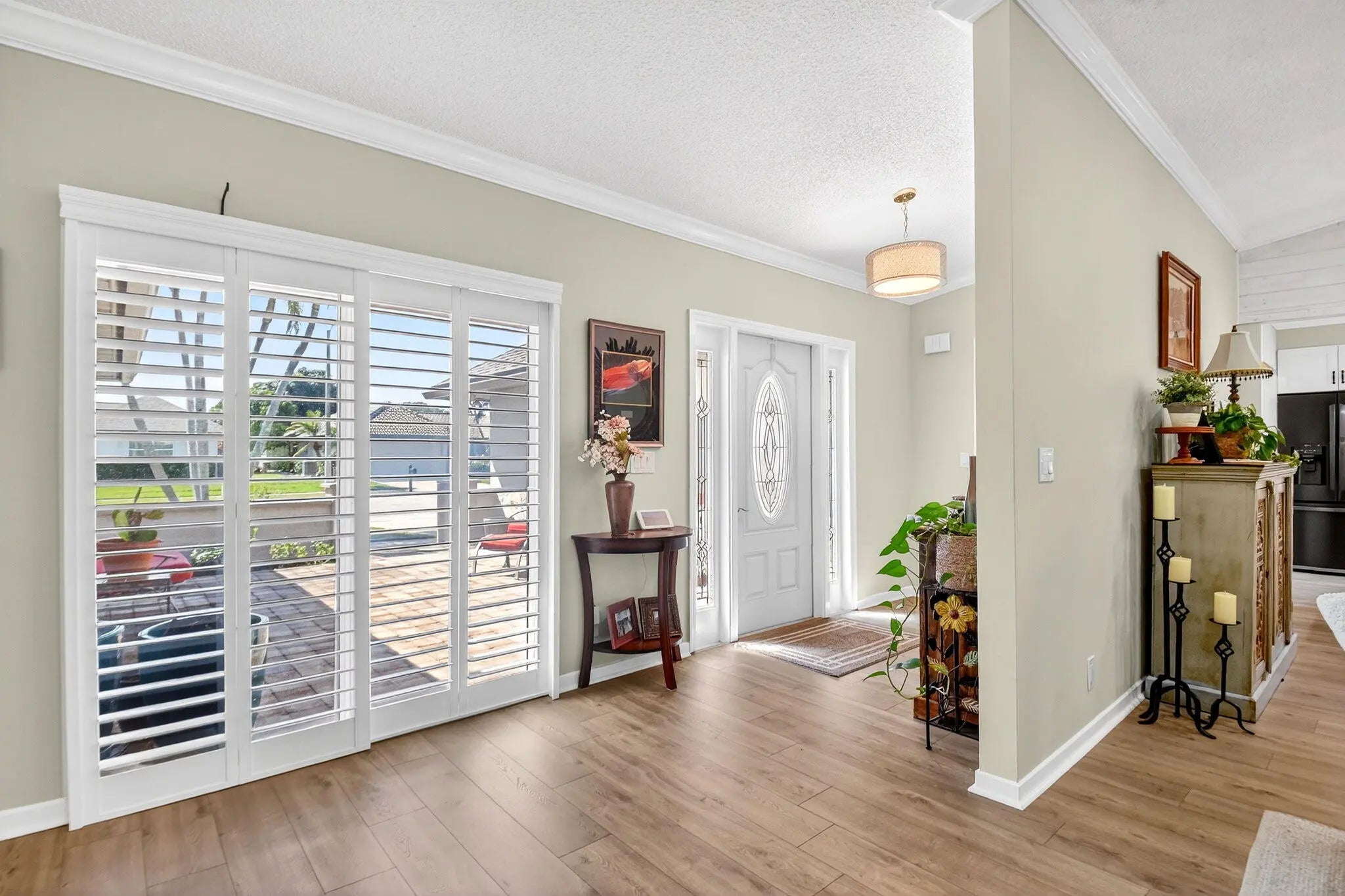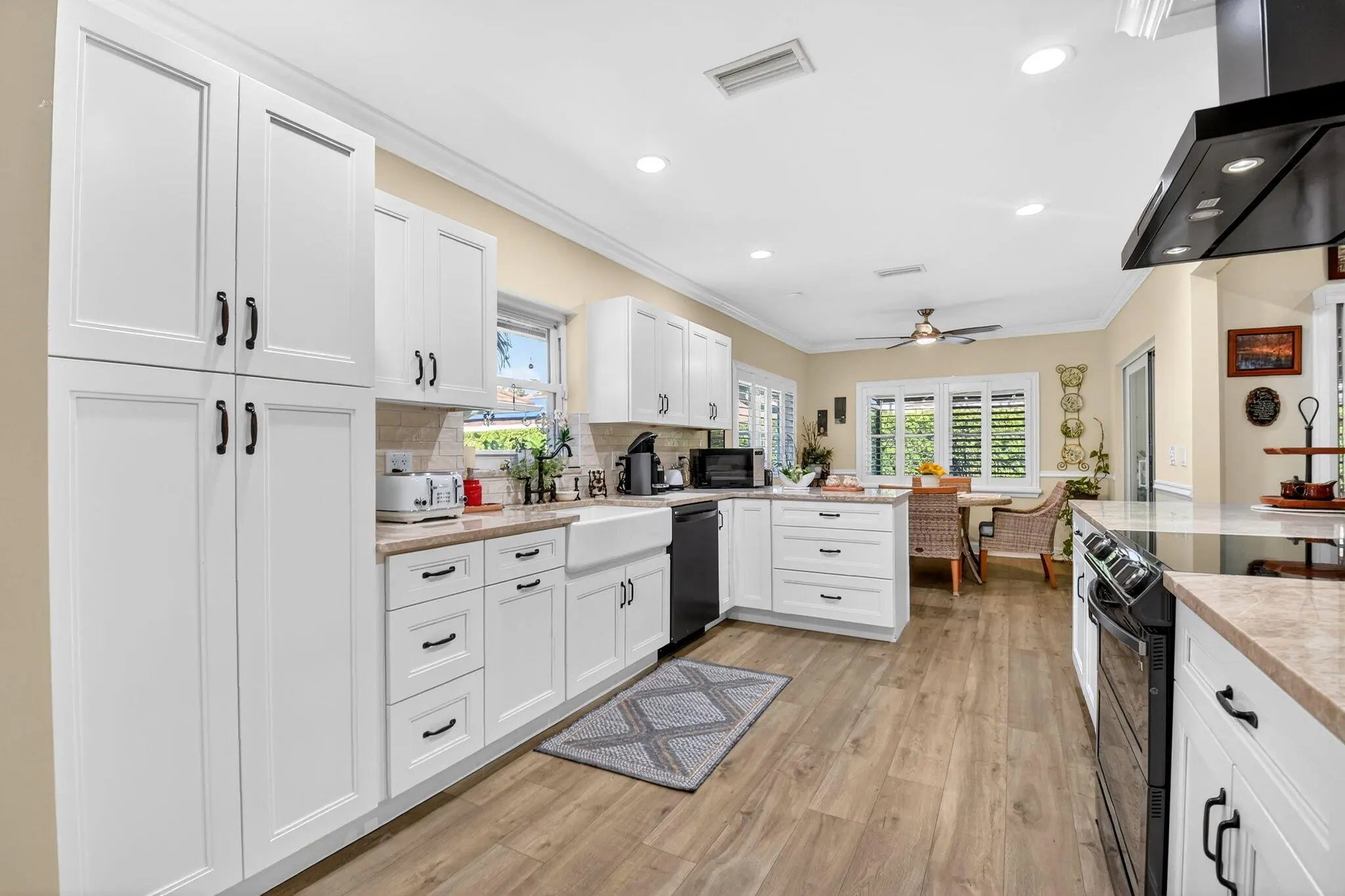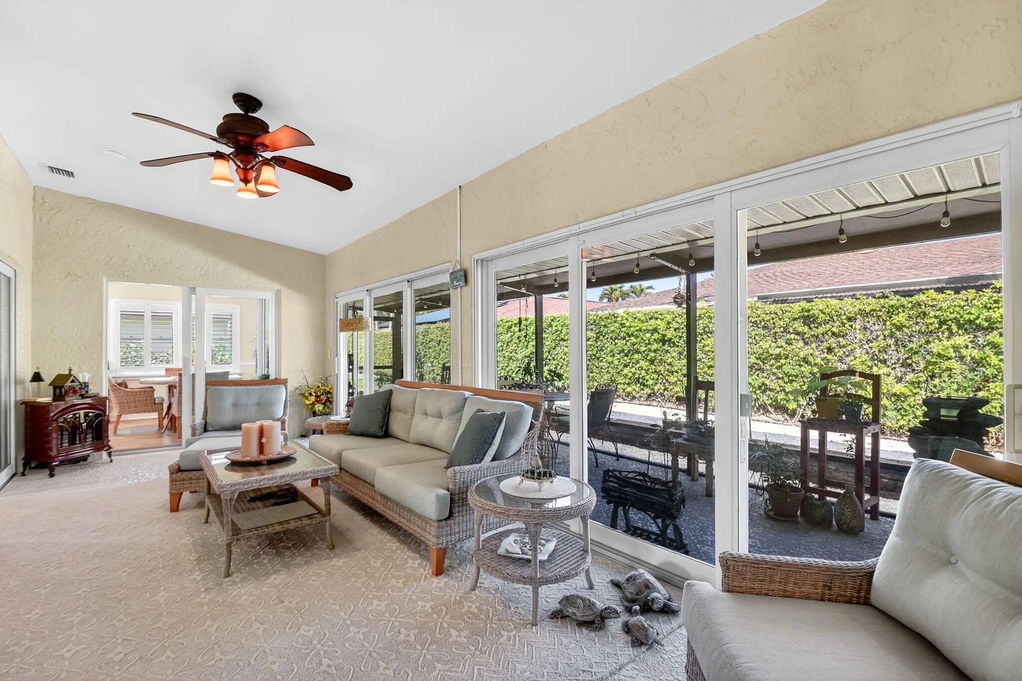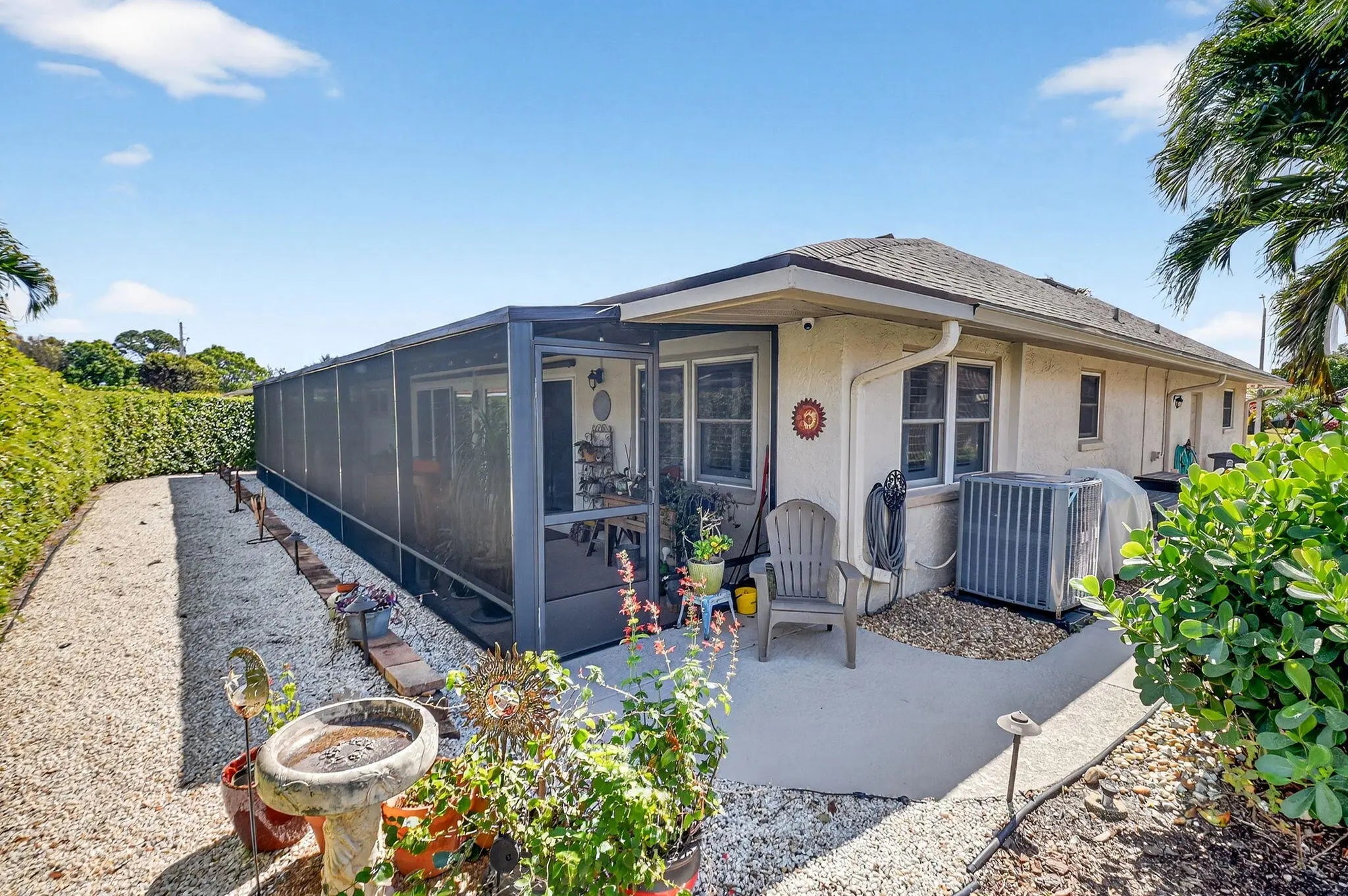 Welcome to 10265 Greentrail Drive N, a meticulously updated residence nestled in the serene 55+ community of Pine Tree Village in Boynton Beach, Florida. This stunning property offers 2,304 square feet of thoughtfully designed living space, featuring three spacious bedrooms and two modern bathrooms. Upon entering, you are greeted by an open-concept layout that seamlessly integrates the living, dining, and kitchen areas, creating an inviting atmosphere for both relaxation and entertainment. The kitchen is a chef's dream, boasting an island with stone countertops, dual convection ovens, and Kohler porcelain cast iron farmhouse sink with a garbage disposal. White kitchen cabinets with a pantry provide ample storage, while recessed lighting enhances the space's elegance. The great room is a highlight, featuring vaulted ceilings and improved lighting, complemented by Norman plantation shutters throughout the home. The interior and exterior have been freshly painted, offering a crisp, clean aesthetic. The Florida room, with its new 10-foot hurricane impact sliding doors, opens to a covered, screened patio that spans the length of the home, perfect for enjoying the tranquil surroundings. Additional features complete impact windows, sliders and doors, a newly insulated impact garage door with a security opener, overhead storage shelves, and an outdoor shower stall. The home is equipped with a 2026 AC unit, new hot water heater and new ductwork, ensuring comfort and efficiency. The garage is enhanced with a new chemical-resistant flooring, providing durability and style. The flooring throughout the home, including the bathrooms, is a beautiful wood laminate, adding warmth and continuity to the space. The property also includes a newly landscaped patio with plenty of room for outdoor seating and entertaining. Located in the desirable Pine Tree Village community, this home offers convenient access to local amenities, shopping, and dining. It is a perfect blend of modern upgrades and classic charm, ready to welcome its new owners. This property is currently for sale and represents a unique opportunity to own a piece of paradise in Boynton Beach. Schedule a private viewing and experience the exceptional lifestyle this home has to offer.