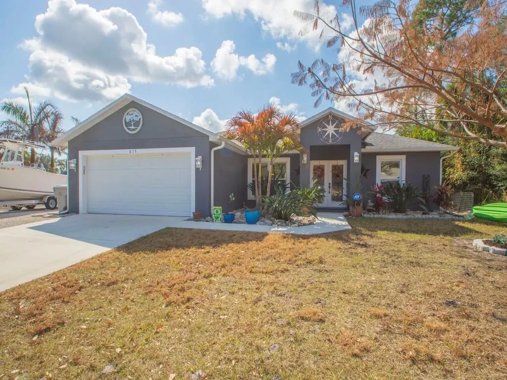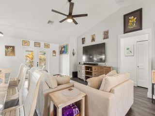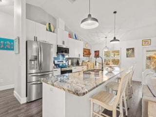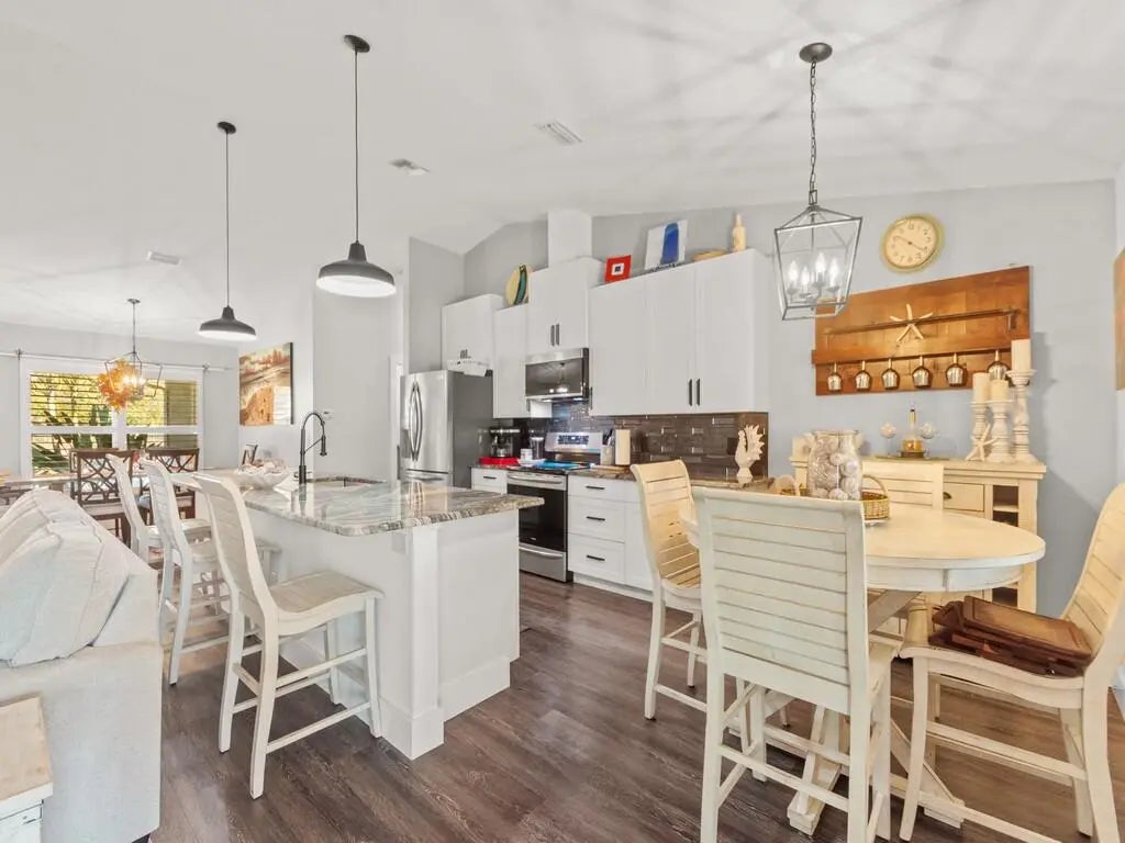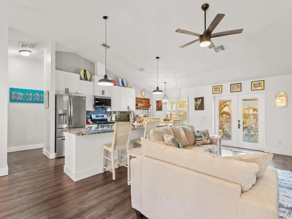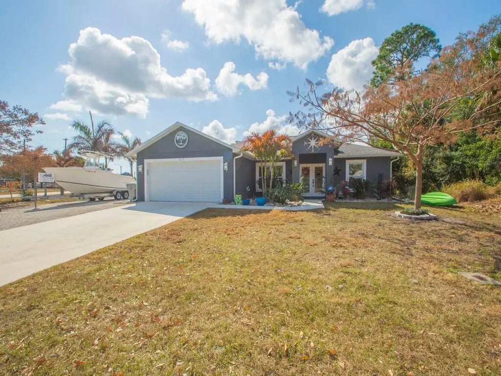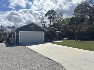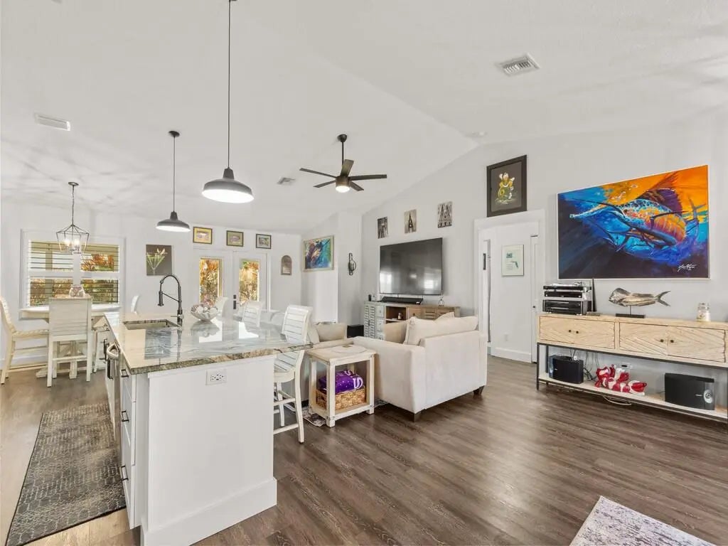 No HOA 2022 concrete block home featuring 3BR/2BA and 2082 SF under air. Open layout with vaulted ceilings, split bedrooms, island kitchen, granite counters, and stainless appliances. Induction Range, Exhaust fan, inside laundry, impact glass, and matching laminate throughout. Plantation Shutters 2-car garage and 40' x 10' screened patio. County water/sewer. Fence Backyard. Solar Panels, Huge 16' x 32' permitted rear In-law Suite/workshop with power and A/C-great for hobbies, storage, or flex space, plus attached 32' x 10' covered area. Next to Gravel parking for 6 cars/boat or RV. Community Pool.
