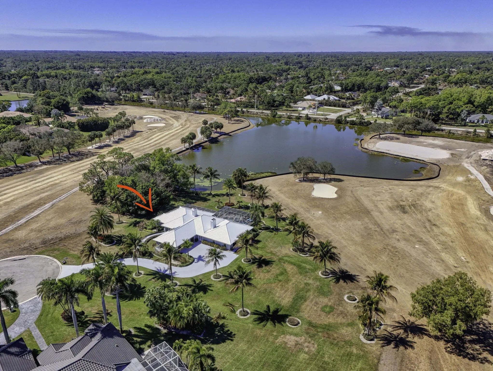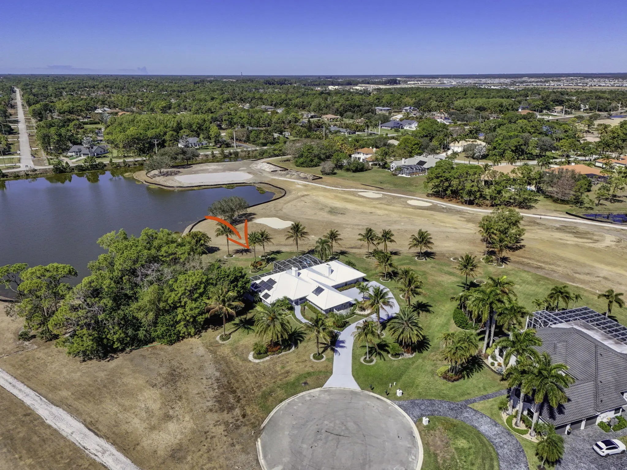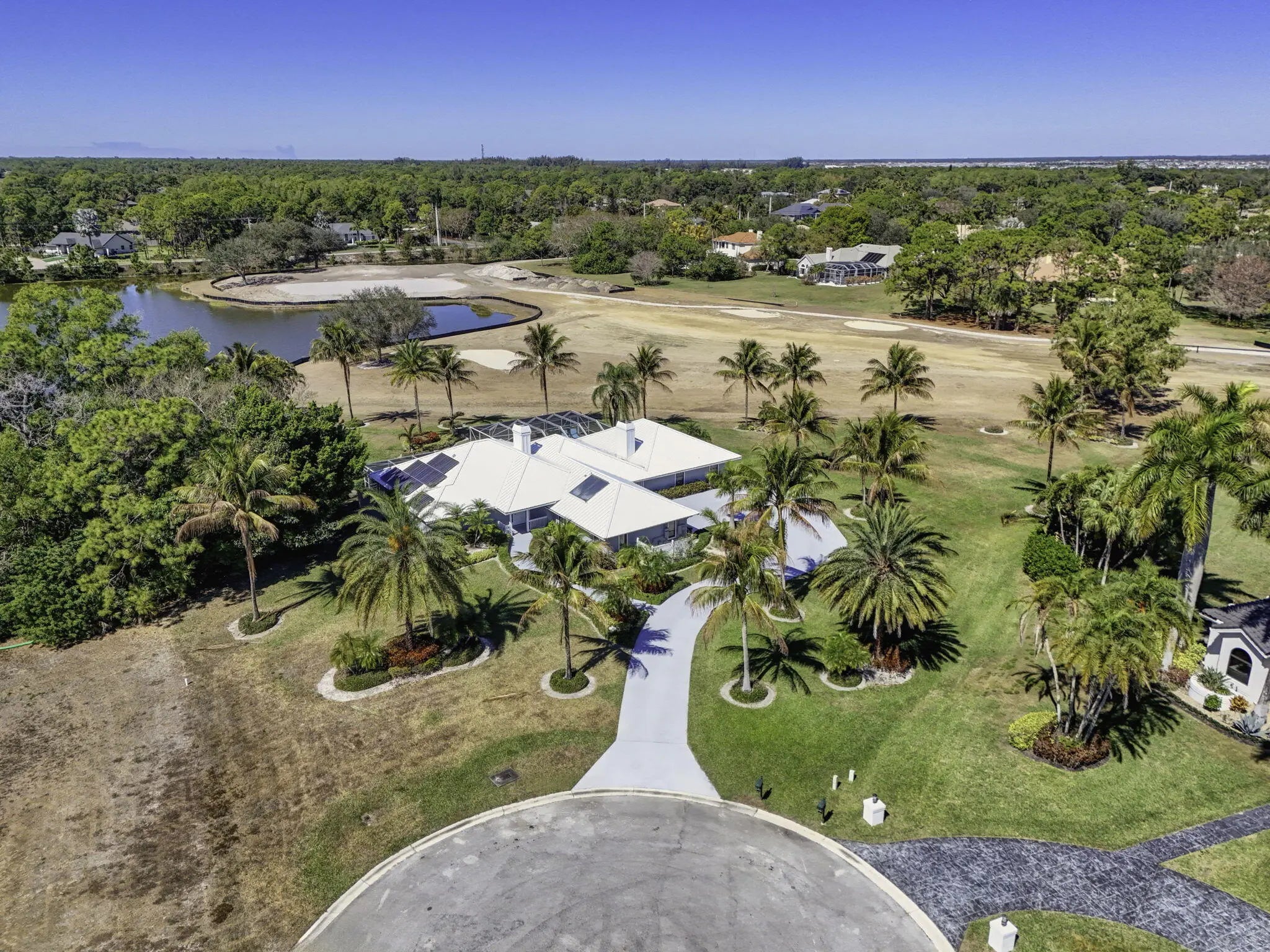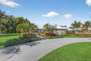 The premier lot in Bay Hill estates located at the end of a cul-de-sac this 1.19 acre lot boasts panoramic views of PGA's estate course as well as a glimmering lake. This key west style home features a metal roof, solar, 500 gallon propane tank that fuels the whole house generator and a garage big enough for 2 cars and a golf cart. Long winding drive way framed by majestic palms. Oversized patio areas around the pool include a covered and screened porch. 3 fireplaces accent the large spacious bedrooms and living areas. Garage features a whole wall of built in storage cabinets and a solar hot water heater. Huge 21'x16' primary bedroom has 2 large walk in closets. Newer porcelain tile, wood look, tile floors in the living areas. Photovoltaic Electric System converts sunlight into electric