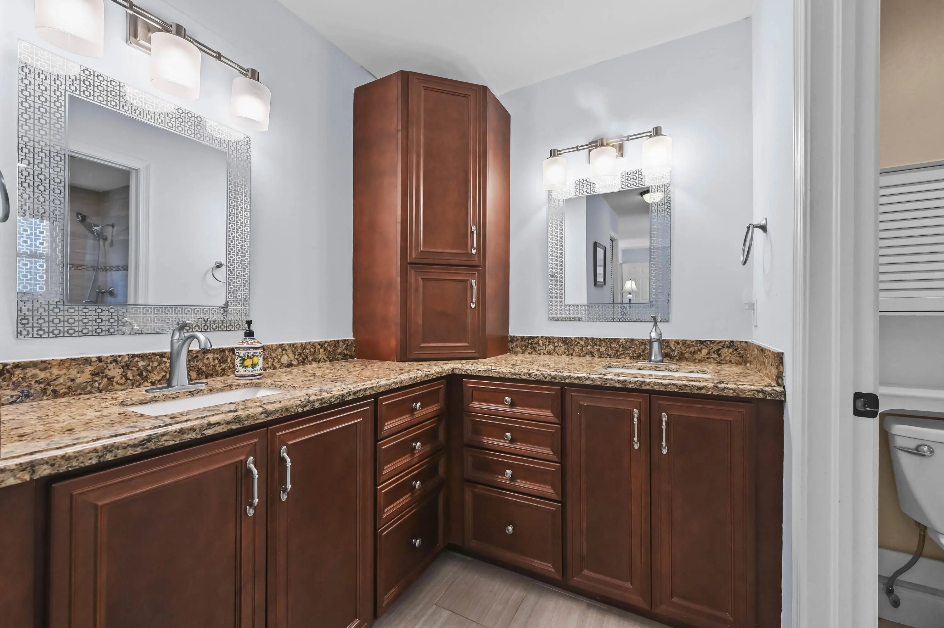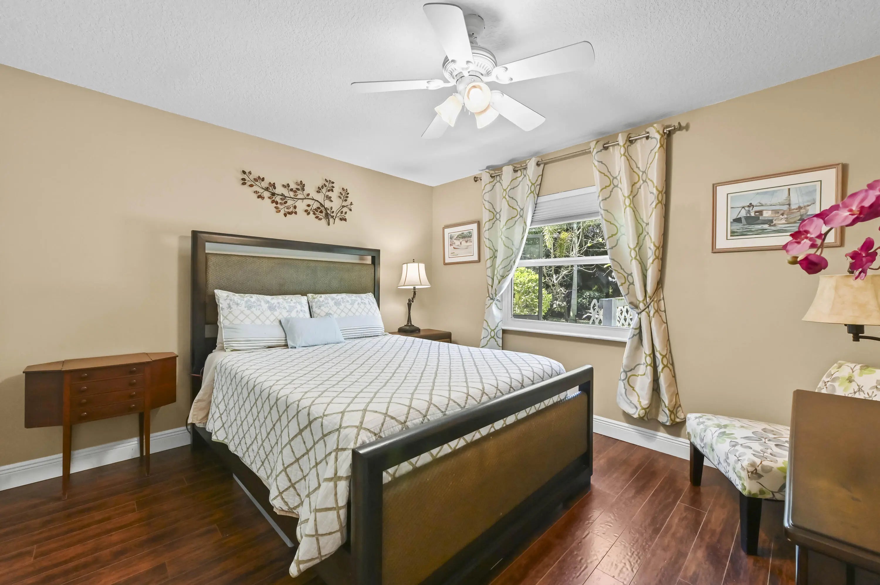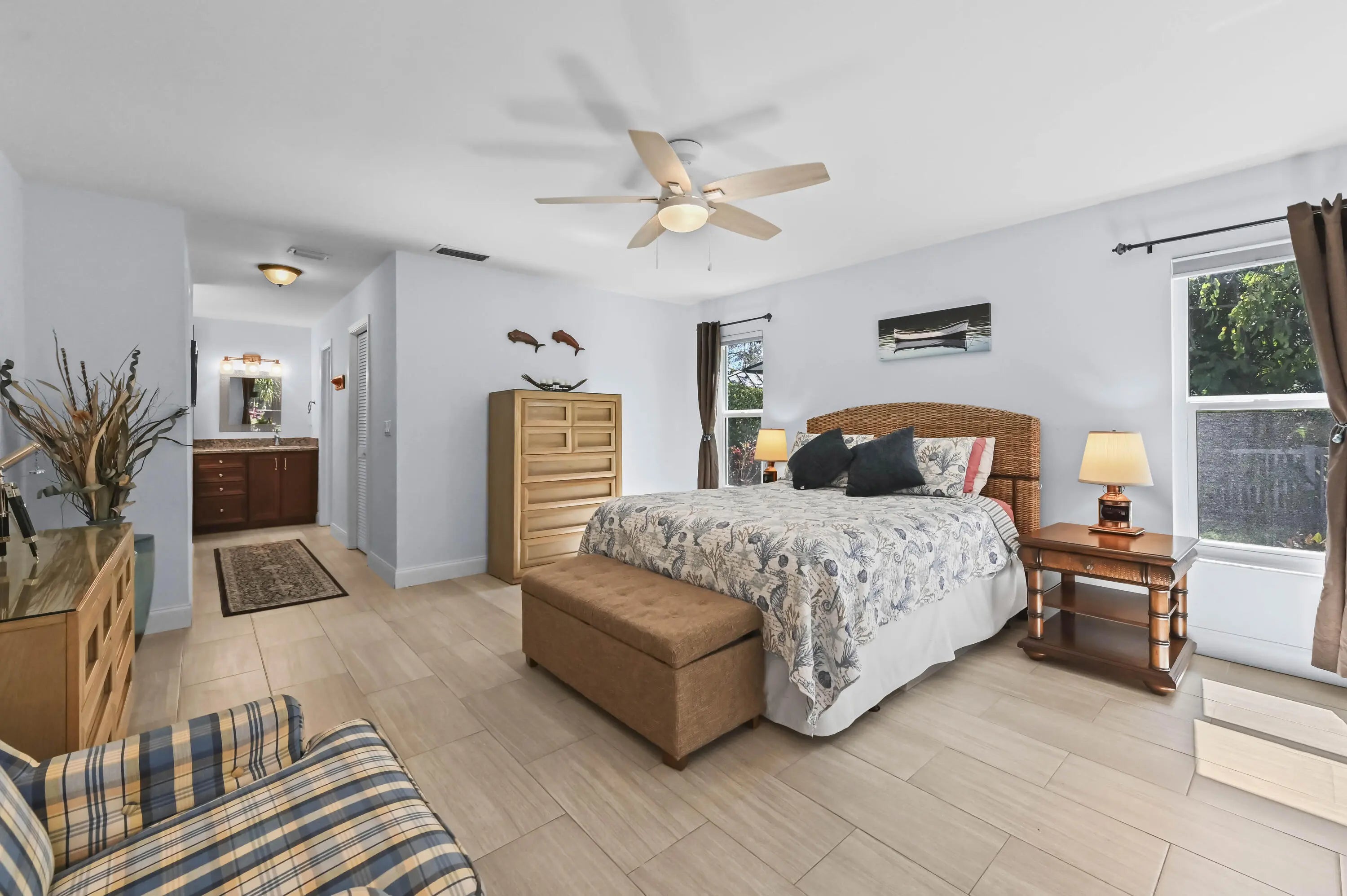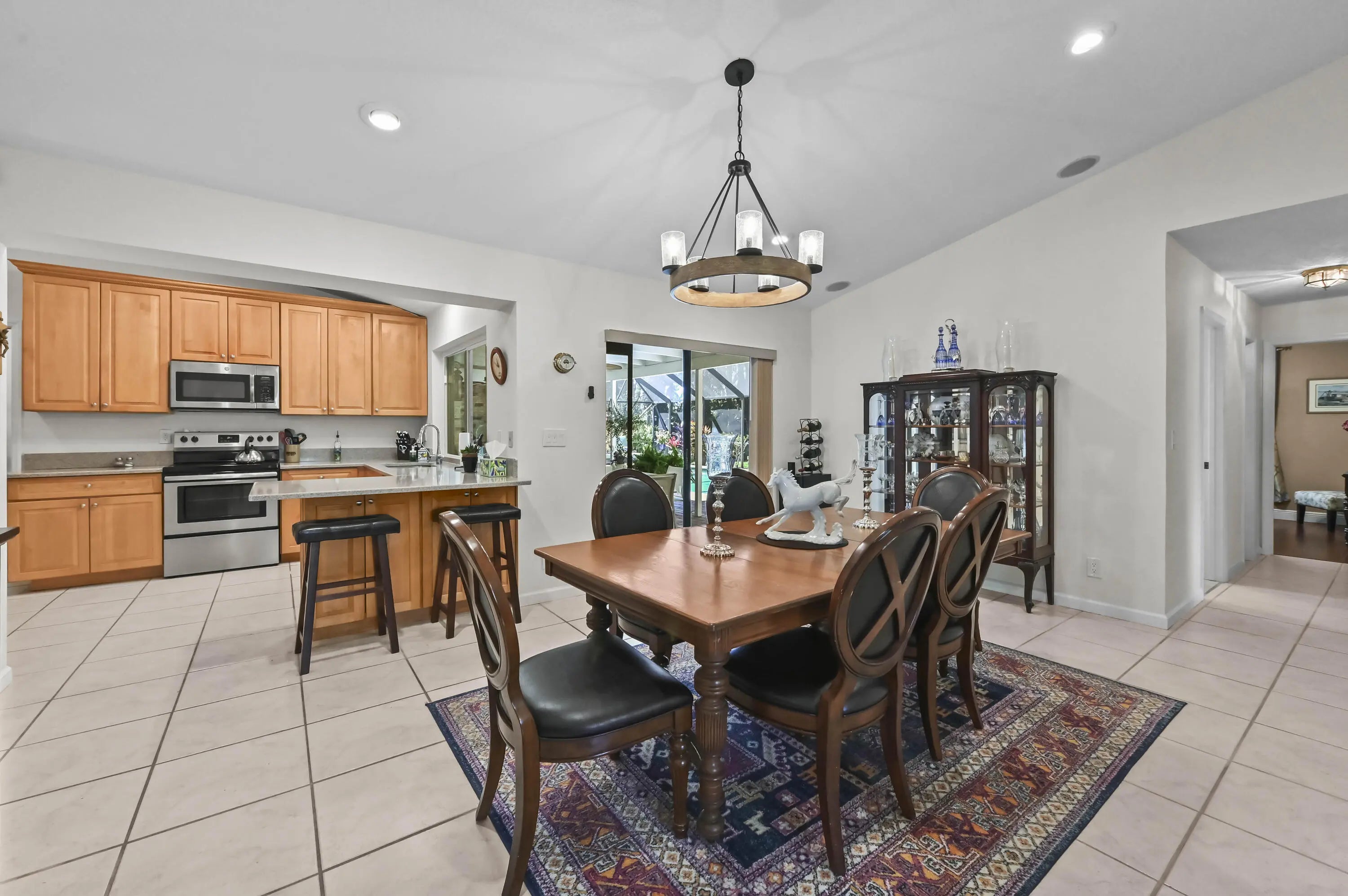 Nestled on a quiet cul-de-sac in the heart of Wellington, this charming retreat offers the perfect blend of privacy and luxury. The home greets you with a vibrant teal exterior and lush landscaping that sets the tone for the serenity found within. Step through the elegant double-glass doors into a light-filled interior featuring vaulted ceilings, a cozy stone fireplace, and a seamless floor plan. The spacious kitchen flows into a formal dining area and a sun-drenched breakfast nook, providing the ideal layout for both everyday living and sophisticated entertaining. The outdoor living space is a true Florida sanctuary, boasting an expansive screened-in lanai with a sparkling solar heated pool and a covered patio area perfect for "living like a captain." Beyond the pool enclosure, the .55 acre property extends into a massive, lushly wooded backyard filled with mature trees and tropical foliage, offering an unparalleled sense of seclusion and space. This backyard oasis is a rare find in Wellington, providing a peaceful escape for gardening enthusiasts or those simply looking to unwind in their own private forest. The master suite serves as a private spa-like haven, featuring a spacious walk-in closet and a sleek shower with designer tiling, and a modern dual-sink vanity. This home has been meticulously maintained and thoughtfully upgraded with several recent high-value improvements. Enjoy modern luxury in the fully renovated master bathroom (2024) and the efficiency of a brand-new solar water heater (2024) and solar pool heater. Peace of mind comes standard with seven recently upgraded hurricane-impact windows (2025) and a state-of-the-art pool pump with integrated controls (2025). This move-in-ready gem offers the ultimate Wellington lifestyle--combining modern comforts with the timeless beauty of Florida's natural landscape.