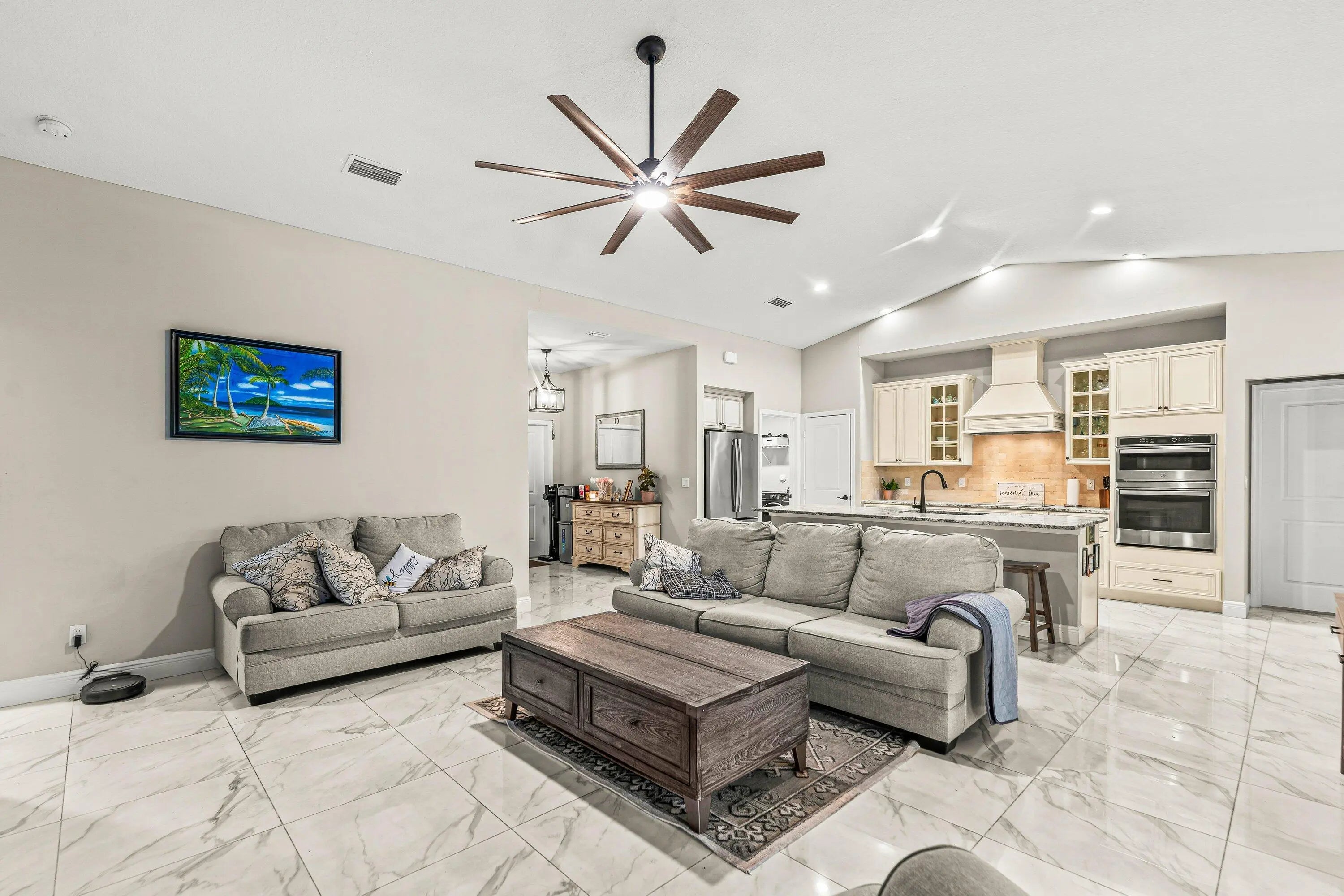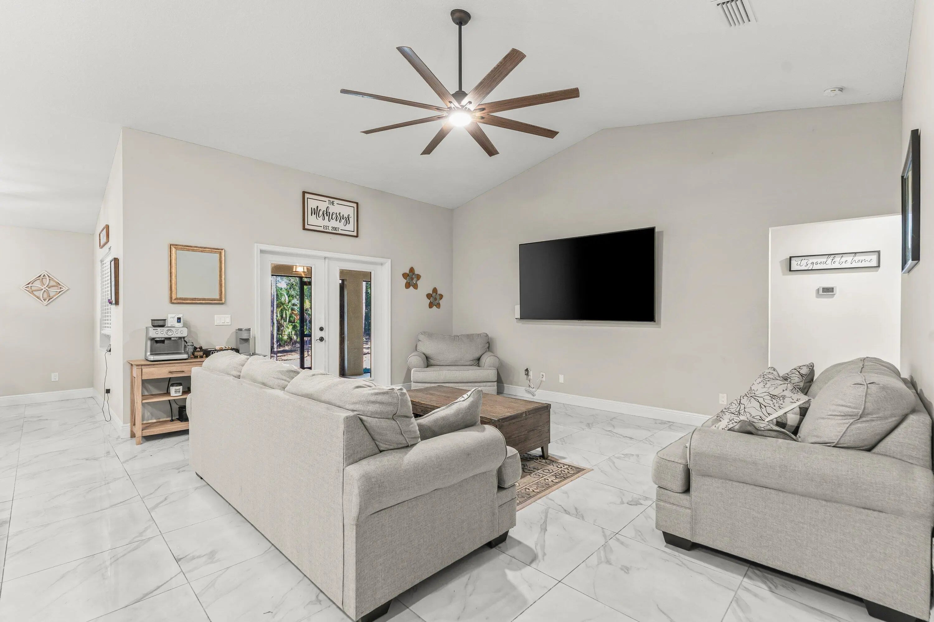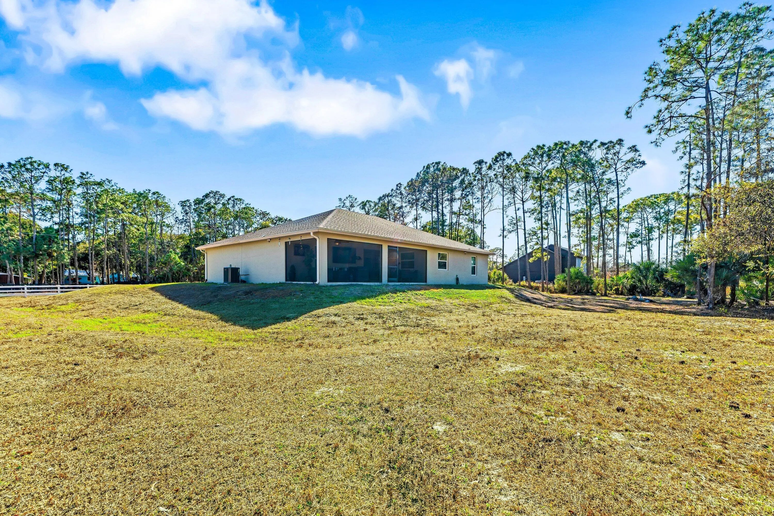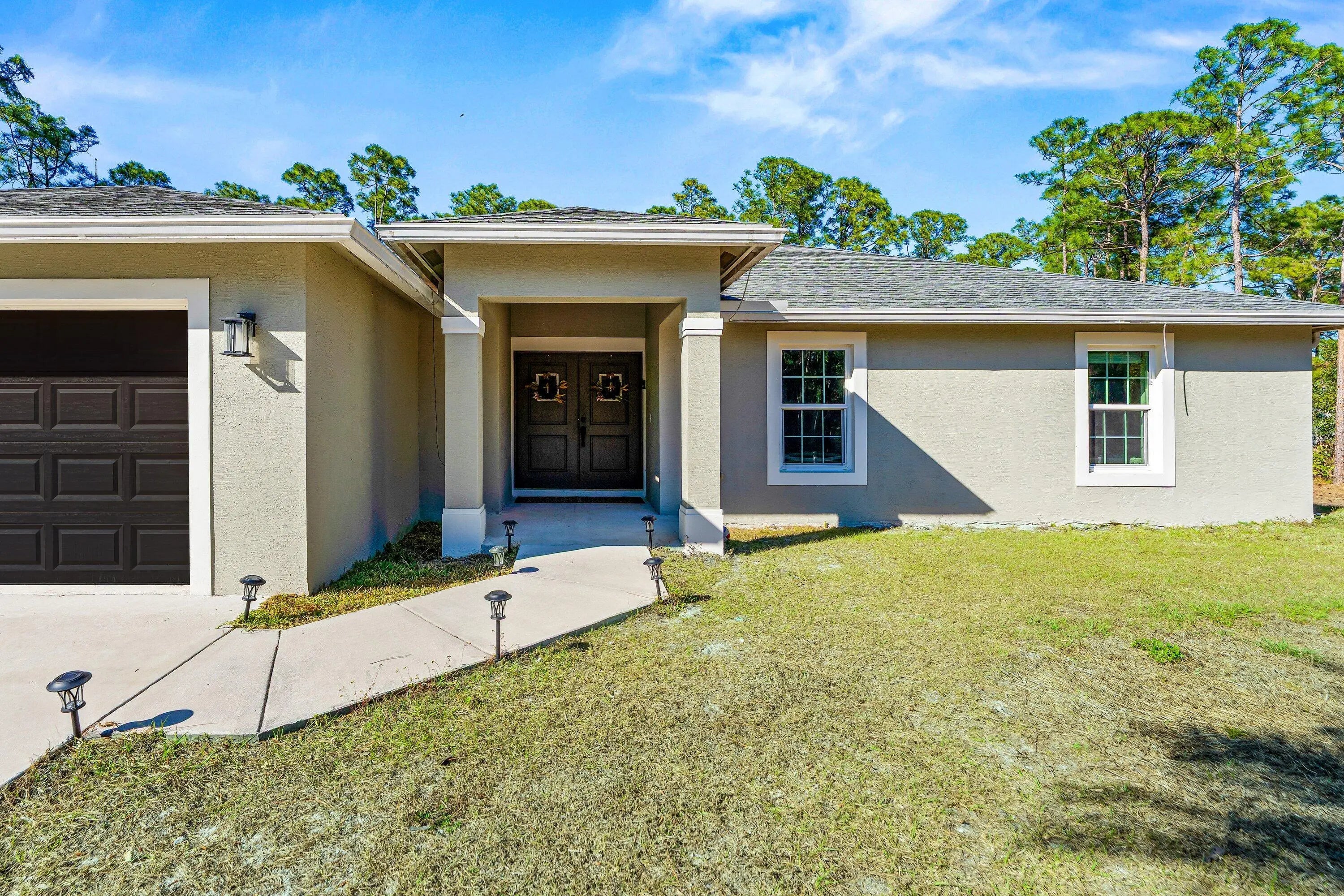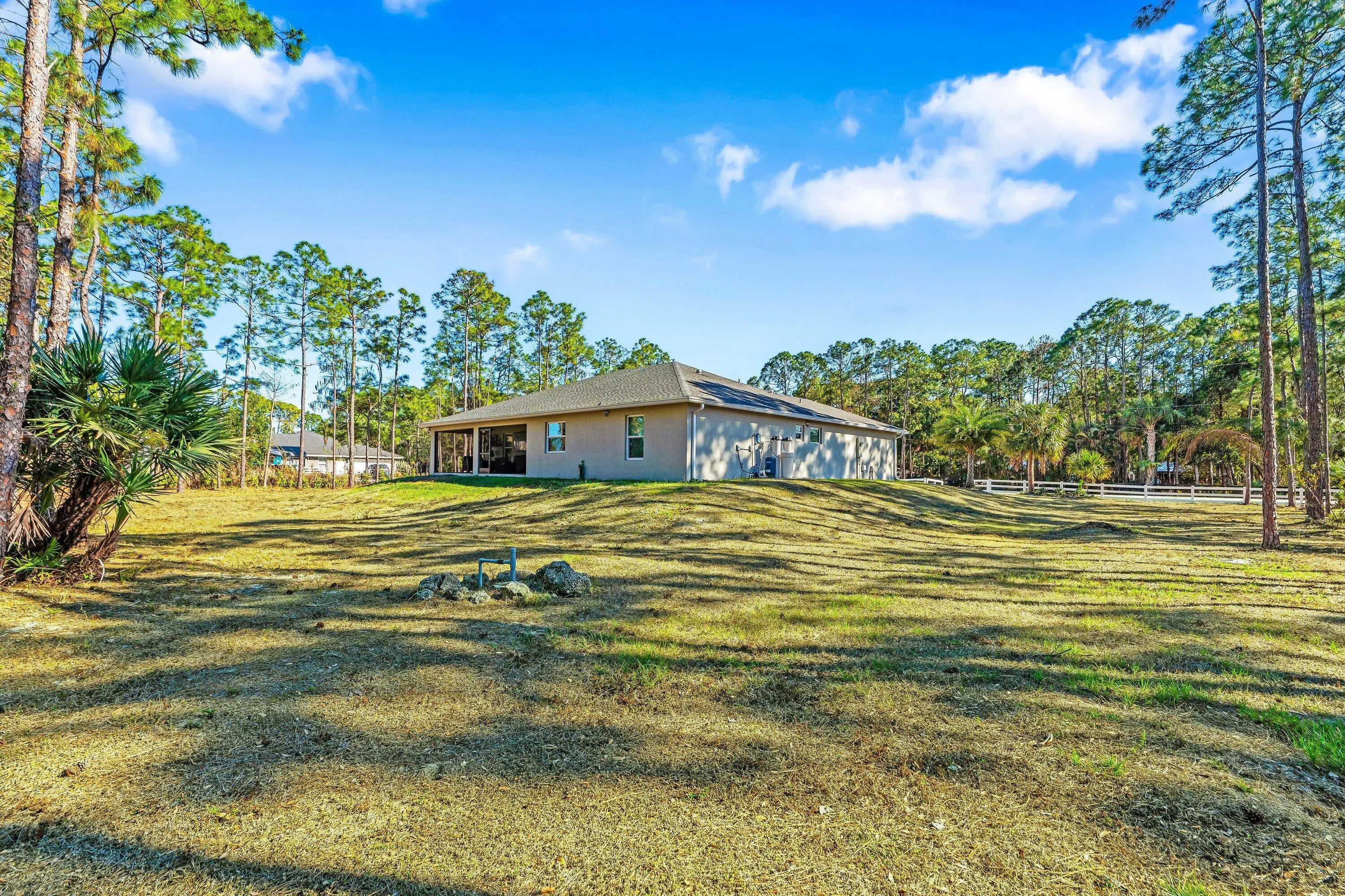 Welcome to this exceptional 2022-constructed CBS single-story home, beautifully positioned on an elevated 1.14-acre lot in The Acreage. Offering 4 bedrooms and 2 full baths in a desirable split-bedroom layout, this residence combines modern construction with over $25,000 in thoughtful builder upgrades. The open floor plan is enhanced by vaulted ceilings, abundant natural light, impact windows and doors, and upgraded Level 2 24x24 tile flooring throughout -- including bedrooms in lieu of carpet. Underground electric service adds both aesthetic appeal and reliability. The gourmet kitchen was extensively upgraded and features premium cabinetry (42'' uppers), glass cabinet accents, a custom cabinet layout with built-in wine cooler accommodation, Level III White Spring granite countertops, Mediterranean Ivory tumbled backsplash extending to the upper cabinets, upgraded GE wall oven/microwave combo, 30" cooktop with Broan hood vent, and a spacious center island ideal for entertaining. Designer details continue throughout the home with brushed aluminum interior trim, upgraded hardware and door handles, black plumbing fixtures and accessories, and elevated tile selections including a Level 3 listello accent in the master bath. The spacious owner's suite offers a large walk-in closet and a beautifully appointed bath featuring dual sinks, soaking tub, and separate shower with upgraded fixtures. Additional features include a whole-home water filtration system and a two-car garage. The Acreage is known for its expansive acre-plus lots, convenient access to Downtown West Palm Beach, Westlake, Palm Beach Gardens shopping, and Palm Beach International Airport -- and best of all, no HOA restrictions. Bring your pets, RV, boat, trailer, and all your toys.