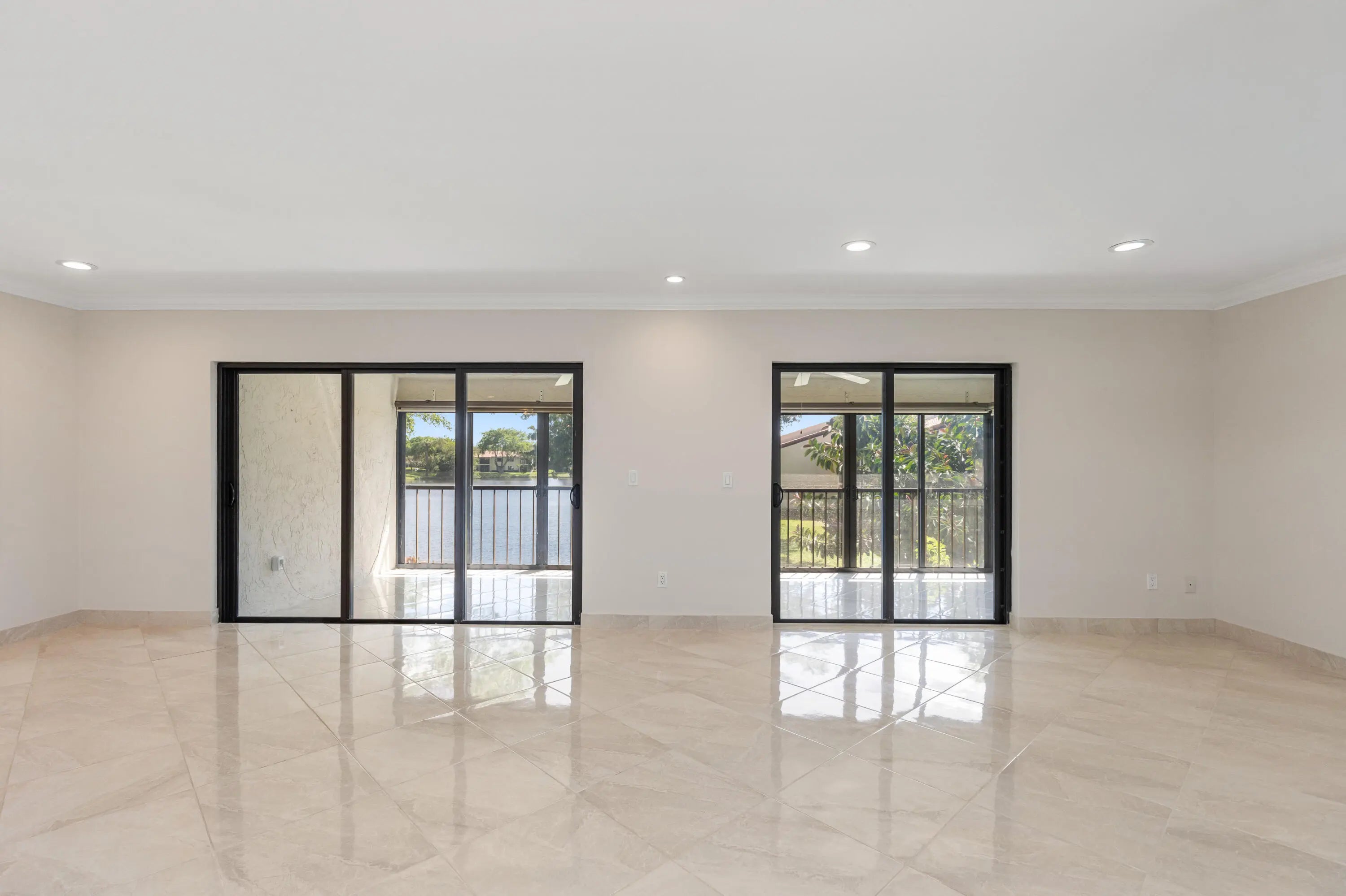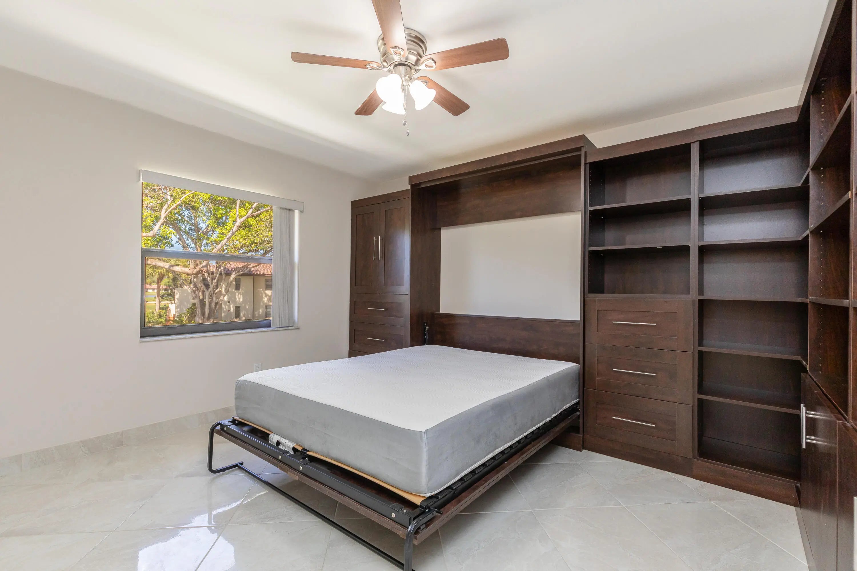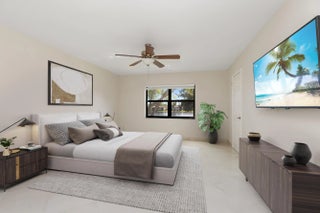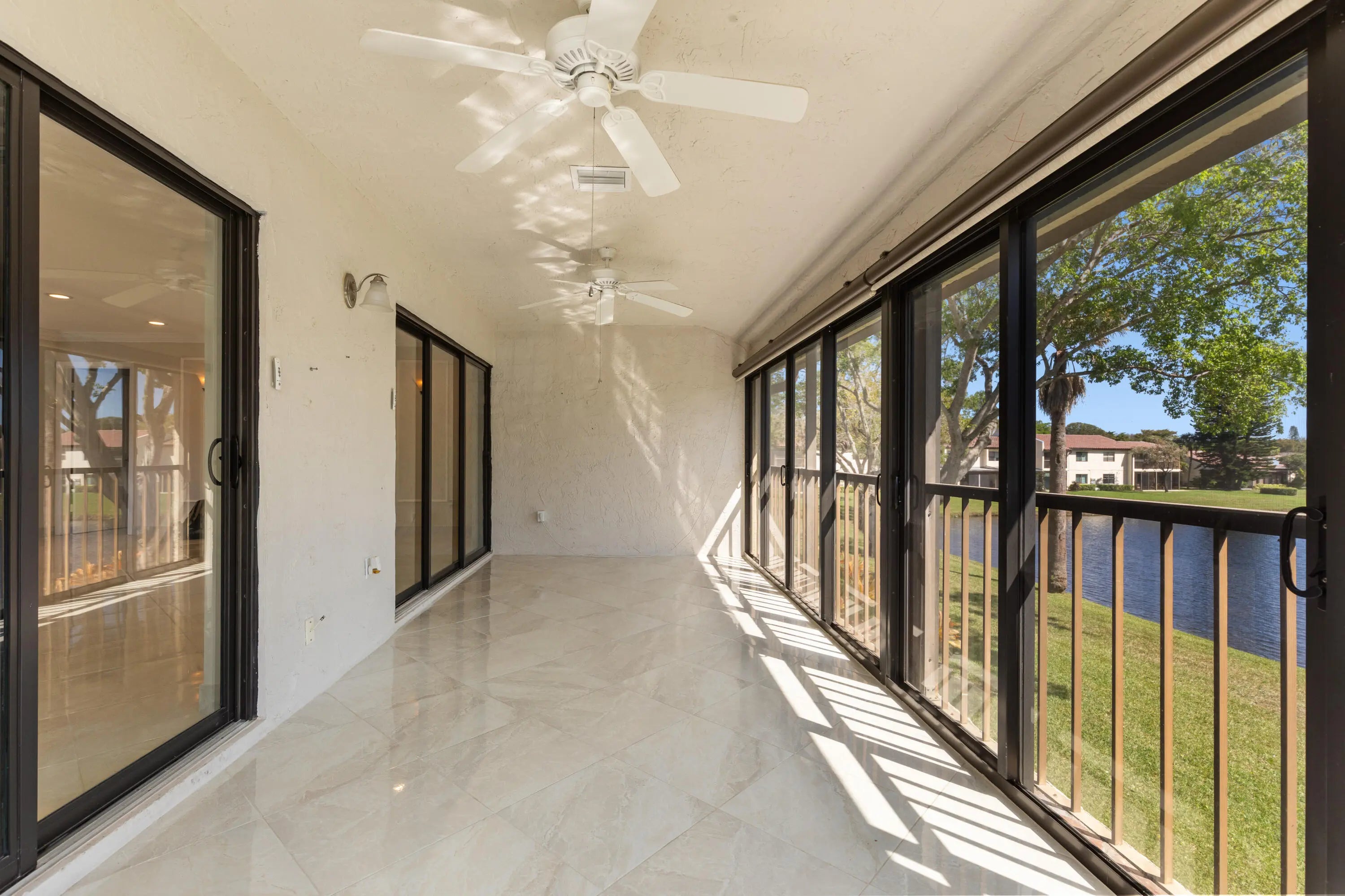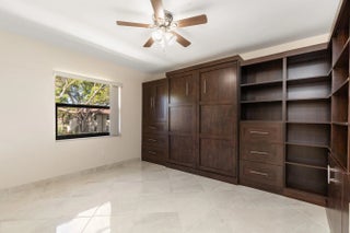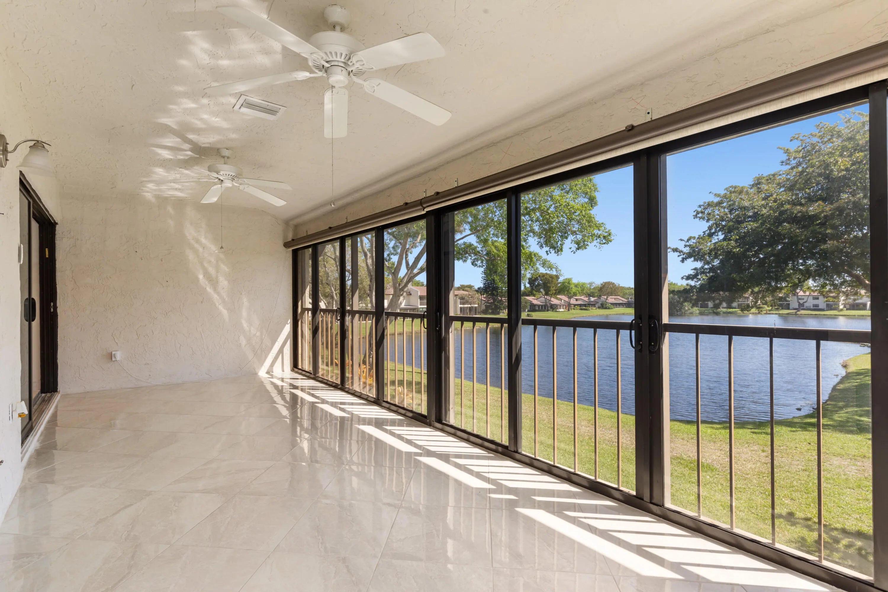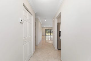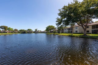 Corner Unit with Private Entrance & Serene Lake Views. This exceptional corner unit, move in ready, is in a desirable community and offers a private entrance and staircase, providing enhanced privacy. Shared storage under stairs with unit K. The spacious 2 bedrooms plus den layout has been thoughtfully redesigned--the den wall was removed to create a significantly larger living area and can easily be restored if desired. The entire unit has been newly painted and features elegant porcelain tiles flooring throughout. NO POPCORN. Additional highlights include LED recessed lighting, a CENTRAL VACUUM system, TANKLESS WATER HEATER and ALL WINDOWS and SLIDING DOORS are IMPACT GLASS. Balcony with AC, electric shadow blinds. AC 2022; Roof 2023. Custom made queen Murphy bed & bookcase in 2nd room.