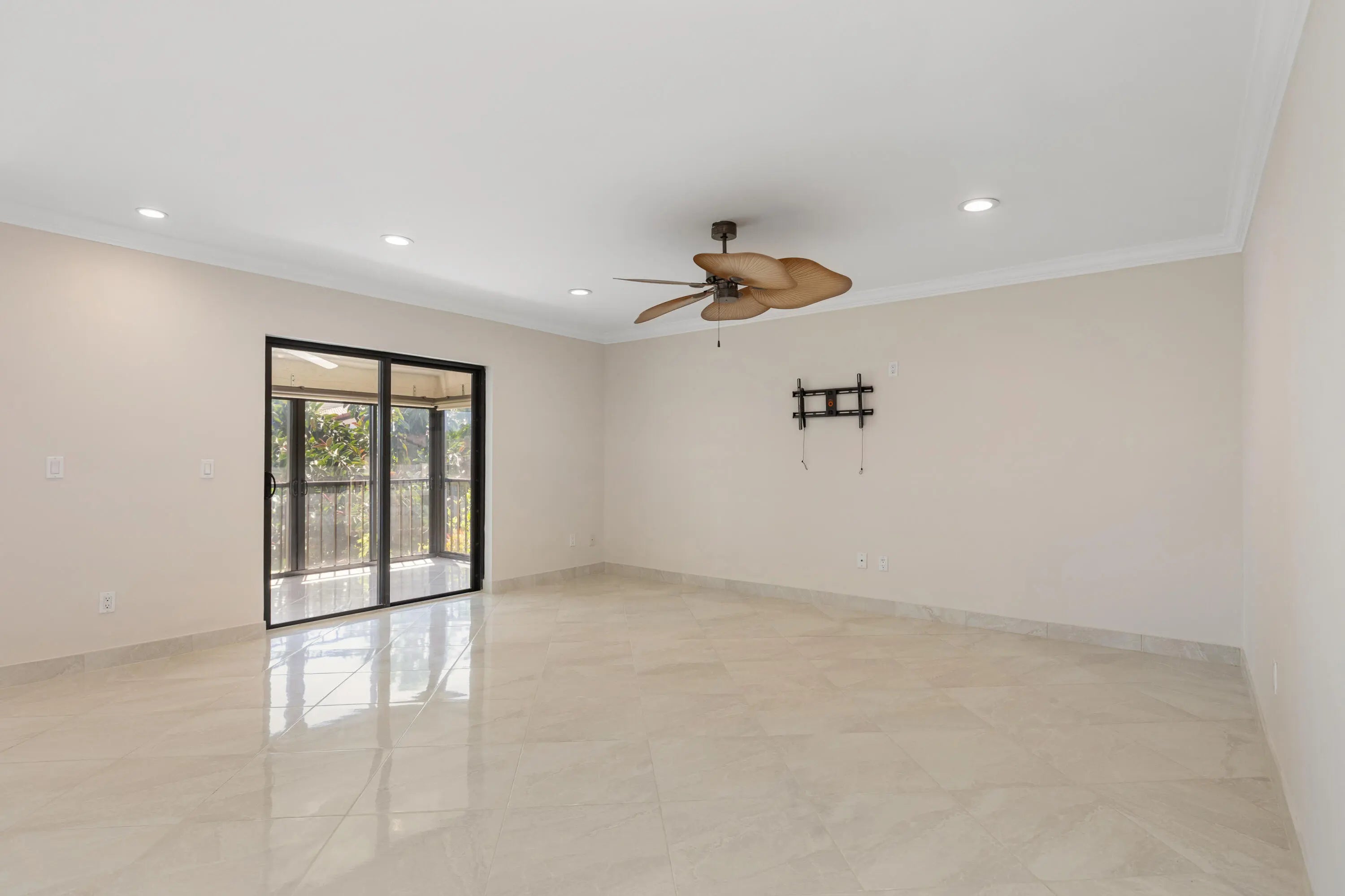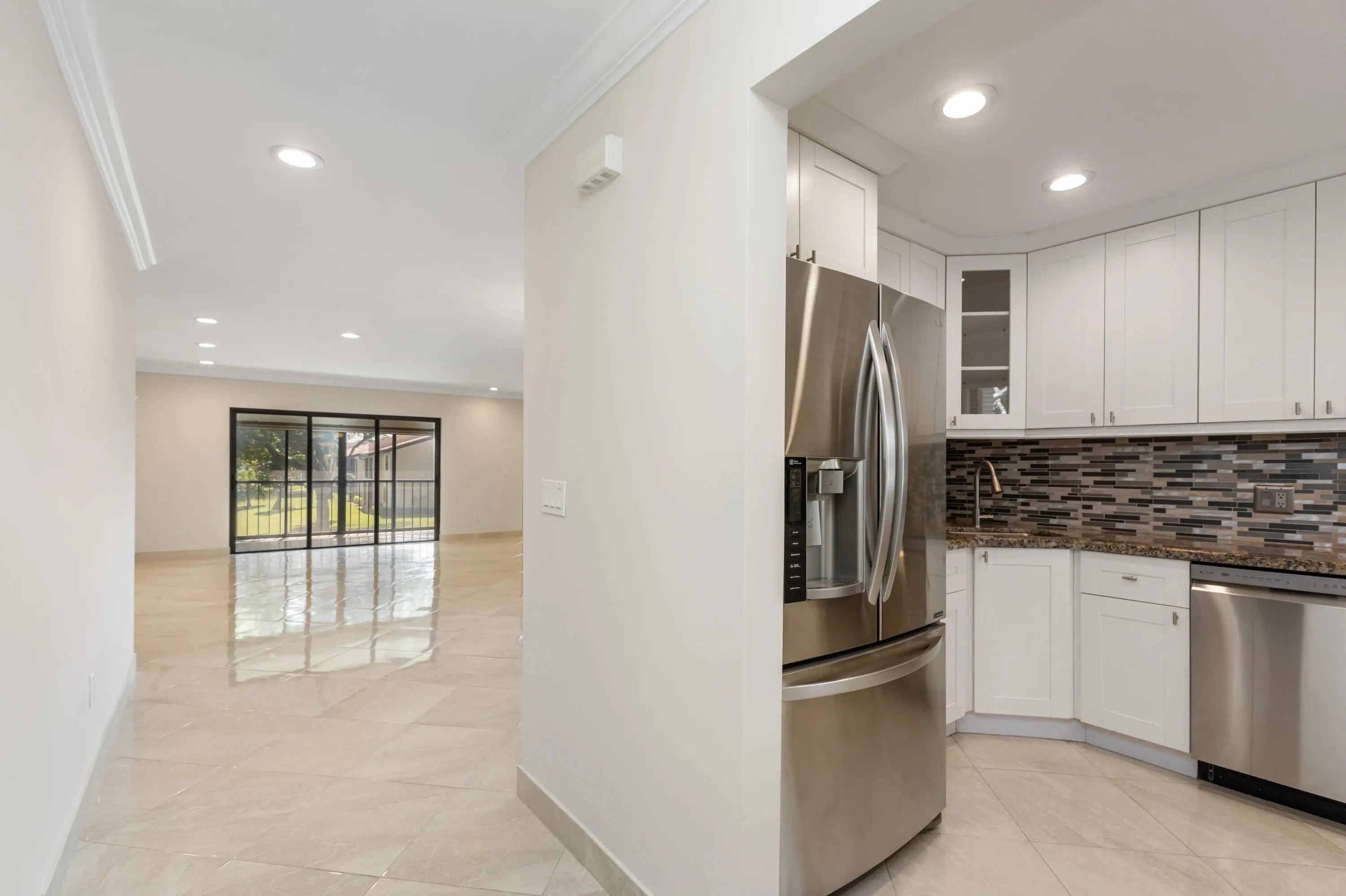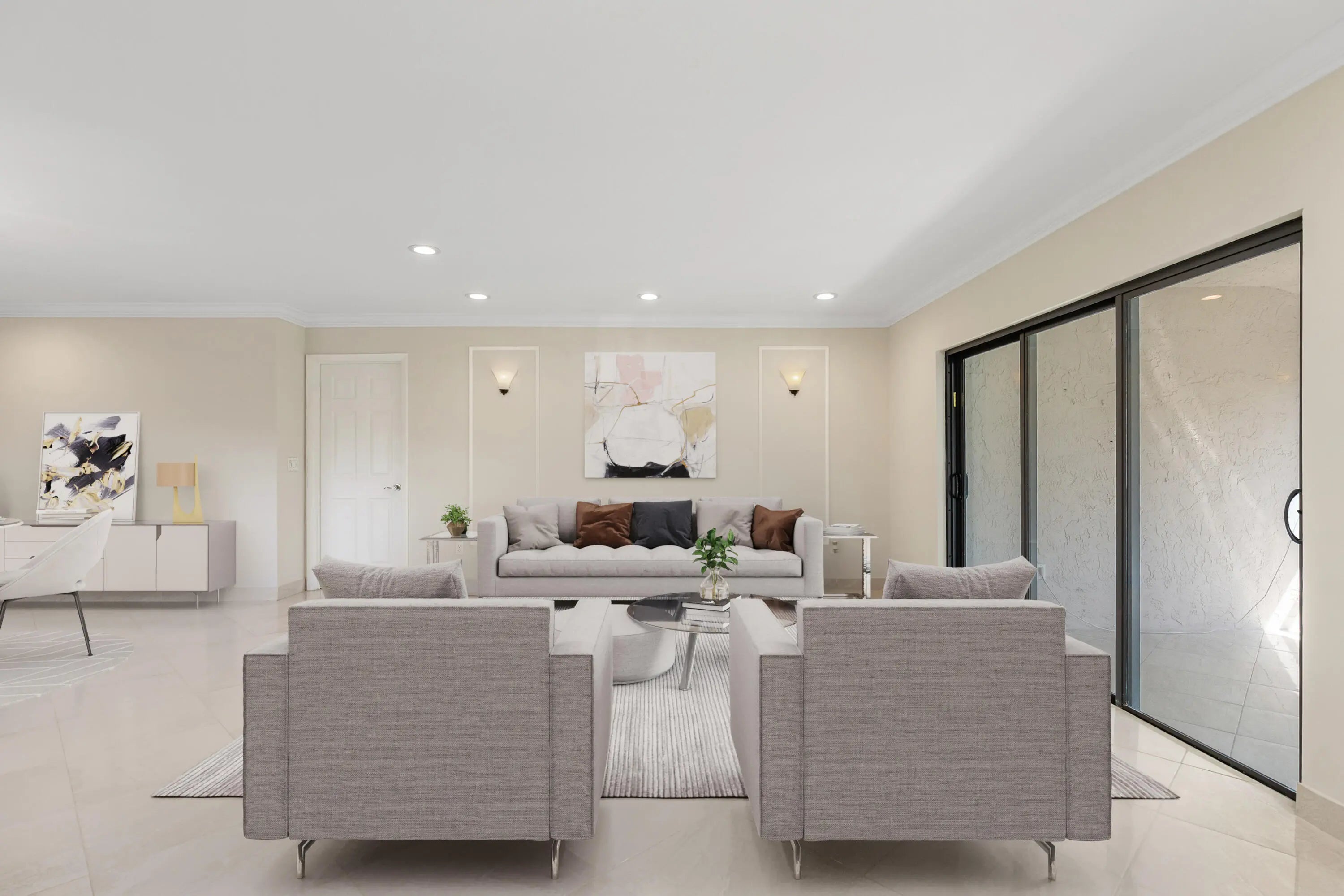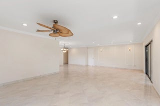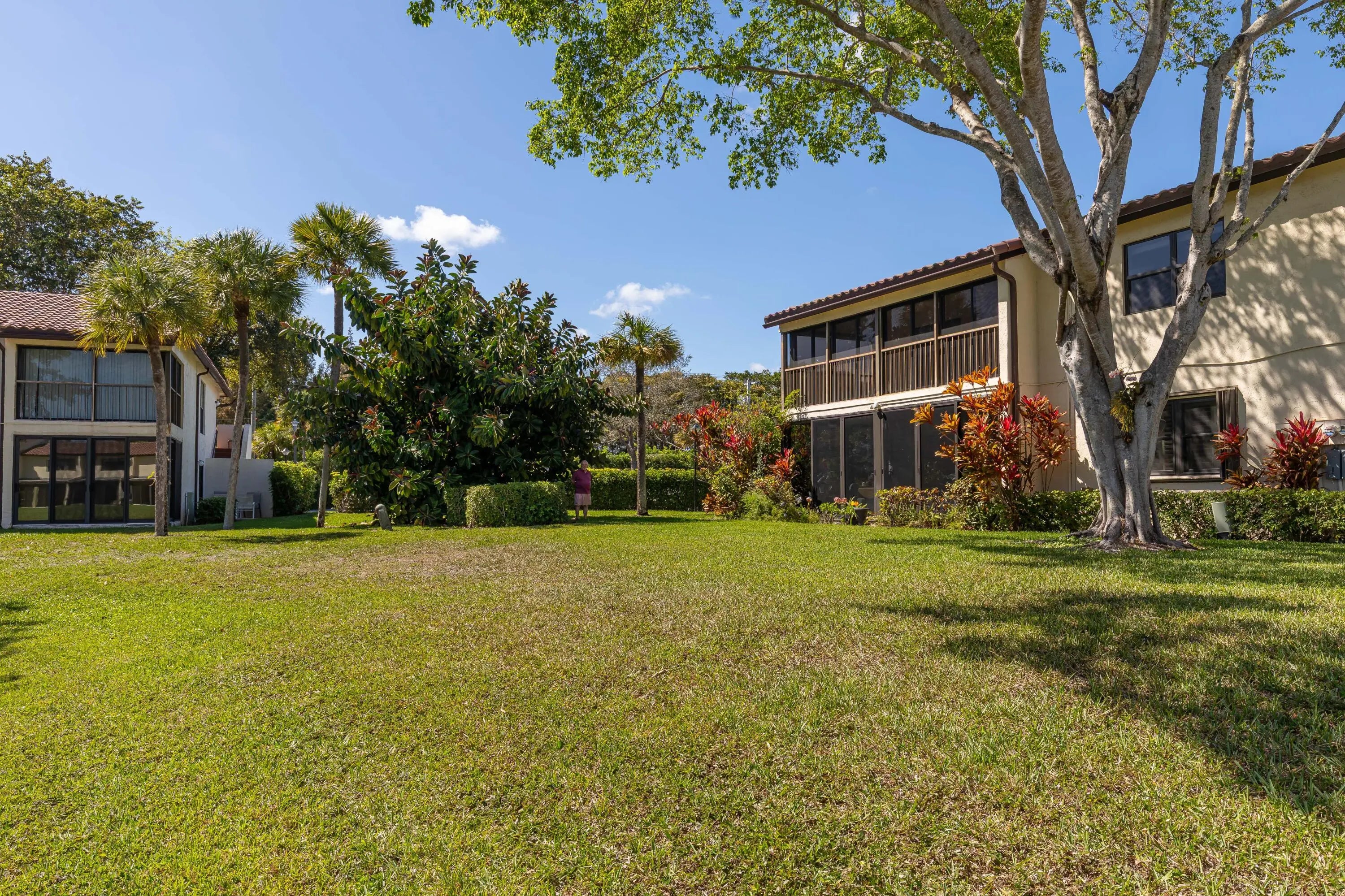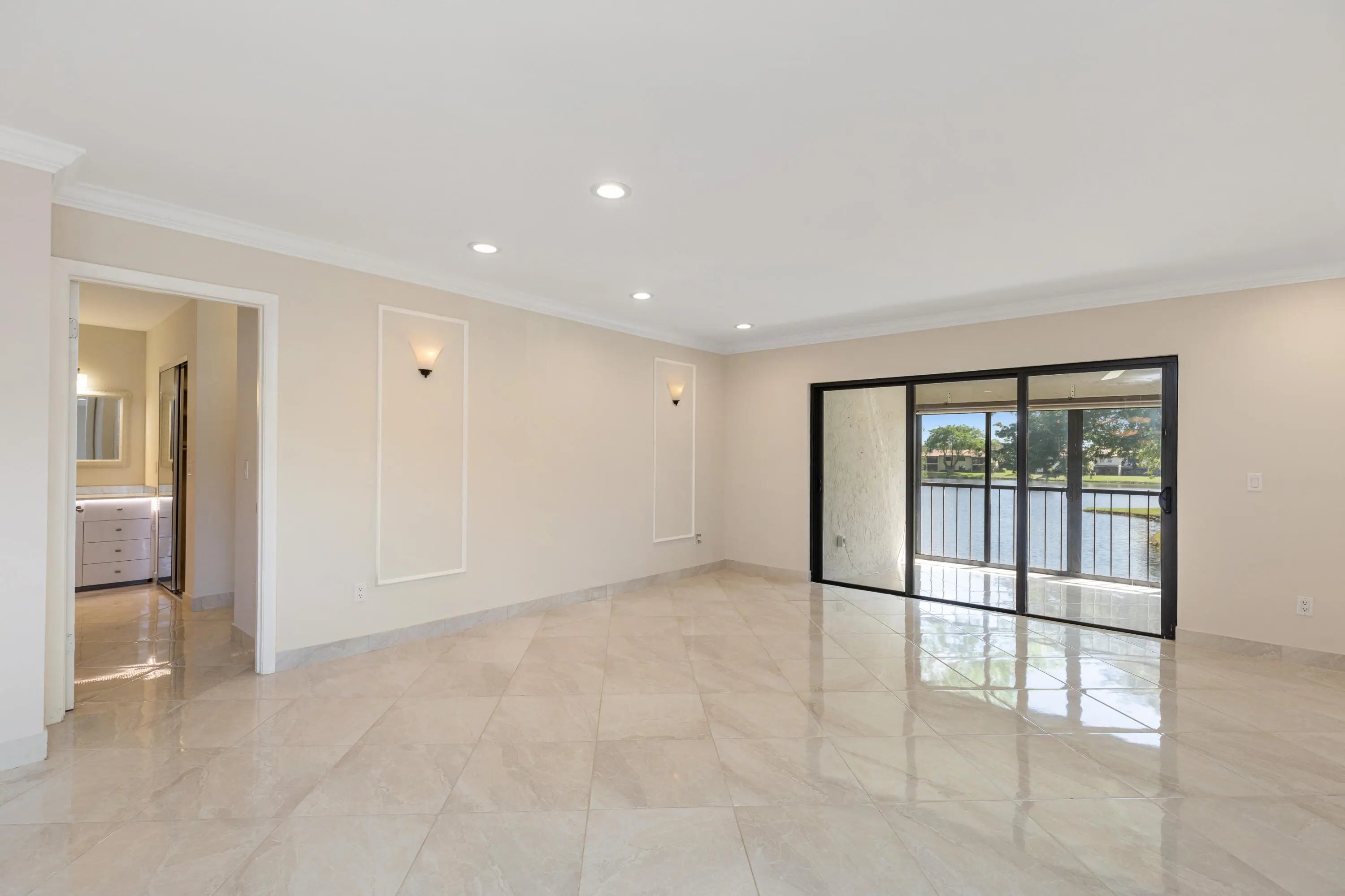 Corner Unit with Private Entrance & Serene Lake Views. This exceptional corner unit, move in ready, is in a desirable community and offers a private entrance and staircase, providing enhanced privacy. Shared storage under stairs with unit K. The spacious 2 bedrooms plus den layout has been thoughtfully redesigned--the den wall was removed to create a significantly larger living area and can easily be restored if desired. The entire unit has been newly painted and features elegant porcelain tiles flooring throughout. NO POPCORN. Additional highlights include LED recessed lighting, a CENTRAL VACUUM system, TANKLESS WATER HEATER and ALL WINDOWS and SLIDING DOORS are IMPACT GLASS. Balcony with AC, electric shadow blinds. AC 2022; Roof 2023. Custom made queen Murphy bed & bookcase in 2nd room.