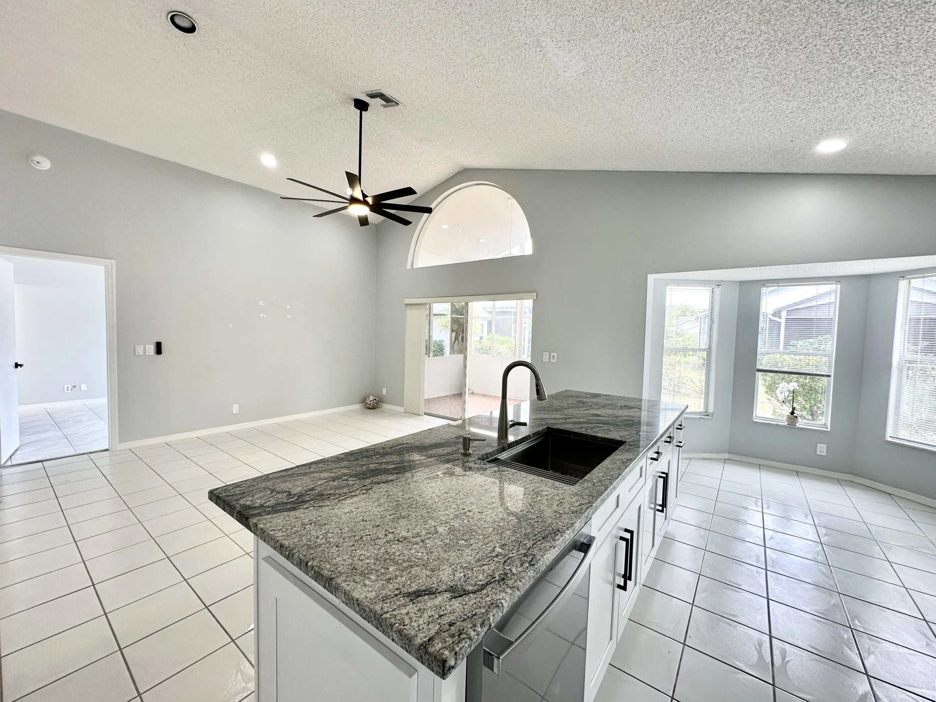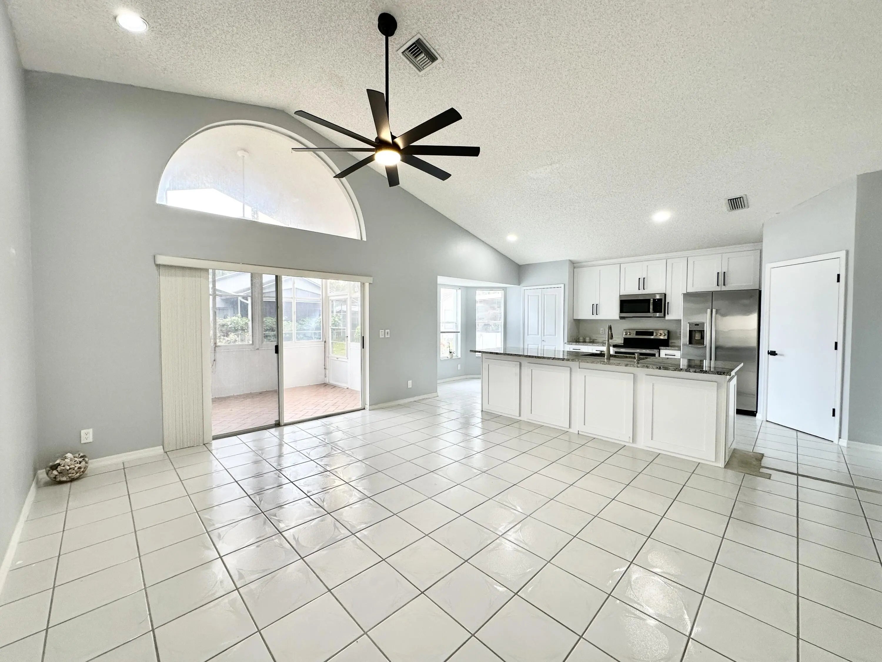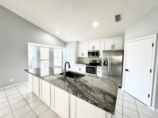 Single Family Home in River Bridge; a Guard Gated Community with all the Amenities you could hope for and a LOW HOA Fee: Clubhouse, Pool, Spa, Tennis, Basketball, Playground, and Sidewalks lined with Mature Oak Trees. This 3/2 home(used as a 2/2 plus Den) has an amazing Kitchen Remodel, including White Wood Soft Close Cabinets, 42'' Uppers, Stainless Steel Appliances and Granite Tops with Large Island, completed in late 2023, along with Interior Paint, New Ceiling Fans and New Door Hardware throughout. The home has Vaulted Ceilings, Tile Throughout, Recessed Lighting, an Enclosed Sun Room and a 2 Car Garage. Pets Welcome.