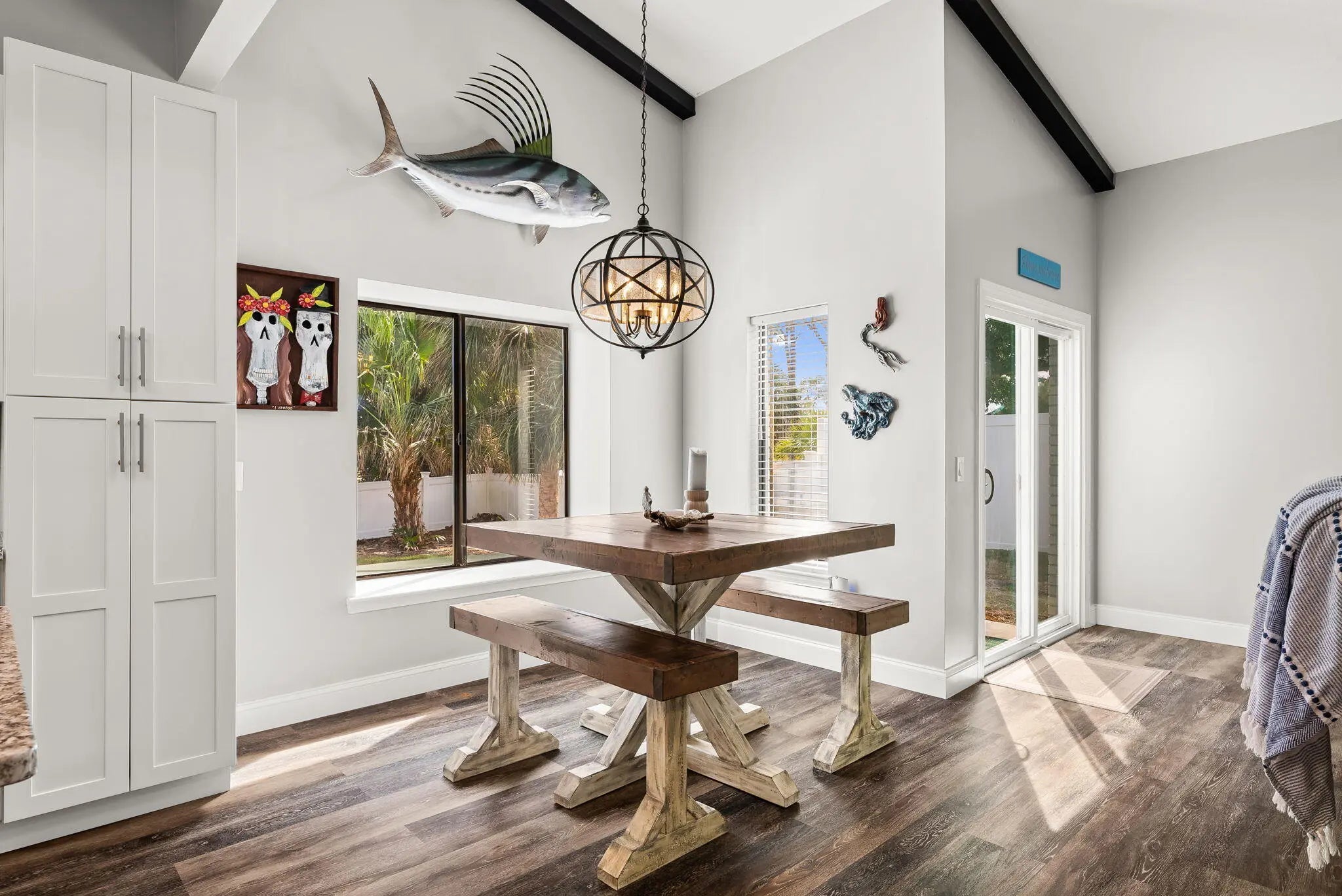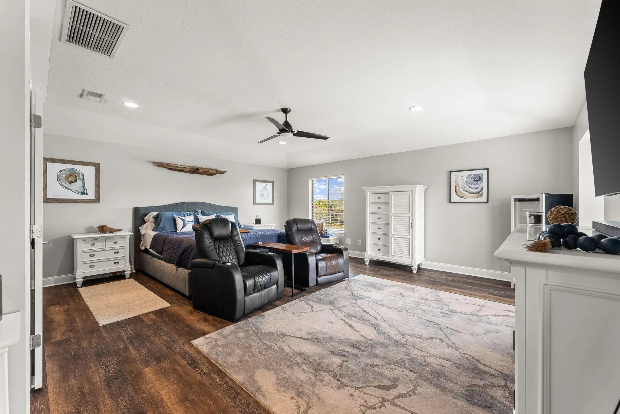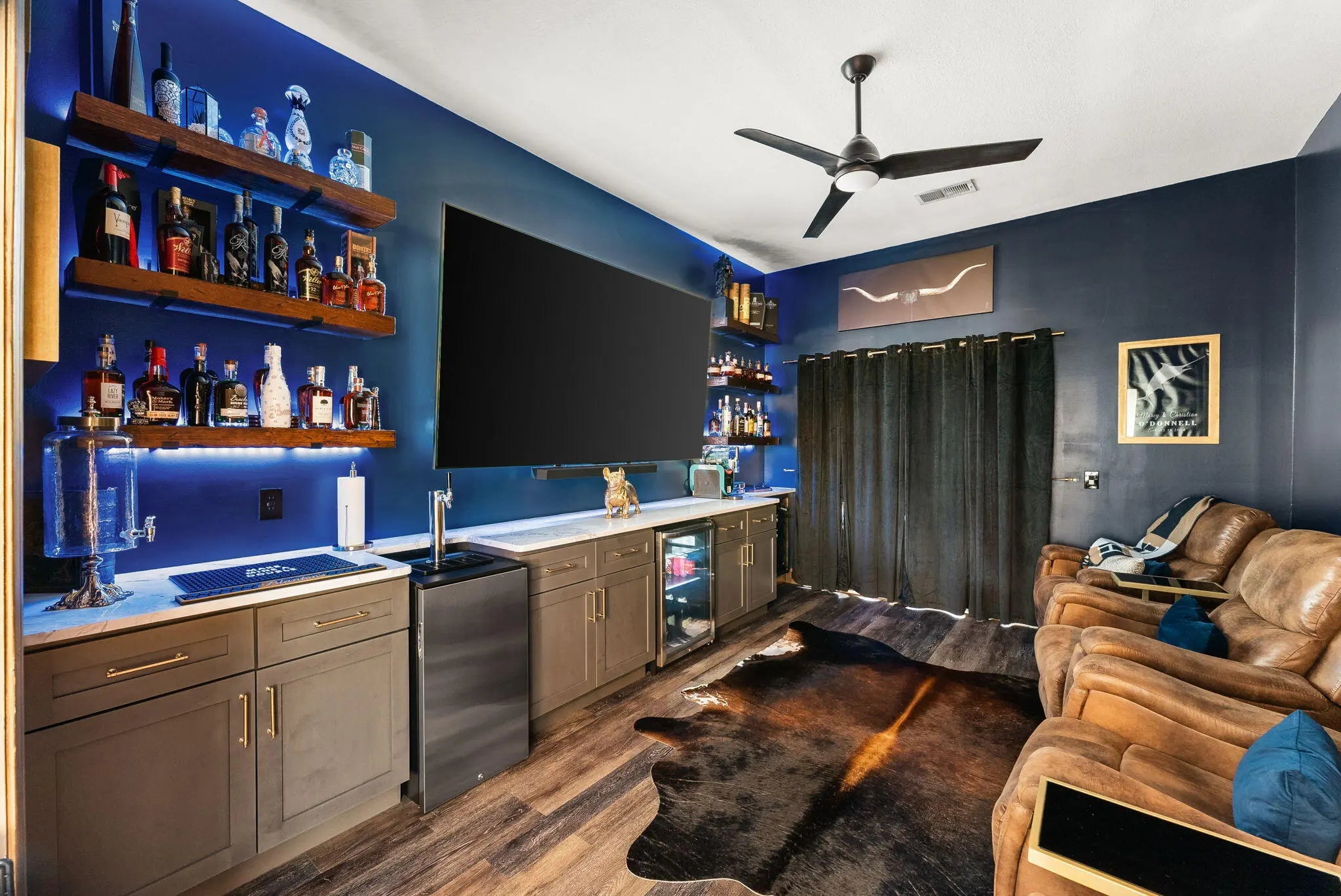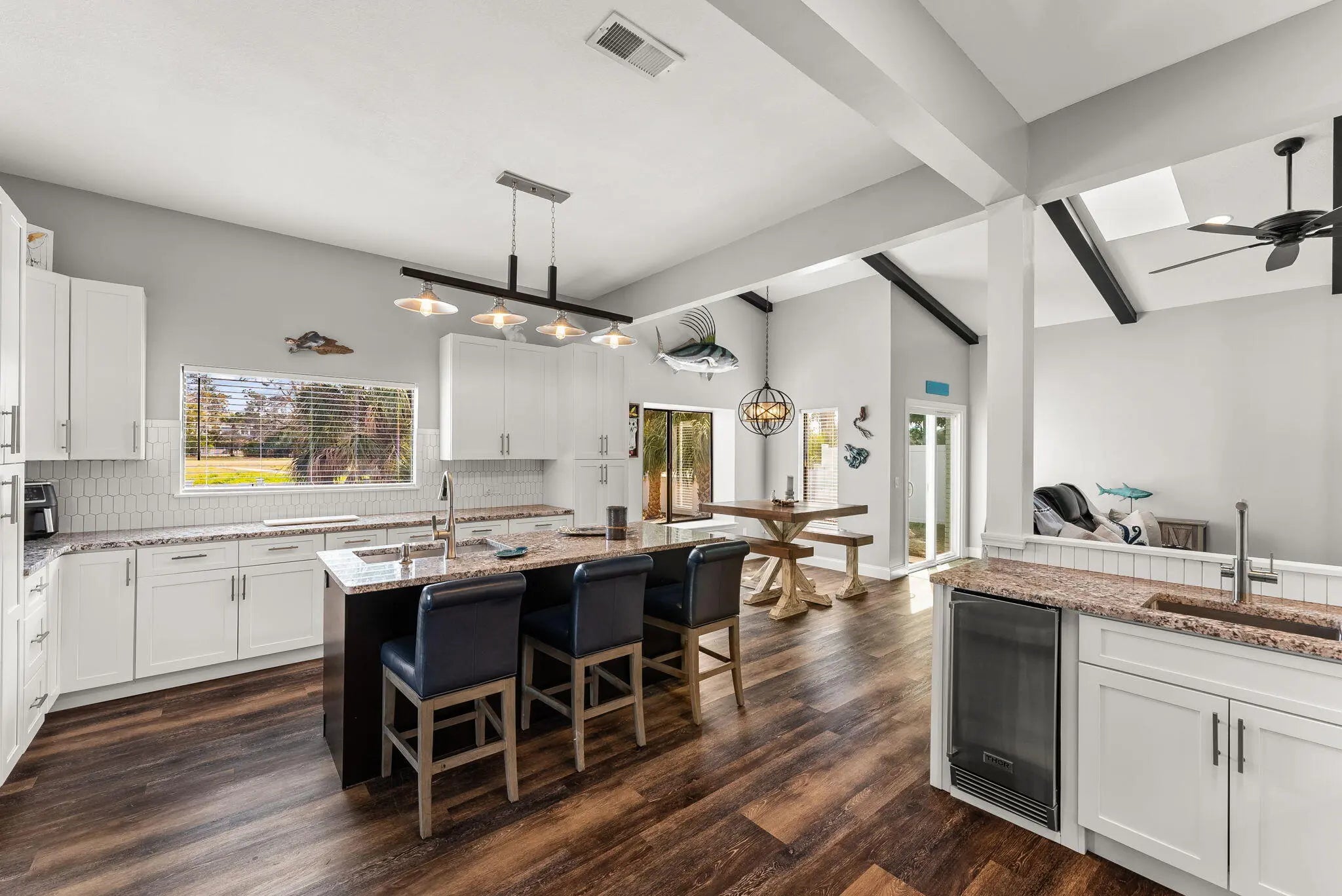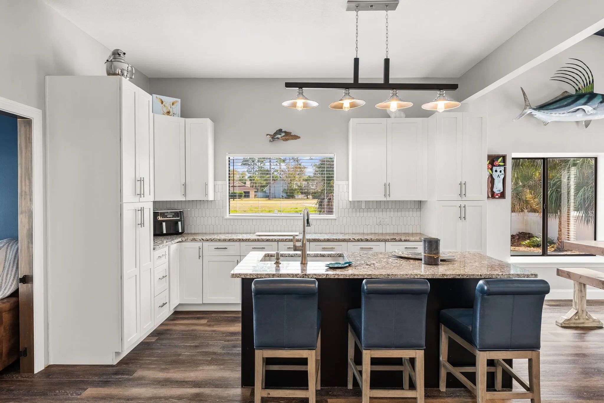 Located within the gated golf and marina community of Bay Point, this fully remodeled 4-bedroom, 3-bath residence offers 2,913 square feet designed for elevated coastal living and exceptional entertaining. Renovated top-to-bottom in 2019--including roof, electrical, lighting, appliances, two water heaters, and dual HVAC systems--the home blends modern infrastructure with curated coastal style. Brand-new custom closet systems throughout, upgraded kitchen cabinetry with convenient pull-out storage, added recessed lighting with strategically placed dimmers, new garage door opener and thoughtful design details reflect meticulous care. The kitchen also features a brand-new ice maker that conveys, along with a premium faucet offering a built-in seltzer dispenser, available with an acceptable offer. The flexible layout includes a private first-floor primary suite and an expansive upstairs retreat with a spa-inspired bath and private balcony, creating a true owner's sanctuary. A mezzanine bonus level offers ideal space for an office, lounge, or flex area. Designed to host, the former dining room has been transformed into a striking Bourbon Lounge and Sports Theater, complete with custom shelving, LED accent lighting, kegerator, beverage refrigeration, and double doors opening to a newly completed 1,140 sq ft bi-level paver patio. The patio is thoughtfully prepped for a future outdoor kitchen with reinforced stone underlayment and utility conduits beneath the pavers--built for game days, gatherings, and coastal evenings alike. Additional highlights include brand-new vinyl fencing with multiple gated access points (including an oversized entry), custom garage storage, irrigation, and motion lighting. Select features--including bourbon lounge equipment, gym equipment, beverage appliances, Ring cameras (3) and additional refrigerators--may convey with an acceptable offer. Bay Point offers gated security, championship golf, marina access, and one of Panama City Beach's most established residential environments. Opportunities with this level of renovation and entertaining infrastructure in Bay Point are increasingly rare.