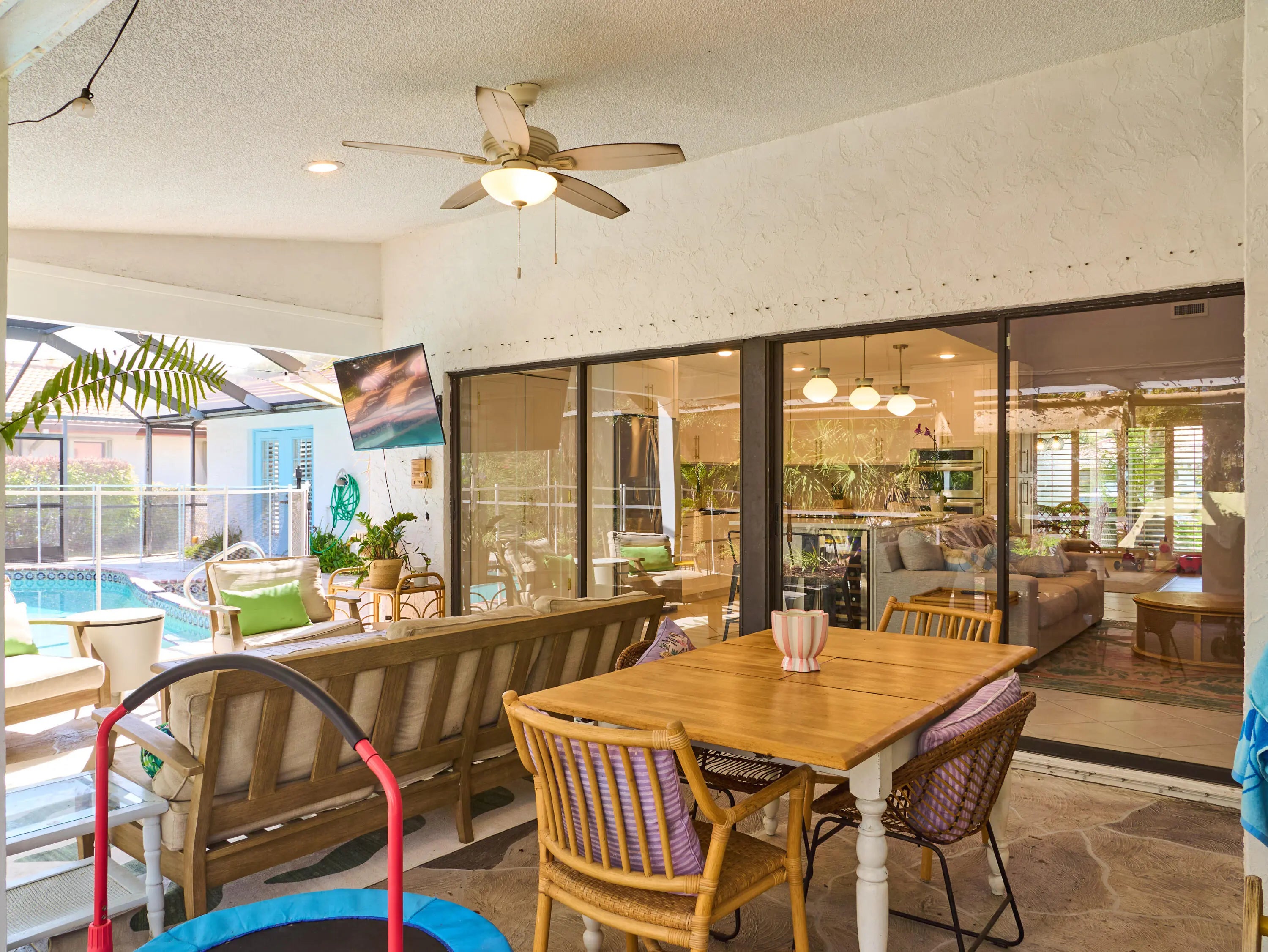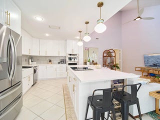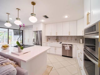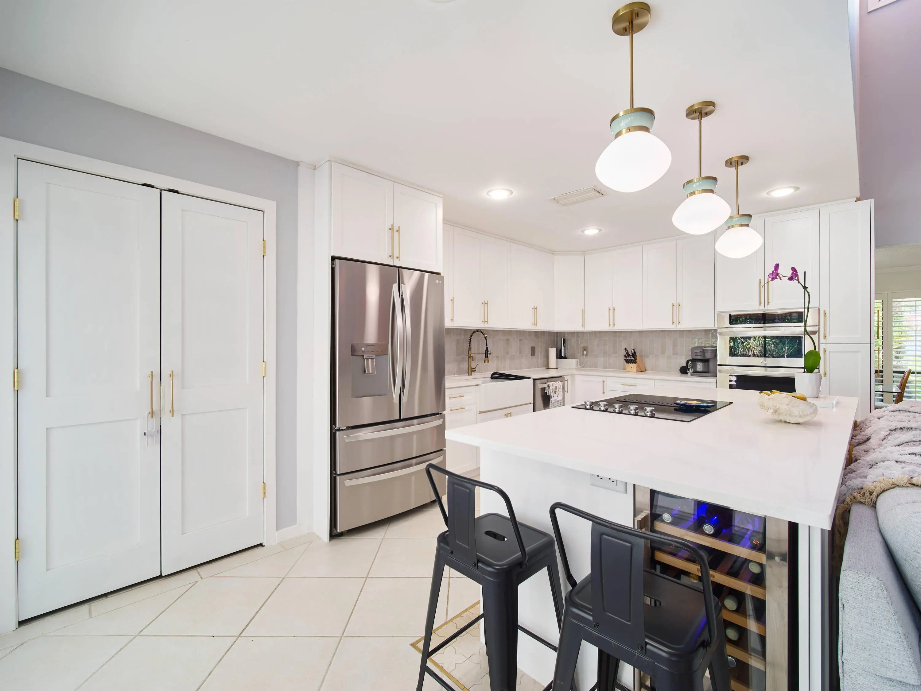 Beautifully reimagined residence showcasing a stunning 2024 designer kitchen with quartz countertops, illuminated white cabinetry, matte gold hardware, Bedrosian tile backsplash, porcelain farmhouse sink, artistic tile island detail, wine fridge, soft-close doors and drawers, and new appliances (2024-2025). Interior highlights include new lighting in the kitchen and dining areas, plantation shutters throughout, updated guest bath cabinetry, custom built-ins in the utility room, and a luxurious primary bath with quartz counters, soaking tub, and custom closet systems offering abundant storage. Outdoor living shines with a stamped concrete pool deck, driveway and walkway, refreshed outdoor wet bar complete with a quartz counter and copper sink (2023), electric heated pool (2021) and spa. Additional updates include new AC (2024), washer/dryer (2025), fresh exterior paint (2024), new gutters (2025), tankless hot water heater, and re-screened enclosure (2025). There is also a generator hook up.