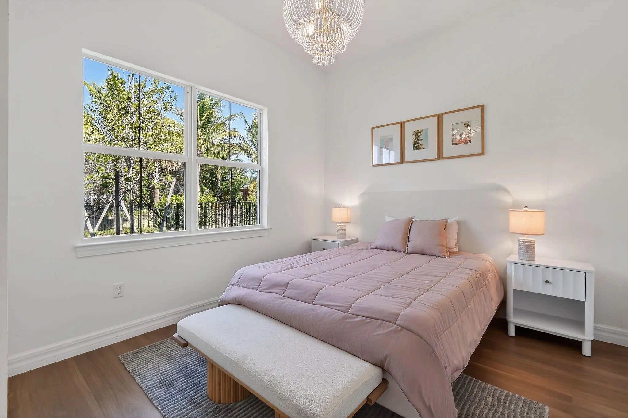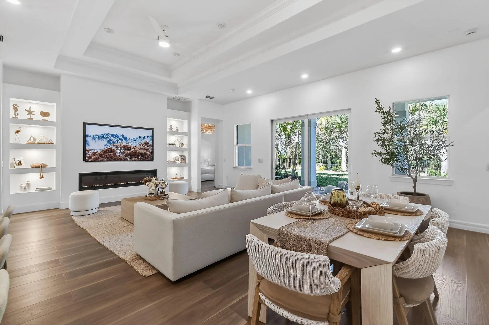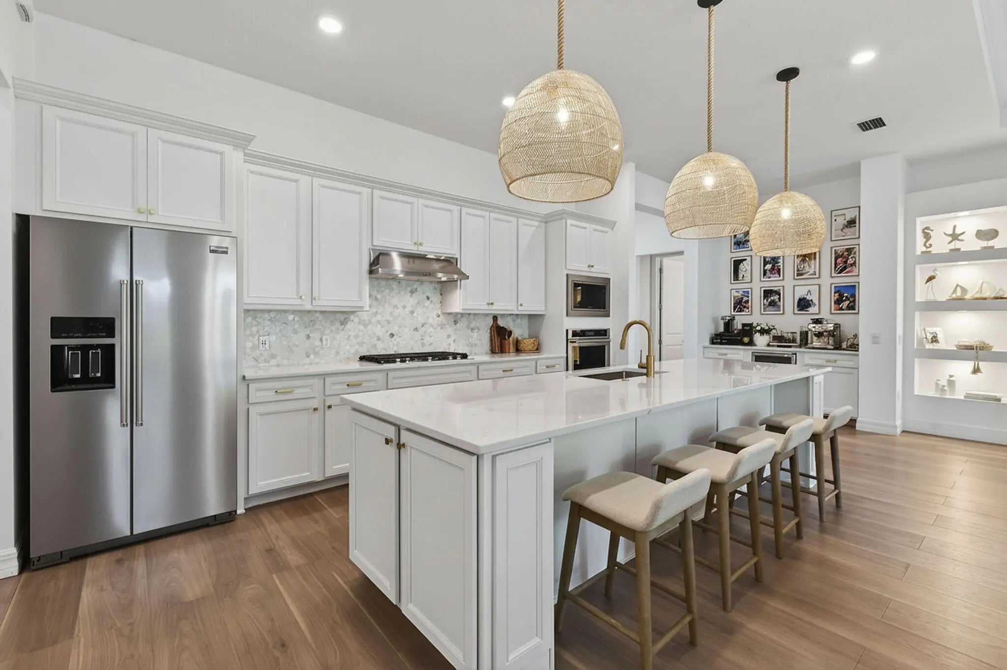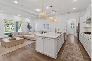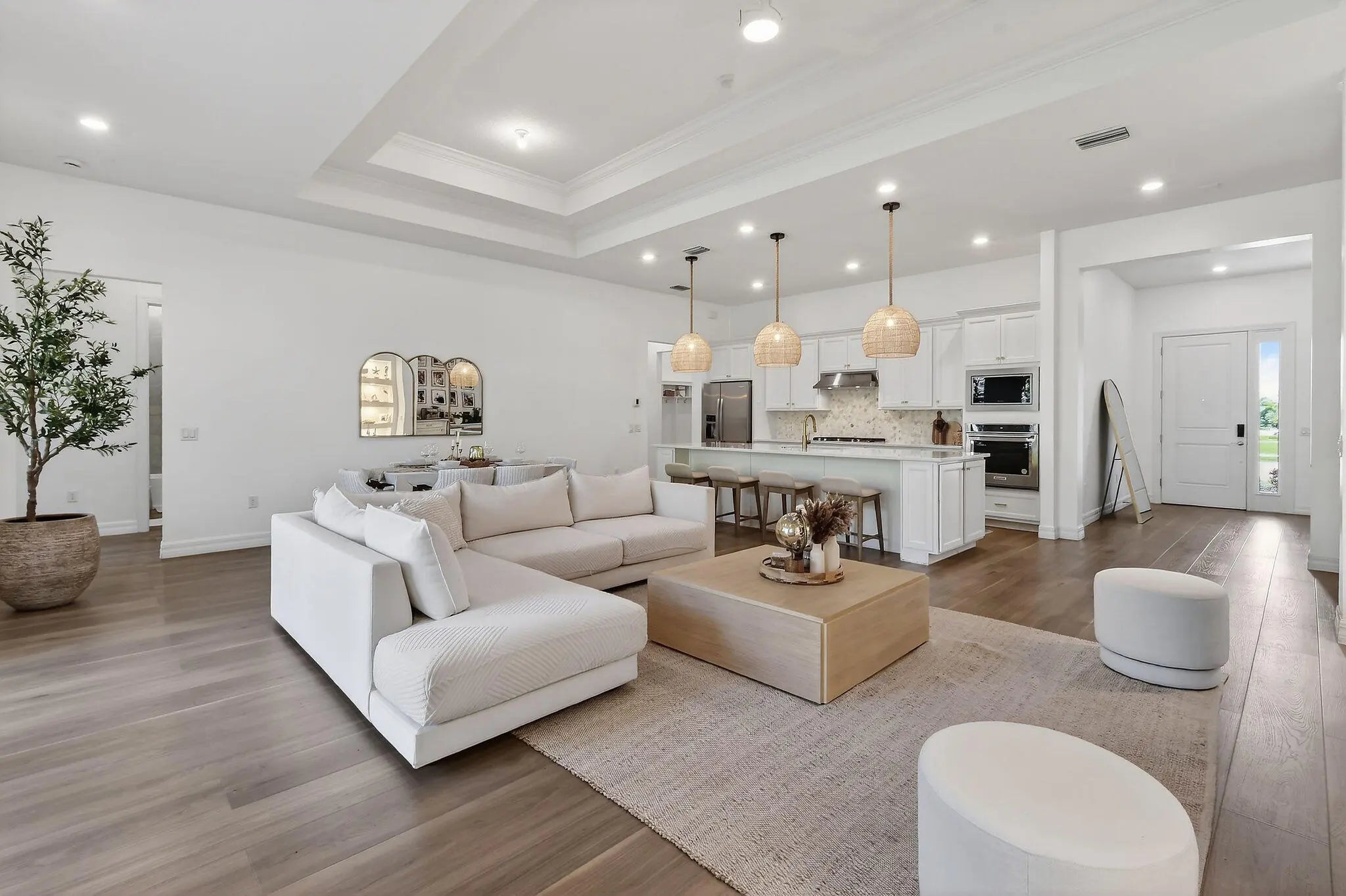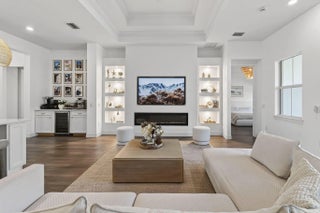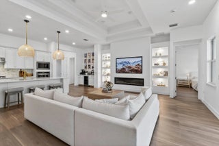 Beautiful 2024 construction, 3 bed/2.5 bath + den, home featuring a 2-car garage and approximately $150,000 in upgrades. This thoughtfully designed layout places the kitchen at the center of the home, overlooking the café area, living room, and spacious backyard--ideal for everyday living and entertaining. The home offers a private owner's suite and guest suite, both with abundant natural light and spacious walk-in closets. The kitchen showcases an oversized island, stainless steel appliances, walk-in pantry, upgraded 42'' cabinetry, quartz countertops, and soaring 10'8'' ceilings. Additional highlights include a large laundry room, ample storage, Smart Home technology, and a beautifully appointed owner's bath with an upgraded tile shower and glass enclosure. Full Upgrades List Includes: - Wide-plank water-resistant wood flooring throughout - Custom wine and coffee bar with designer finishes - Master bathroom fully renovated by interior designer with floor-to-ceiling tile - Designer guest bathroom with floor-to-ceiling tile and custom oversized drapery - Pool-coded privacy fencing enclosing entire backyard - Custom 12-foot built-in for fireplace and entertainment center with integrated ambient lighting - Oversized 12-foot kitchen island with upgraded granite, matching wine/coffee station - Oversized kitchen and gold kitchen faucet and pull-down sprayer - Upgraded faucets in all bathrooms - Statement coastal pendant lighting above kitchen island - Statement chandeliers in the master suite, main living area, and one additional bedroom - Oversized designer ceiling fans on terrace and main living area - Tesla charger professionally installed - Custom pull-down attic staircases for easy access and added storage - Smart front door with Ring camera and fingerprint-access lock - Gas line pre-installed and ready for future outdoor kitchen installation