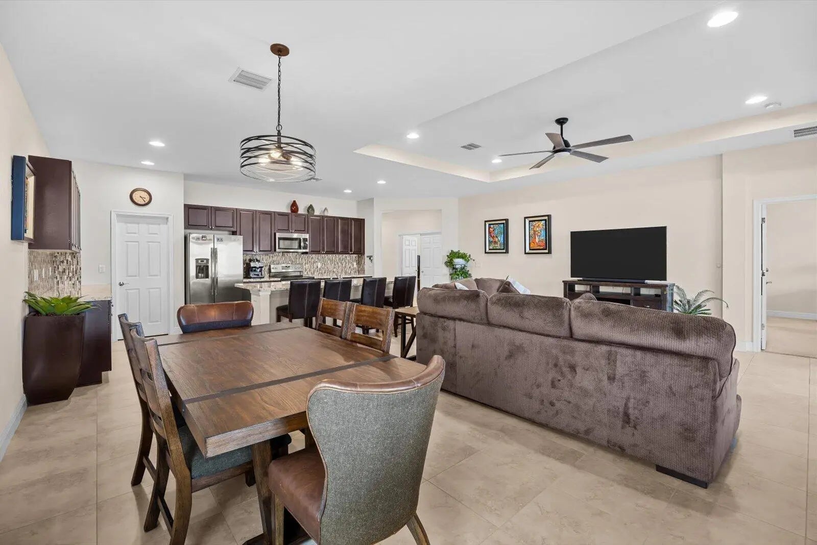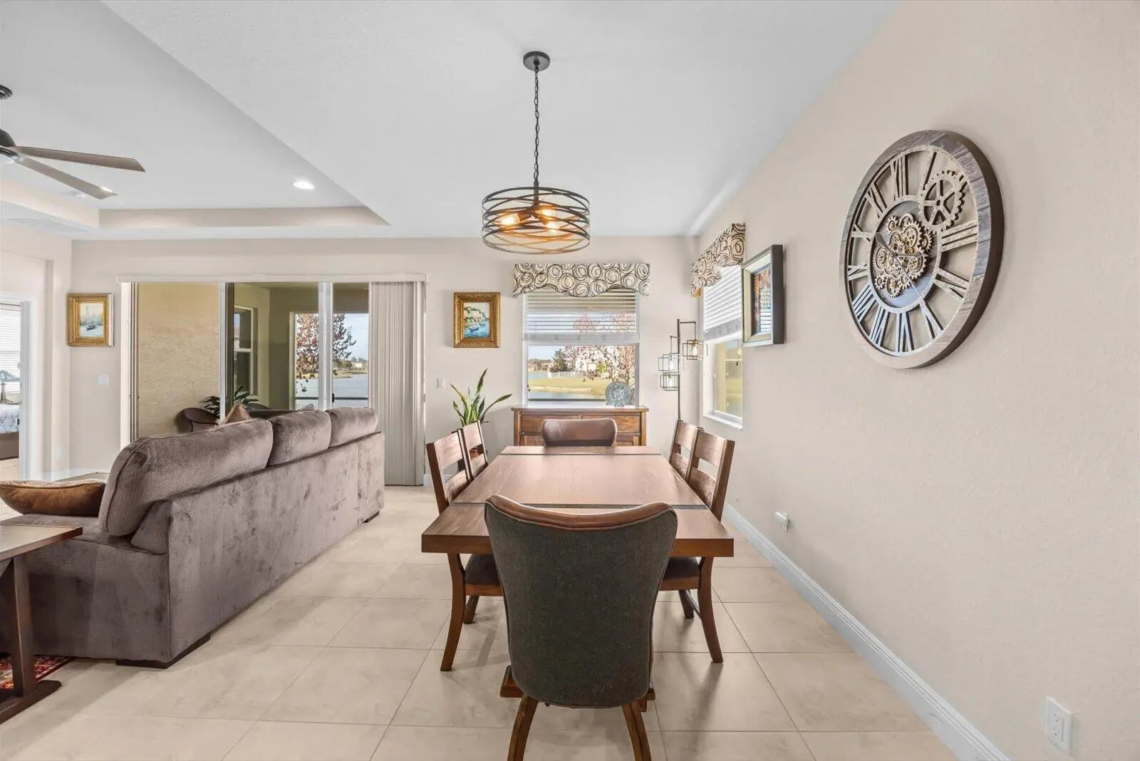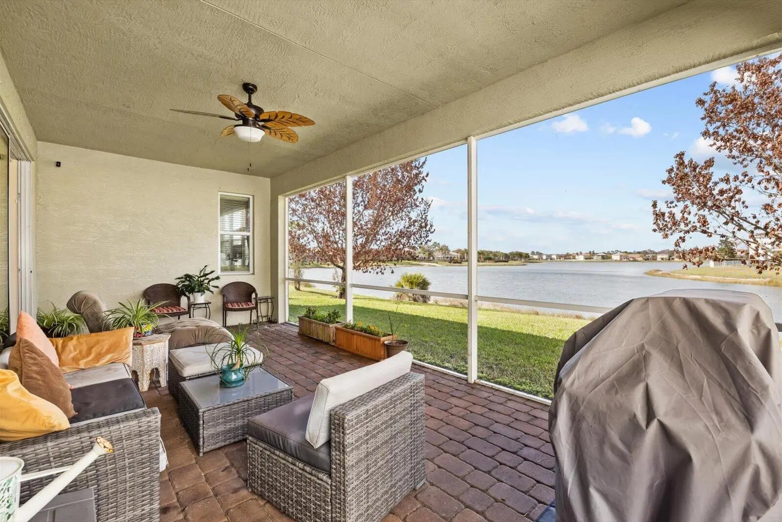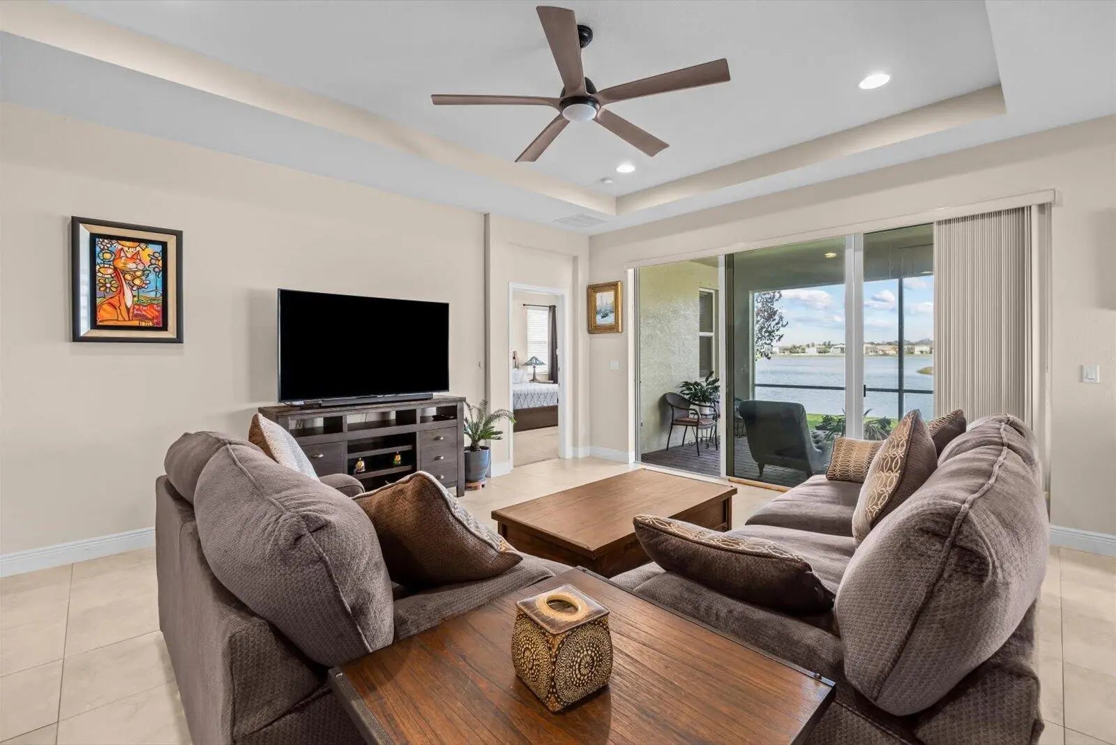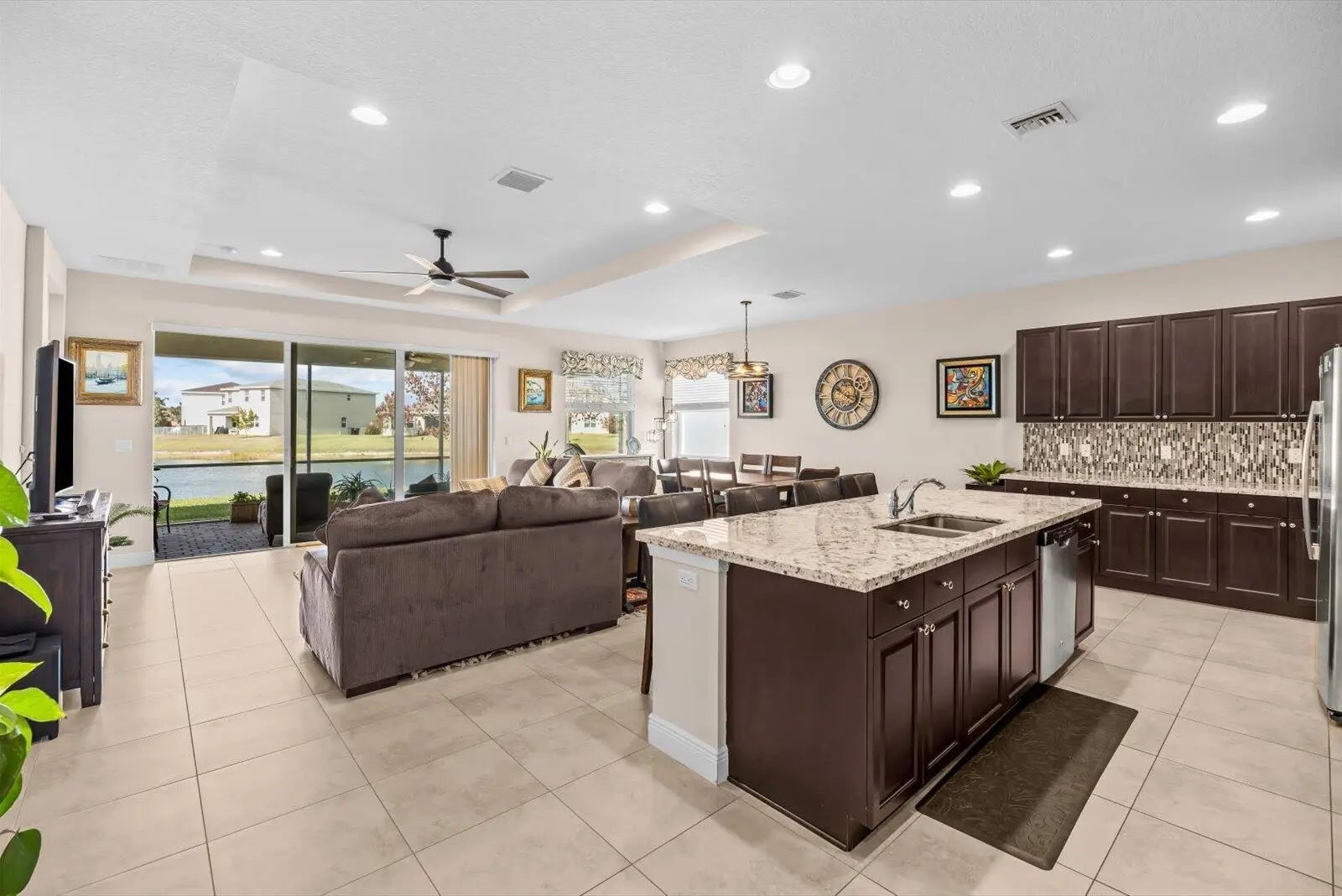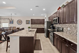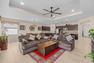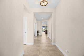 Great home in Vizcaya Falls neighborhood with wide lake views from covered lanai. The foyer leads you into the great room with dining area and open to the kitchen. Large island with sink and breakfast bar, granite countertops, stainless steel appliances, walk-in pantry and plenty of cabinetry space. The Primary Suite overlooks the lake and offers natural light. Primary bath offers, double separate vanities, corner shower with glass enclosure and private commode. A large walk-in closet. The ceiling has coffer package on the foyer, great room and primary suite. Great community with wonderful amenities.