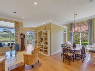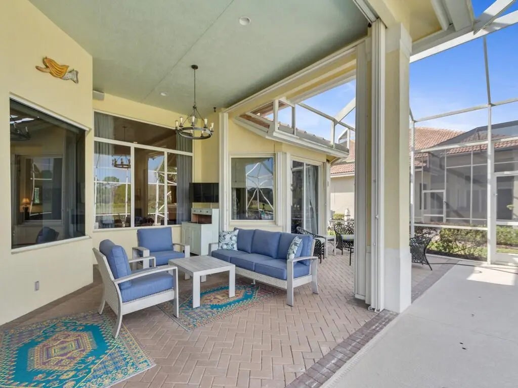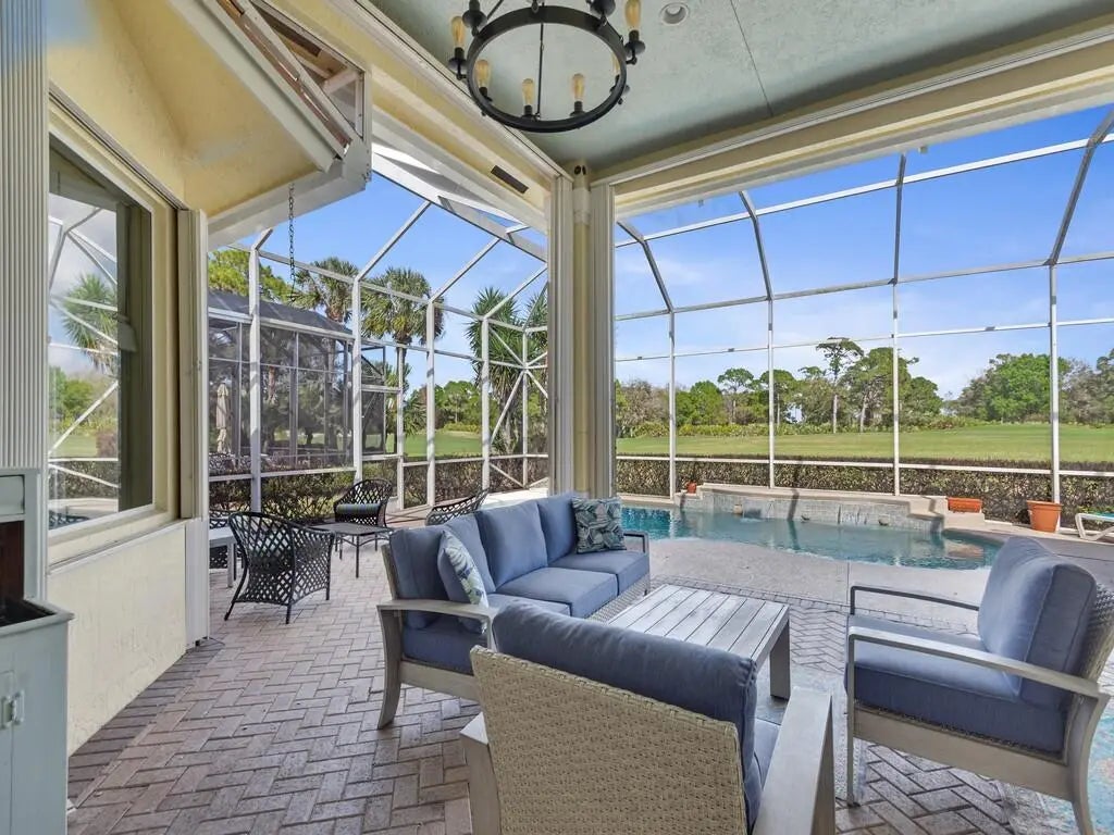 This pool home features a 2022 roof, laminate flooring throughout installed 3 years ago, accordion shutter storm protection, propane gas that services the 5 burner kitchen stove, the water heater (2025) and dryer. The kitchen has granite counters and dual ovens. There is a whole house Generac generator, too ! The beautiful epoxied, oversized garage includes multiple storage units and a work bench. Enjoy a poolside seat under the spacious overhang of the porch which overlooks the 13th fairway of the Ryder Course with a sun rise view. The convenience of the Cypress Point location to the main gate of the PGA Village will help you get to where you are going sooner than other locations in PGA Village. Furnishings negotiable outside of contract. Measurements approx.