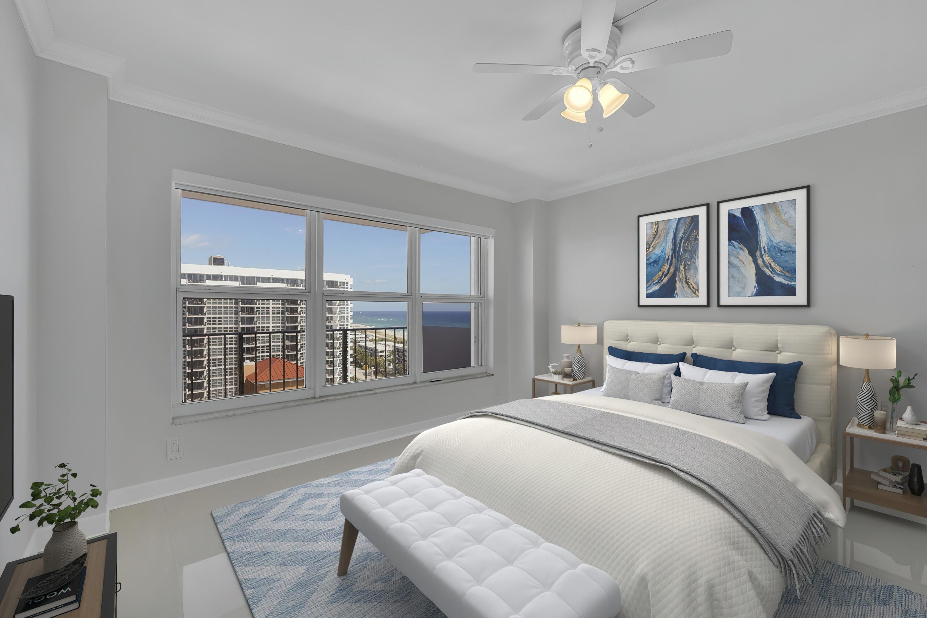 This impressively renovated two-bedroom, two full bathroom condo is situated on the 15th floor, providing breathtaking views of both the ocean and the intracoastal. Nestled within the sought-after Parliament House in picturesque Pompano Beach, it offers easy access to the ocean, vibrant beachfront shops and restaurants, the pier, and numerous other attractions. This unit presents a serene retreat with tasteful upgrades, including newer porcelain floors, kitchen cabinets, quartz countertops, and a Samsung stainless steel appliance package, complete with a wine fridge. The master bath boasts dual sinks, a shower, and a whirlpool tub.Throughout the unit, you'll find attention to detail with impact windows & doors, and crown molding, while the balcony offers an ideal setting to unwind and take in the tranquility of both the Sunrise & Sunset views. Newly enhanced and upgraded amenities prosper with a recently renovated lobby, fully equipped spacious gym & common areas, pool tables, new elevators, card room, library, and billiard room and a pool featuring a grill-equipped entertaining area and Tiki huts for true relaxation. Enjoy complimentary Wifi and 24/7 security for added peace of mind. Home Sweet Home in Paradise awaits you!!