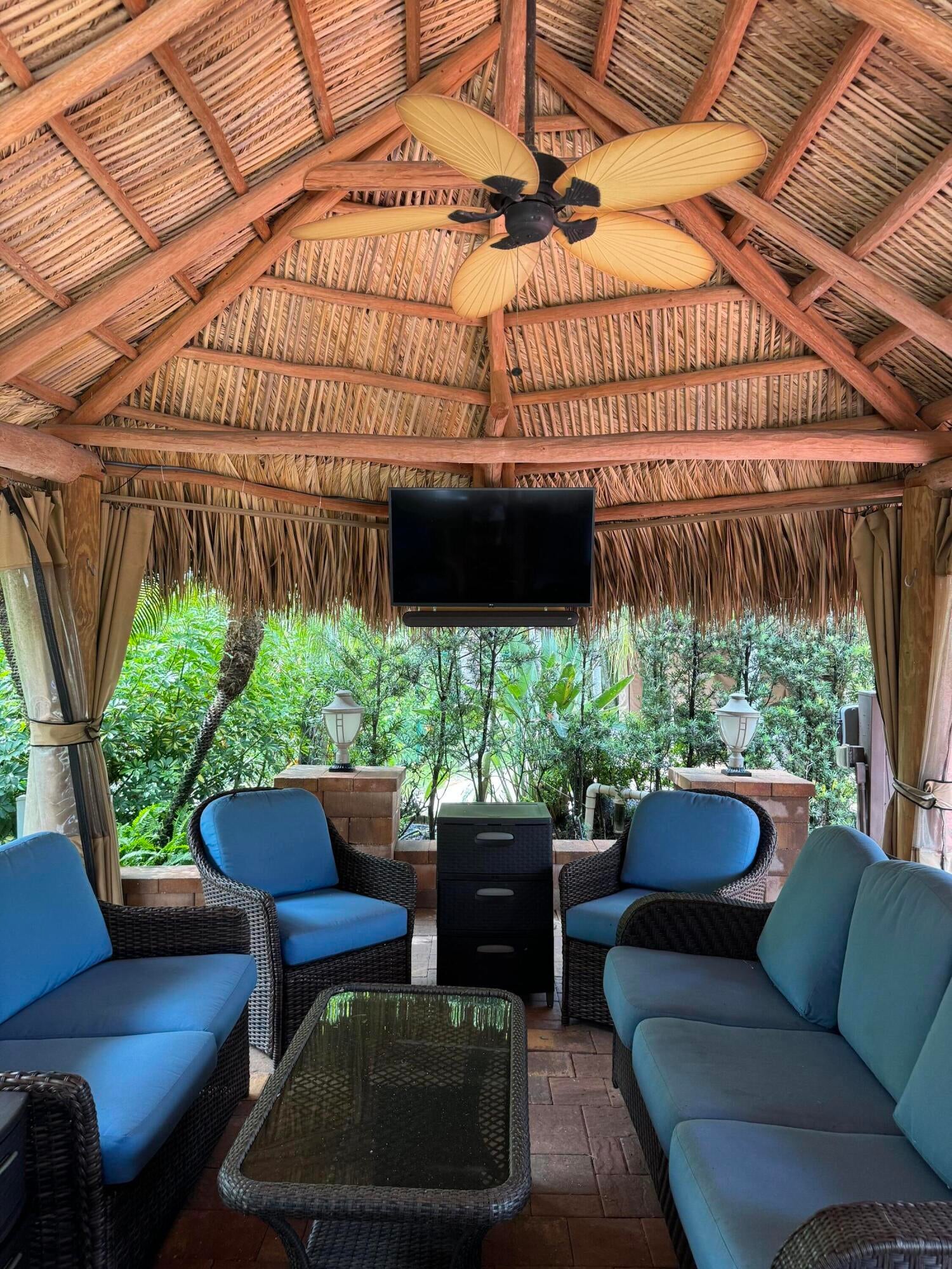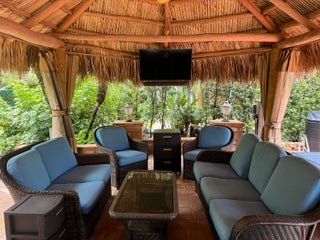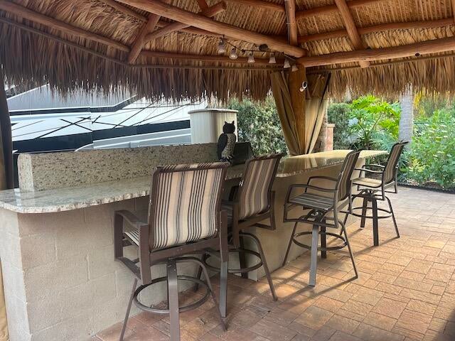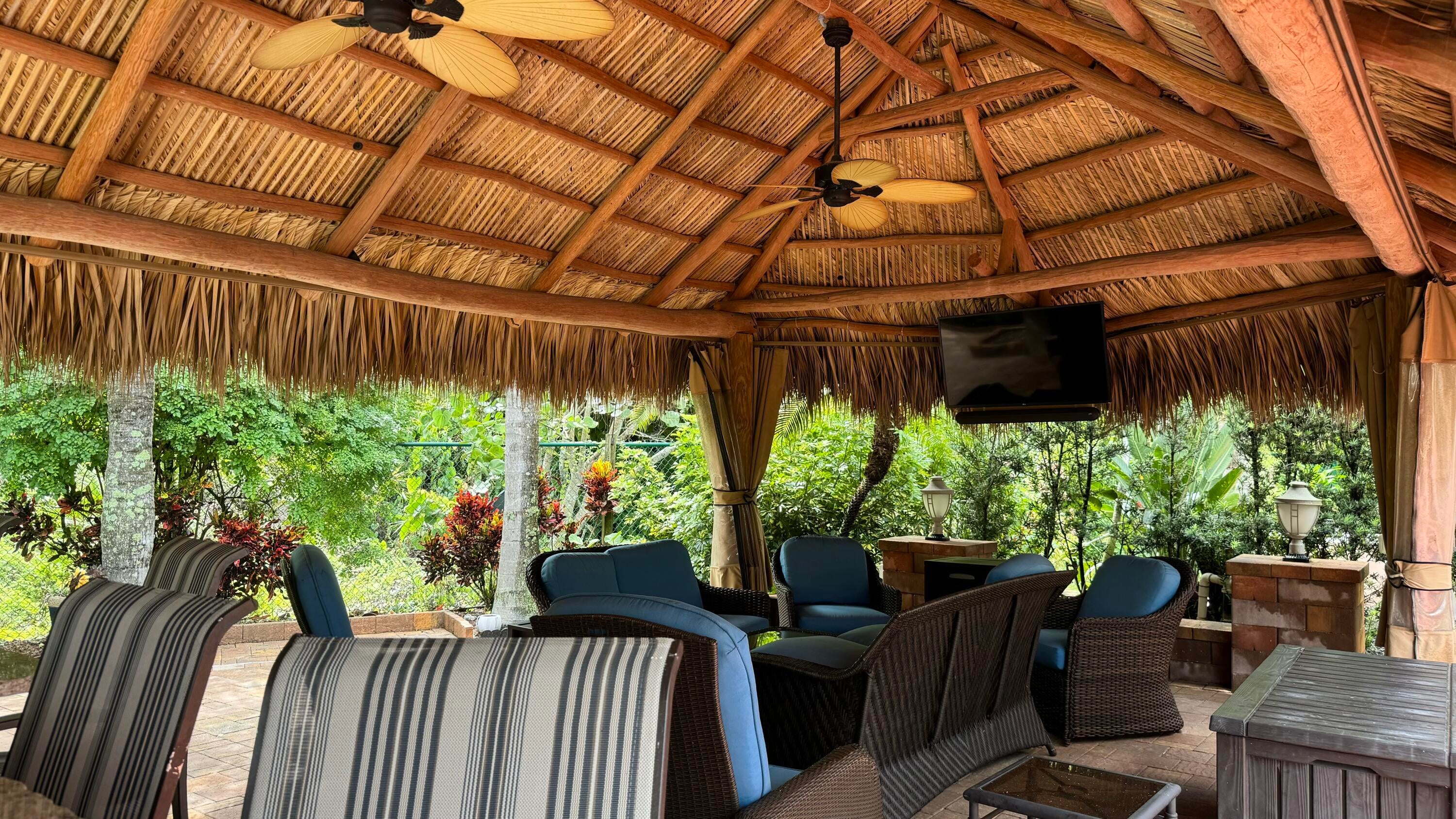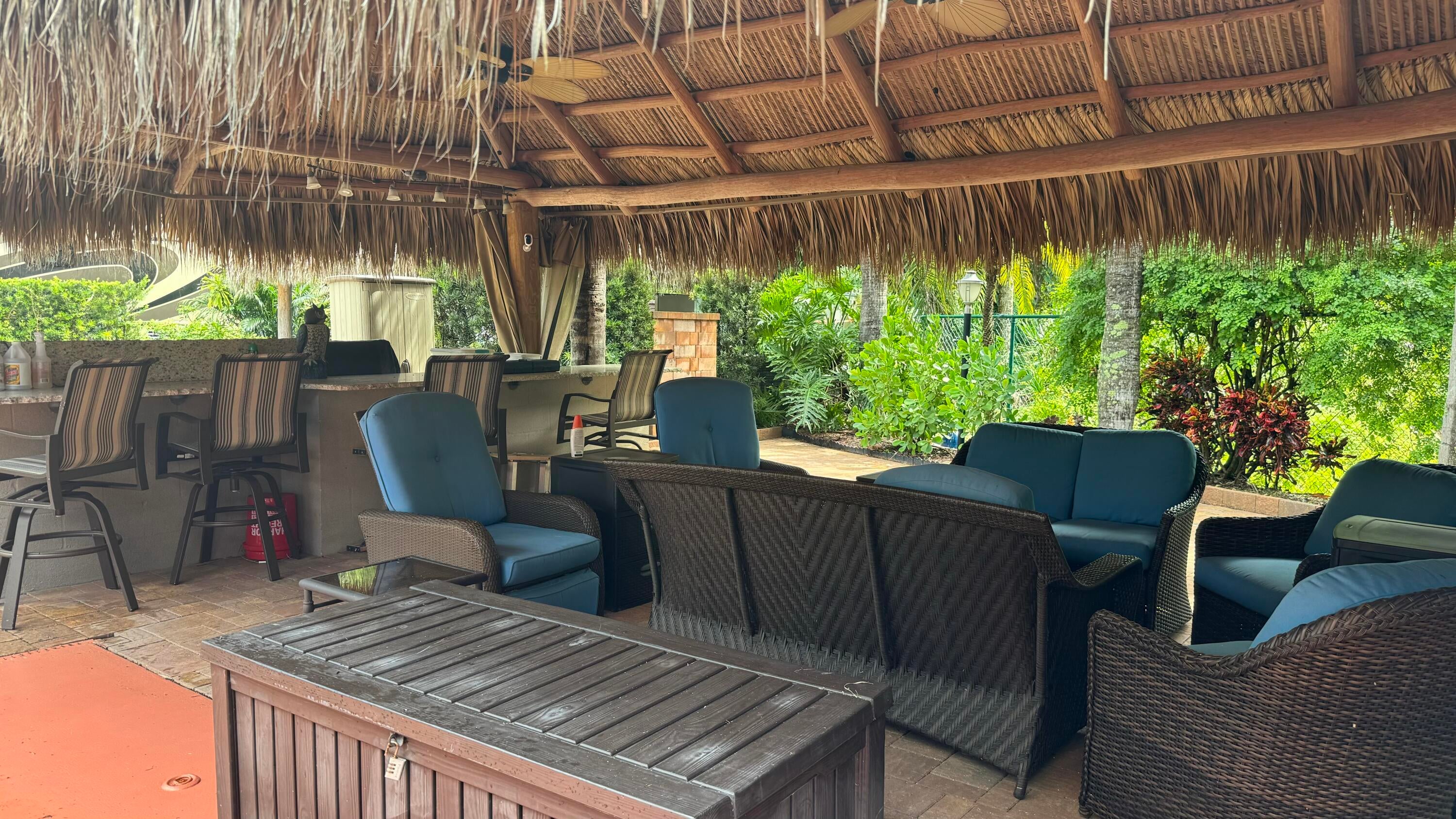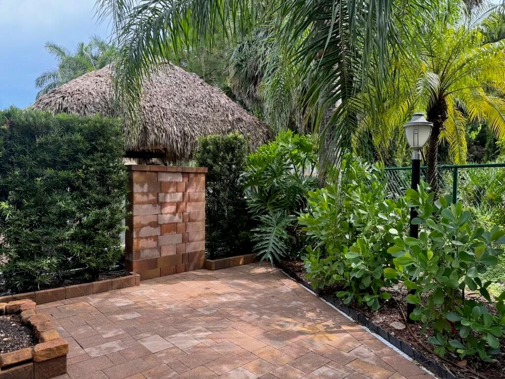 Beautiful landscaped . Large granite bar for wonderful outdoor entertainment Newer large tiki, close to pool and additional parking. close to laundry facilities. Very active community . Bocce ball , shuffleboard, pickle ball , tennis , 18 hole golf course. This lot backs onto the reserve for privacy and has mature, lush landscaping. Newly refinished with more contemporary pavers, a golf cart parking area, and refreshed built in kitchen that includes a JennAir grill. Most of the furniture and storage units remain. There is a mosquito spraying system to ensure enjoyable evenings in the tiki. Private lot that's back to preserve.