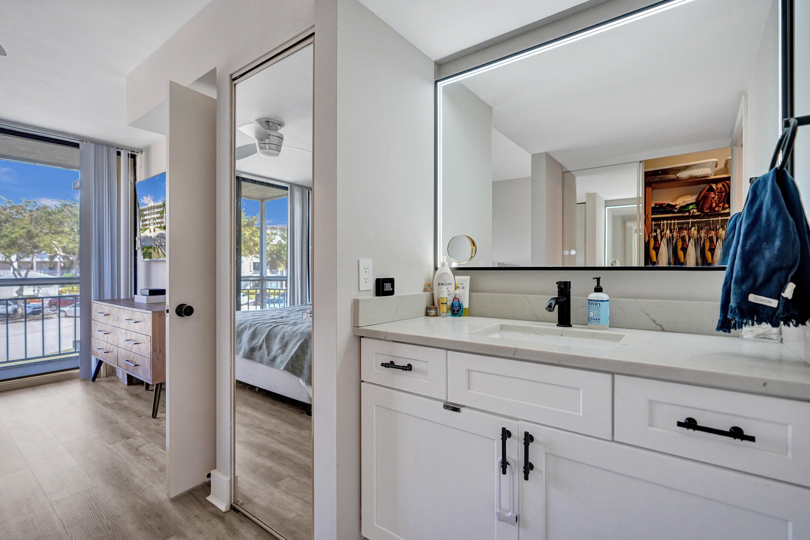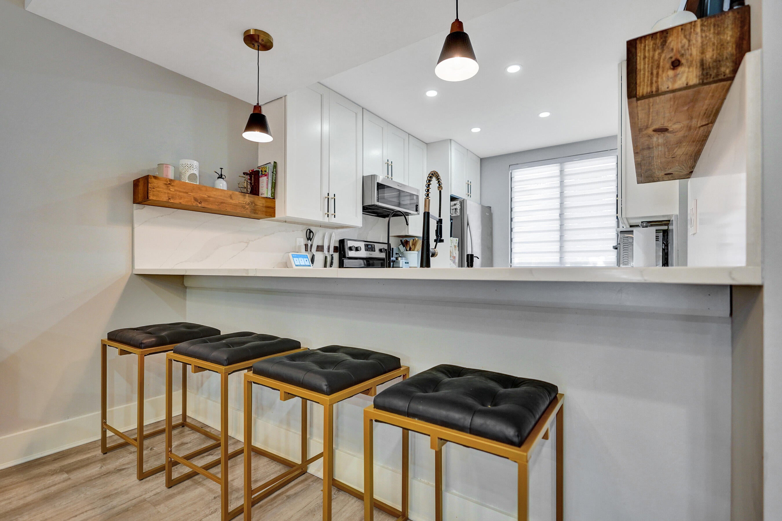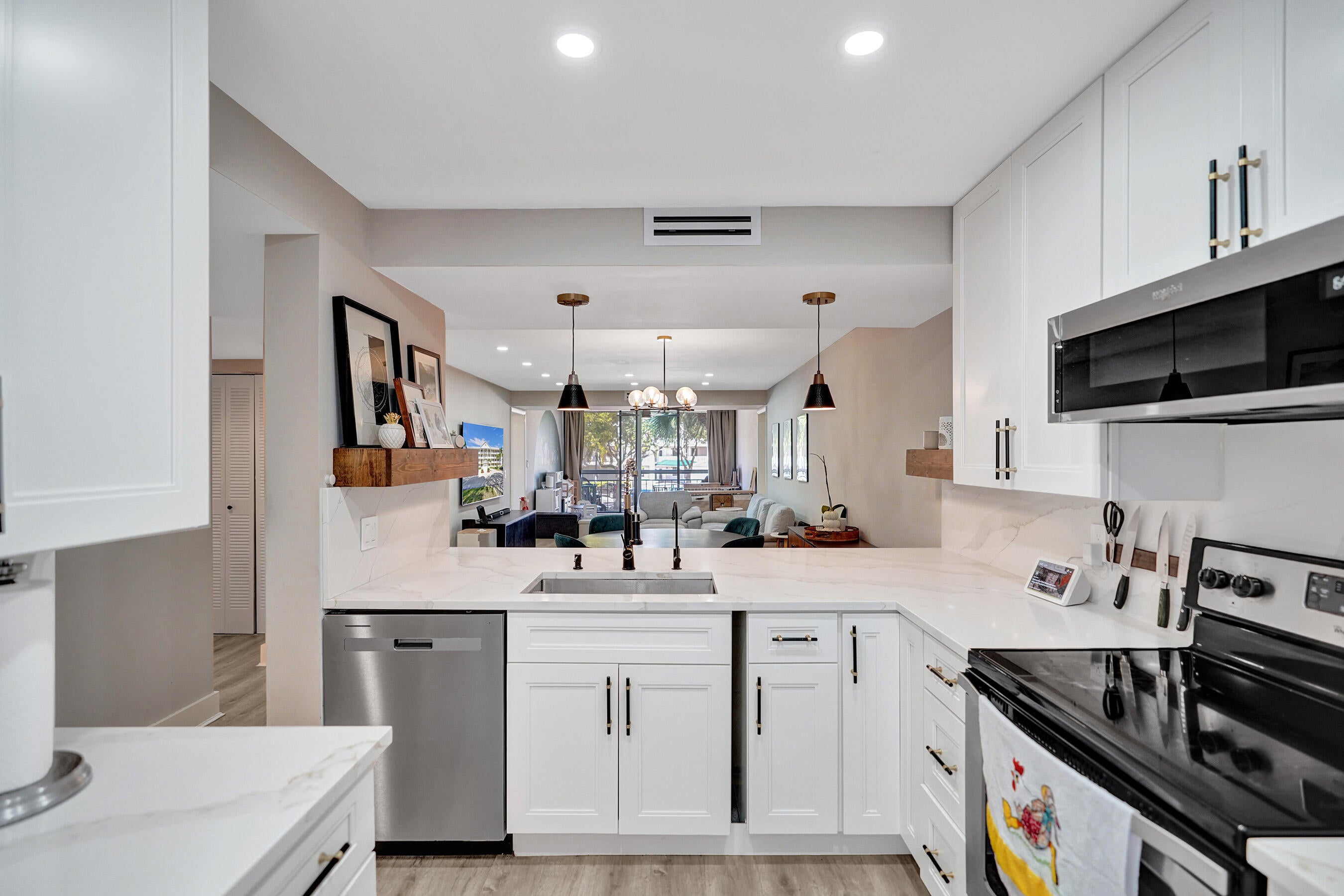 You don't want to miss this opportunity to own a fully remodeled corner unit with two balconies. This 2 bedroom 2 bath unit spans 1385 SqFt with a large open floor plan. The kitchen was recently updated with white shaker cabinetry, quarts countertops, stainless steel appliances modern hardware, and pendant lighting. Updated vinyl floors run throughout the entire living space and bedrooms. The primary suite features its own corner balcony, a walk-in closet and the bathroom was updated with a new modern vanity and LED mirror. The indoor laundry room includes lots of cabinetry a large bonus room that can be used for storage or office space. Whitehall is conveniently located in central boca, close to the town center mall, shopping, restaurants, and just a short distance to major highways.
