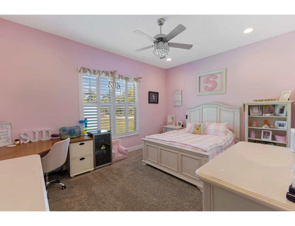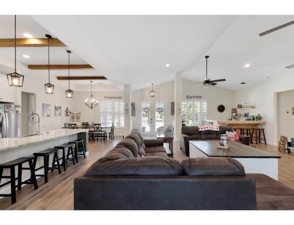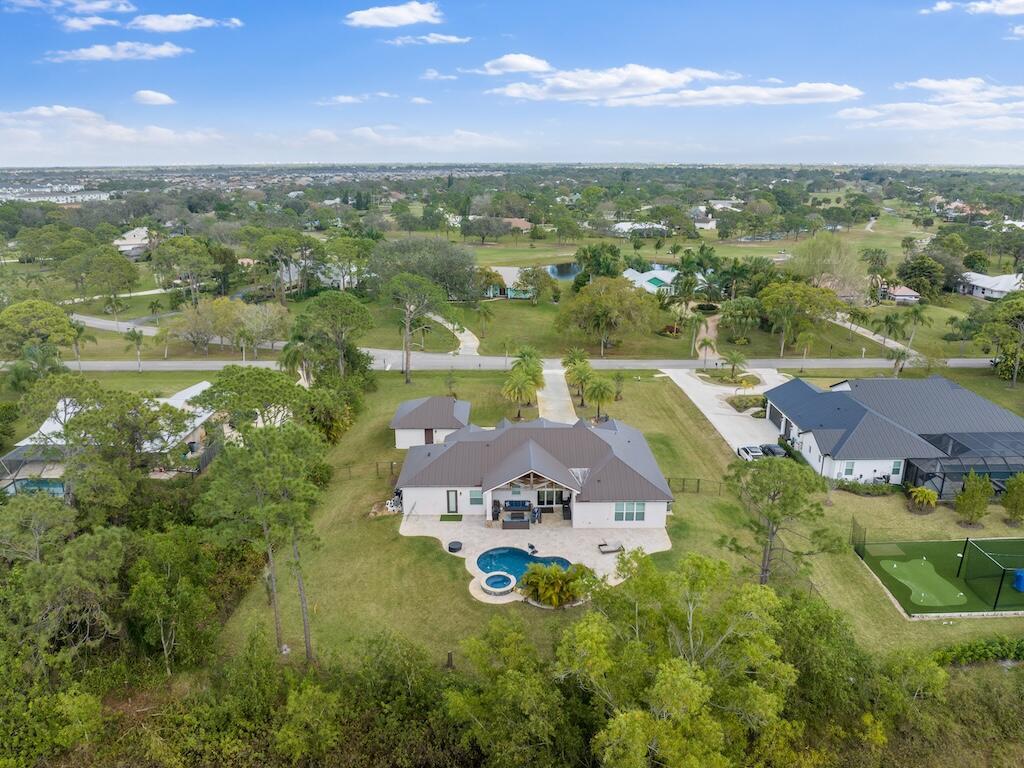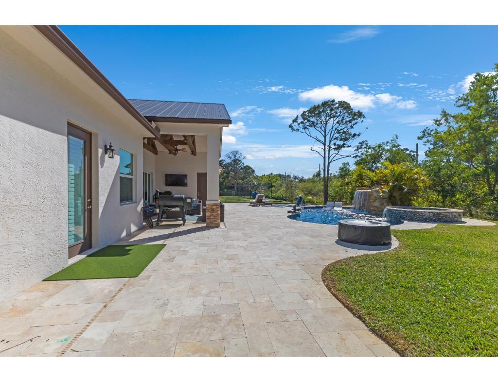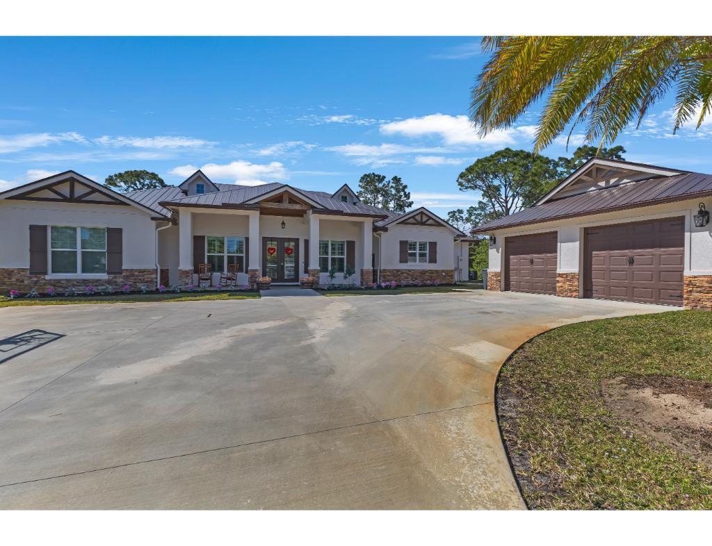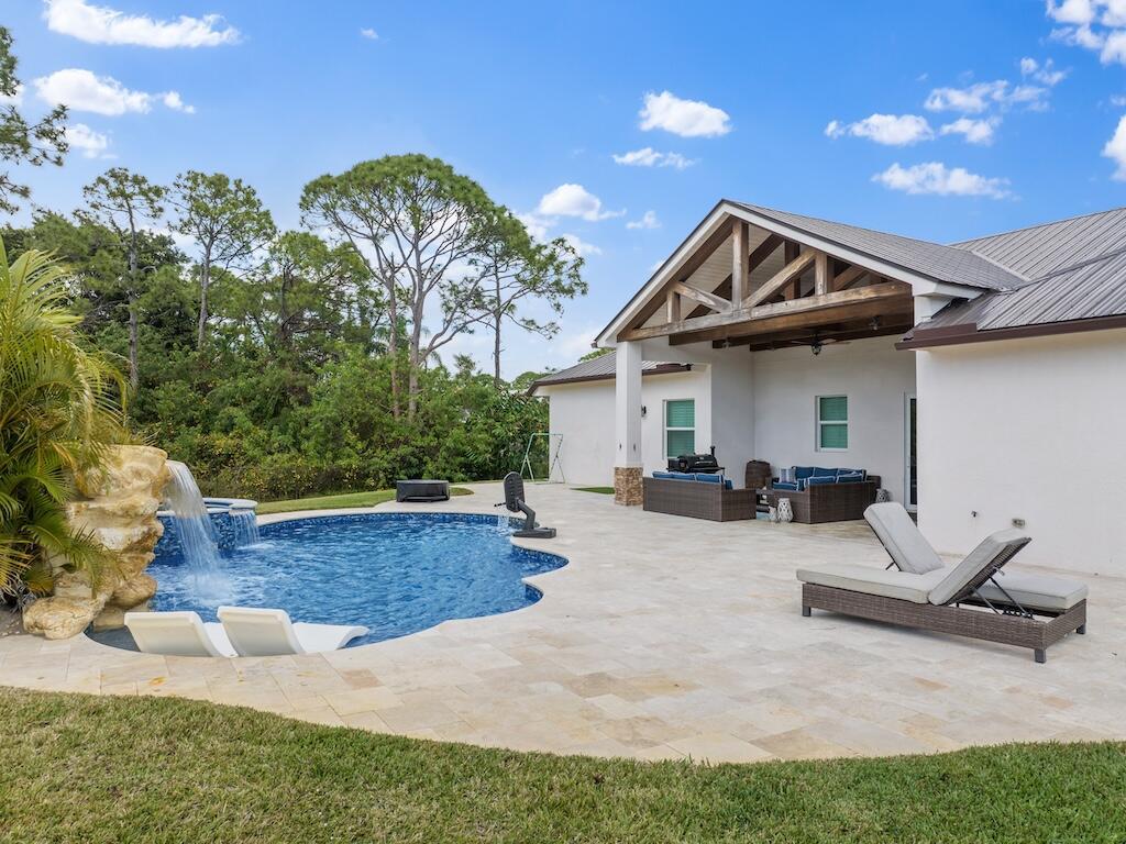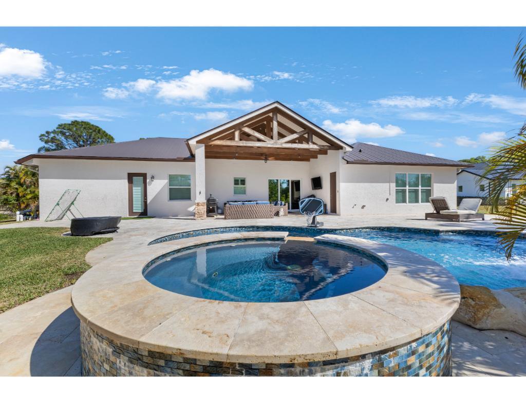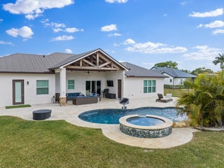 Welcome home! Discover this exceptional CBS residence in the highly sought-after Evergreen/Crane Watch neighborhood. This meticulously maintained property is situated on a 1-acre lot and was constructed in 2020. The home features 3 bedrooms, 2 1/2 bathrooms, an oversized detached 2-car garage, and a spacious flex room (19' x 10') suitable as a game room or 4th bedroom. Highlights include a metal roof, hurricane impact windows and doors, over 3,000 square feet of living space, and a custom pool with a built-in jacuzzi and rock waterfall. Additional amenities comprise a custom-built bar with a Granite Countertop and Plantation Shutters throughout.The versatile layout presents a stunning open great room with a vaulted ceiling and an exquisite island kitchen featuring high-quality custom wood cabinetry, stainless steel appliances, a stainless farmhouse-style sink, elegant wood beams, and a custom range vent hood. Adjacent to the kitchen, you will find a sizable walk-in pantry with solid wood shelving and ample storage. The home also offers a spacious laundry room with additional storage and a utility sink. The generous master bedroom boasts two large walk-in closets and an en-suite bathroom with a dual-sink vanity, a large soaking tub, and a separate shower. Stepping out onto the Travertine pool deck, you will appreciate the private, fully fenced backyard with its remarkable custom pool. This property represents a unique opportunity to own a truly distinctive home in a desirable neighborhood. Home next door, located at 5303 SW Bimini (RX-11058356) is also available-buy both and make a family compound! Room Sizes are approximate and subject to error, buyer to verify. Municipal County Water is coming to Evergreen and is currently being installed with an estimated completion time frame of 270 days!