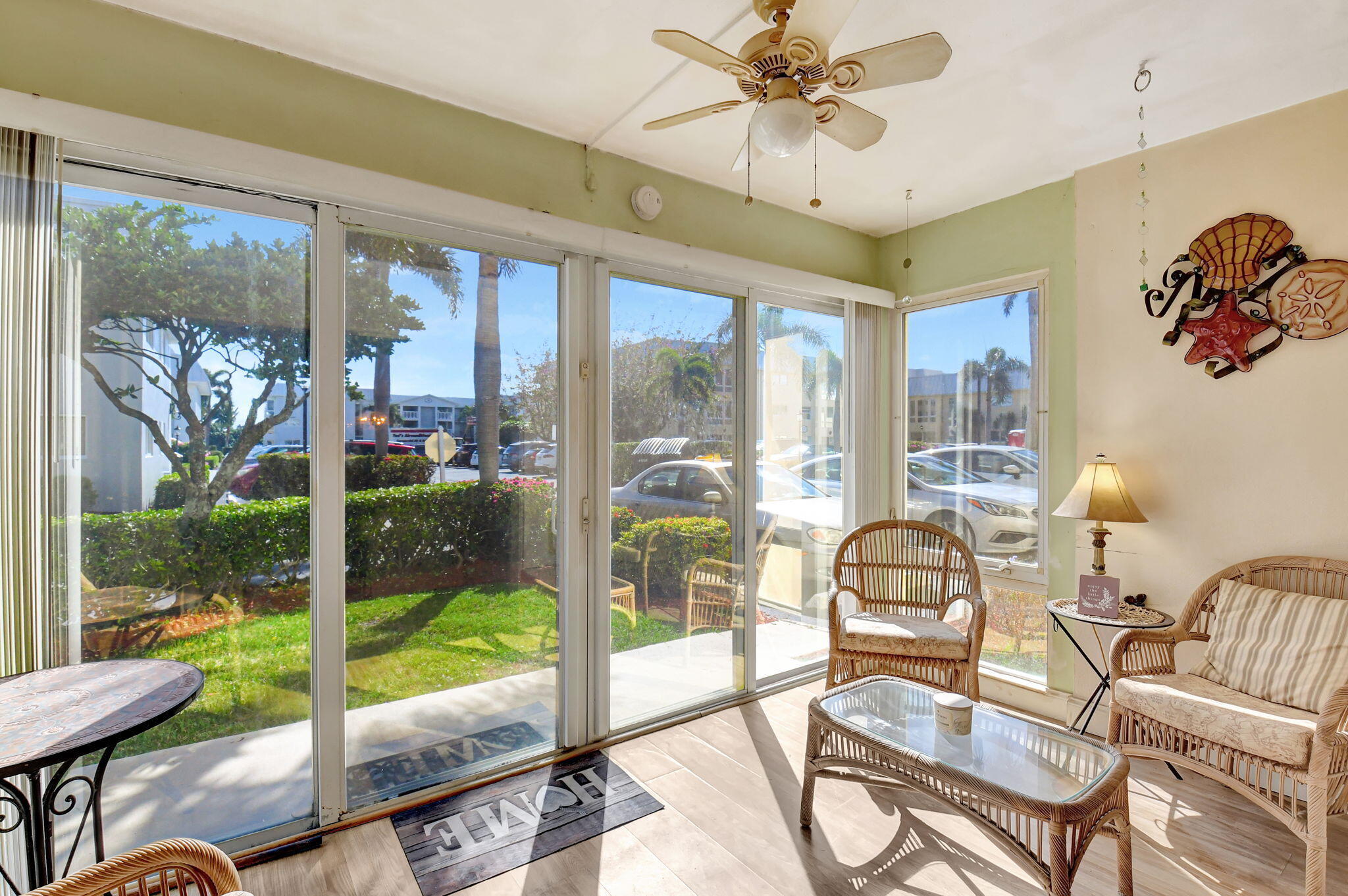 Bring your vision to life in this 1st floor, end corner unit located in the highly desirable Colonial Club, a vibrant 55+ community in Boynton Beach. Enjoy peace of mind with full hurricane impact windows and sliders, a designated parking spot conveniently located just outside the back sliders, and newly installed roofs on all buildings within the community. While a shared laundry room is available in the building, washer and dryers are allowed in the units if you wanted to install one.This condo presents a fantastic opportunity to make it your own, with all the major updates already completed. It features a remodeled kitchen with granite countertops, a coordinating backsplash, and elegant white shaker cabinets with soft-close doors and drawers. The updated guest bathroom features a spacious walk-in shower and a sleek single vanity, while the master bathroom offers a double vanity and a shower/tub combination. The open living and dining areas, along with the sunroom, provide plenty of space for relaxation and entertaining. Laminate flooring extends throughout the main living areas and guest bedroom, with plush carpeting in the master and tile in both bathrooms. The sunroom sliders open to a cozy patio, perfect for enjoying your morning coffee. Adding to the convenience, a designated parking spot is located just outside the back sliders. Perfectly situated between the Intracoastal Waterway and Federal Highway, this beautifully landscaped community offers a dynamic and engaging lifestyle. The clubhouse features a meeting room, library, billiards, exercise facilities, and a game area. Residents can unwind in the heated saltwater pool overlooking the Intracoastal, complete with lounge chairs, BBQ grills, and a scenic walking path along the seawall. The community hosts frequent social events, ensuring plenty of opportunities to stay active and connect with neighbors. Ideally located just minutes from premier dining, shopping, and entertainment in Boynton Beach, Delray Beach, and Boca Raton, this home offers the perfect blend of comfort, convenience, and coastal living.