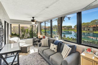 BREATHTAKING LAKE VIEWS. This exquisitely renovated 2-bedroom+den(optional 3rd bedroom) condo is a move-in-ready masterpiece, perfectly nestled in a breathtaking lakeside setting. The chef's kitchen is a true showstopper, boasting sleek shaker cabinetry, sparkling quartz countertops, and stainless steel appliances. The open-concept design flows effortlessly into the enclosed Florida room, where impact sliders and custom motorized blinds frame tranquil lake views. The expansive primary suite is your private oasis, featuring a walk-in closet, additional wall closet, and ensuite bath with dual vanities and elegant finishes. With full impact windows, designer upgrades, this stunning condo is more than just a home - It's a lifestyle!Property Features: *2 Bedrooms + Den/optional 3rd Bedroom - Versatile space for a home office or guest room *Fully Renovated & Move-In Ready - Stylish, modern updates throughout *Lakeside Location - Enjoy breathtaking water views *Luxury Flooring - Laminate & porcelain tile throughout *Chef's Kitchen - Shaker cabinetry, quartz countertops & stainless steel appliances *Enclosed Florida Room - Impact sliders & custom motorized blinds for serene lake views *Expansive Primary Suite - Walk-in closet, additional wall closet & spa-like ensuite bath *Double Vanities in Primary Bath - Elegant finishes for a luxurious touch *Multiple Outdoor Spaces - Florida room, front courtyard & side patio for ultimate relaxation *Full Impact Windows - Peace of mind with storm protection *Designer Upgrades - Modern elegance in every detail *Community Features: *Resort-Style Amenities *Full Facility Clubhouse *Auditorium *Heated Pool & Hot Tub *Tennis & Pickleball Courts *Fitness Classes *Billiards *Ping Pong *Bocce Ball *Library *Game Nights *Social Clubs & Activities: *Bridge Club *Book Club *Current Events Discussions *Pickleball *Tennis Club *Knitting & Craft Club *The "Dinner Out" Club *Social Club & Community Events Don't miss your chance to own this slice of paradise!