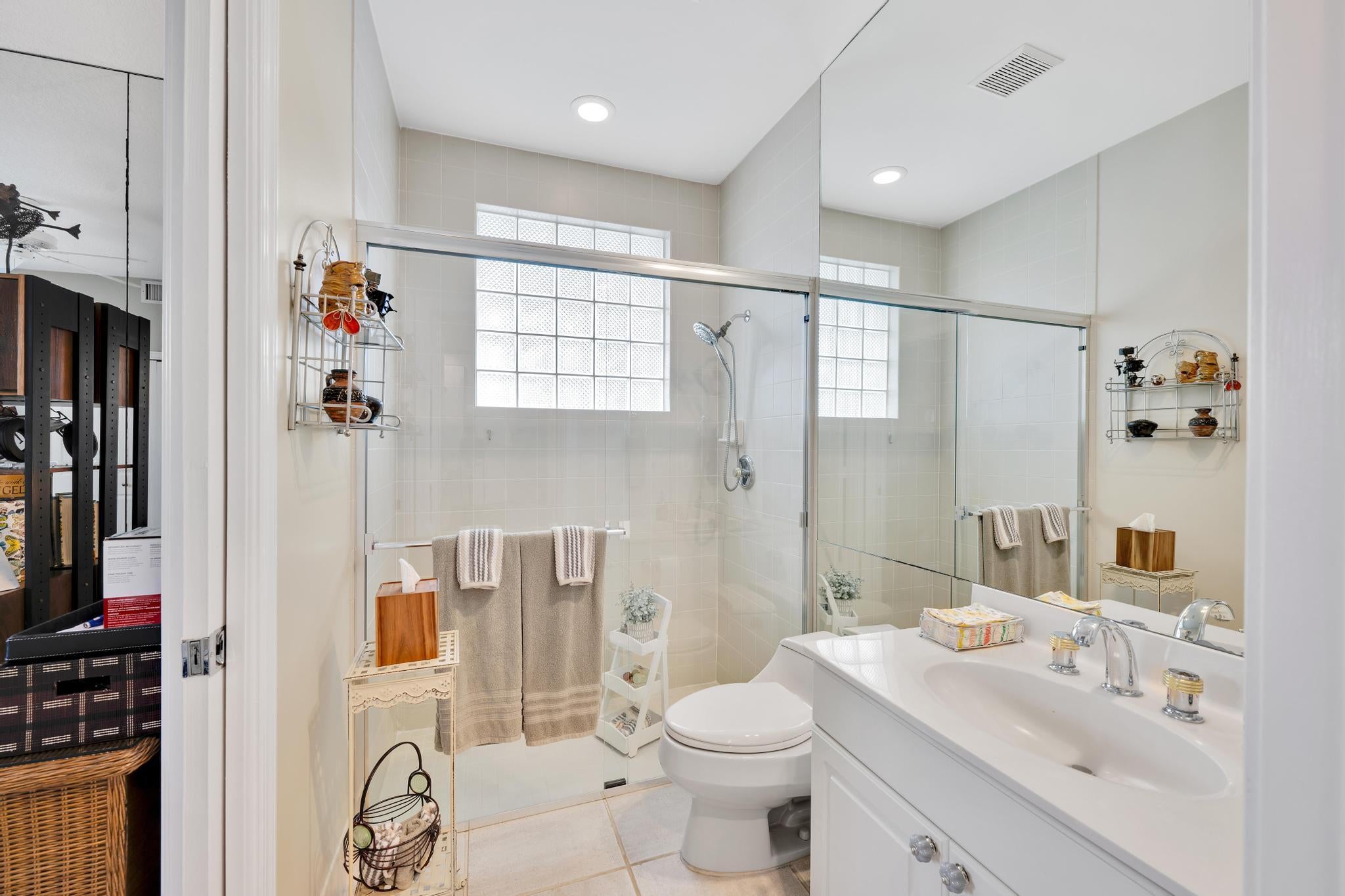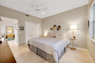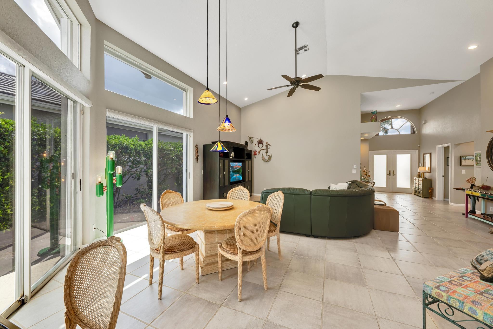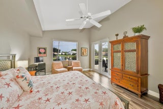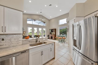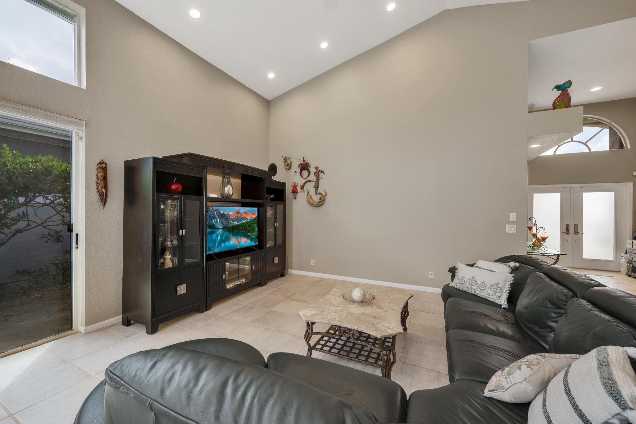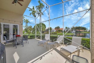 Spacious single-story home in desirable Hampton Fairways 55+ community! Enjoy 2,402 sq ft of tiled living space with 3 ensuite bedrooms, great room, family room, and large screened-in patio showcasing a stunning lake view with a lit fountain. The updated main bath features dual vanities, glass shower enclosure, and jetted tub. Kitchen with granite counters, stainless-steel appliances, storm-protected windows/doors, and a 2021 roof add value. Community perks include lawn care, -- on scheduled basis: exterior painting, driveway, walkways and roof power washing, and more. Up to two, 25-pound pets are welcome. Walking distance to community club house and pool. Indian Spring Club membership available but NOT required! Furniture available separately.