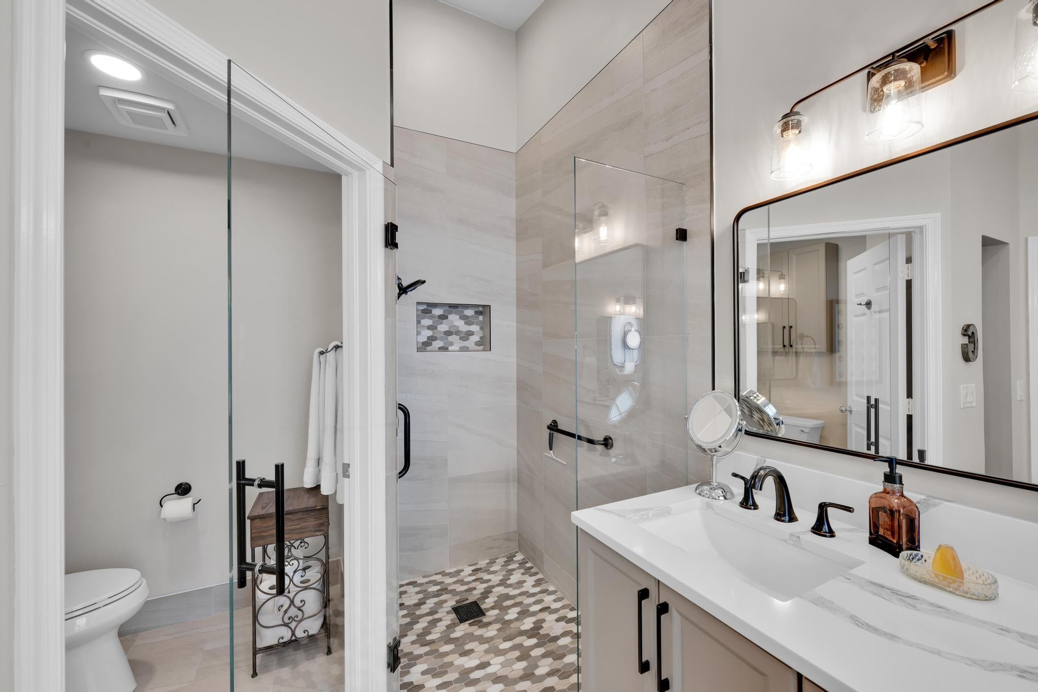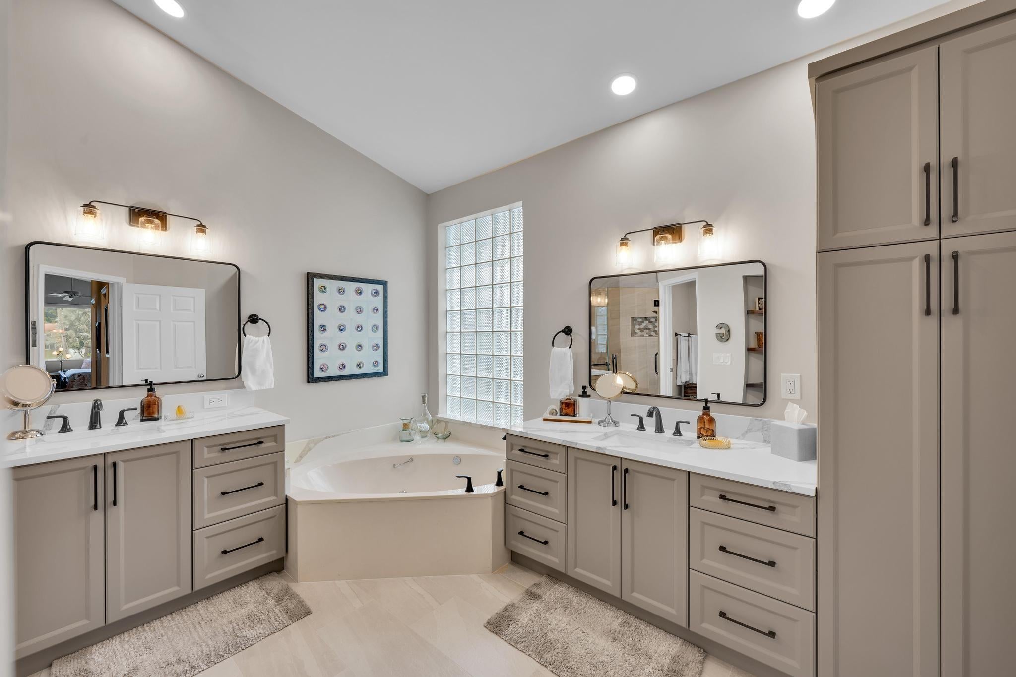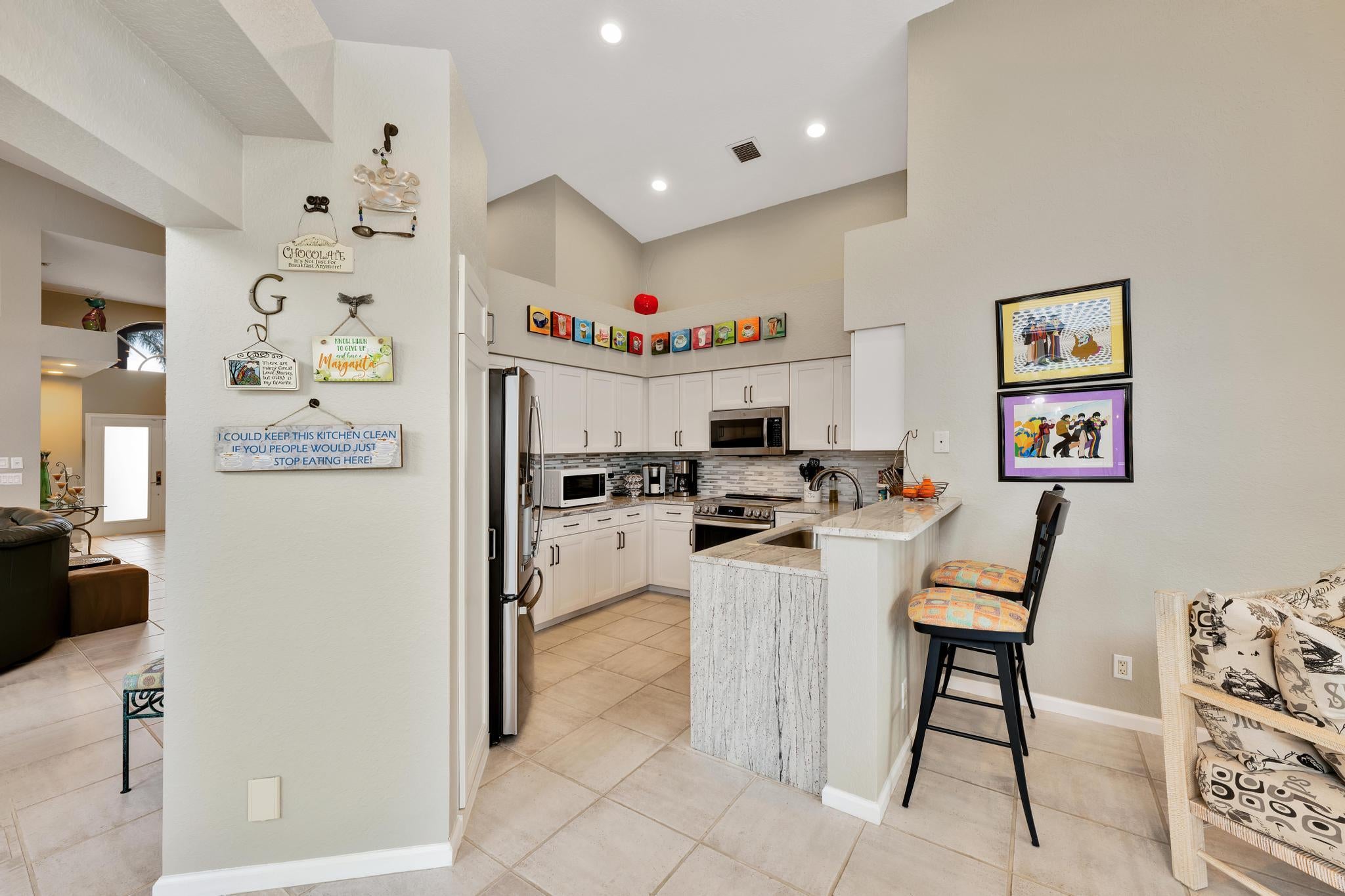 Spacious single-story home in desirable Hampton Fairways 55+ community! Enjoy 2,402 sq ft of tiled living space with 3 ensuite bedrooms, great room, family room, and large screened-in patio showcasing a stunning lake view with a lit fountain. The updated main bath features dual vanities, glass shower enclosure, and jetted tub. Kitchen with granite counters, stainless-steel appliances, storm-protected windows/doors, and a 2021 roof add value. Community perks include lawn care, -- on scheduled basis: exterior painting, driveway, walkways and roof power washing, and more. Up to two, 25-pound pets are welcome. Walking distance to community club house and pool. Indian Spring Club membership available but NOT required! Furniture available separately.