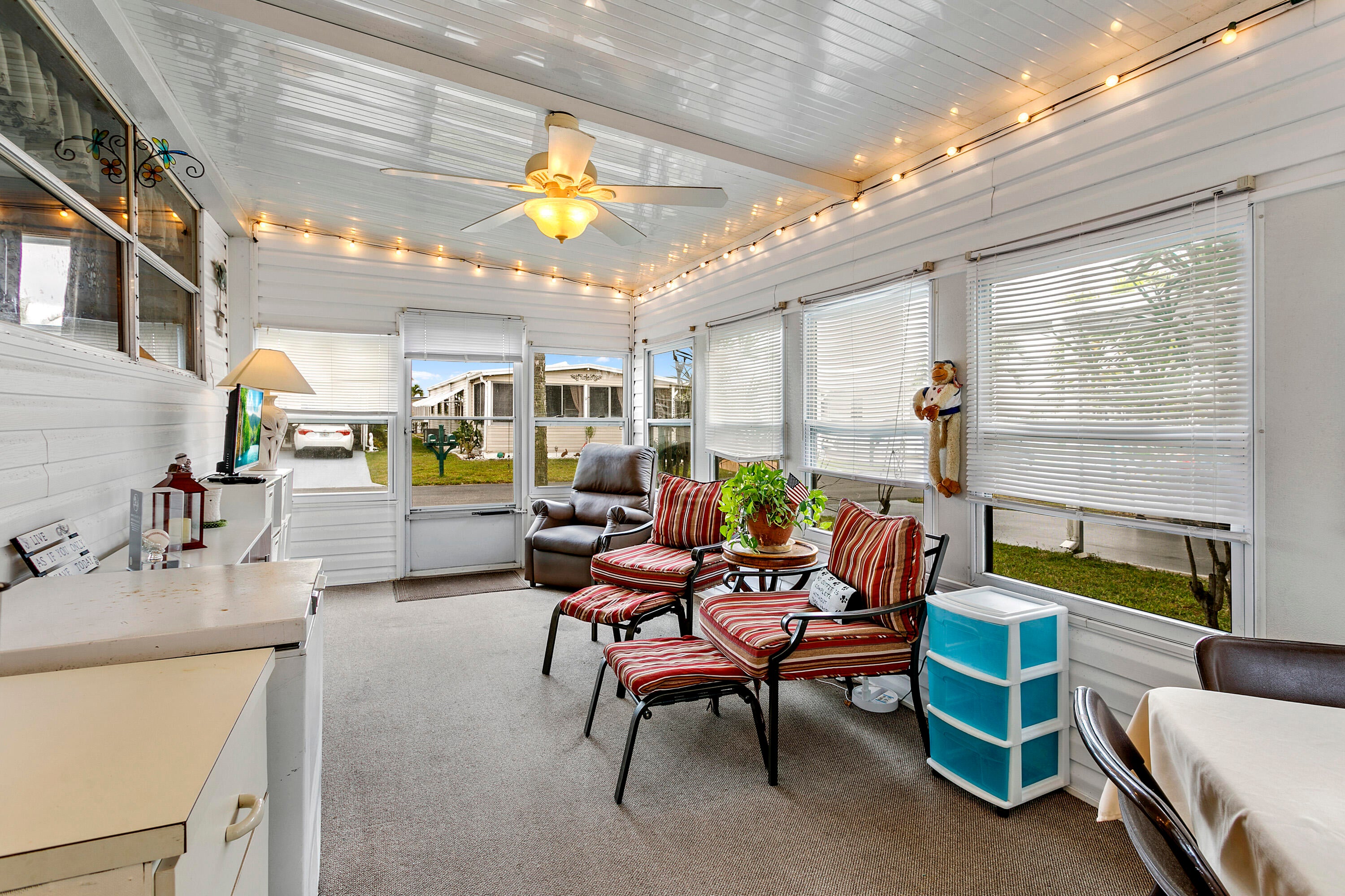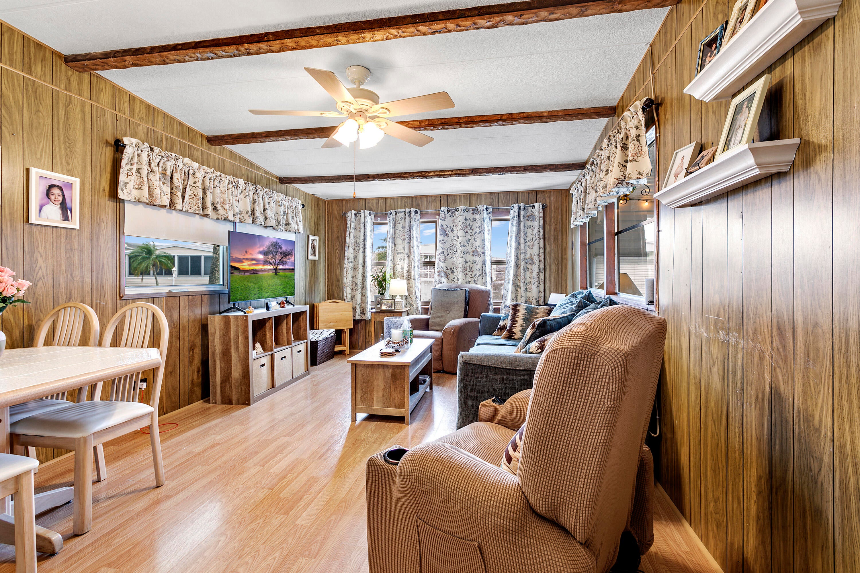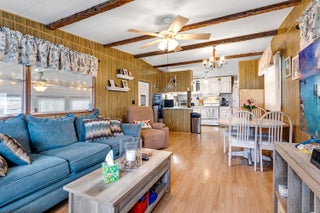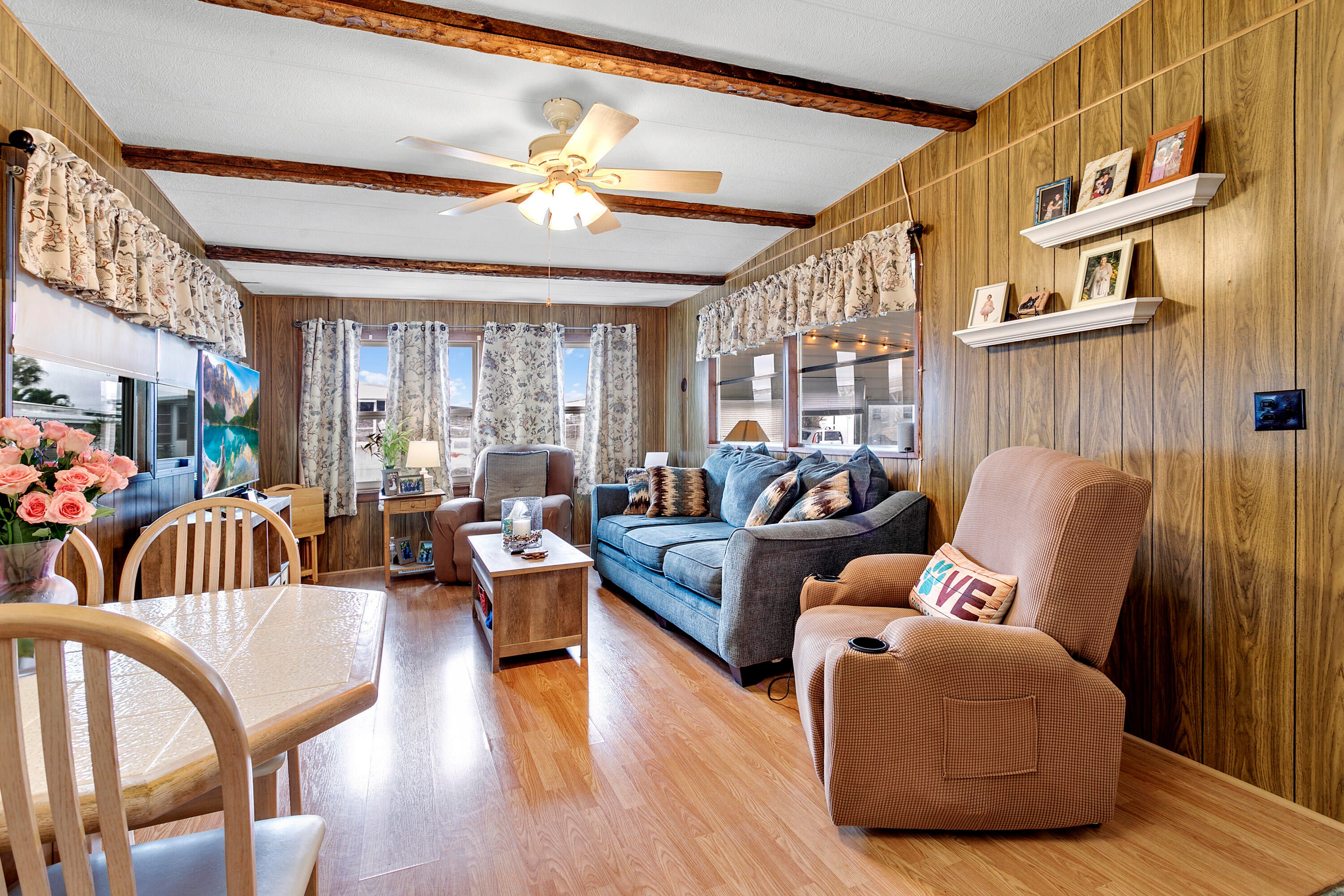Cute 2 Bedroom 1 Bathroom Home in desirable 55+ Community. Manned Gated Community with plenty of activities. Enjoy Shuffleboard, Heated Pools, Bingo, Cards, Dances, Pot Luck Dinners, Game Nights and so much more. This home has laminate Flooring throughout, Vaulted Ceiling in the Living Room with Decorative Beams, Newer Windows, Kitchen with breakfast bar. Enjoy your spacious Florida Room for additional living space. 2nd bedroom perfect for guest room or office. Main Bedroom has entrance to Bathroom. Bathroom has Step Shower. Ramp has been installed for side entrance. Also a Shed for even more storage. This is a great Snowbird getaway or a home for someone looking to downsize and start traveling. Easy to Maintain and great location within the park. Community is located closeto the Beaches and plenty of Shopping and Dining to enjoy.
