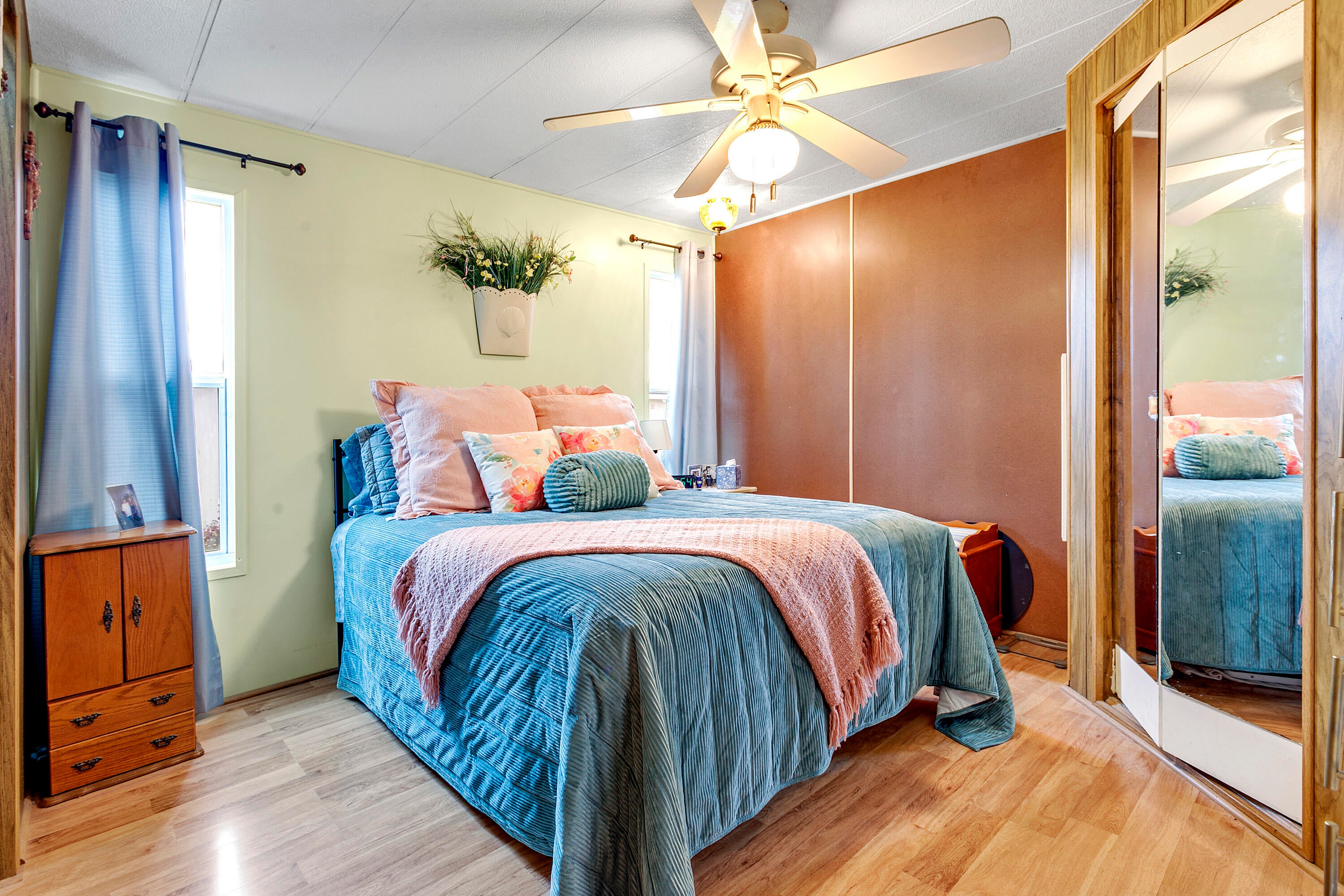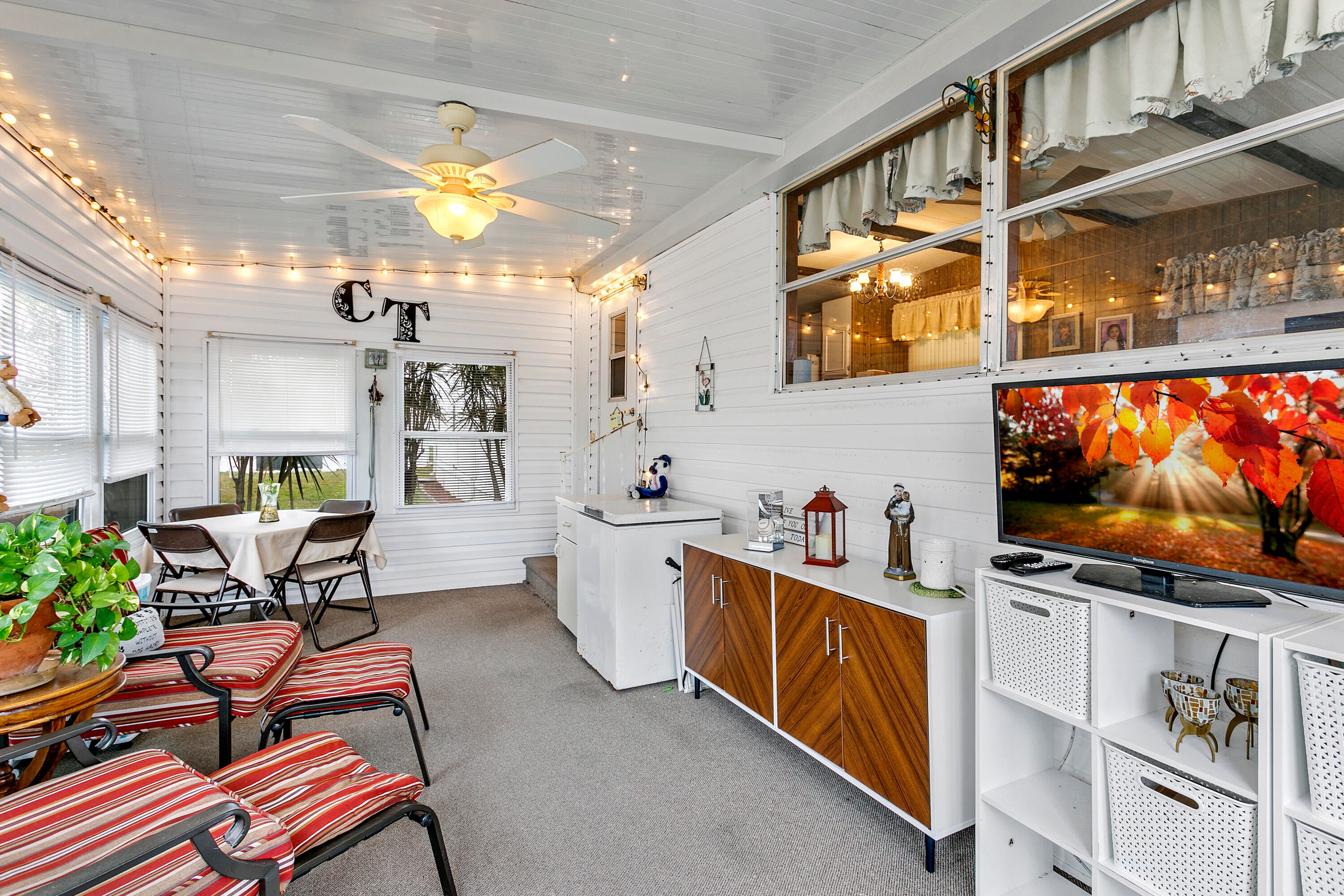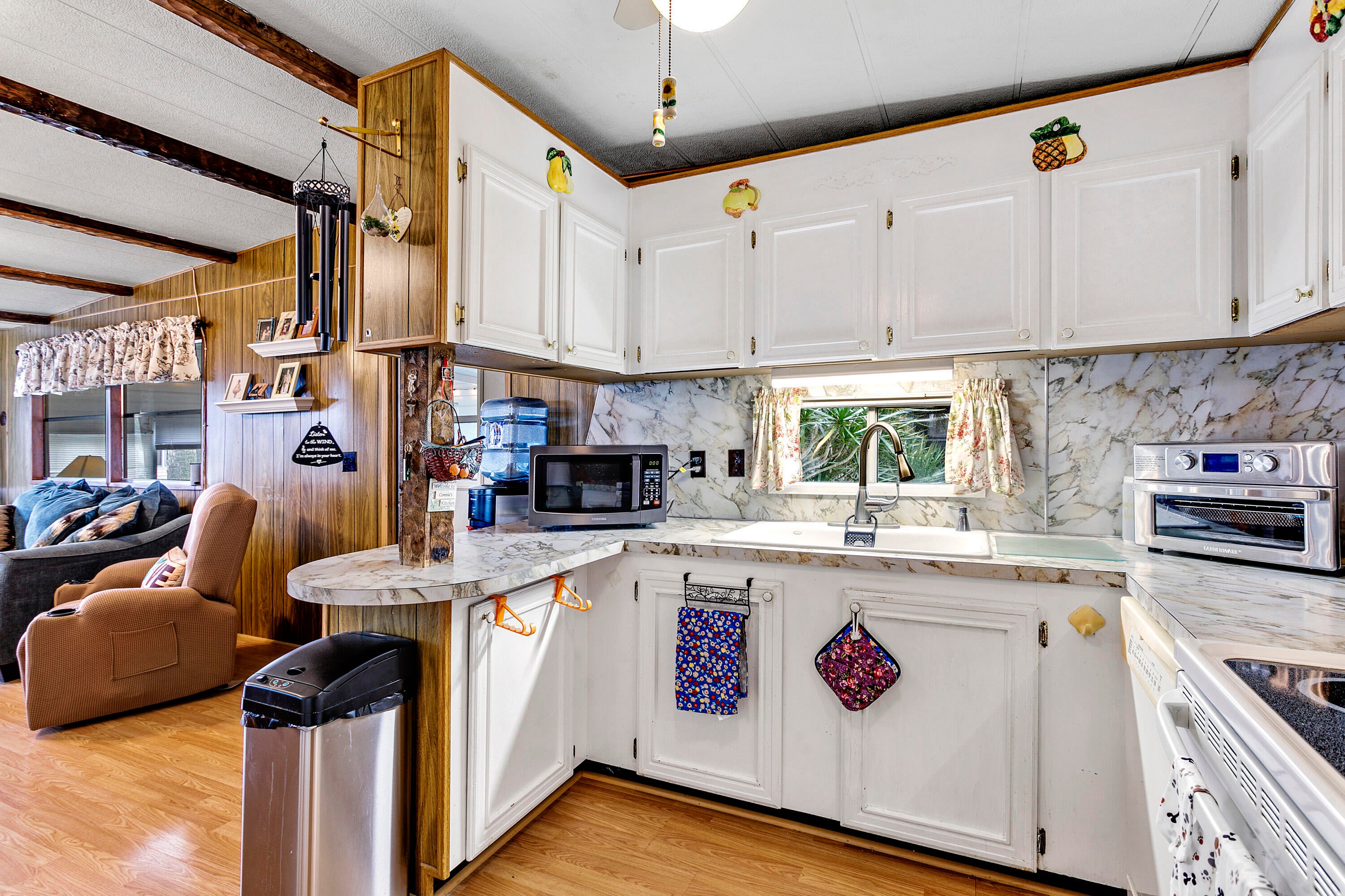 Cute 2 Bedroom 1 Bathroom Home in desirable 55+ Community. Manned Gated Community with plenty of activities. Enjoy Shuffleboard, Heated Pools, Bingo, Cards, Dances, Pot Luck Dinners, Game Nights and so much more. This home has laminate Flooring throughout, Vaulted Ceiling in the Living Room with Decorative Beams, Newer Windows, Kitchen with breakfast bar. Enjoy your spacious Florida Room for additional living space. 2nd bedroom perfect for guest room or office. Main Bedroom has entrance to Bathroom. Bathroom has Step Shower. Ramp has been installed for side entrance. Also a Shed for even more storage. This is a great Snowbird getaway or a home for someone looking to downsize and start traveling. Easy to Maintain and great location within the park. Community is located closeto the Beaches and plenty of Shopping and Dining to enjoy.