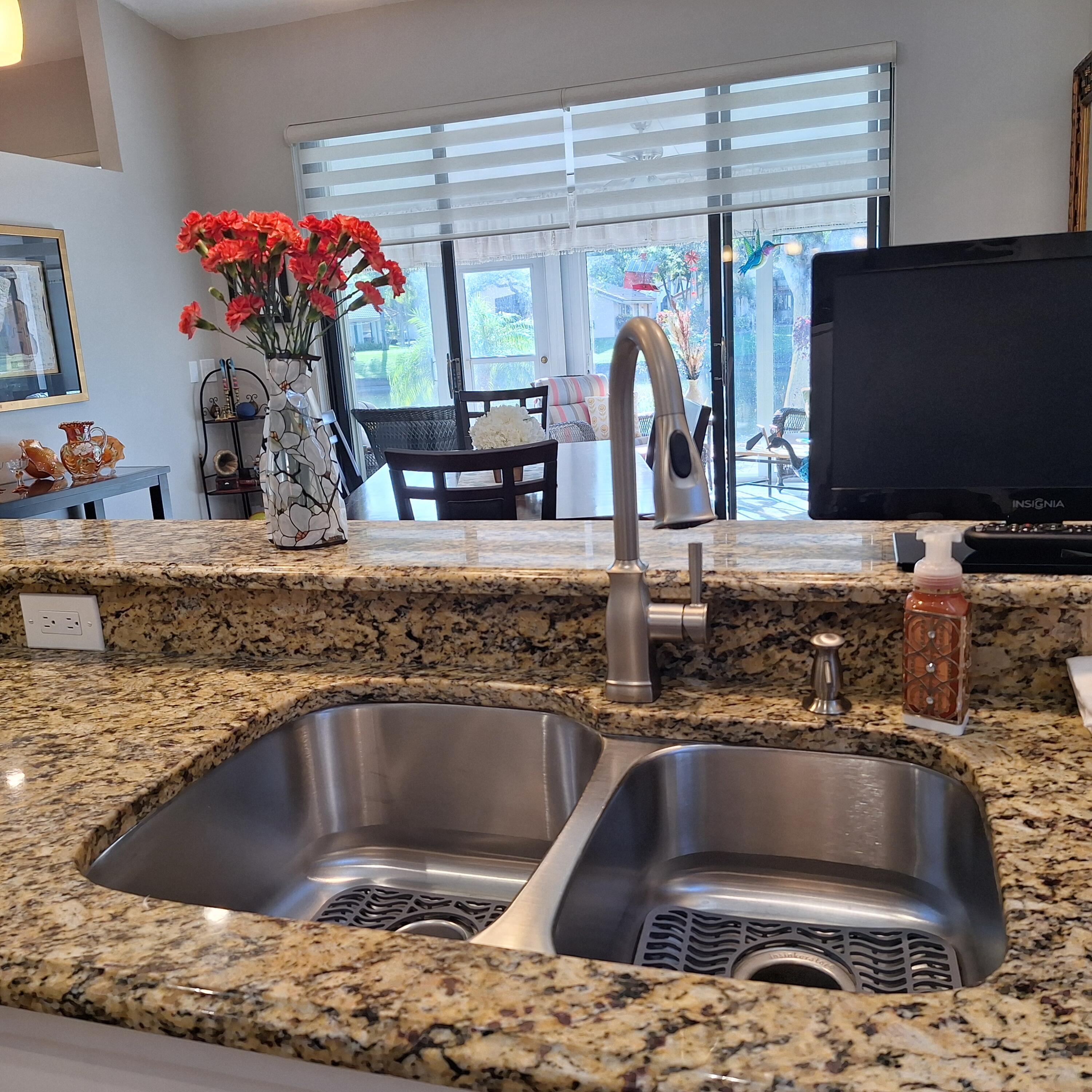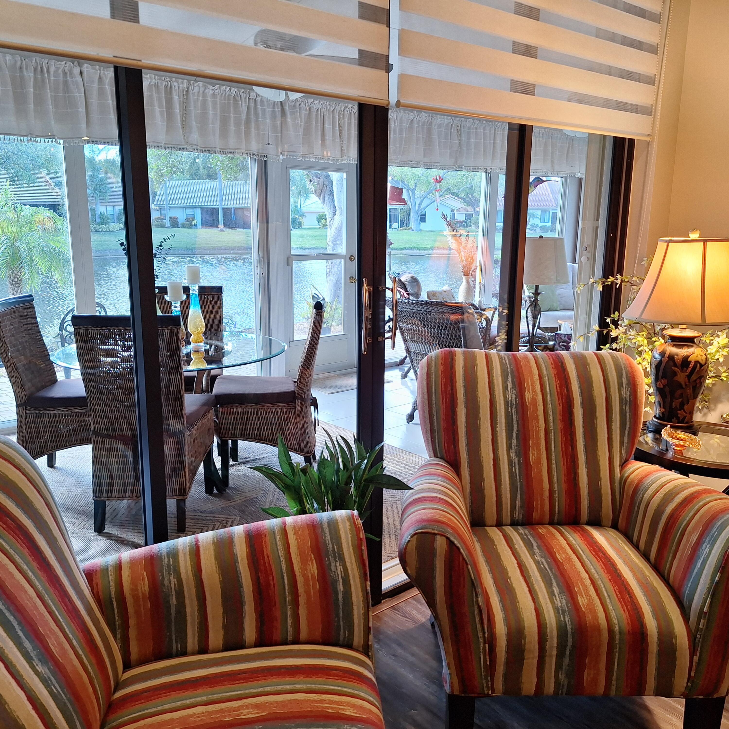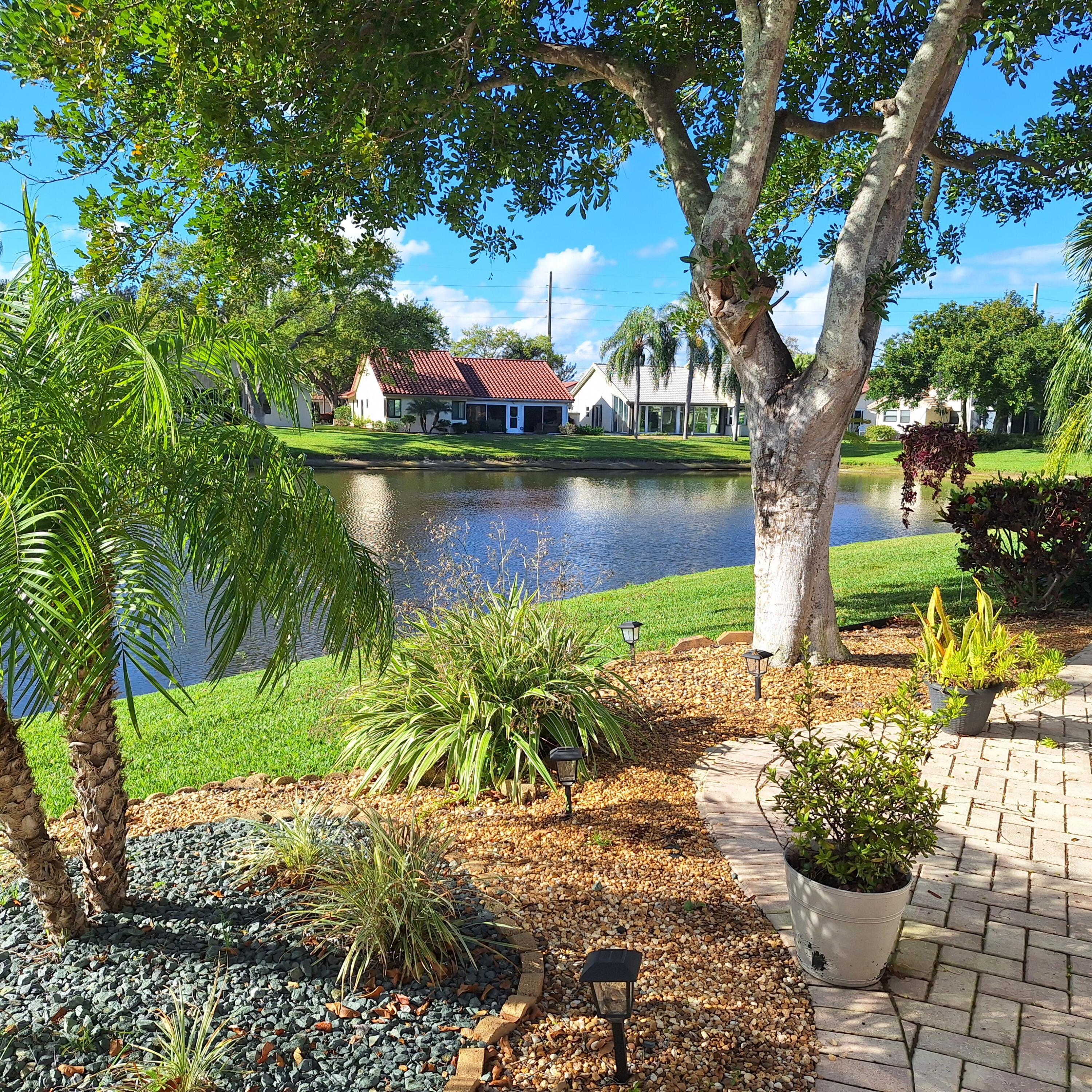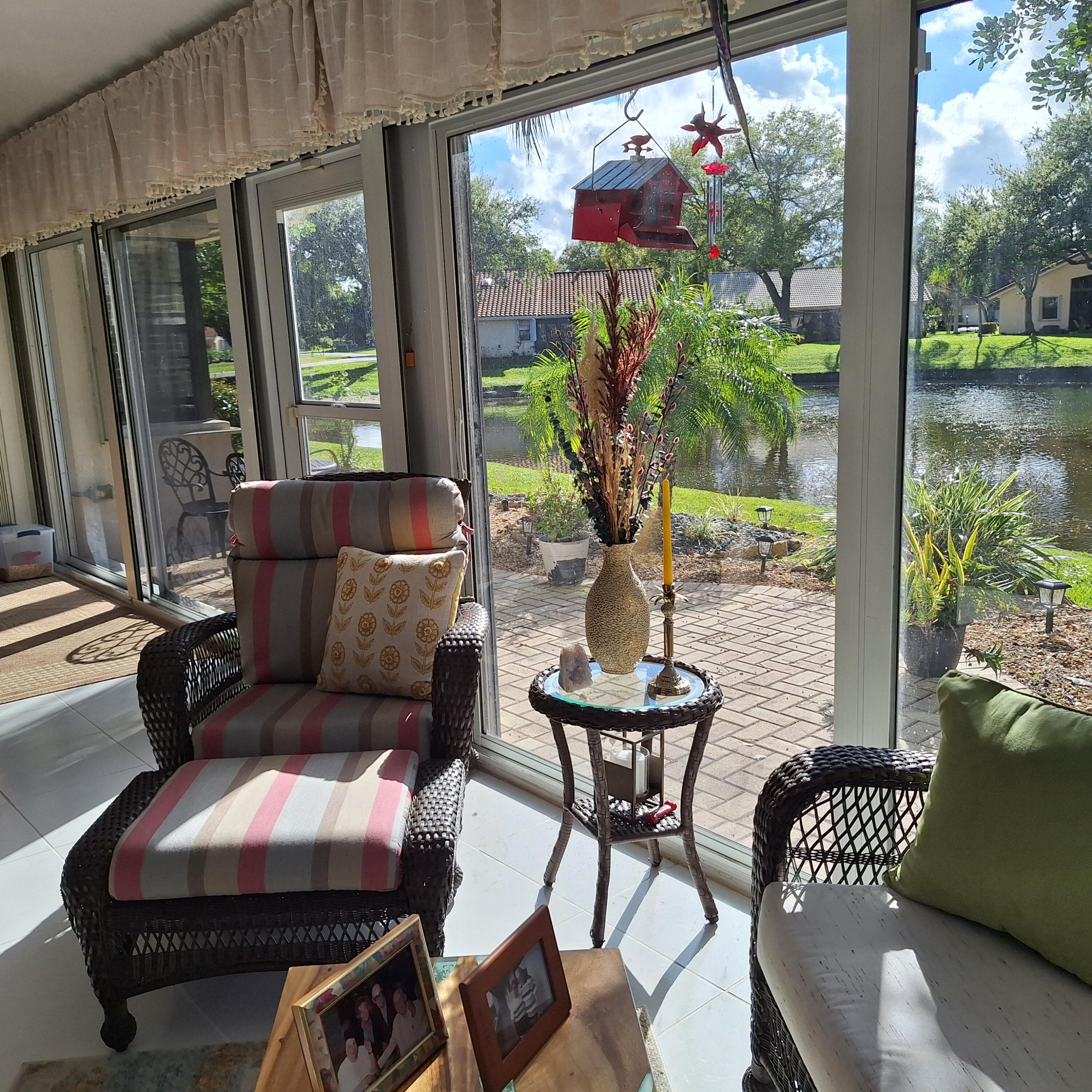 Stunning, spacious 3 bedroom 2 bathroom ''Seamist Model'' snuggled in Palm Shores. This meticulous home boasts large rooms, vaulted ceilings, recessed lighting, new floors, custom window treatments, walk-in closets and ceiling fans in every room. Brand new A/C and electric panel were installed in June 2024. The open kitchen is a gourmet chef's delight with cabinets galore, granite counters, a double oven, two sinks and stainless steel appliances. Garage has built in shelves, a workbench and a ladder leading to extra attic storage space. Accordian shutters cover all windows for maximum hurricane protection. Relax in the tranquil glassed-in lanai overlooking the lake and the designer garden. Come enjoy the welcoming clubhouse and the dynamic activities in this 55+ community.