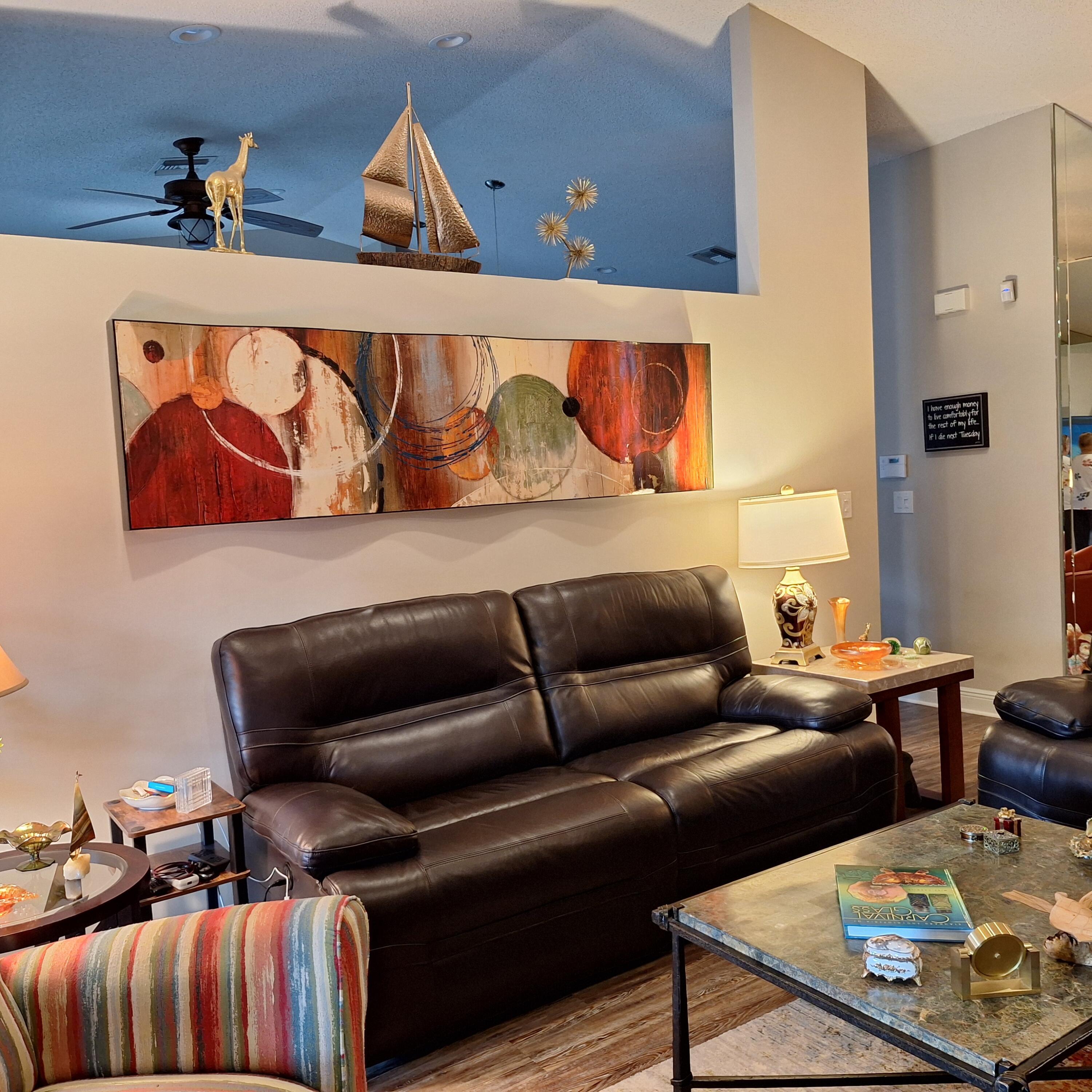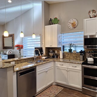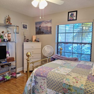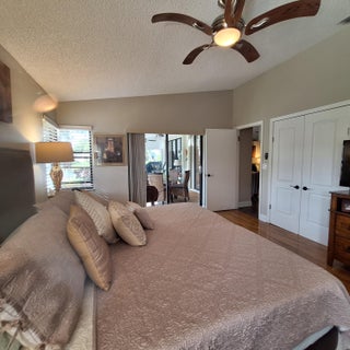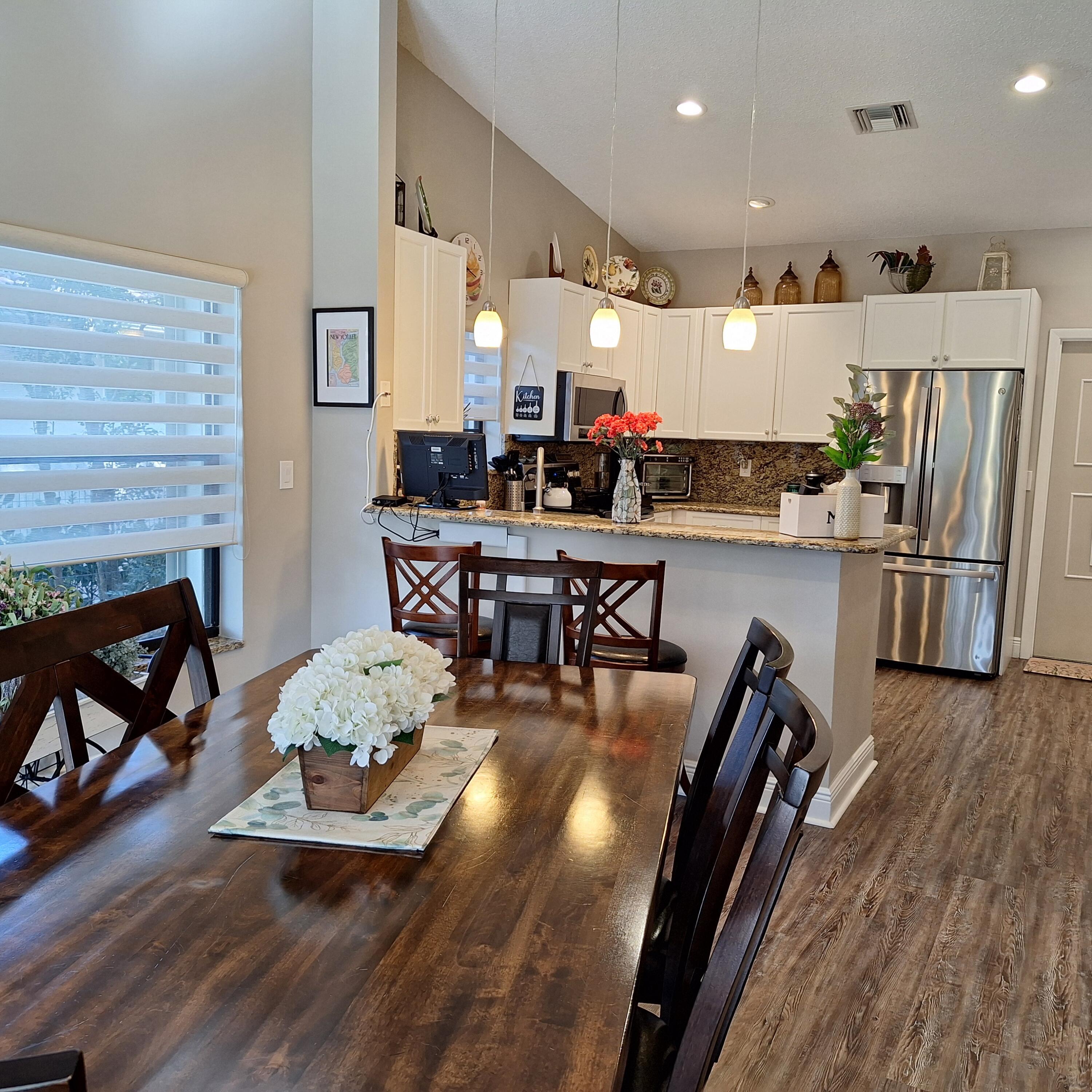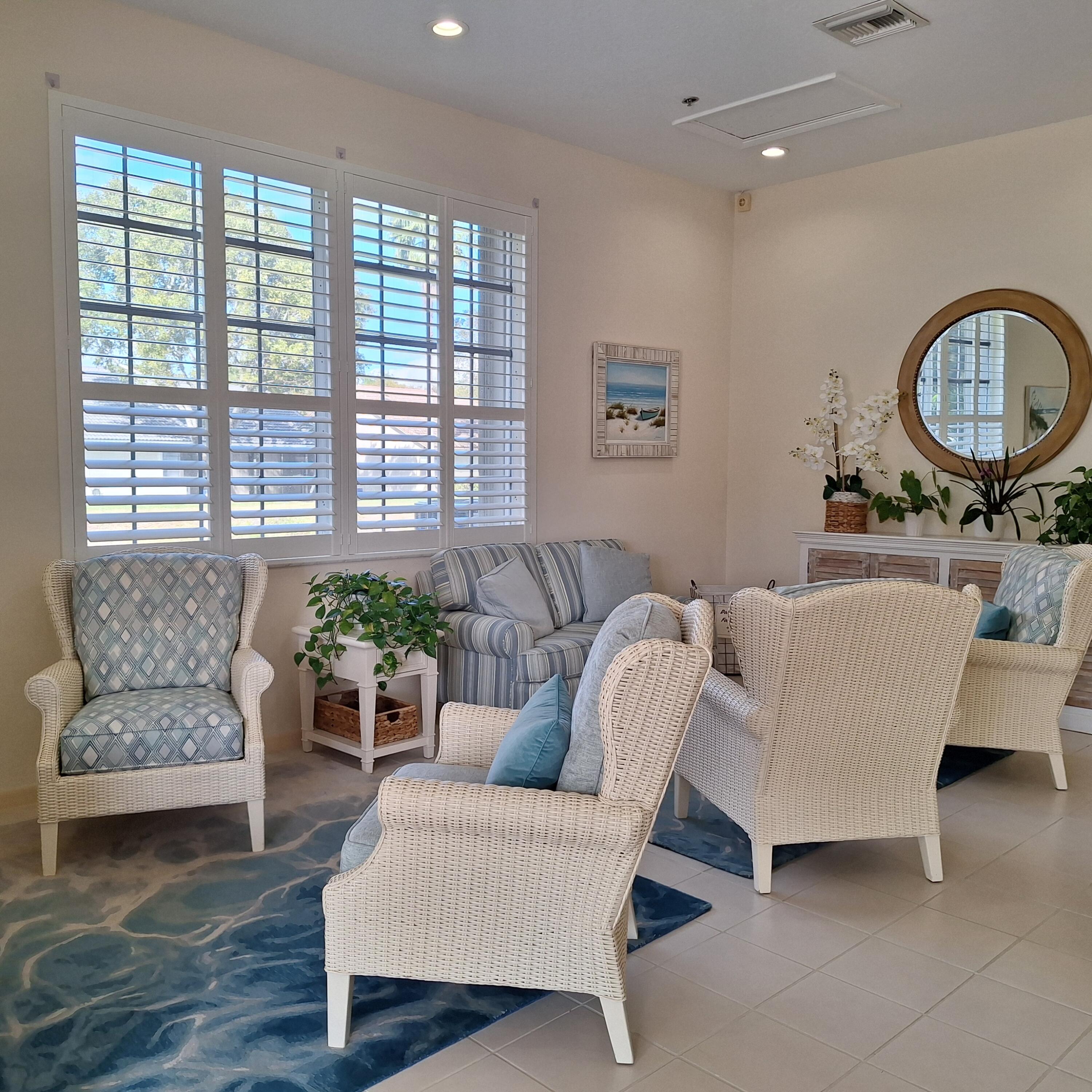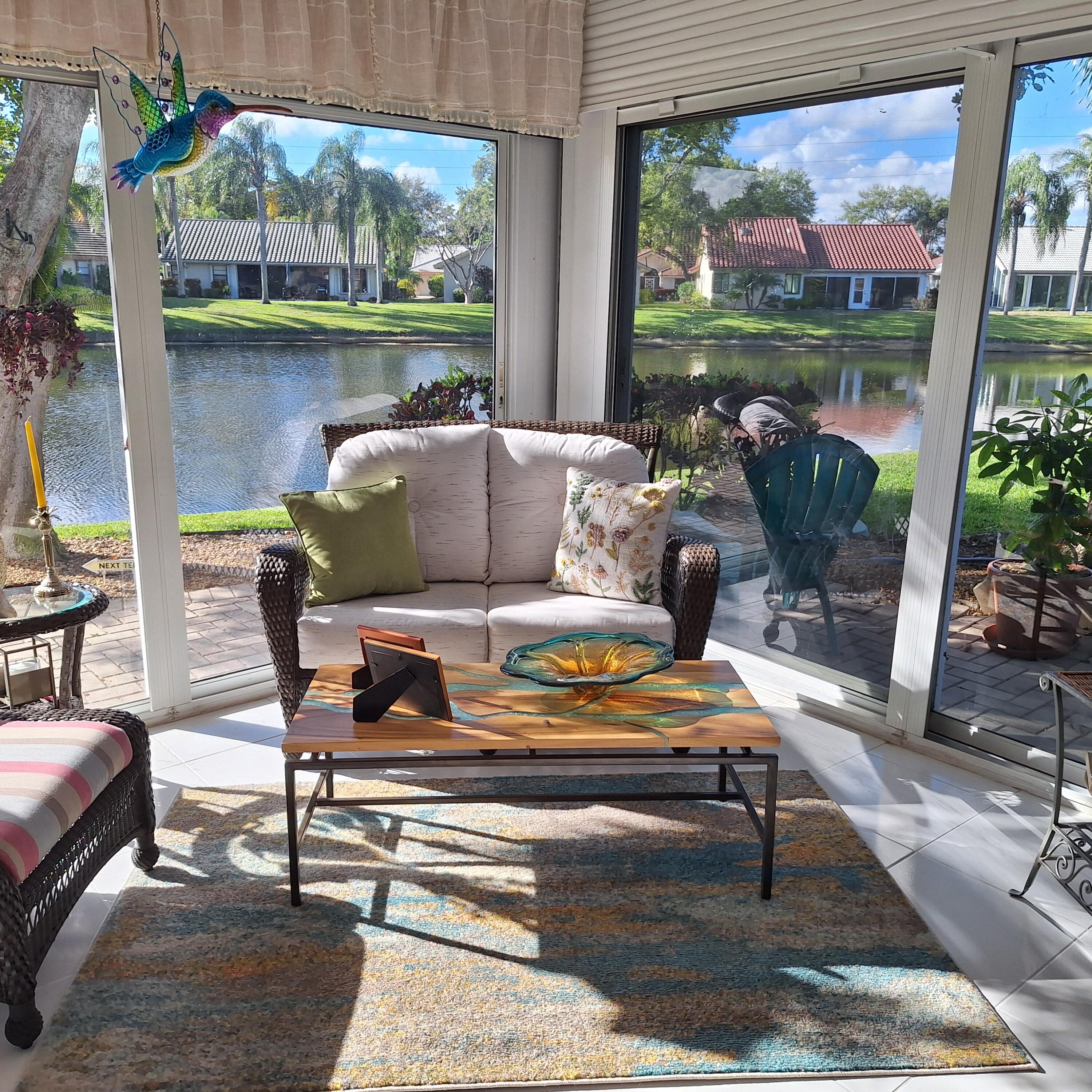 Stunning, spacious 3 bedroom 2 bathroom ''Seamist Model'' snuggled in Palm Shores. This meticulous home boasts large rooms, vaulted ceilings, recessed lighting, new floors, custom window treatments, walk-in closets and ceiling fans in every room. Brand new A/C and electric panel were installed in June 2024. The open kitchen is a gourmet chef's delight with cabinets galore, granite counters, a double oven, two sinks and stainless steel appliances. Garage has built in shelves, a workbench and a ladder leading to extra attic storage space. Accordian shutters cover all windows for maximum hurricane protection. Relax in the tranquil glassed-in lanai overlooking the lake and the designer garden. Come enjoy the welcoming clubhouse and the dynamic activities in this 55+ community.