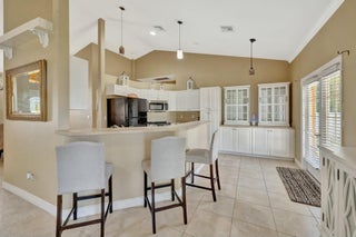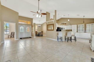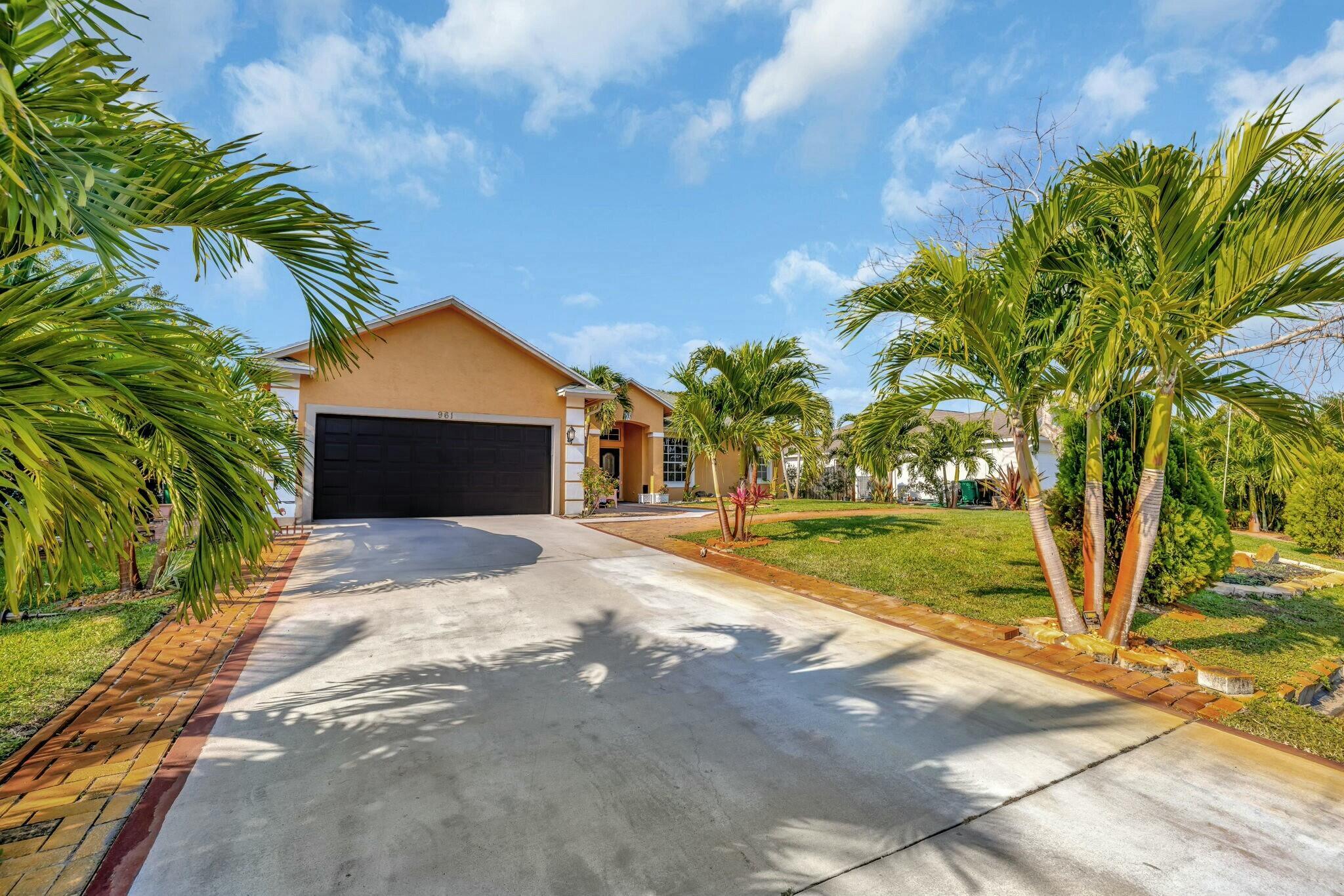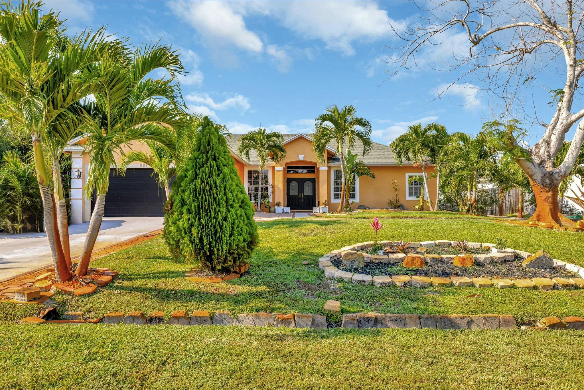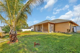 This beautiful 3BR, 2BTH CBS home with den/office in Port Saint Lucie near Becker awaits you. There is tile throughout main areas with wood laminate in secondary bedrooms and bamboo in Master. Black and stainless appliances in kitchen and a beautiful pantry. Once you enter the home you will see the open living room with formal dining area and breakfast/bar area off the kitchen. This home has vaulted ceiling with fans and HUGE Master B/R with his/her walk-in closet. Master bath has Roman tub, glass walk-in shower and dual sinks. Large screened tiled open patio, privacy fence. Quiet street and great location with easy access to I-95 & Turnpike. Great area with everything close by. Come see for yourself. make an appointment. Mature fruit trees. Mangoes and coconut