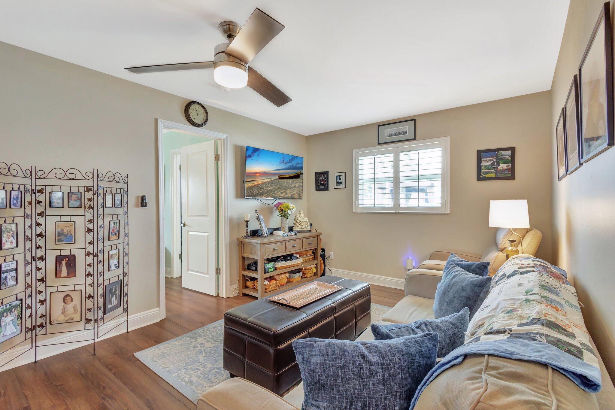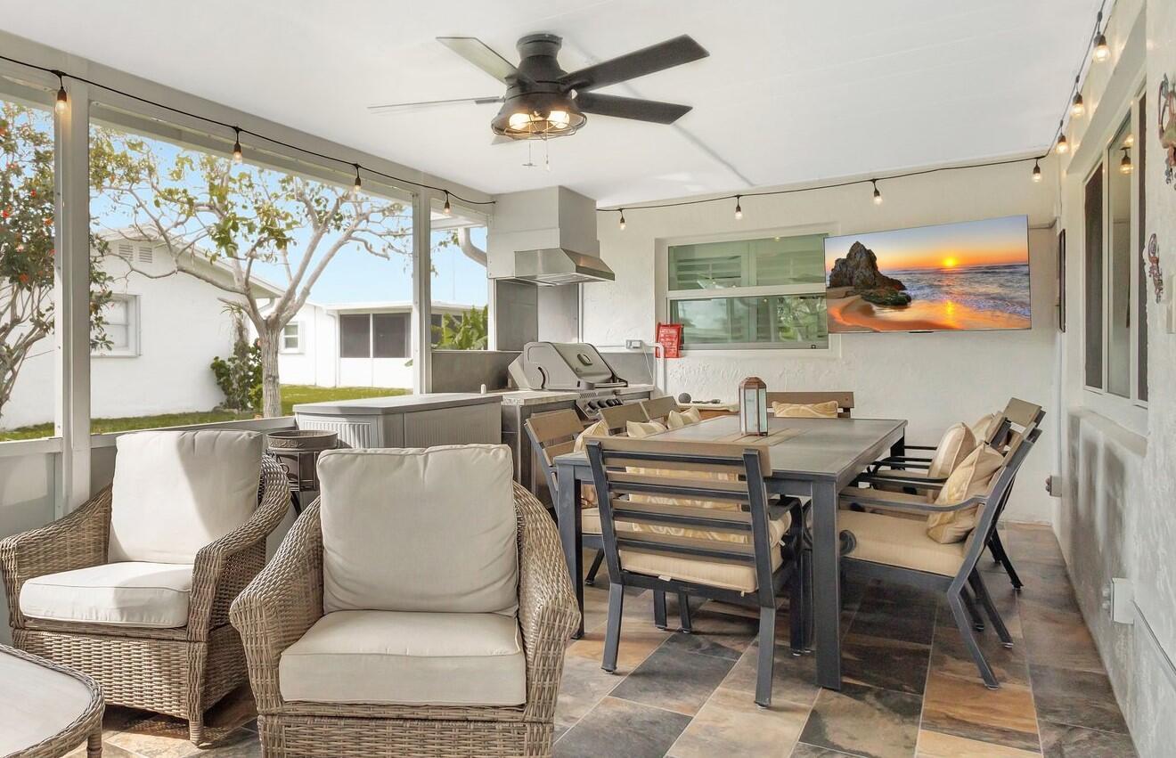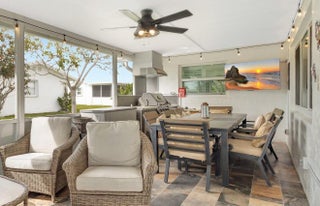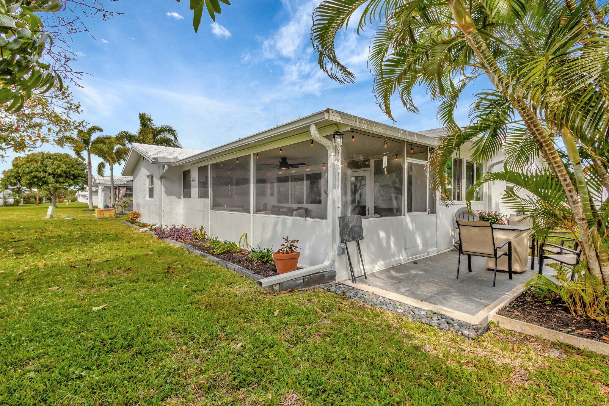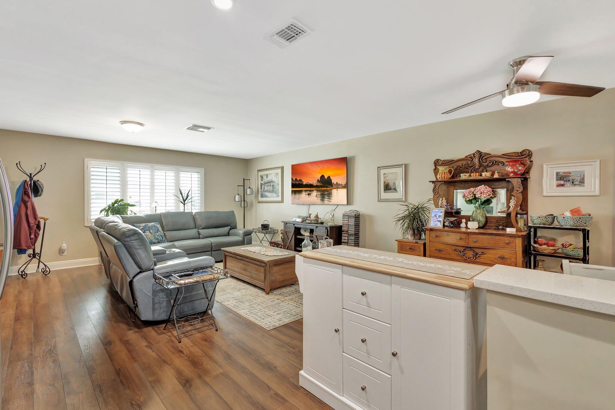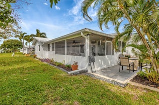 Step into this Beautifully Upgraded 2-bedroom, 2-bathroom home featuring a Den, Office and Dining room. Hurricane-impact Doors and Windows complete with Plantation Shutters provide privacy, security and peace of mind throughout the home. The Challenger Model is the largest style in the community with an Open Floor Plan. The kitchen has been upgraded with Shaker Cabinets, Quartz Counter Tops and Stainless Appliances and attached to the large Dining Area, perfect for those large family dinners. The Master Suite boasts a walk-in closet and a luxurious en-suite bathroom with double sinks and step-in shower. Brand-new luxury vinyl plank flooring flows seamlessly throughout the home, adding elegance and durability. The oversized Screened-in Patio featuring a large Flat Screen TV, NapoleonPropane Gas Grill with Overhead Exhaust, Granite Counter Tops and Stainless Steel Cabinetry. Enjoy the Tropical Landscape or Gather around the outdoor fire pit on chilly evenings, making this home perfect for year-round enjoyment. Full List of Home Improvements: " New air-conditioning unit installed in 2024. " Google Nest thermostat. " New flat roof over porch area in 2023 " Interior ceilings and walls painted in 2022. " Installed ceiling fans w/ lights in both bedrooms, the den, and the kitchen area. " Installed plantation shutters in both bedrooms in 2024 to add to the existing plantation shutters on all the other interior windows. " All new LVP flooring throughout the home (minus the 2 bathrooms, which are tile) " Closed in back porch with ½ walls and bug screens, added a new screened exit door. " Installed a granite countertop on the porch with stainless steel storage compartments underneath and a drop-in Napoleon propane gas grill with an overhead exhaust and light. " Floor in the porch is completely tiled with outdoor ceramic tile. " Added a ceiling fan and light with extra outlets on porch, " Approx. 10 x 14 porcelain tile patio outside of the screened in porch. " Closed in a roughly 9 x 9 room with a wall, 2 impact resistant sliding windows, Norman blinds, and another wall with a large window that looks into the finished porch, and a security door. Room is also finished with LVP flooring that matches the rest of the house. Also installed an overhead light with fan. This room is used as an office. " Tiled the backsplash in the kitchen that was previously sheetrock. " Installed a new Whirlpool dishwasher in 2024. " New 16-panel garage door installed in 2025. " Roof was professionally cleaned in 2025. " All existing landscaping was replaced with new bushes and plants in 2022. " All new lighting installed in front of house: Lights on either side of the garage, up-lighting on the palm trees and a light on the corner of the back porch - all with dusk-to-dawn bulbs. " Garage floor has an epoxy coating.