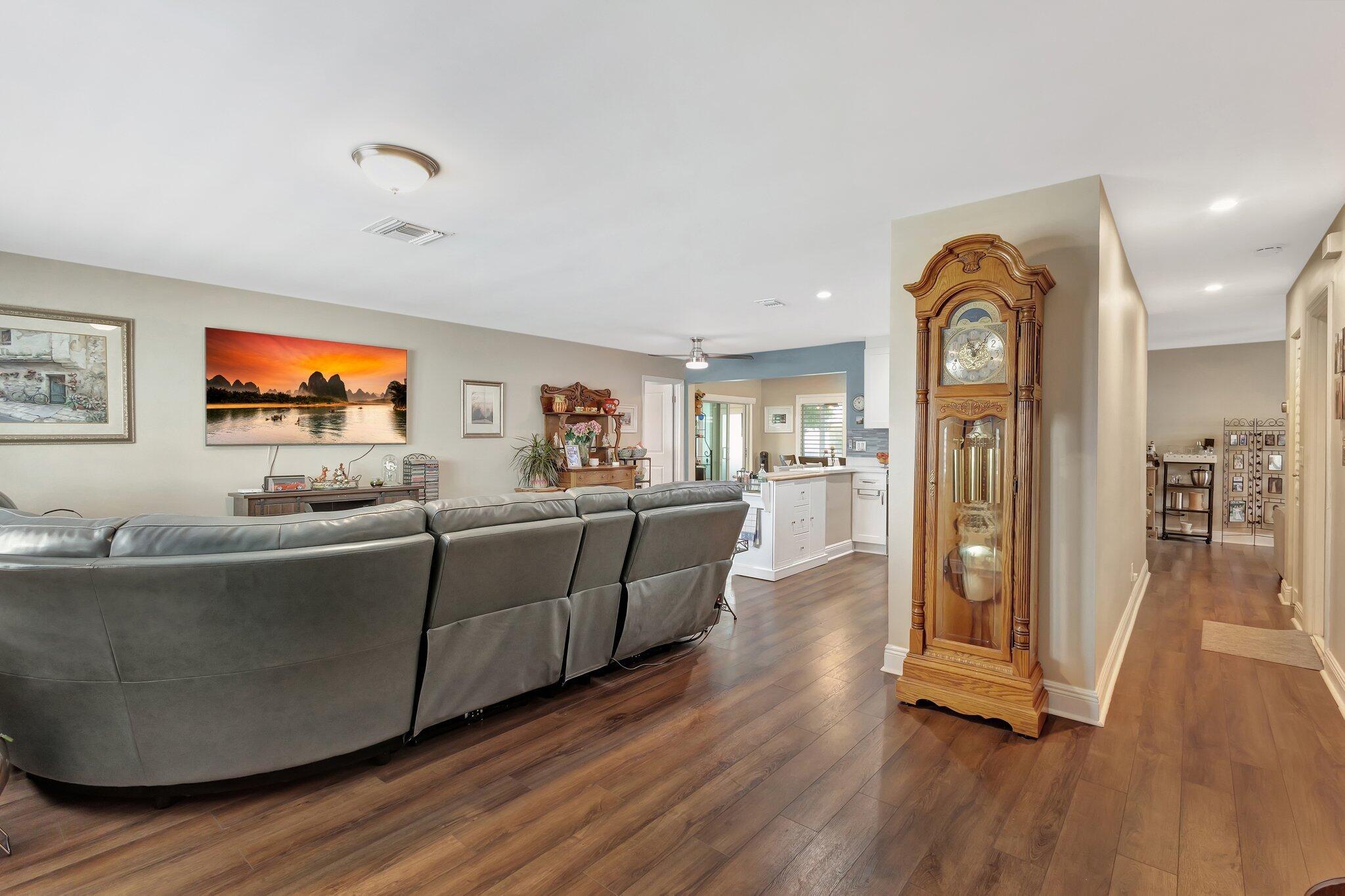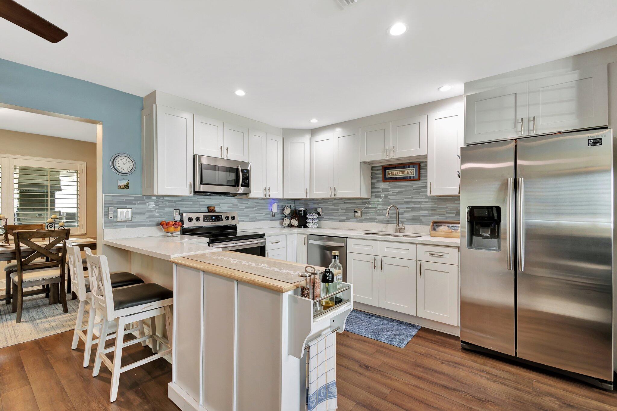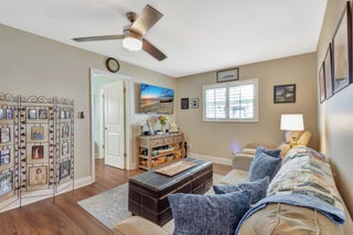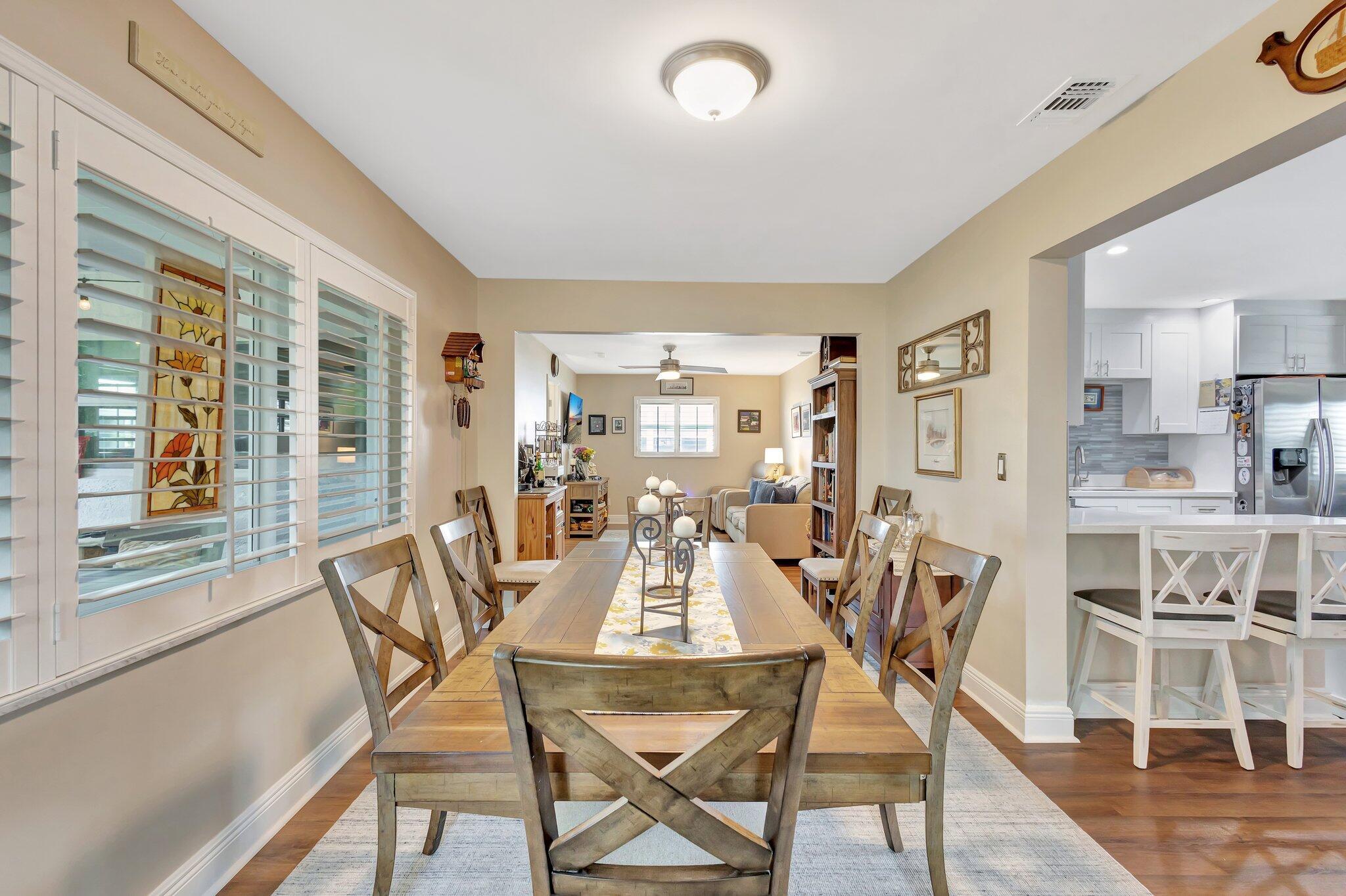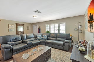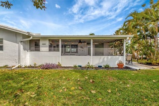 Step into this Beautifully Upgraded 2-bedroom, 2-bathroom home featuring a Den, Office and Dining room. Hurricane-impact Doors and Windows complete with Plantation Shutters provide privacy, security and peace of mind throughout the home. The Challenger Model is the largest style in the community with an Open Floor Plan. The kitchen has been upgraded with Shaker Cabinets, Quartz Counter Tops and Stainless Appliances and attached to the large Dining Area, perfect for those large family dinners. The Master Suite boasts a walk-in closet and a luxurious en-suite bathroom with double sinks and step-in shower. Brand-new luxury vinyl plank flooring flows seamlessly throughout the home, adding elegance and durability. The oversized Screened-in Patio featuring a large Flat Screen TV, NapoleonPropane Gas Grill with Overhead Exhaust, Granite Counter Tops and Stainless Steel Cabinetry. Enjoy the Tropical Landscape or Gather around the outdoor fire pit on chilly evenings, making this home perfect for year-round enjoyment. Full List of Home Improvements: " New air-conditioning unit installed in 2024. " Google Nest thermostat. " New flat roof over porch area in 2023 " Interior ceilings and walls painted in 2022. " Installed ceiling fans w/ lights in both bedrooms, the den, and the kitchen area. " Installed plantation shutters in both bedrooms in 2024 to add to the existing plantation shutters on all the other interior windows. " All new LVP flooring throughout the home (minus the 2 bathrooms, which are tile) " Closed in back porch with ½ walls and bug screens, added a new screened exit door. " Installed a granite countertop on the porch with stainless steel storage compartments underneath and a drop-in Napoleon propane gas grill with an overhead exhaust and light. " Floor in the porch is completely tiled with outdoor ceramic tile. " Added a ceiling fan and light with extra outlets on porch, " Approx. 10 x 14 porcelain tile patio outside of the screened in porch. " Closed in a roughly 9 x 9 room with a wall, 2 impact resistant sliding windows, Norman blinds, and another wall with a large window that looks into the finished porch, and a security door. Room is also finished with LVP flooring that matches the rest of the house. Also installed an overhead light with fan. This room is used as an office. " Tiled the backsplash in the kitchen that was previously sheetrock. " Installed a new Whirlpool dishwasher in 2024. " New 16-panel garage door installed in 2025. " Roof was professionally cleaned in 2025. " All existing landscaping was replaced with new bushes and plants in 2022. " All new lighting installed in front of house: Lights on either side of the garage, up-lighting on the palm trees and a light on the corner of the back porch - all with dusk-to-dawn bulbs. " Garage floor has an epoxy coating.