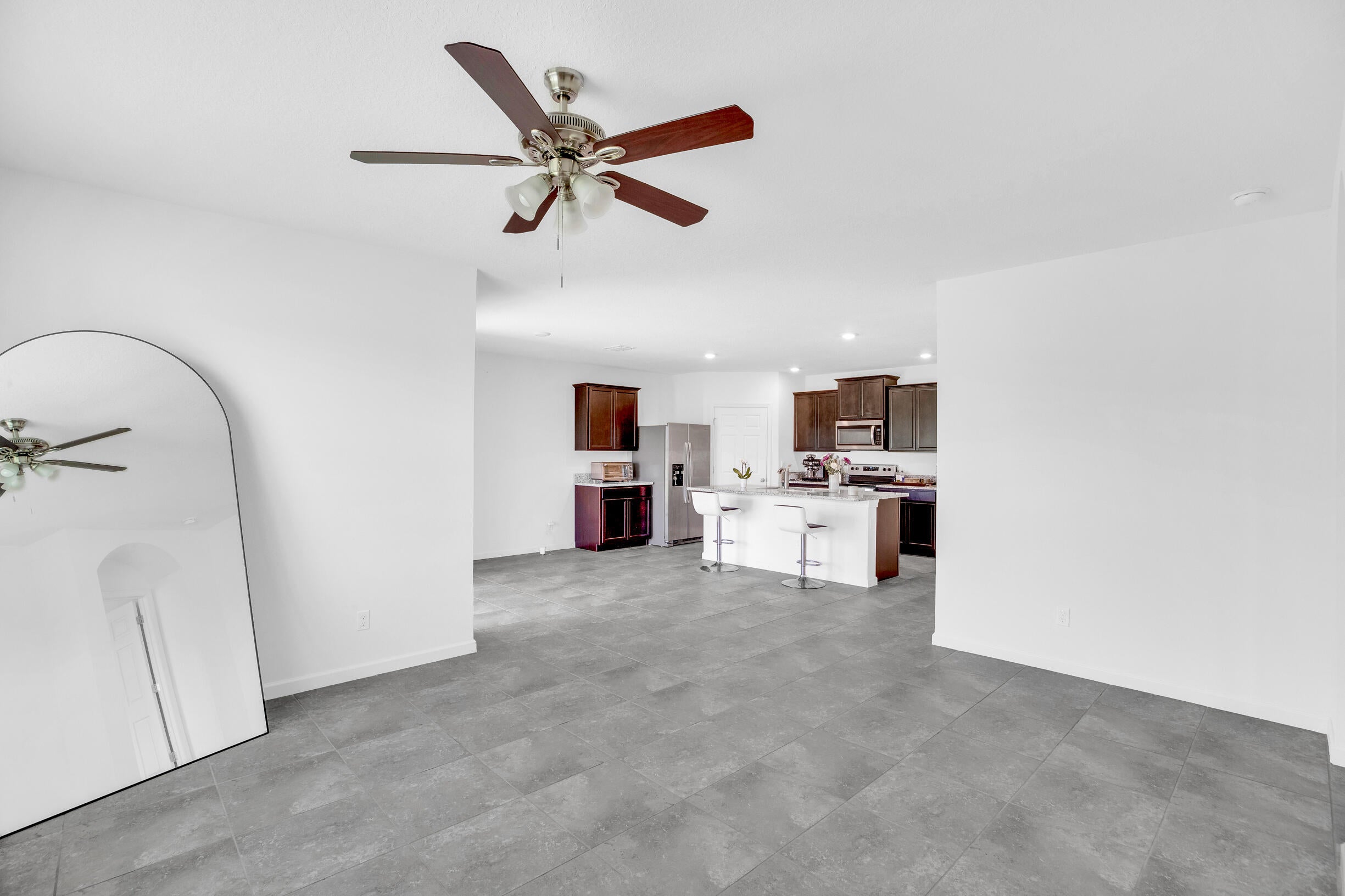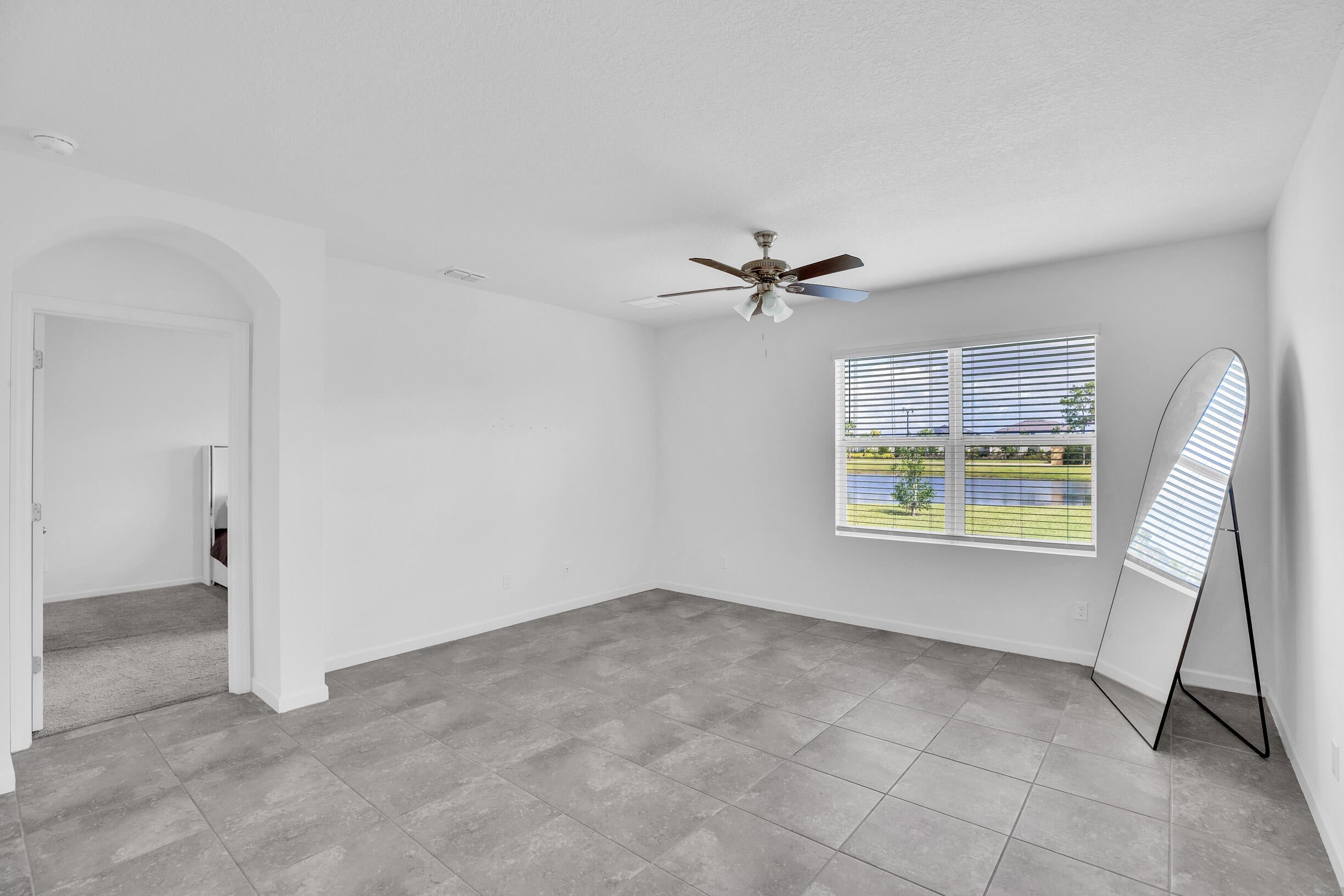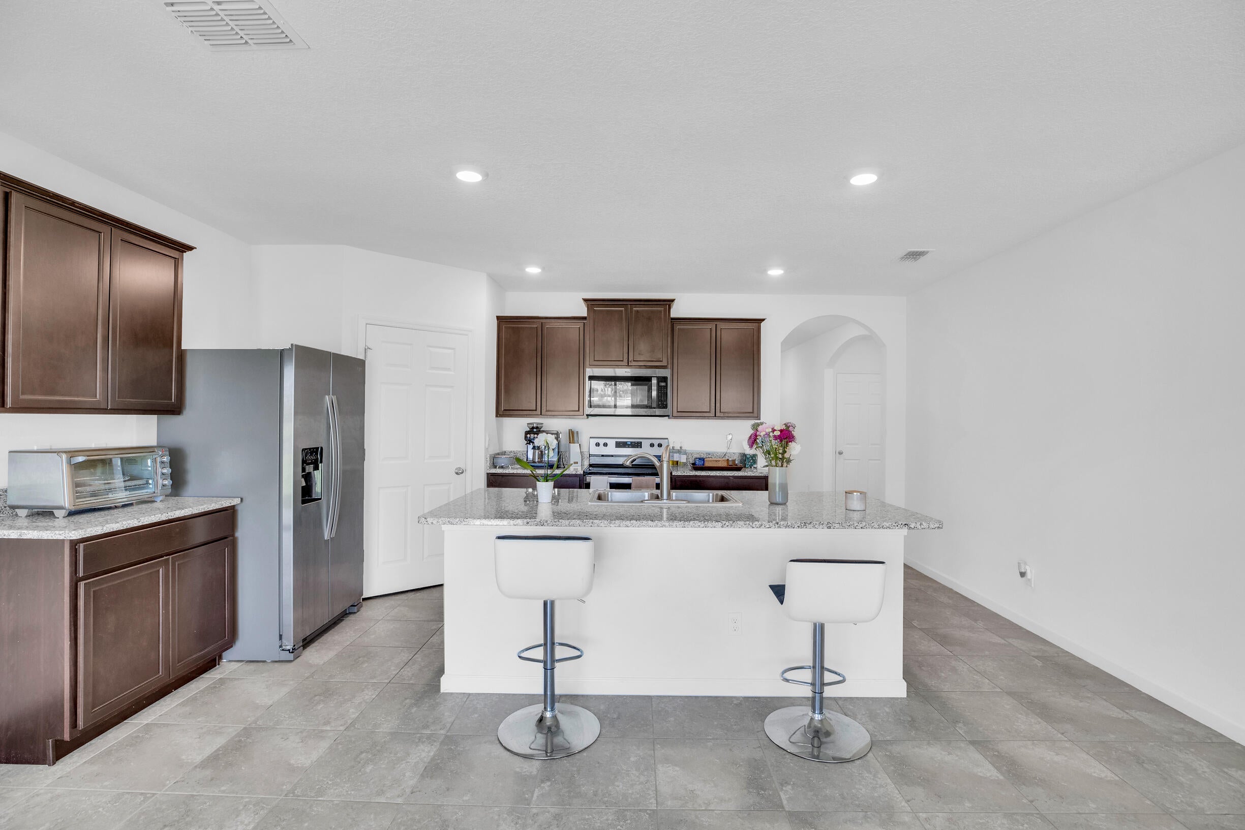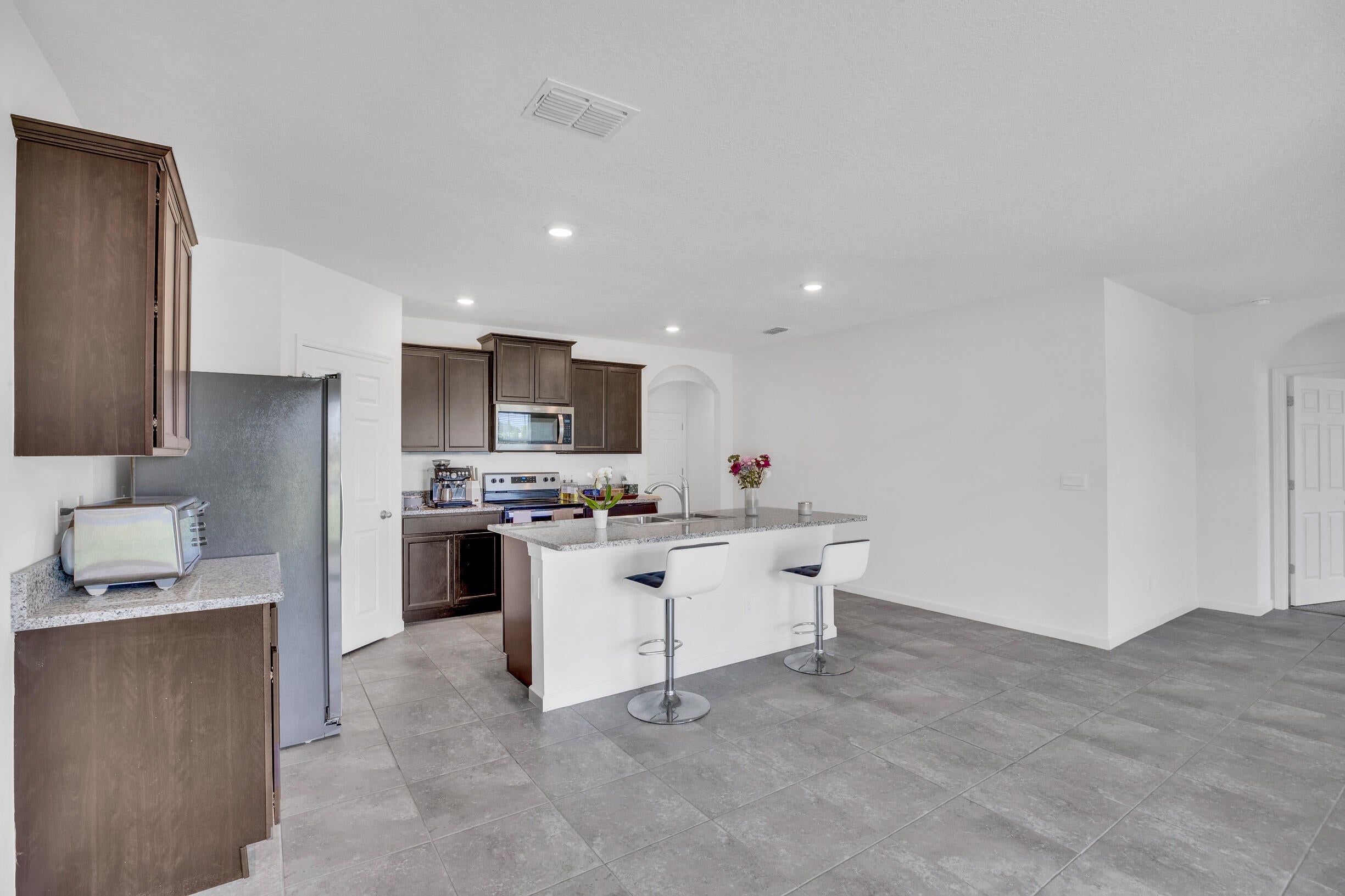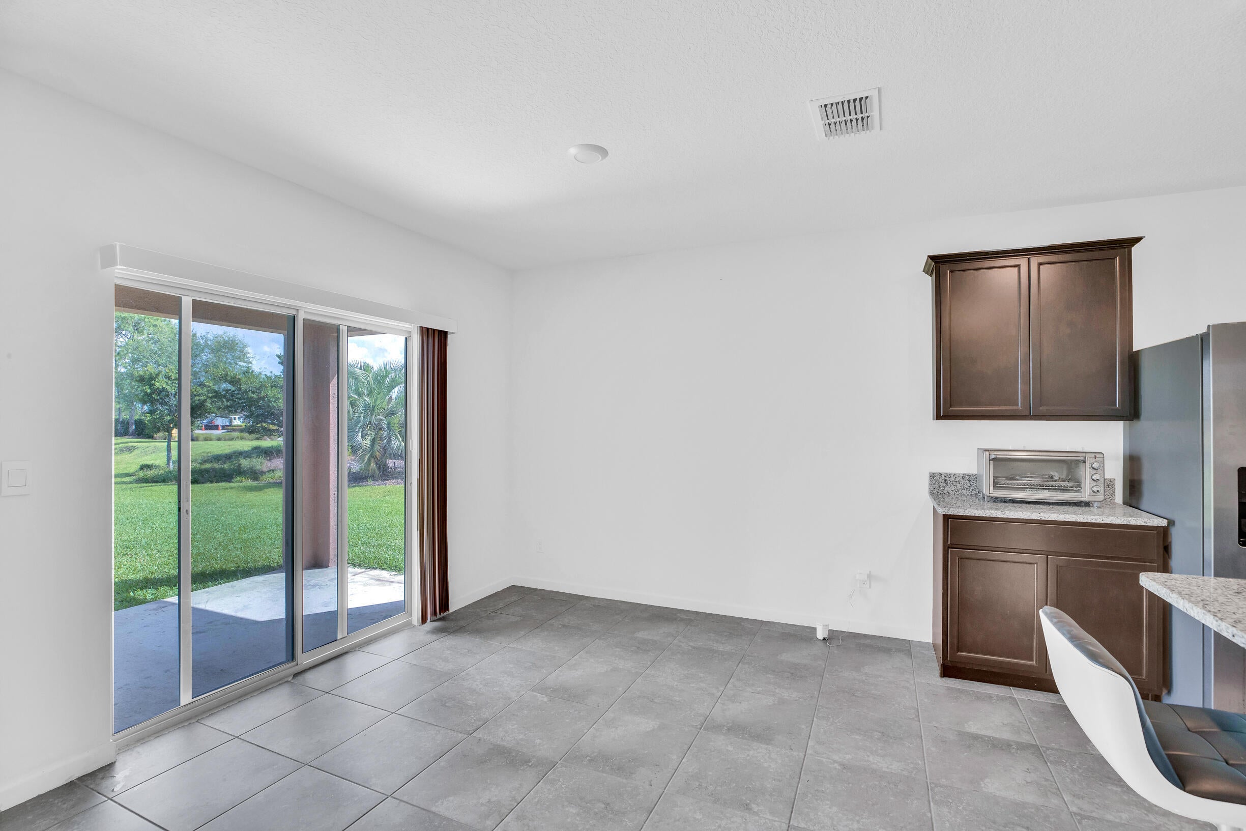 Single-family, ranch-style residence offers 4 bedrooms and 2 full bathrooms, in a comfortable living space of 1,828 square feet. Situated on a corner lot, the home features an open floor plan with ceramic tile flooring and granite countertops in the kitchen, complemented by stainless steel appliances and a pantry. The master bedroom is located at the rear of the home for added privacy, includes an en-suite bathroom with dual vanities, a separate shower, and a walk-in closet. Additional amenities include a two-car garage, a concrete tile roof, and an expansive backyard with room for a pool. The property offers picturesque lake views and is conveniently located near the community pool, dining options, shops, markets, a hospital, I-95, and the Florida Turnpike.