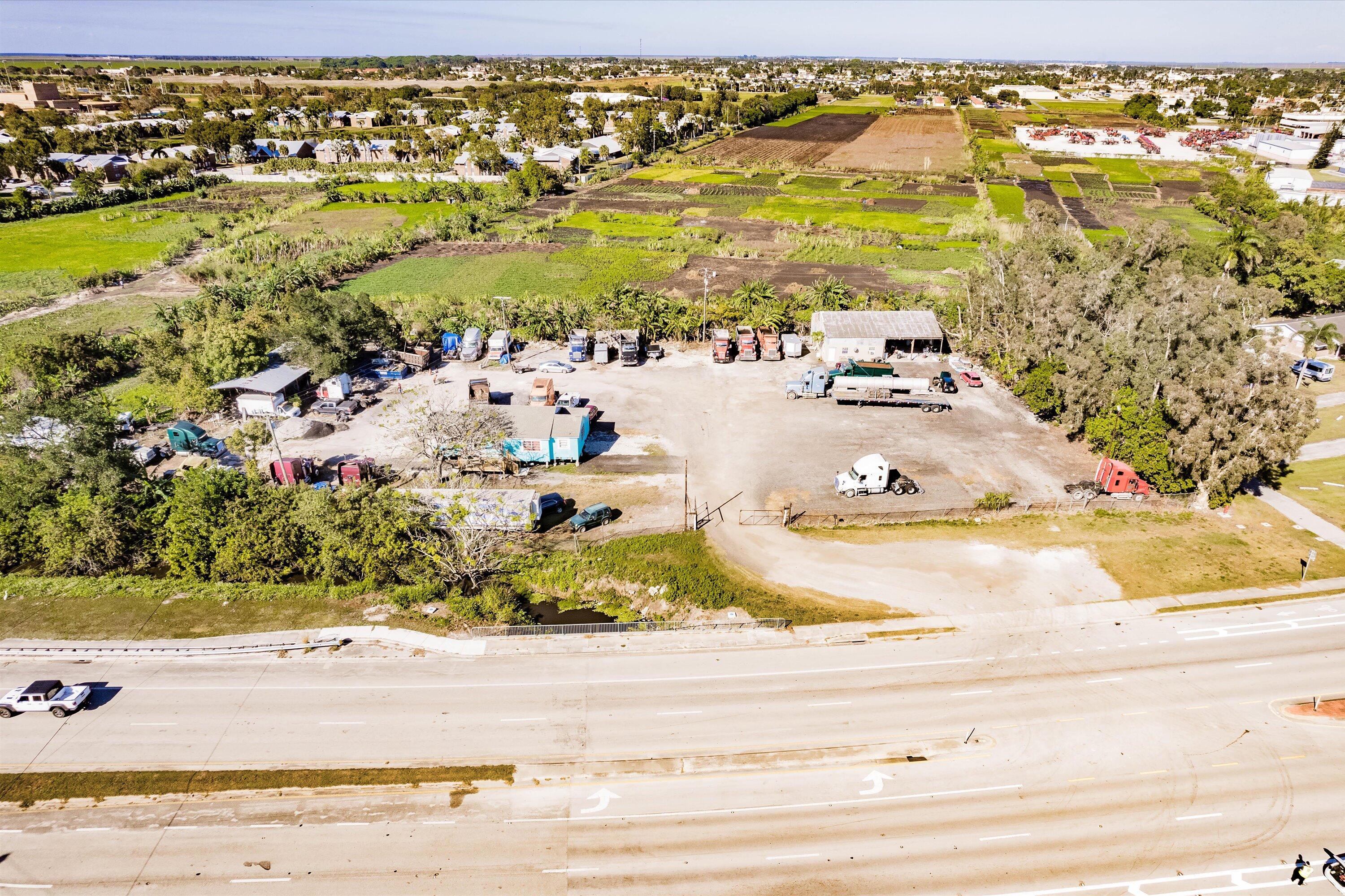 Investment opportunity. Presently use for commercial vehicle storage.For Sale three commercial lots with approximately 480 linear ft. of frontage on S. Main Street in Belle Glade totaling 1.86 acres to be sold as one. These are commercial properties in unincorporated Palm Beach County.Currently these lots are used for parking & storage of heavy equipment. The grounds have a stabilized subgrade & re-milled asphalt topping. It is fully fenced & there are three structures within the premises. One of the structures is a home/office of approx. 1,350 sq ft, one metal building & pole barn 2568 SF & 2240 SF sq ft used for maintenance & storage. Located on a major traffic roadway SR 80 in Palm Beach. Owners are leasing space to 33 Cabs & 6 Rigs, a Lawn Mowing company & Corn packing company.