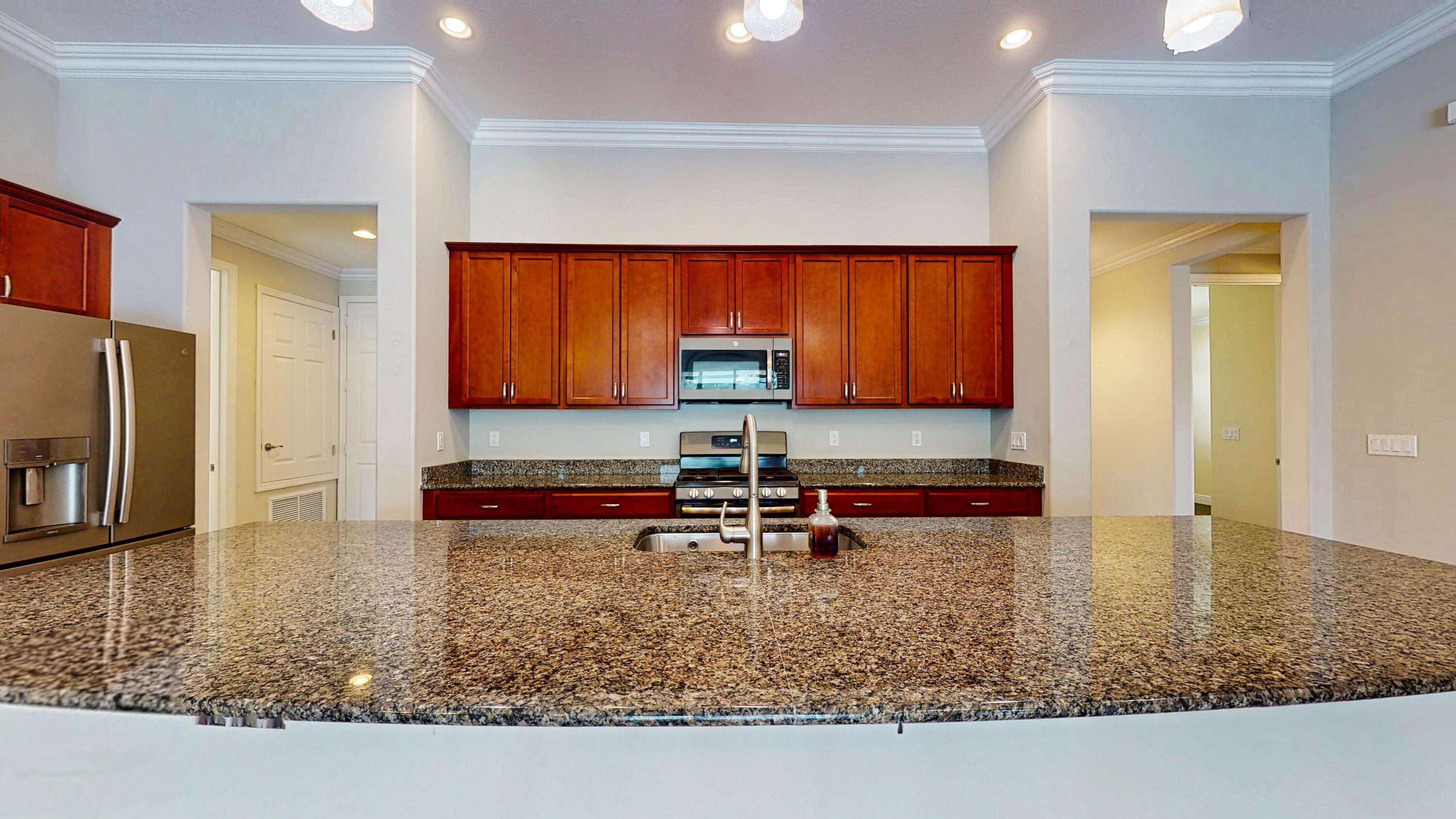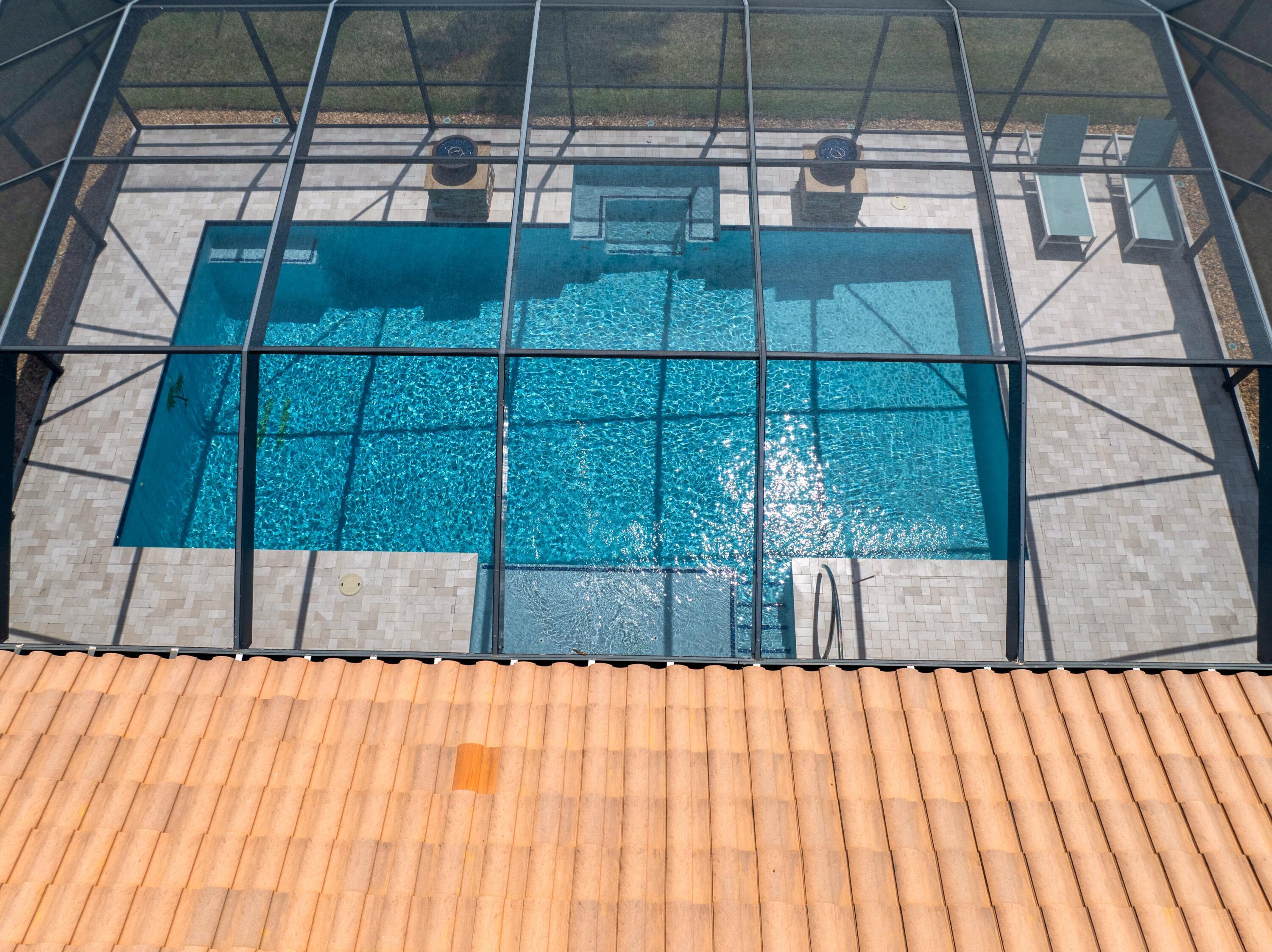This stunning 3-bedroom, 3-bathroom home in Vitalia at Tradition with a spacious den offers the perfect blend of indoor comfort and outdoor luxury, all set on one of the largest pie-shaped lots in the community. The showpiece of the property is the expansive lanai, featuring a remote-controlled storm shade and elegant travertine flooring, which frames a spectacular saltwater heated pool--your own private retreat designed for year-round enjoyment and entertaining. Inside, the home boasts just under 2,300 square feet of thoughtfully designed living space with a bright and open layout. The large kitchen, dining, and living area flow seamlessly together, centered around a massive kitchen island that's perfect for gathering. A chef's dream, the kitchen is equipped with42-inch cabinets, a natural gas range, and ample counter space, offering both style and functionality. This home offers dual oversized master suites, each with its own walk-in closet, dual vanities with his-and-her sinks, and modern stand-up showersideal for privacy, comfort, or multi-generational living. A third bedroom and full guest bath are located at the front of the home, providing a quiet and separate space for visitors. A spacious, versatile den adds even more flexibility, making an ideal home office, hobby room, gym, or media space. With its resort-style pool area, upgraded finishes, and unique lot size, this home is a rare gem that combines everyday convenience with exceptional outdoor living within stunning Vitalia at Tradition.