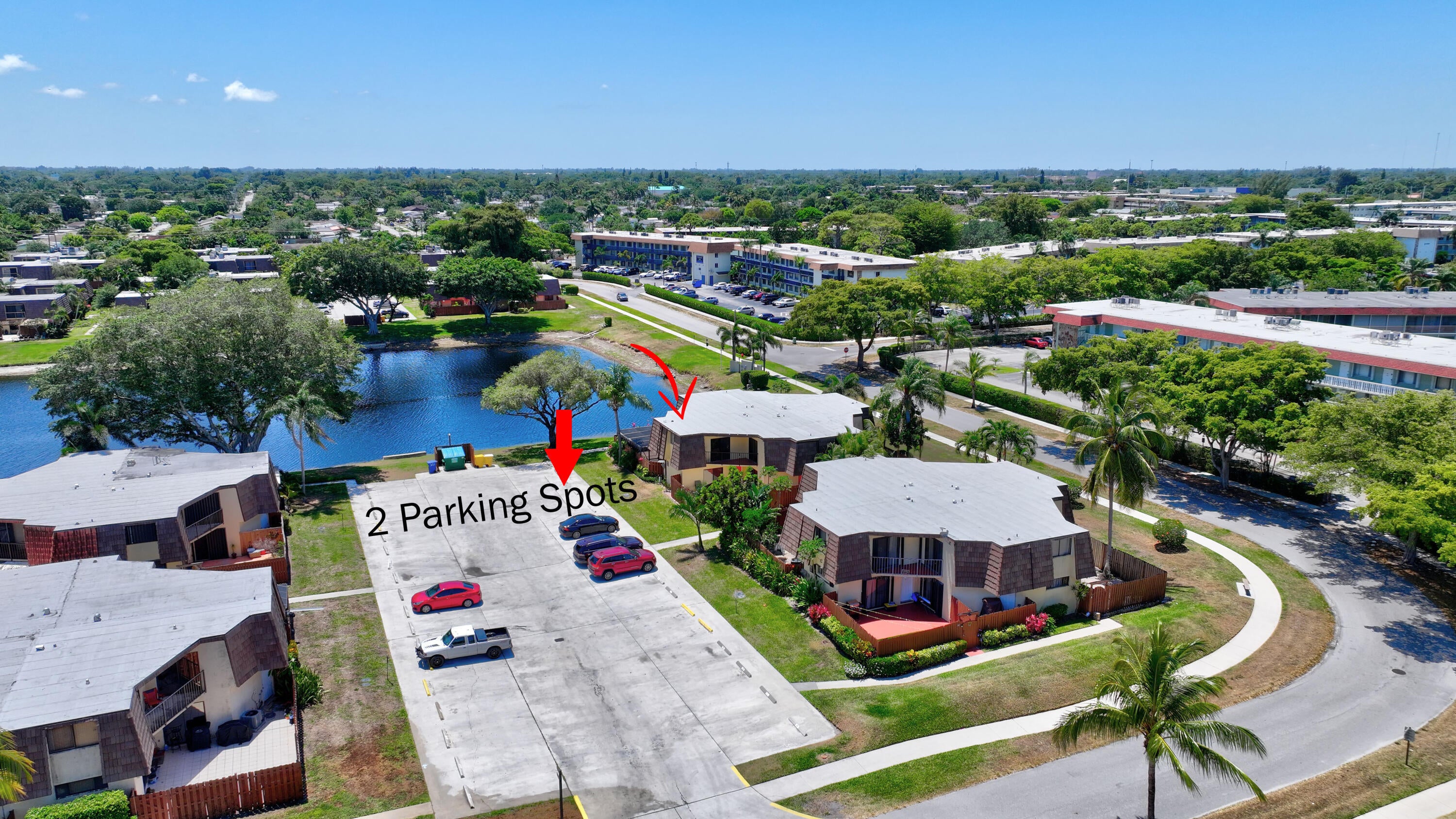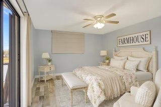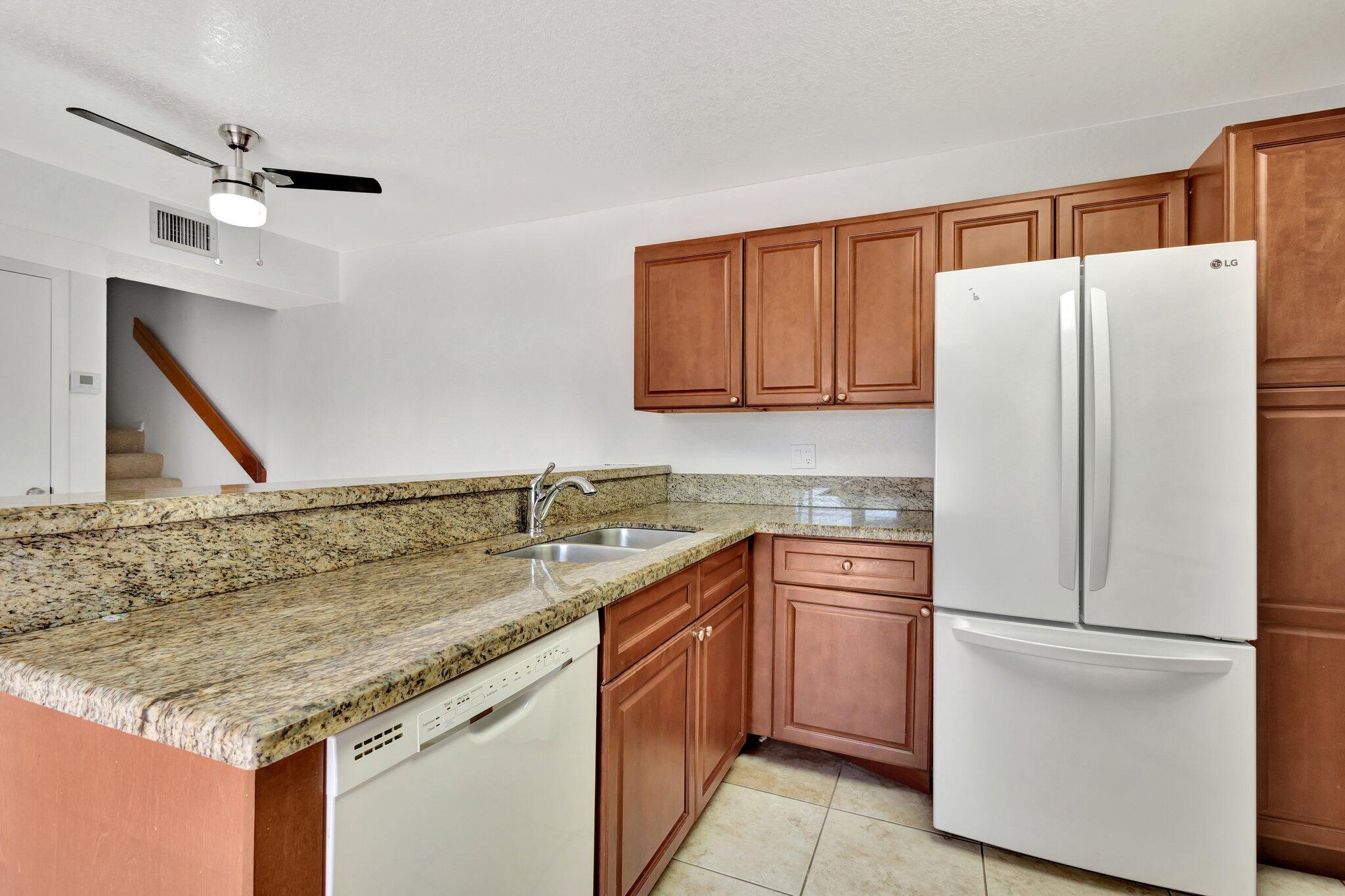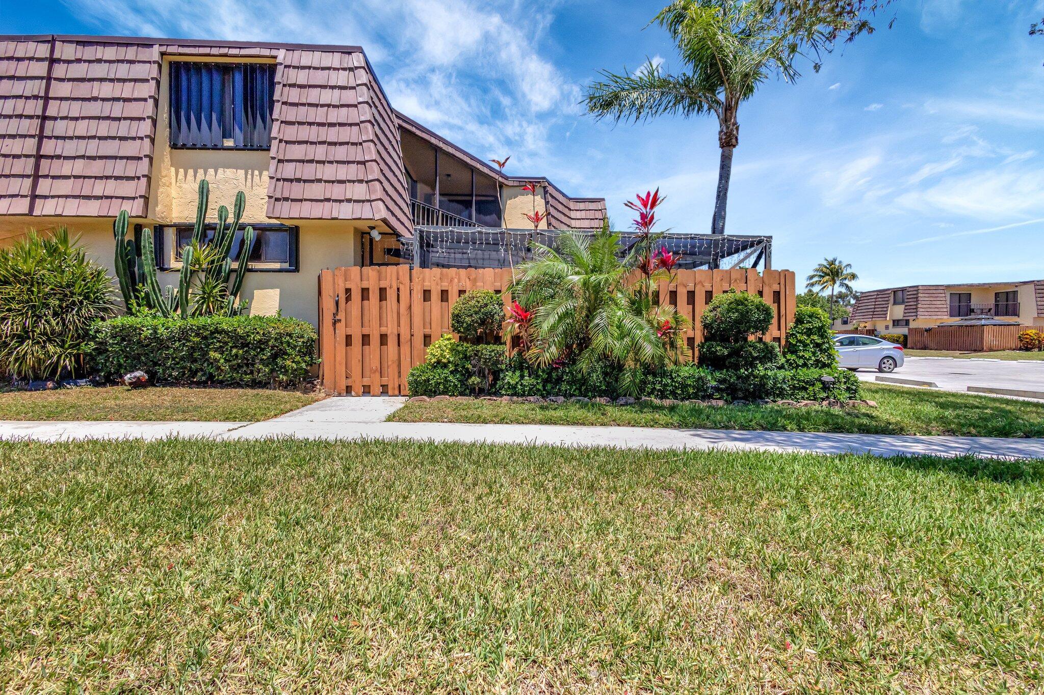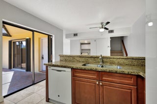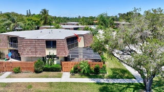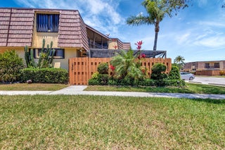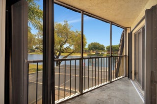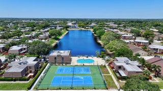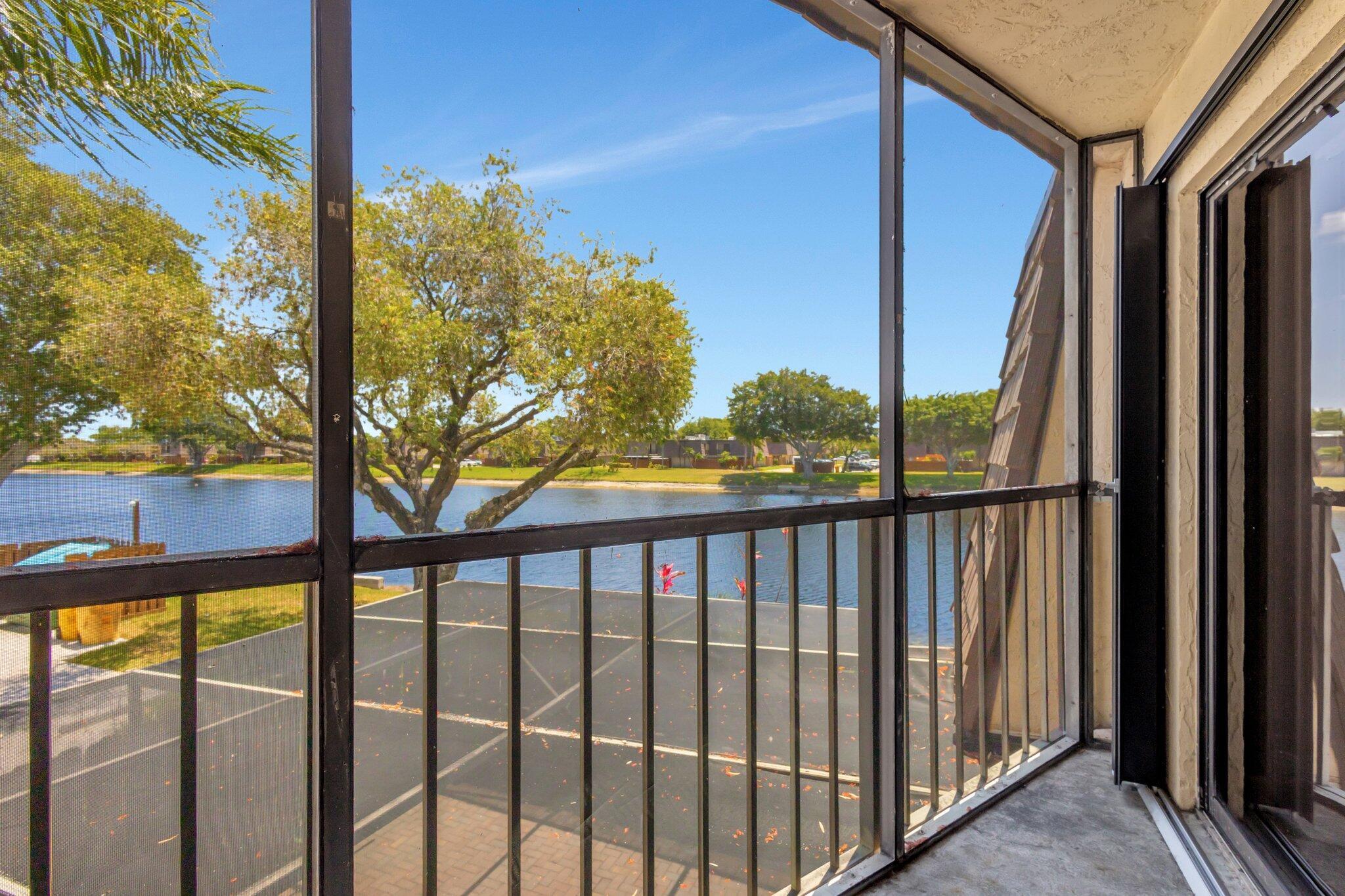 Move-in ready townhouse with 2 master suites upstairs, each with private balconies and beautiful lake views. Downstairs offers an open floor plan with large tile flooring, newly painted walls, and new carpet on the stairs. Modern wood-look laminate flooring upstairs. Kitchen features wood cabinets, granite countertops, breakfast bar, and newer appliances. New dishwasher and refrigerator. Half bath w/washer/dryer. Sliders off the kitchen and living room lead to a fully fenced, screened private courtyard w/ brick patio is perfect for outdoor dining and entertaining. Accordion shutters, 2 assigned parking spaces, and pet-friendly (1 dog or 1 cat). Community includes a new gym, pool, tennis, pickleball, and clubhouse. Great location! New roof in 2022! Move in ready and waiting for new owners.