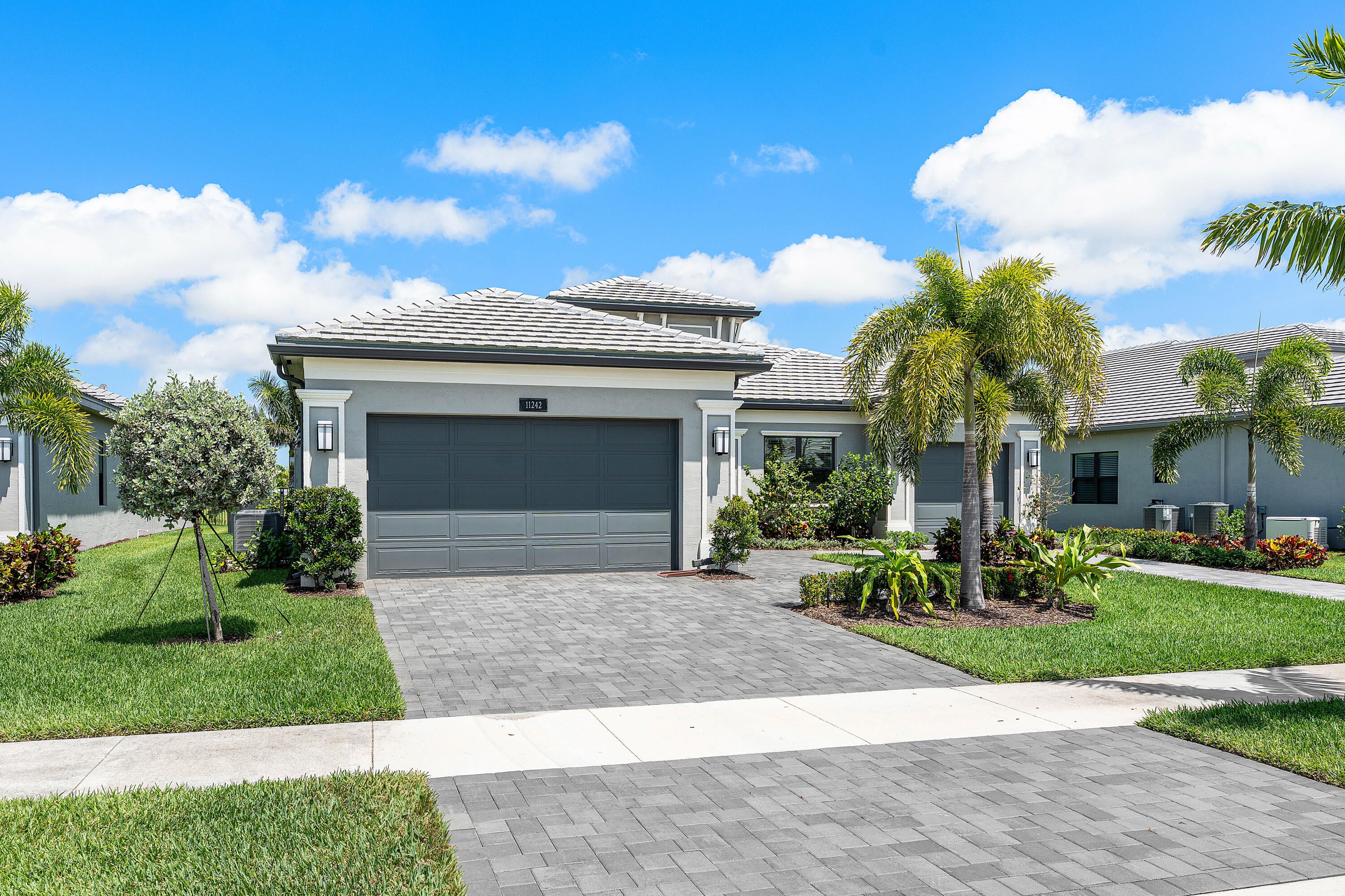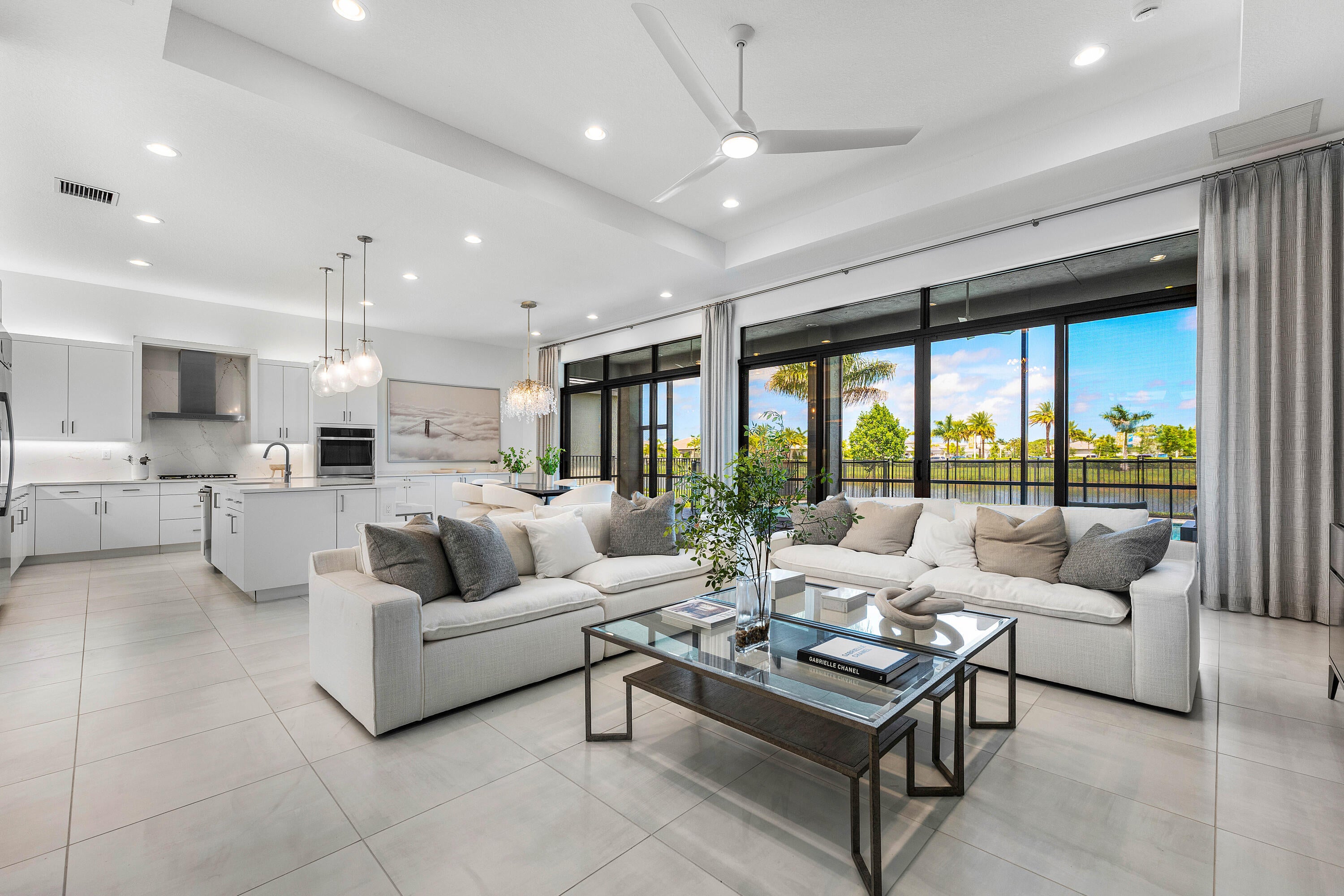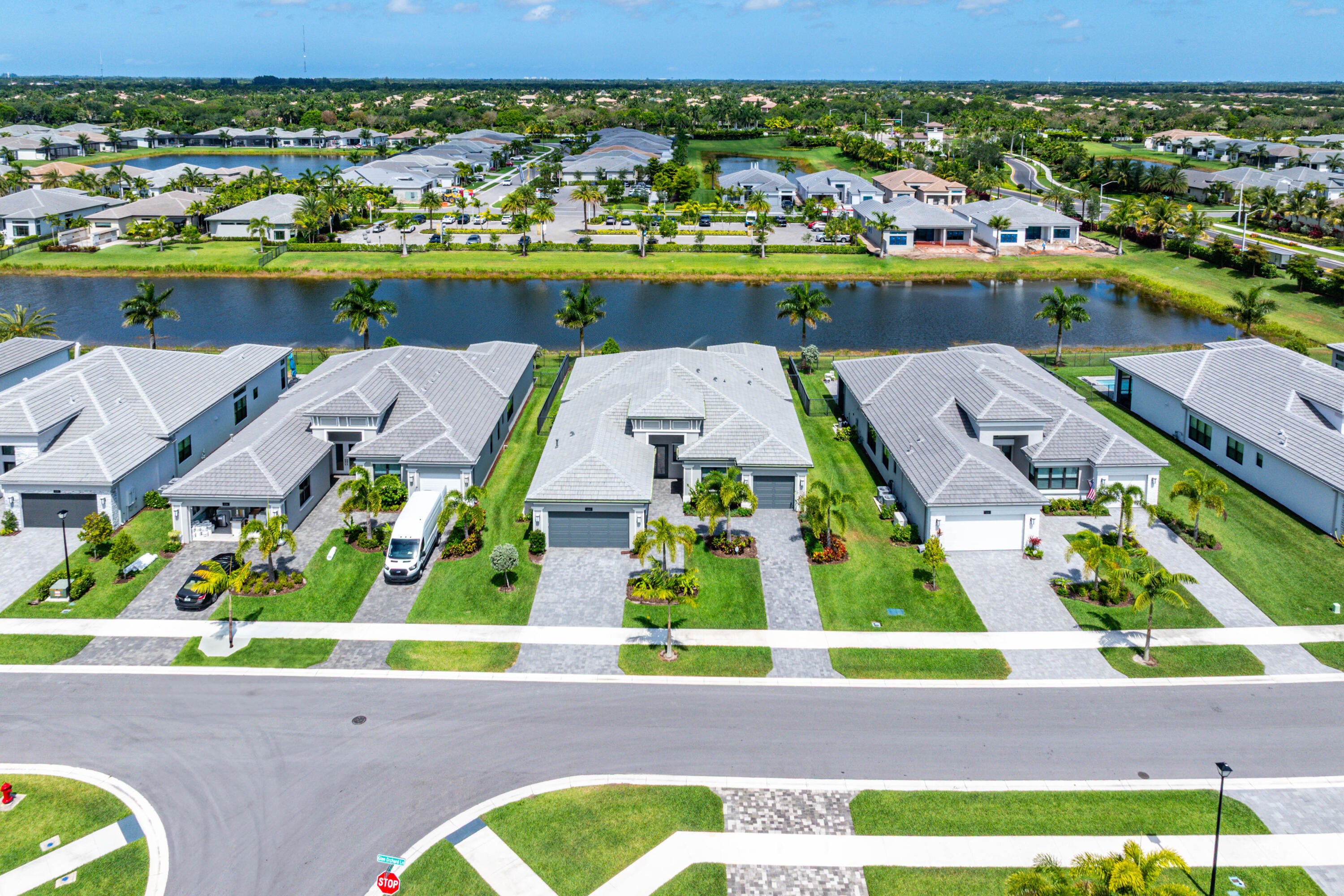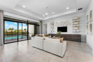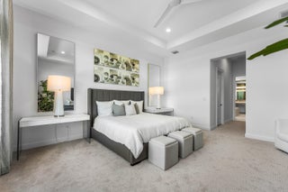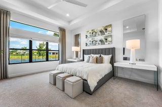 This sought after, never lived in, open concept Napa model sits on a lovely lakefront lot backing east. The beautiful home is being offered partially furnished and features impact windows, glass entry doors, porcelain tile in main living areas, designer light fixtures, fans, hi-hats, upgraded baths & more! The gourmet kitchen has contemporary white acrylic matte cabinets, quartz countertops, stainless steel appliances including stainless hood, built-in pantry cabinets and all the bells & whistles! There are three ensuite guest bedrooms, a large club room/den/office and a formal powder room. The large master suite has a luxurious bath. You'll love sitting on the covered screened patio the entire width of the home, lounging on the open patio or swimming in the pool looking out at the lake!This home is located in Valencia Grand, a premier 55+ lifestyle community featuring a spectacular 44,000 square-foot clubhouse and fantastic (nearly) 9-acre recreational facility. Endless activities and opportunities for fun abound - there are activities, trips, shows, and clubs of all types. The clubhouse features an elegant foyer and lobby, Grand ballroom with raised stage and dance floor, three spacious card rooms, Sports Lounge with billiard tables, poker tables and golf simulator, Restaurant with indoor/outdoor seating, Poolside Bar & Happy Hours at the Poolside Bar, Arts and crafts center, Catering kitchen and cooking studio, Exercise studio with ping pong, Fully equipped fitness center and men's and women's locker rooms with steam rooms and showers, outdoor yoga garden, Mind and Body Spa for everything from hair to nails to facials to massages and more! There are four pools - a beautiful Resort-style pool and Shade Pavilions, Lap pool, Resistance walking pool, Grandchildren's wading pool, and an Outdoor whirlpool spa. There are six har-tru tennis courts with shade pavilions and lighting for night play, tennis pro shop and shaded tennis and pickleball seating areas, tennis pro, league play, four indoor pickleball courts, seven outdoor pickleball courts, pickleball pro, league play, 4 bocce courts and walking/jogging/biking paths just outside the community. Valencia Grand is conveniently located near shopping, restaurants, houses of worship and major highways!