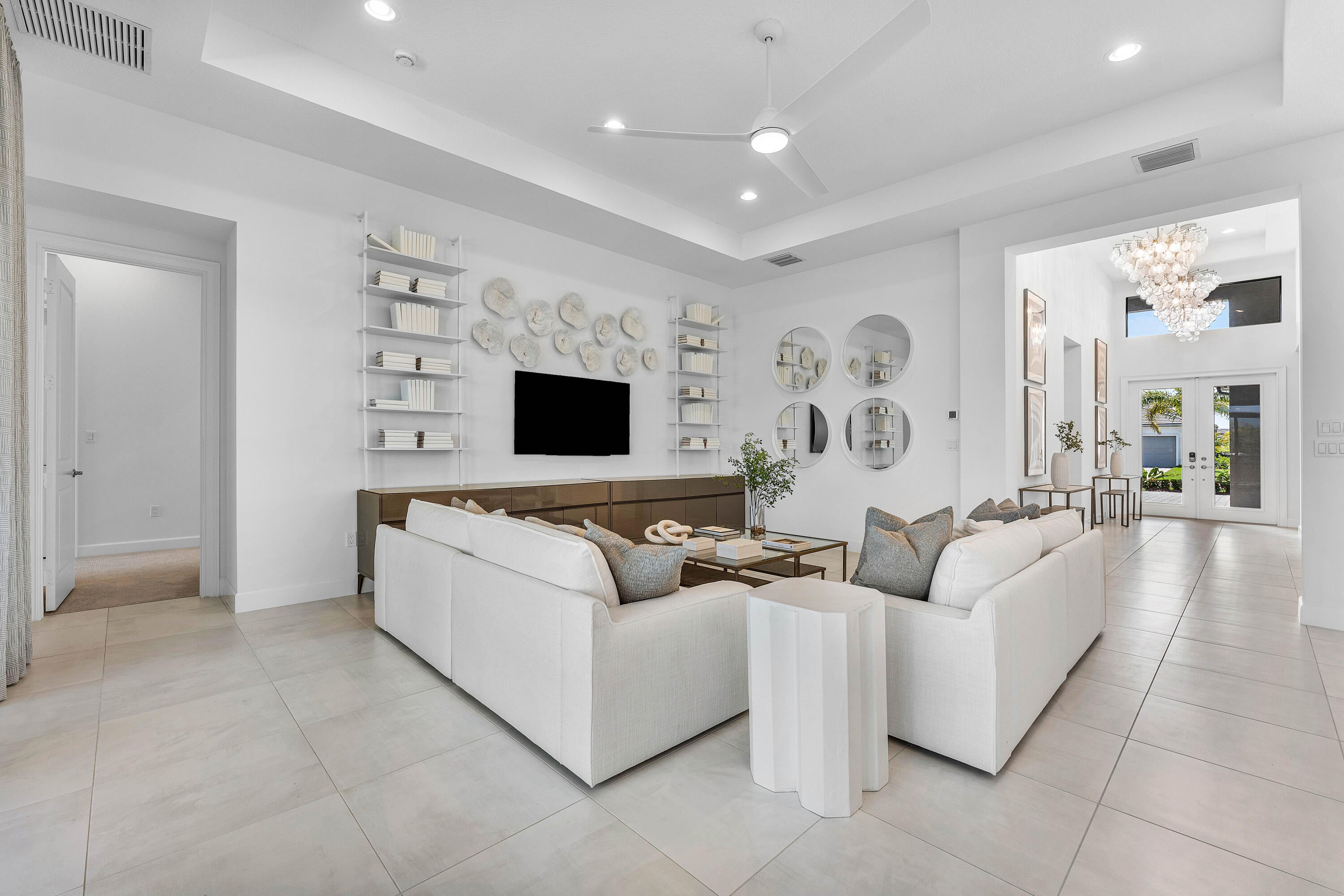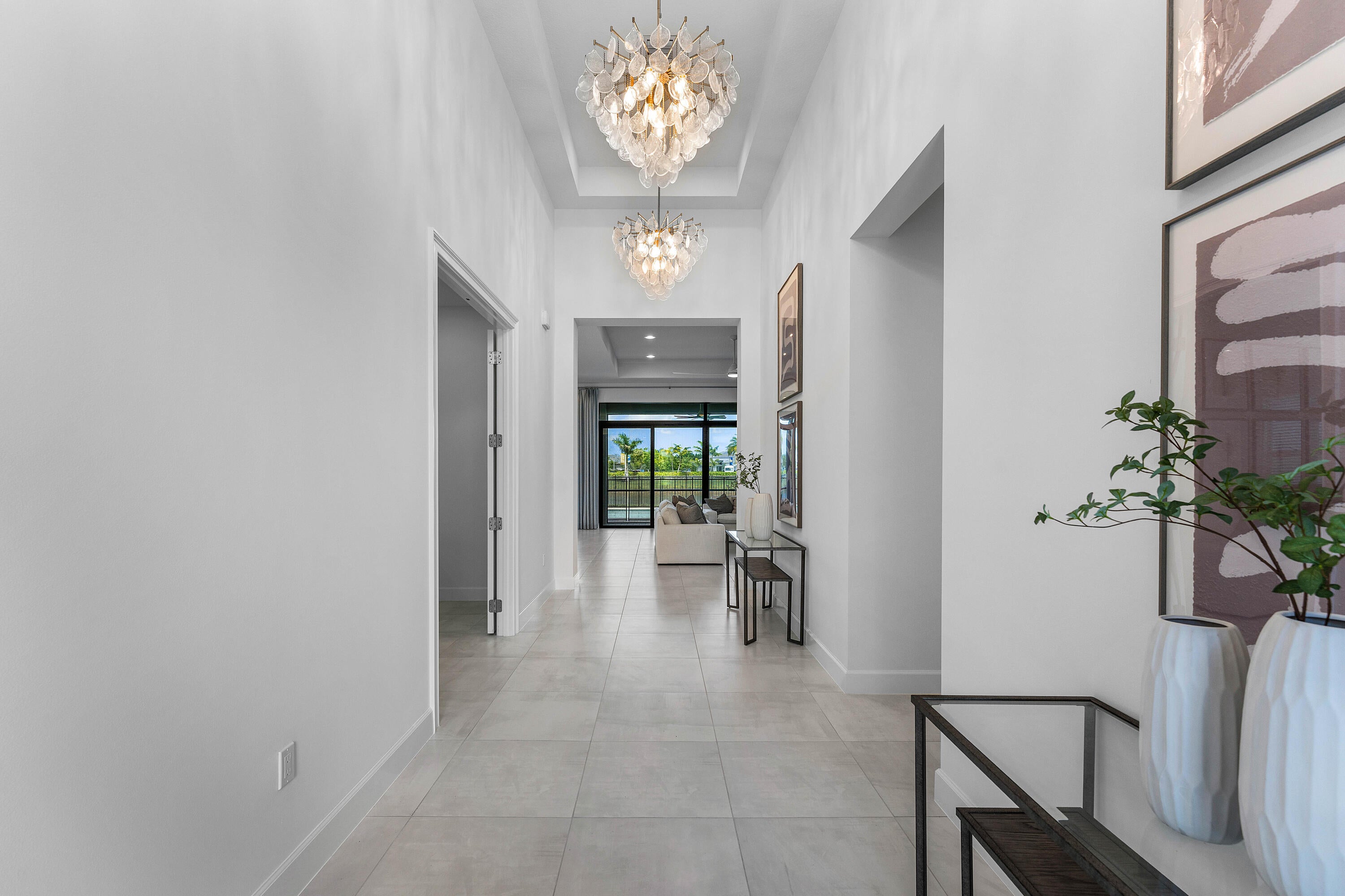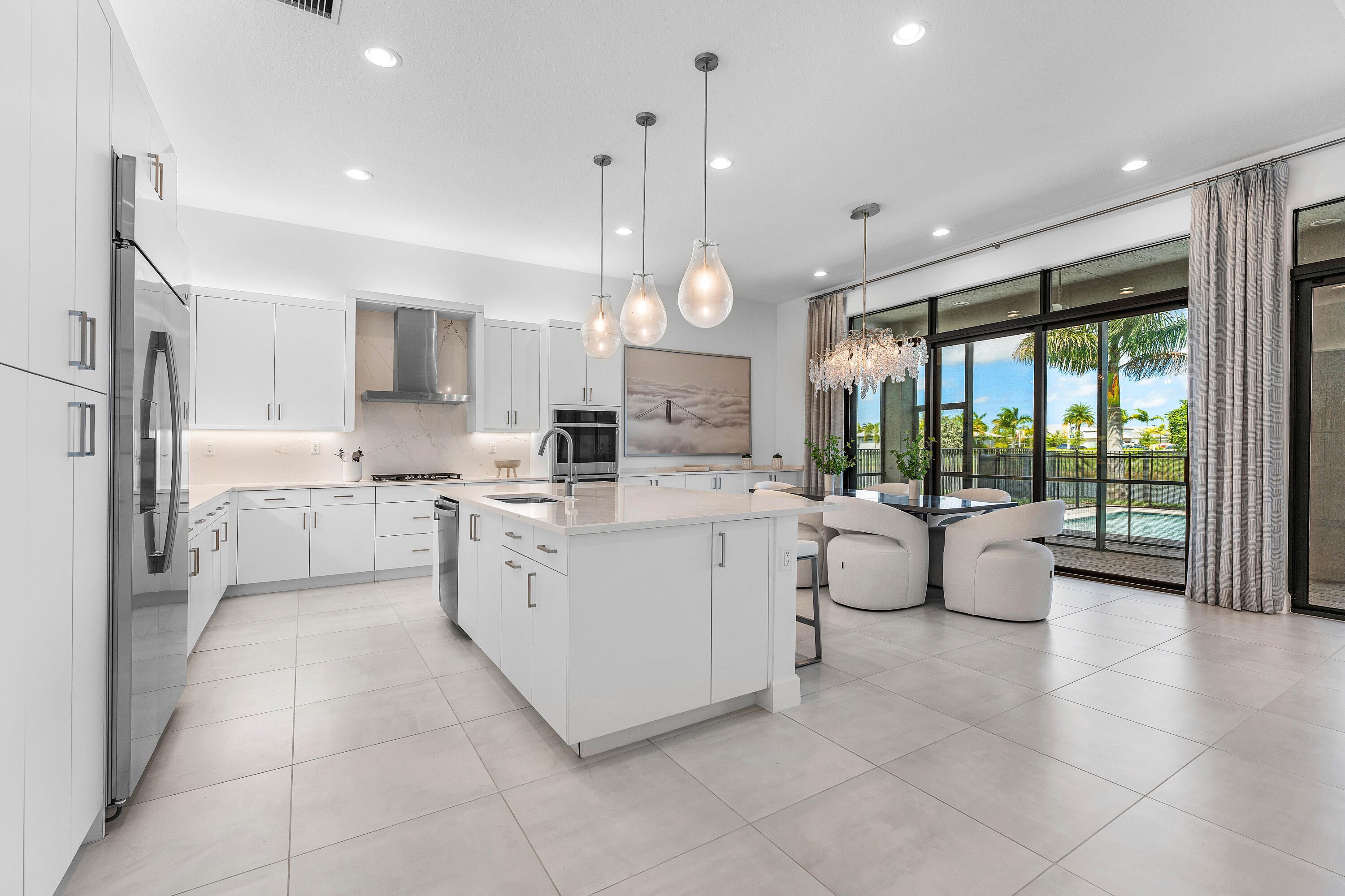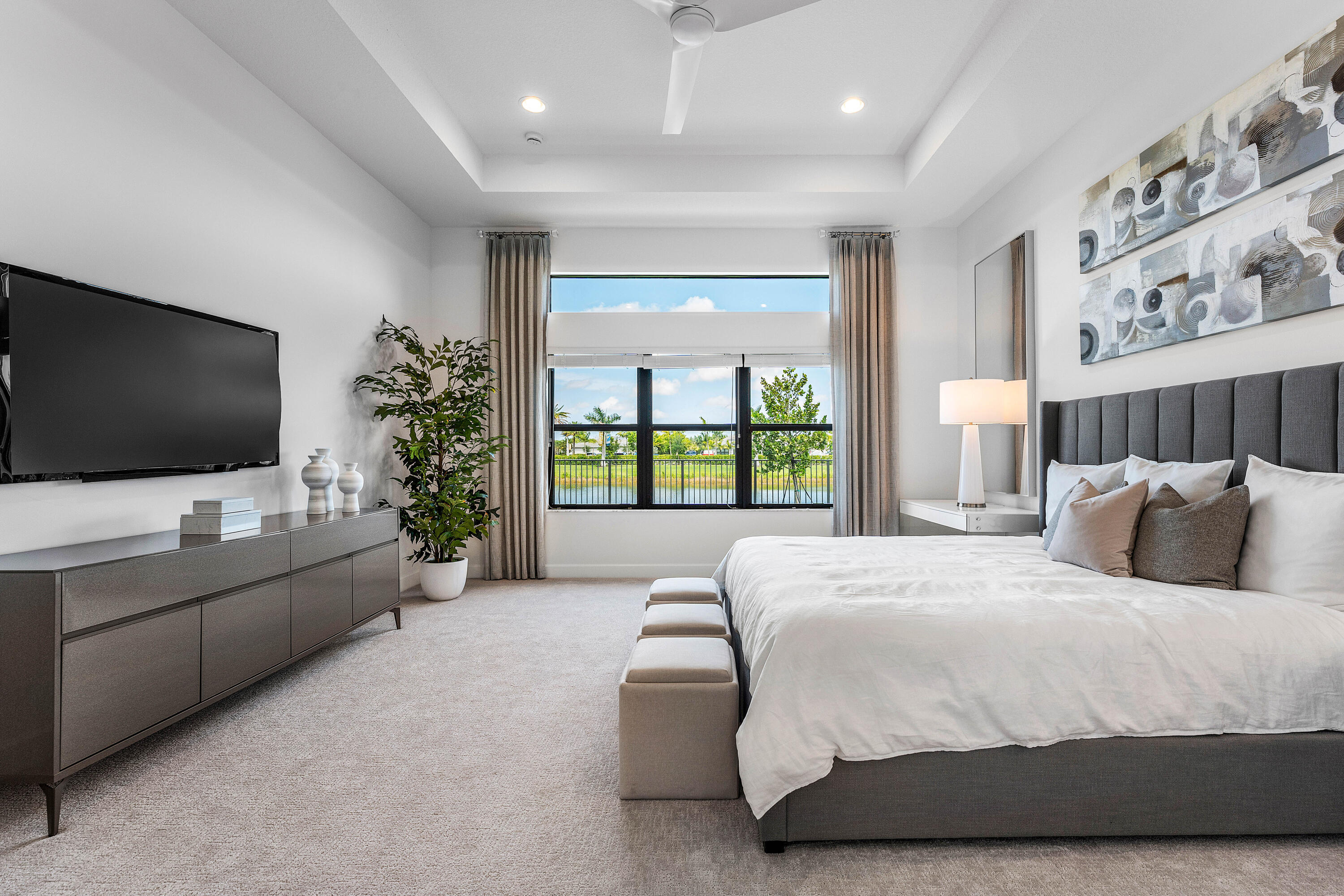 This sought after, never lived in, open concept Napa model sits on a lovely lakefront lot backing east. The beautiful home is being offered partially furnished and features impact windows, glass entry doors, porcelain tile in main living areas, designer light fixtures, fans, hi-hats, upgraded baths & more! The gourmet kitchen has contemporary white acrylic matte cabinets, quartz countertops, stainless steel appliances including stainless hood, built-in pantry cabinets and all the bells & whistles! There are three ensuite guest bedrooms, a large club room/den/office and a formal powder room. The large master suite has a luxurious bath. You'll love sitting on the covered screened patio the entire width of the home, lounging on the open patio or swimming in the pool looking out at the lake!This home is located in Valencia Grand, a premier 55+ lifestyle community featuring a spectacular 44,000 square-foot clubhouse and fantastic (nearly) 9-acre recreational facility. Endless activities and opportunities for fun abound - there are activities, trips, shows, and clubs of all types. The clubhouse features an elegant foyer and lobby, Grand ballroom with raised stage and dance floor, three spacious card rooms, Sports Lounge with billiard tables, poker tables and golf simulator, Restaurant with indoor/outdoor seating, Poolside Bar & Happy Hours at the Poolside Bar, Arts and crafts center, Catering kitchen and cooking studio, Exercise studio with ping pong, Fully equipped fitness center and men's and women's locker rooms with steam rooms and showers, outdoor yoga garden, Mind and Body Spa for everything from hair to nails to facials to massages and more! There are four pools - a beautiful Resort-style pool and Shade Pavilions, Lap pool, Resistance walking pool, Grandchildren's wading pool, and an Outdoor whirlpool spa. There are six har-tru tennis courts with shade pavilions and lighting for night play, tennis pro shop and shaded tennis and pickleball seating areas, tennis pro, league play, four indoor pickleball courts, seven outdoor pickleball courts, pickleball pro, league play, 4 bocce courts and walking/jogging/biking paths just outside the community. Valencia Grand is conveniently located near shopping, restaurants, houses of worship and major highways!