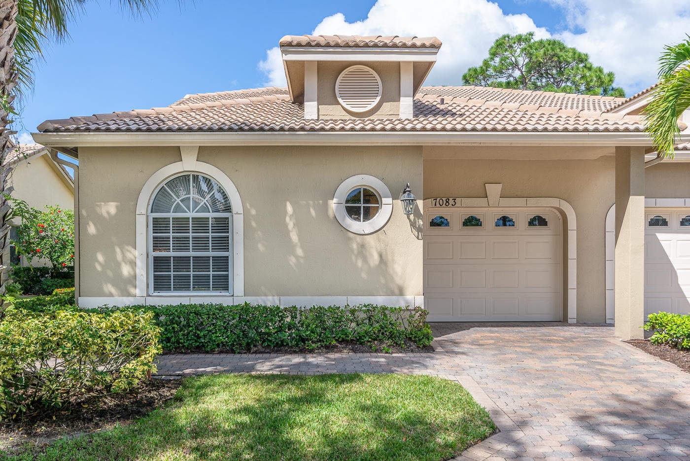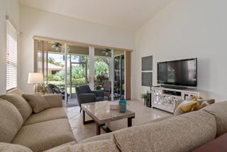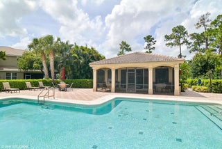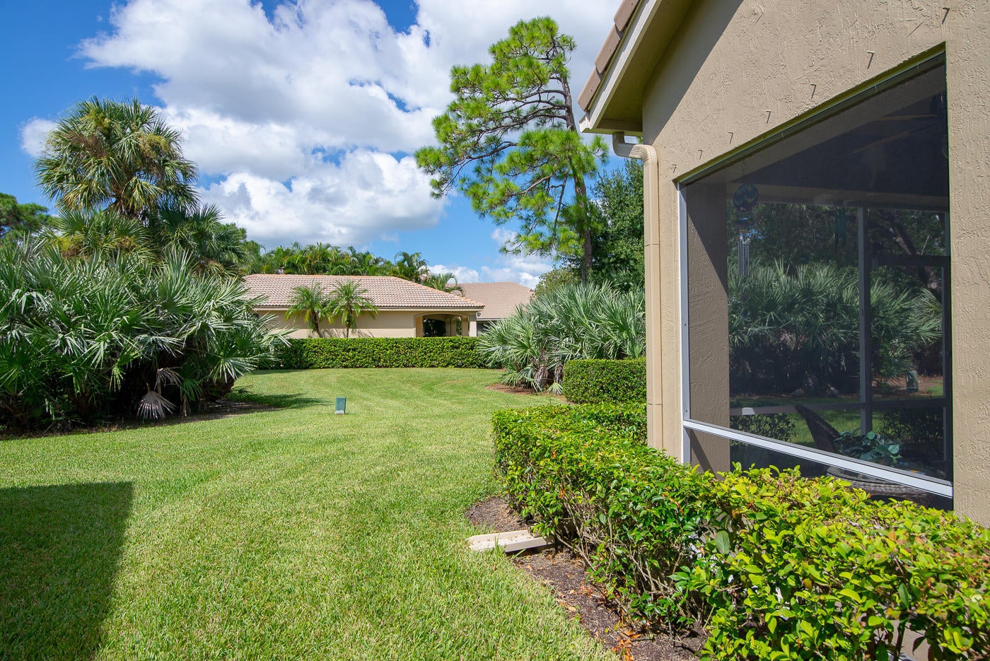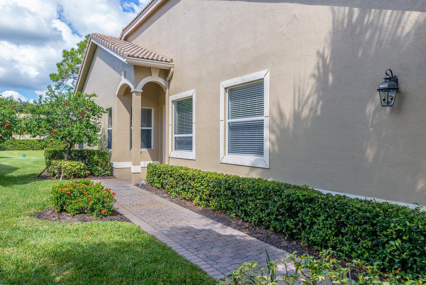 This popular Essex floor plan in the desirable Torrey Pines subdivision of PGA Village offers 3 BR, 2 BA, 1 car garage. Tile on the diagonal in the main living area and decorative vinyl flooring in all bedrooms. The kitchen has quartz countertops, tile backsplash, SS appliances, snack bar, all opening up to the great room and dining area. Large master suite with two closets and access to the lanai. The master bath has a walk-in shower, a separate soaking tub, and double sinks. Enjoy your morning coffee on the screened covered lanai with plenty of privacy. Accordion shutters around the home. Torrey Pines offers its own clubhouse and pool, and you will have access to the Island Club and all its amenities. DON'T MISS THIS ONE!