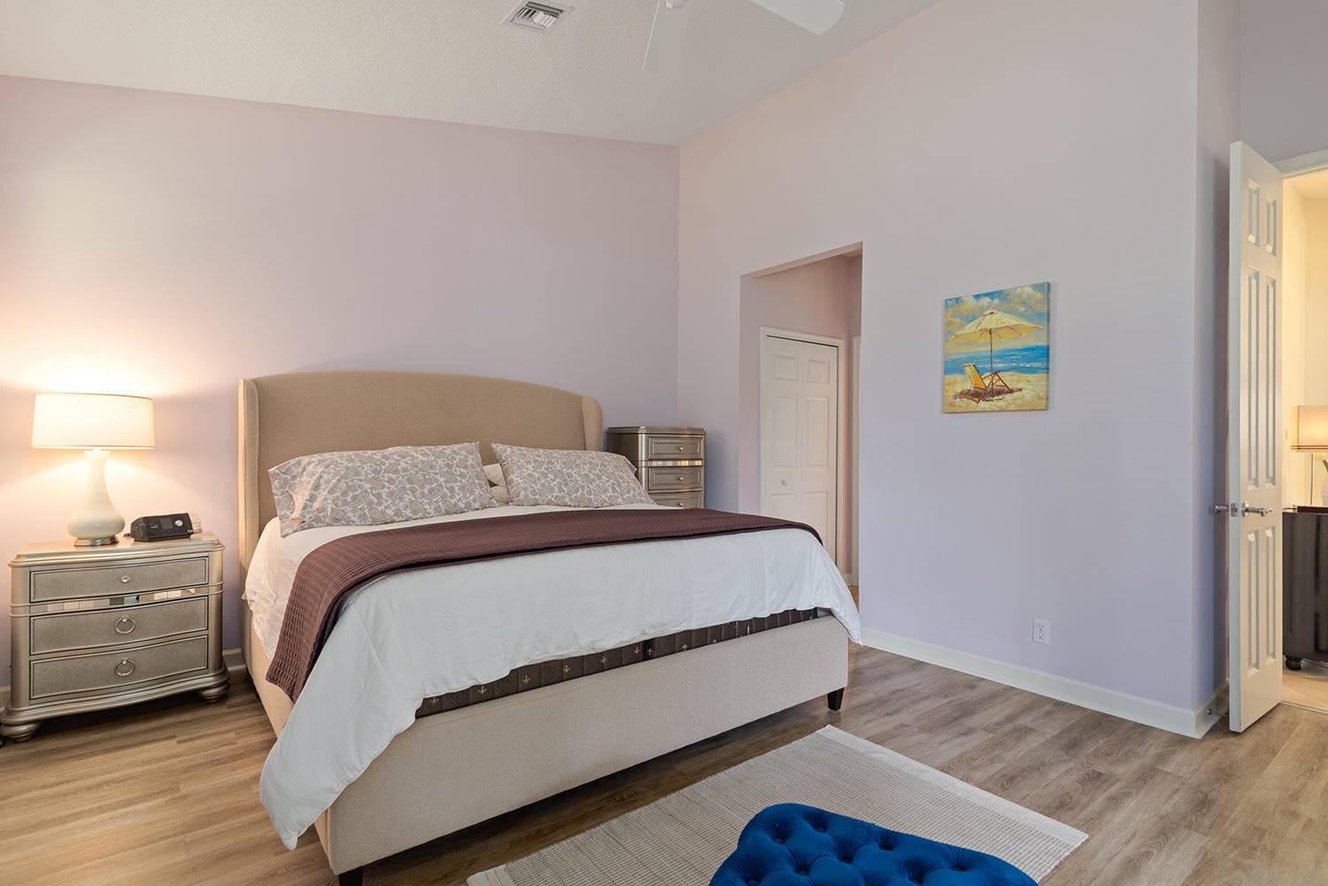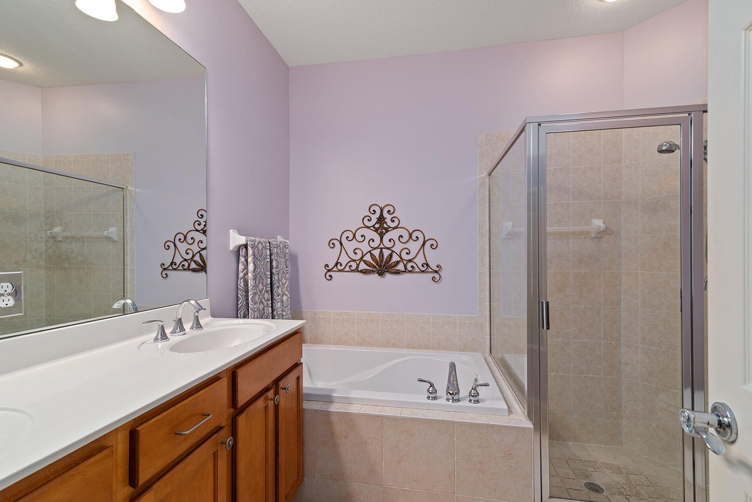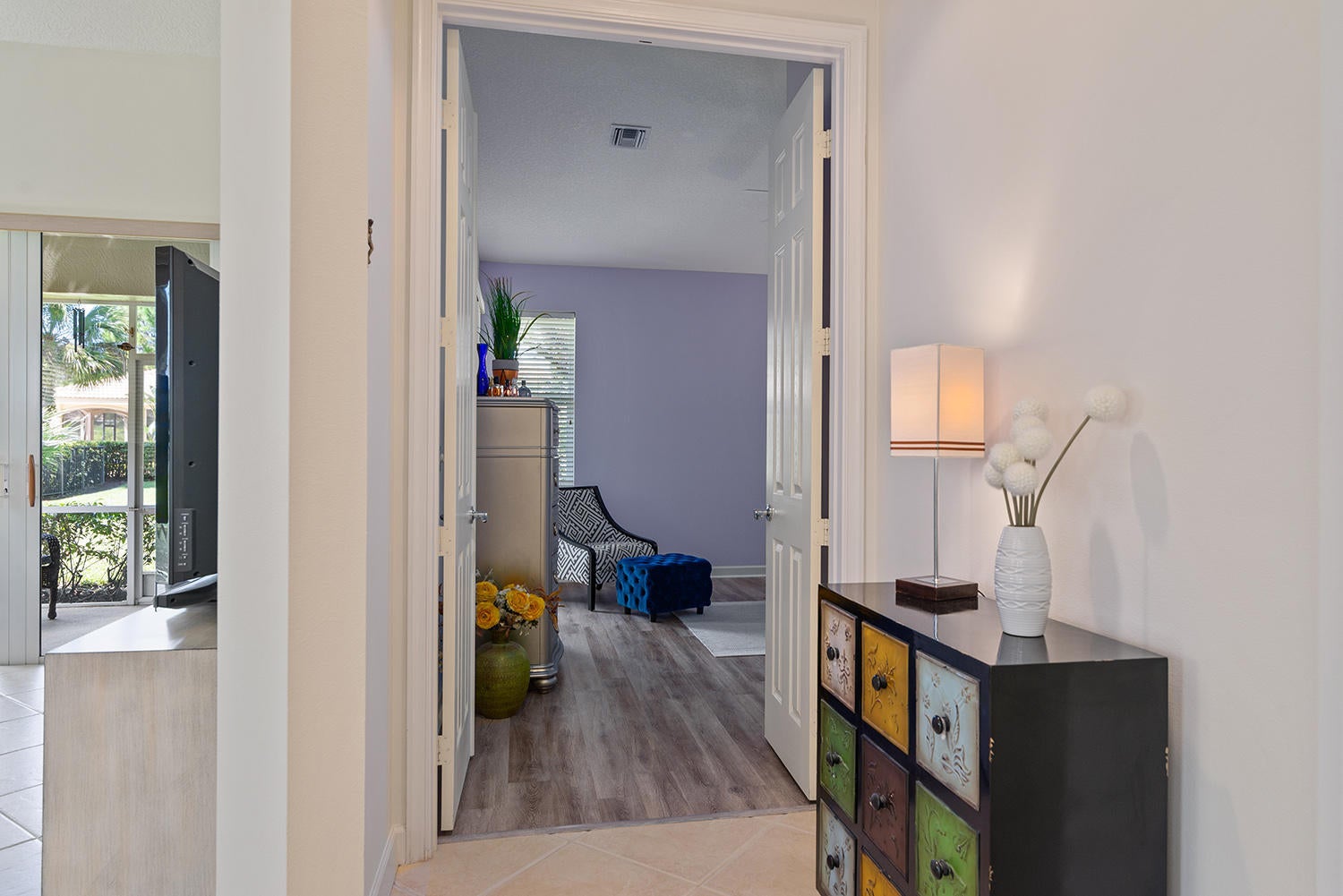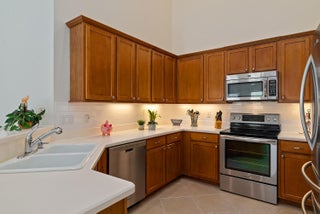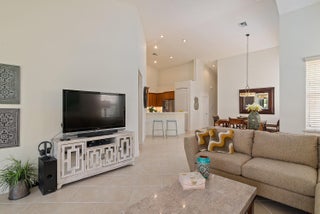 This popular Essex floor plan in the desirable Torrey Pines subdivision of PGA Village offers 3 BR, 2 BA, 1 car garage. Tile on the diagonal in the main living area and decorative vinyl flooring in all bedrooms. The kitchen has quartz countertops, tile backsplash, SS appliances, snack bar, all opening up to the great room and dining area. Large master suite with two closets and access to the lanai. The master bath has a walk-in shower, a separate soaking tub, and double sinks. Enjoy your morning coffee on the screened covered lanai with plenty of privacy. Accordion shutters around the home. Torrey Pines offers its own clubhouse and pool, and you will have access to the Island Club and all its amenities. DON'T MISS THIS ONE!